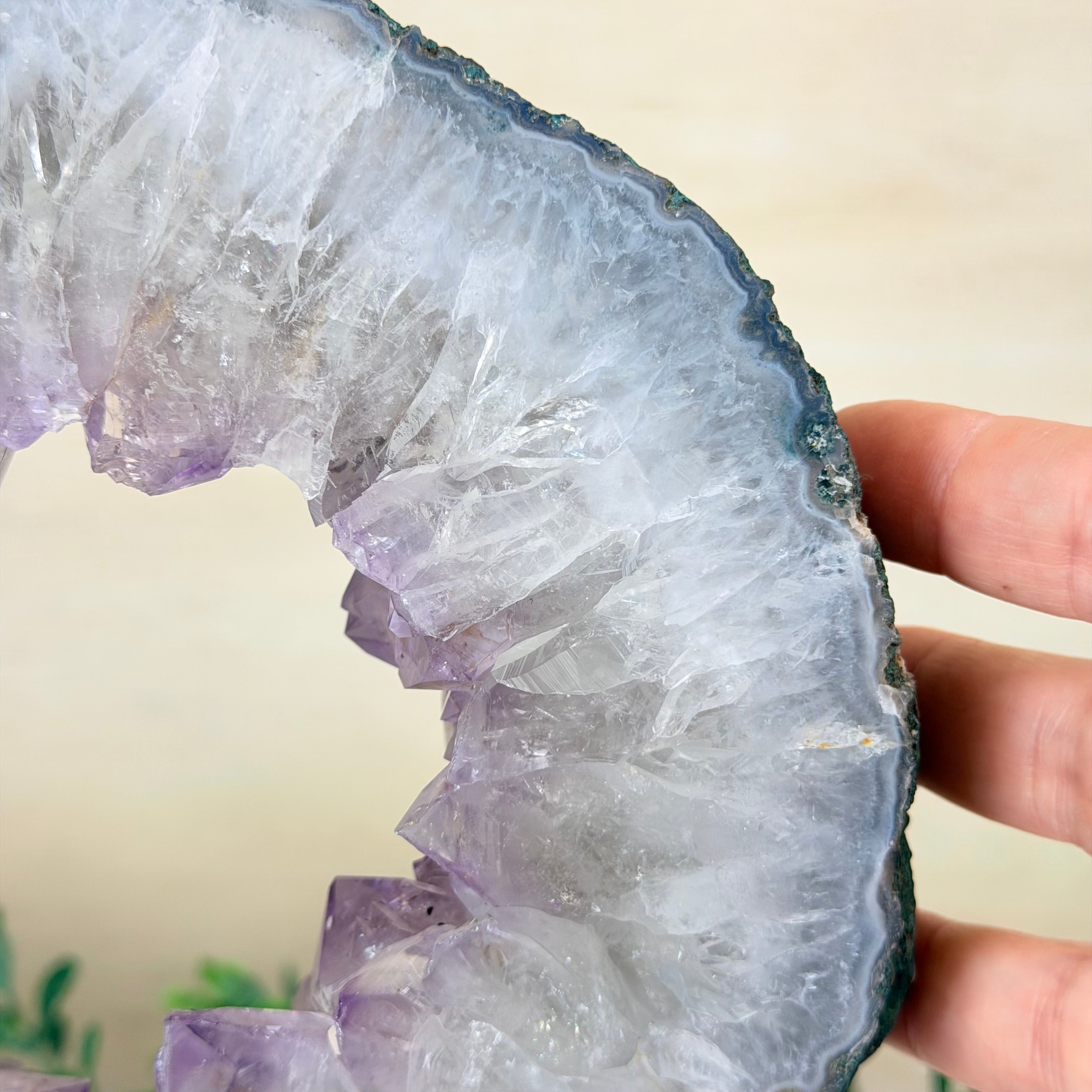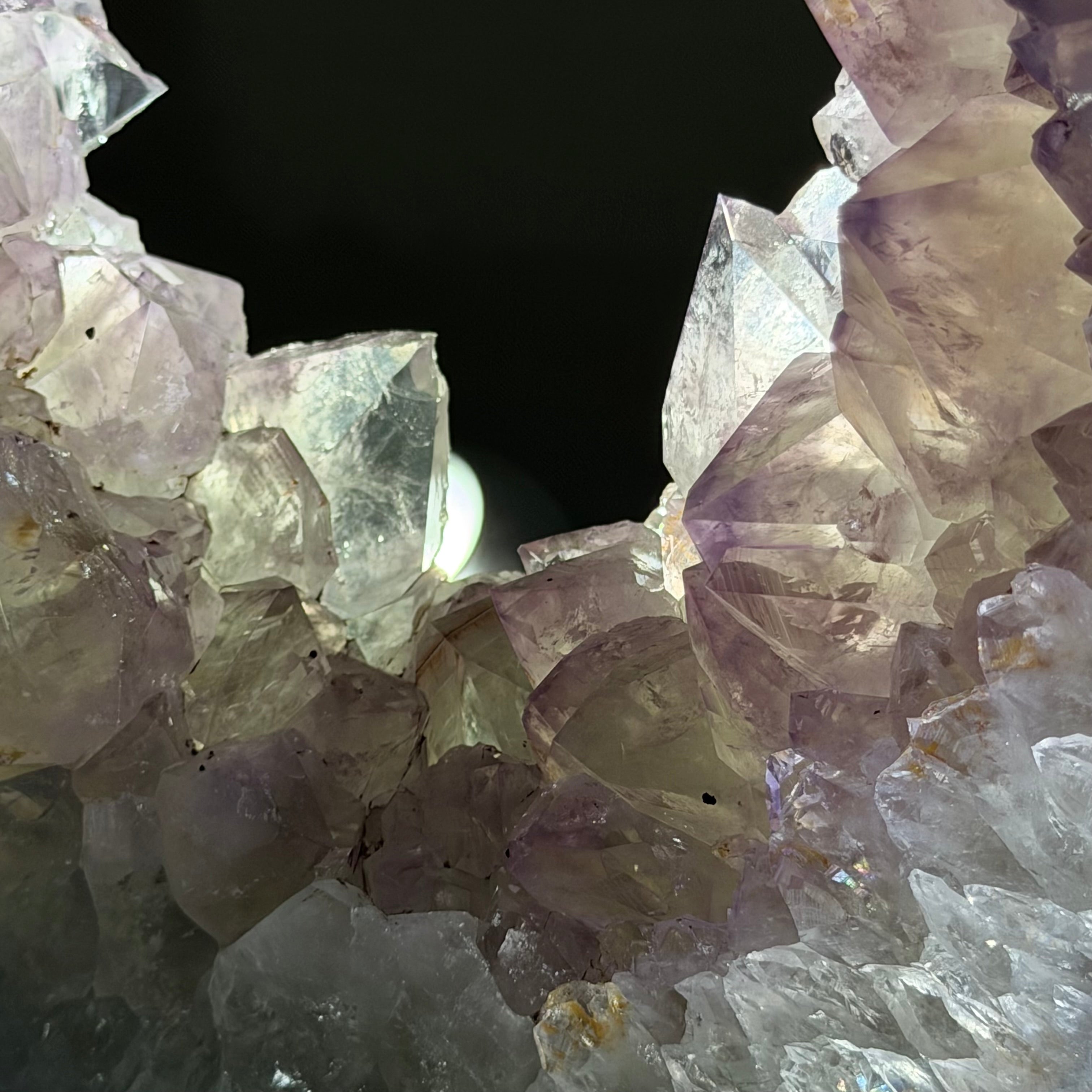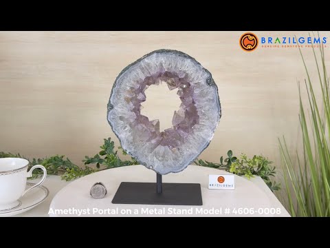 Unveil the charm of this natural Standard Plus Quality Brazilian Amethyst Crystal "Portal" on a black metal fixed stand. A crystal portal is often depicted as a mystical gateway or entrance formed with crystals, believed to connect different realms or dimensions.