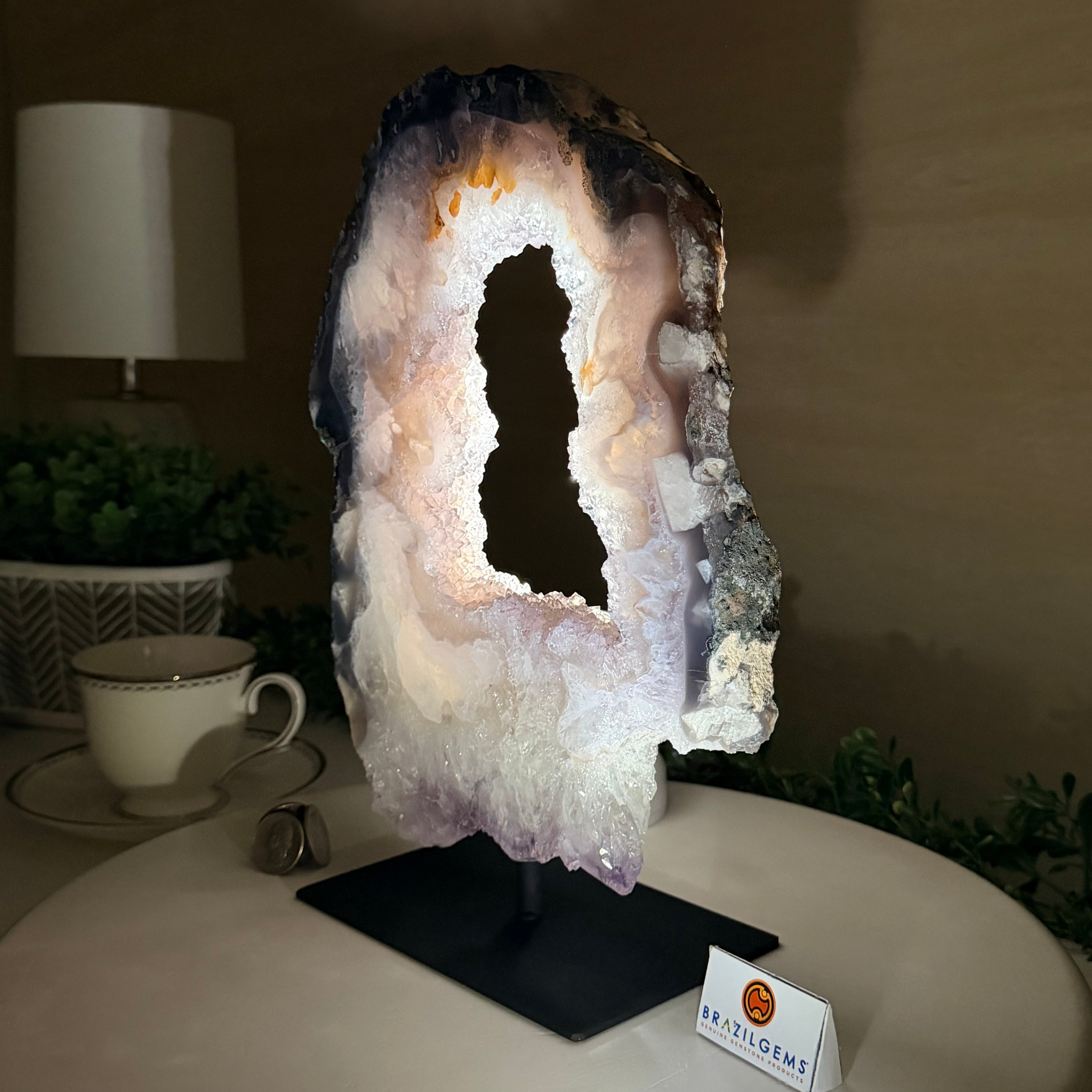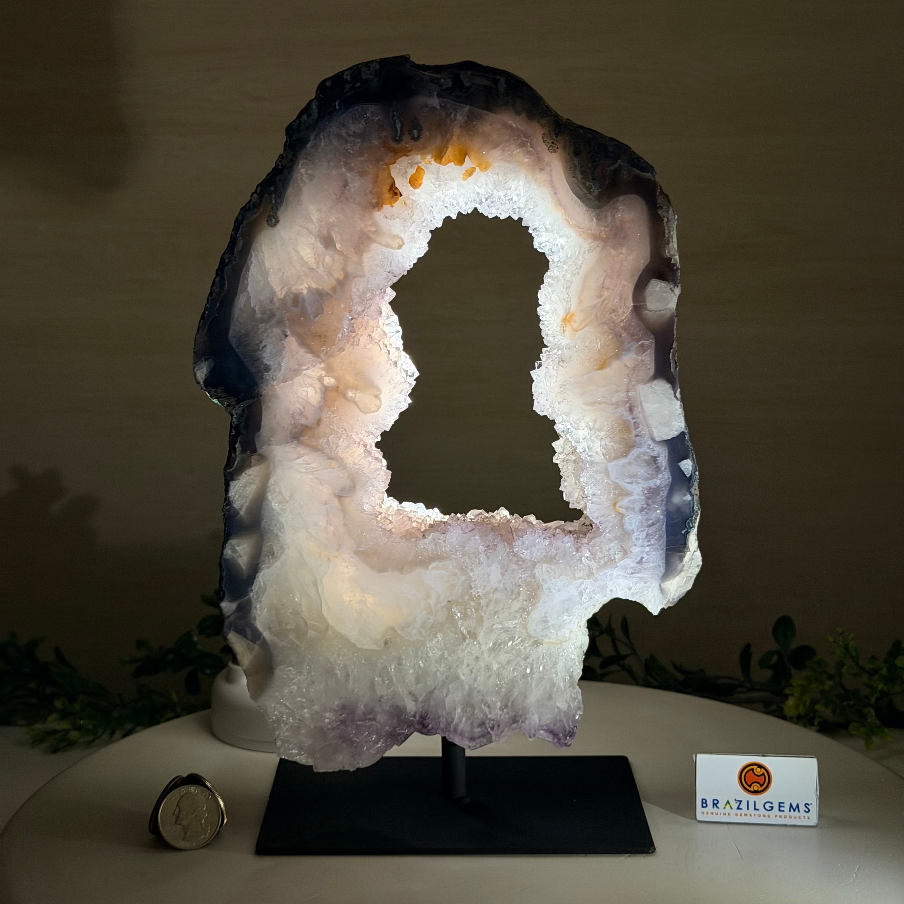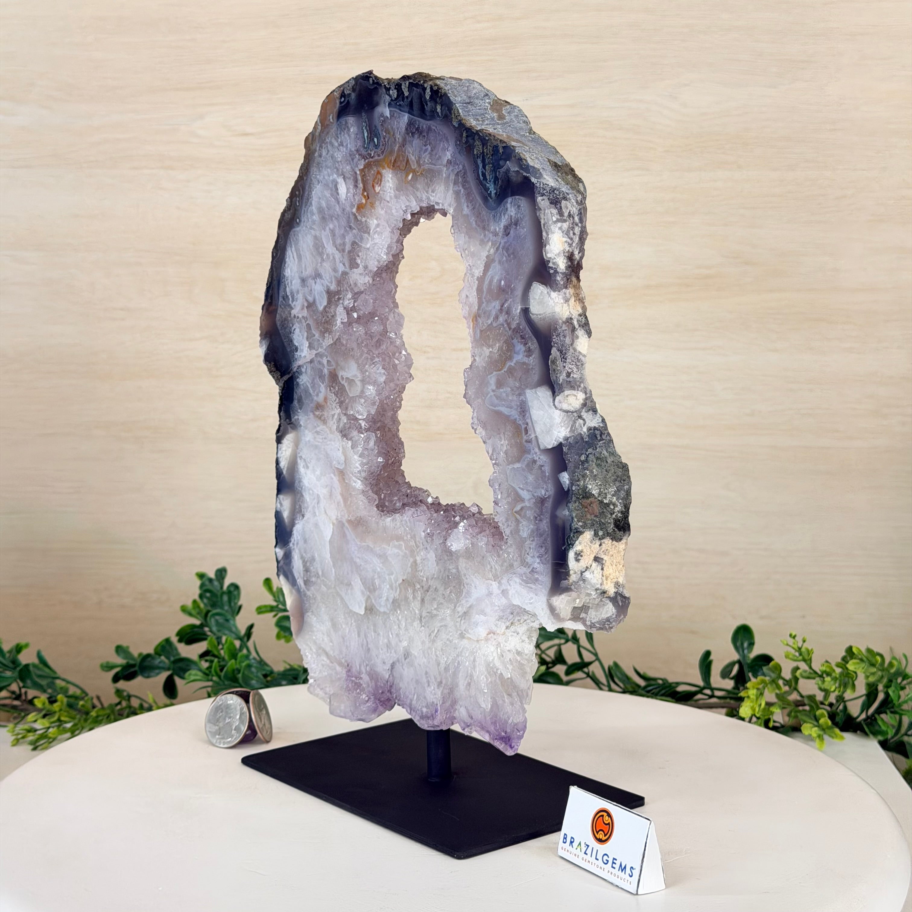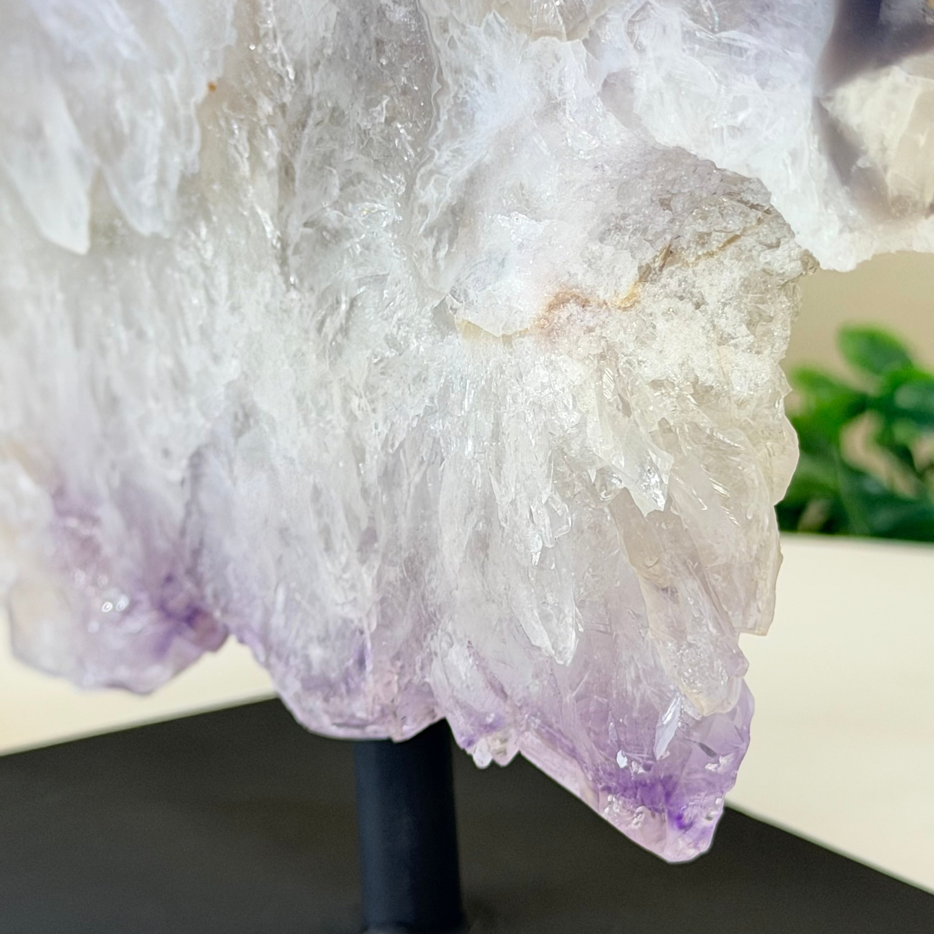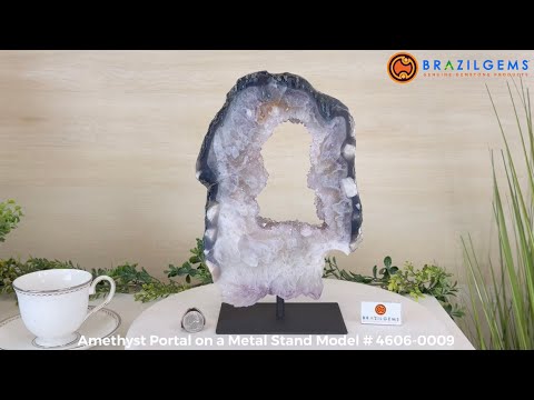 Unveil the charm of this natural Standard Plus Quality Brazilian Amethyst Crystal "Portal" on a black metal fixed stand. A crystal portal is often depicted as a mystical gateway or entrance formed with crystals, believed to connect different realms or dimensions.