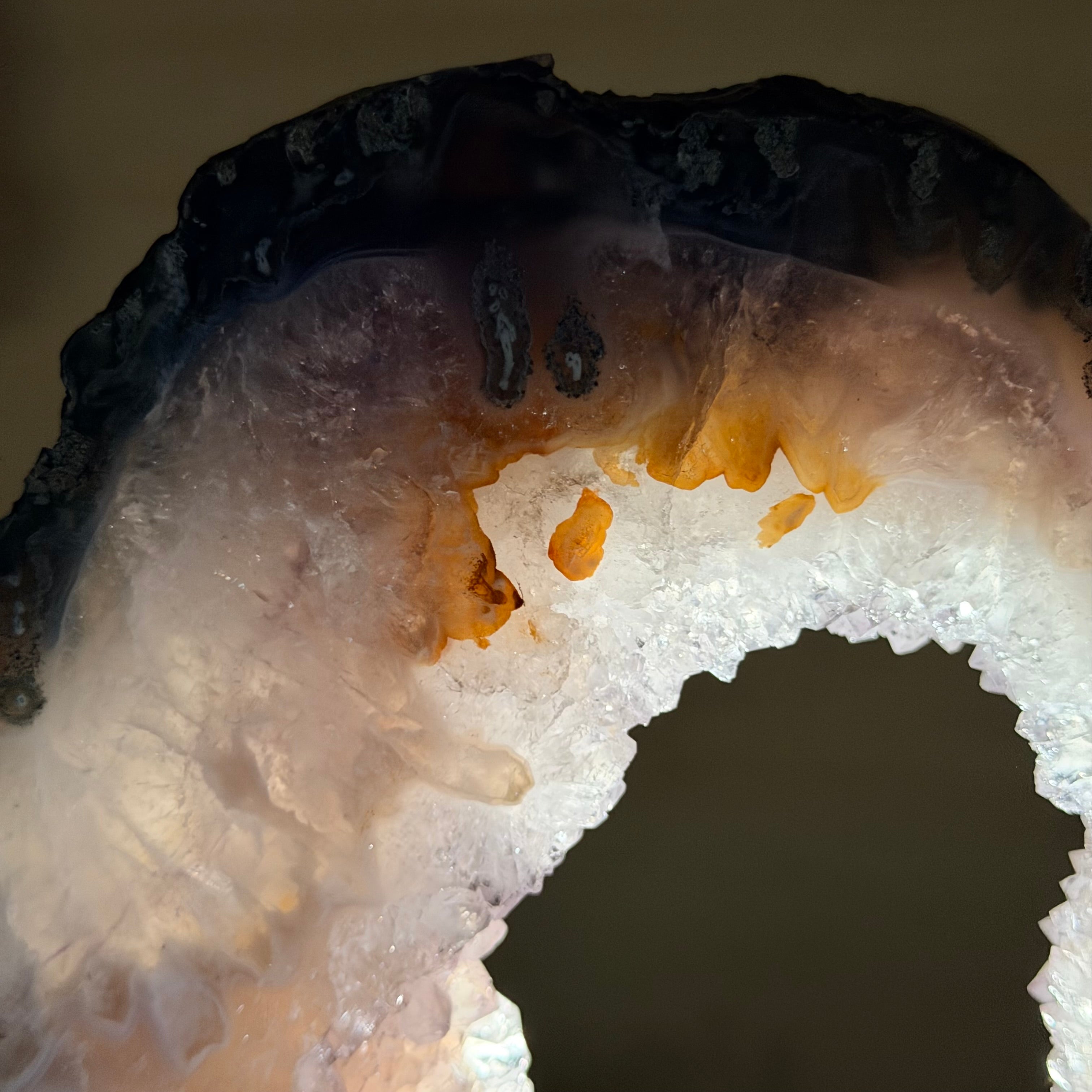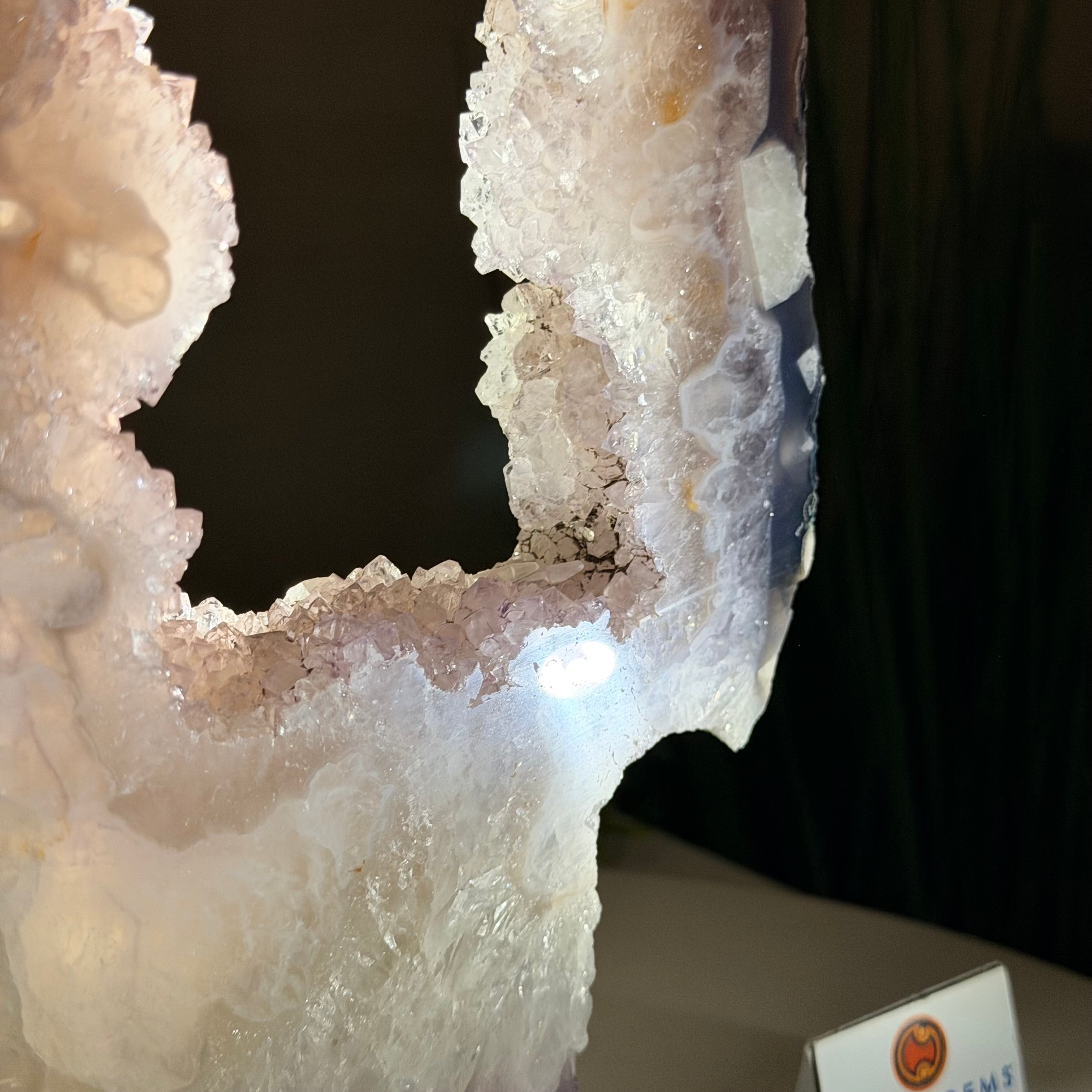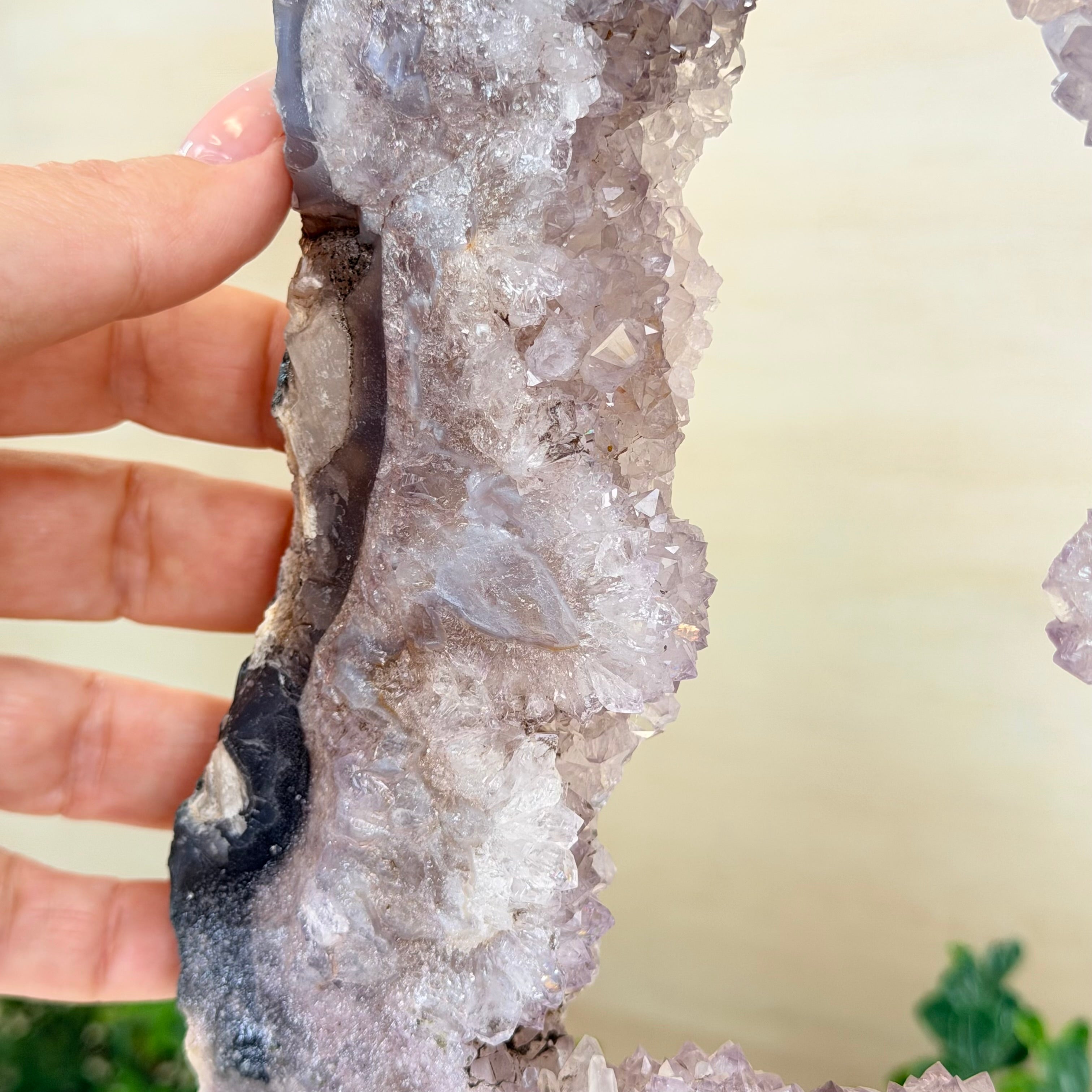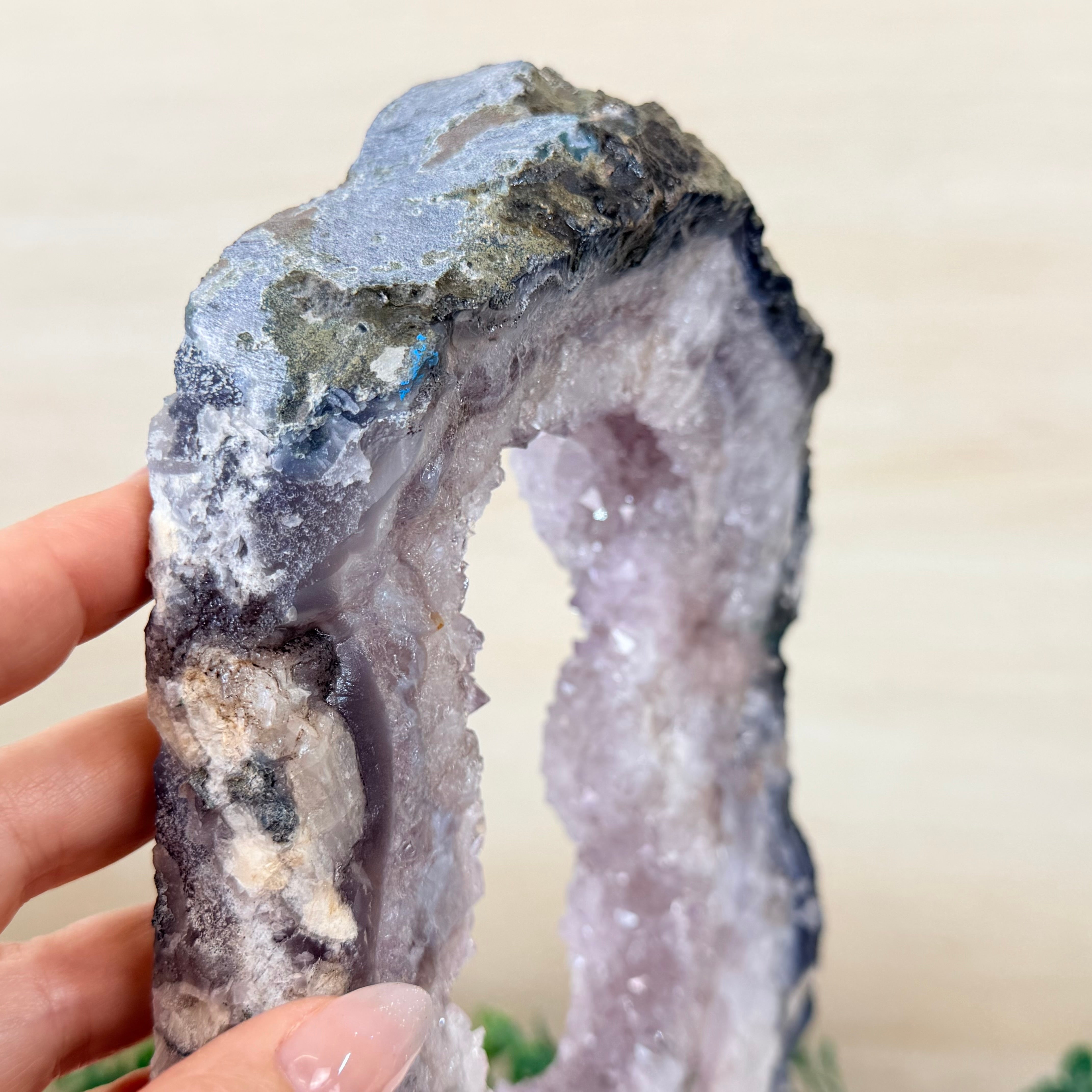 Unveil the charm of this natural Standard Plus Quality Brazilian Amethyst Crystal "Portal" on a black metal fixed stand. A crystal portal is often depicted as a mystical gateway or entrance formed with crystals, believed to connect different realms or dimensions.