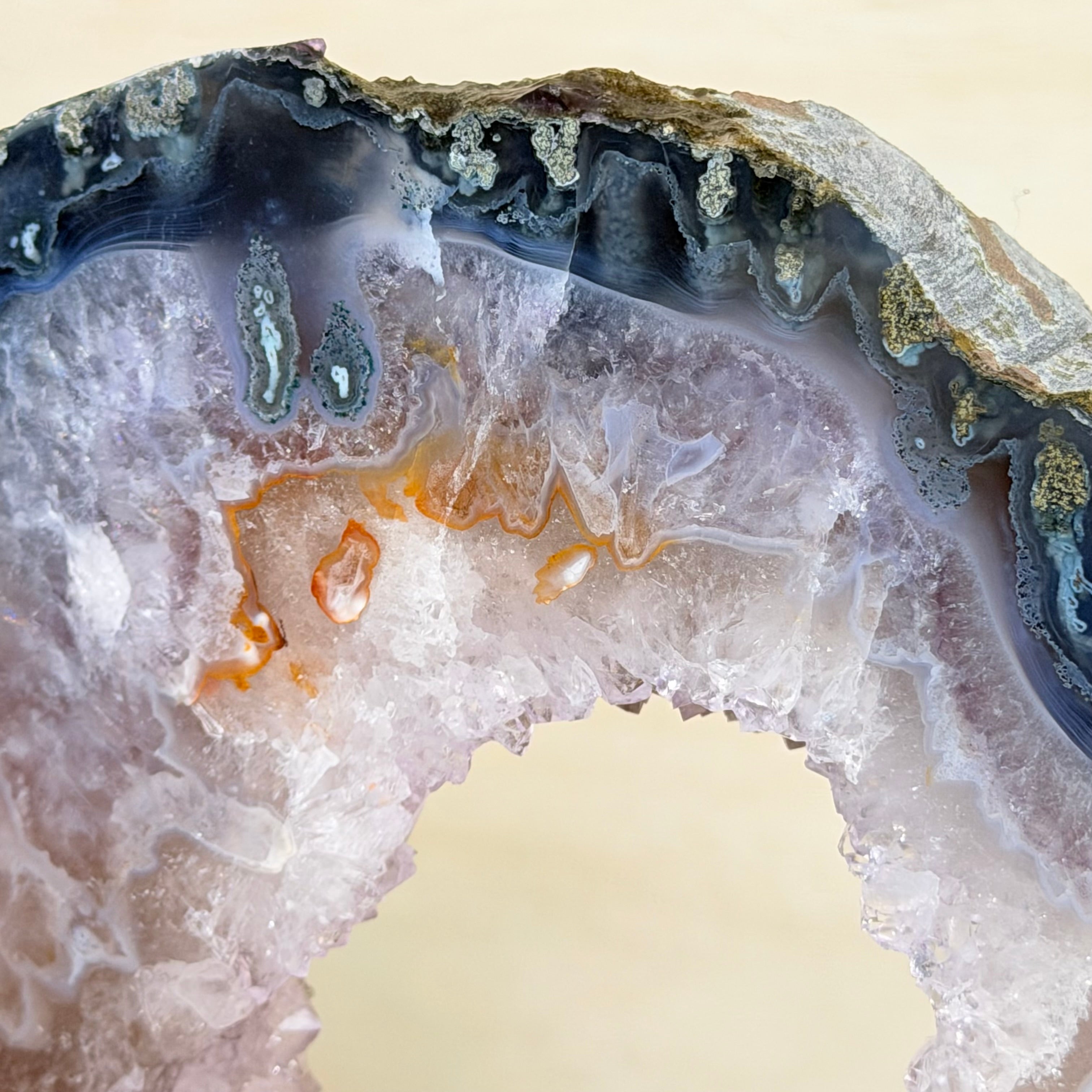The formation of amethyst is a story of icy beauty crystallizing from a legacy of fire. Basaltic lava can cool with porous cavities that can be 15-feet long. As silica-rich waters run through these cavities, traces of silica leave the seeds of crystalline growth. The water’s iron content gives amethyst its signature purple color. Placement of amethyst in your environment is an invitation to let healing energy and the timelessness of the Earth take your journey to a higher plane. Protect your amethyst stones from direct sunlight to preserve their vibrancy.