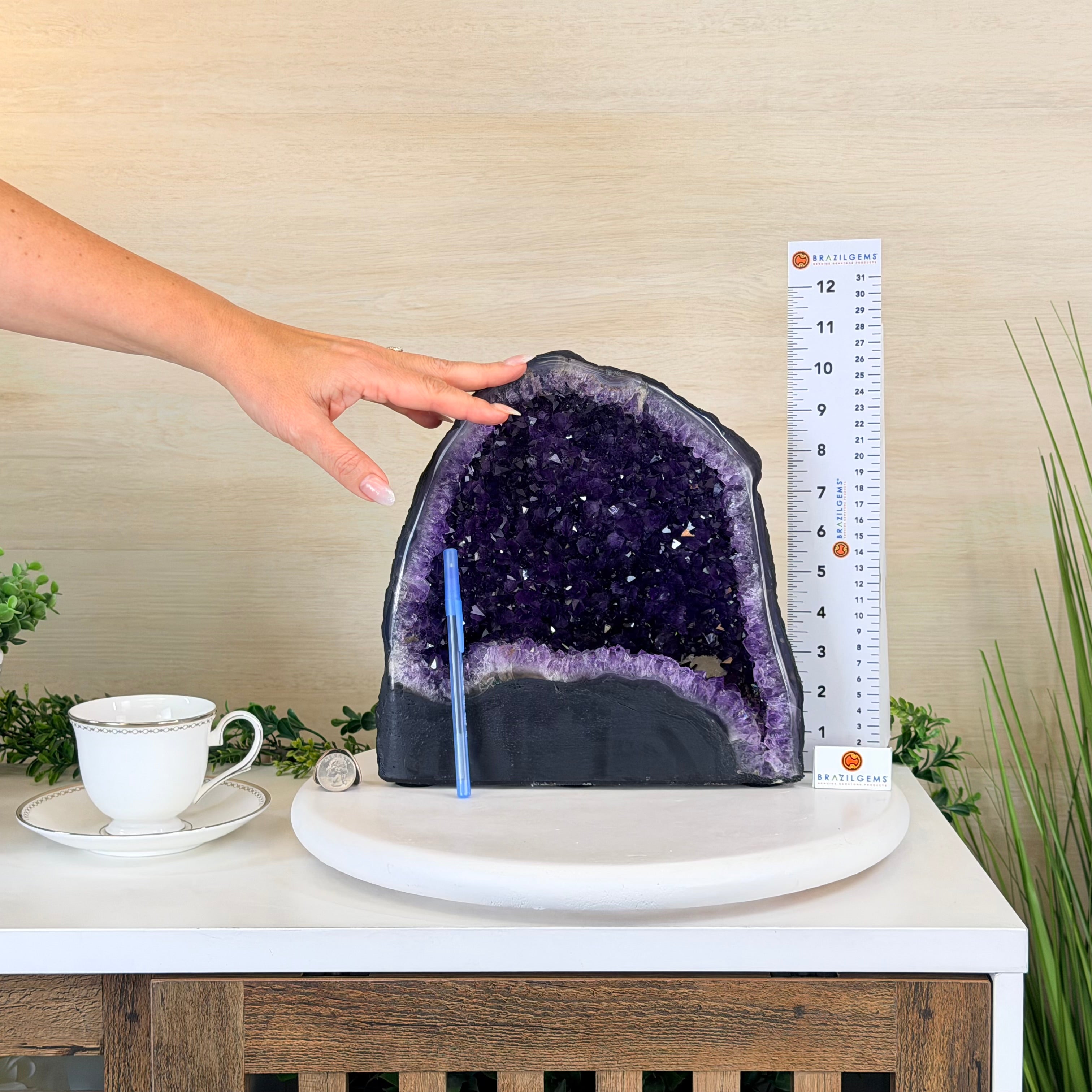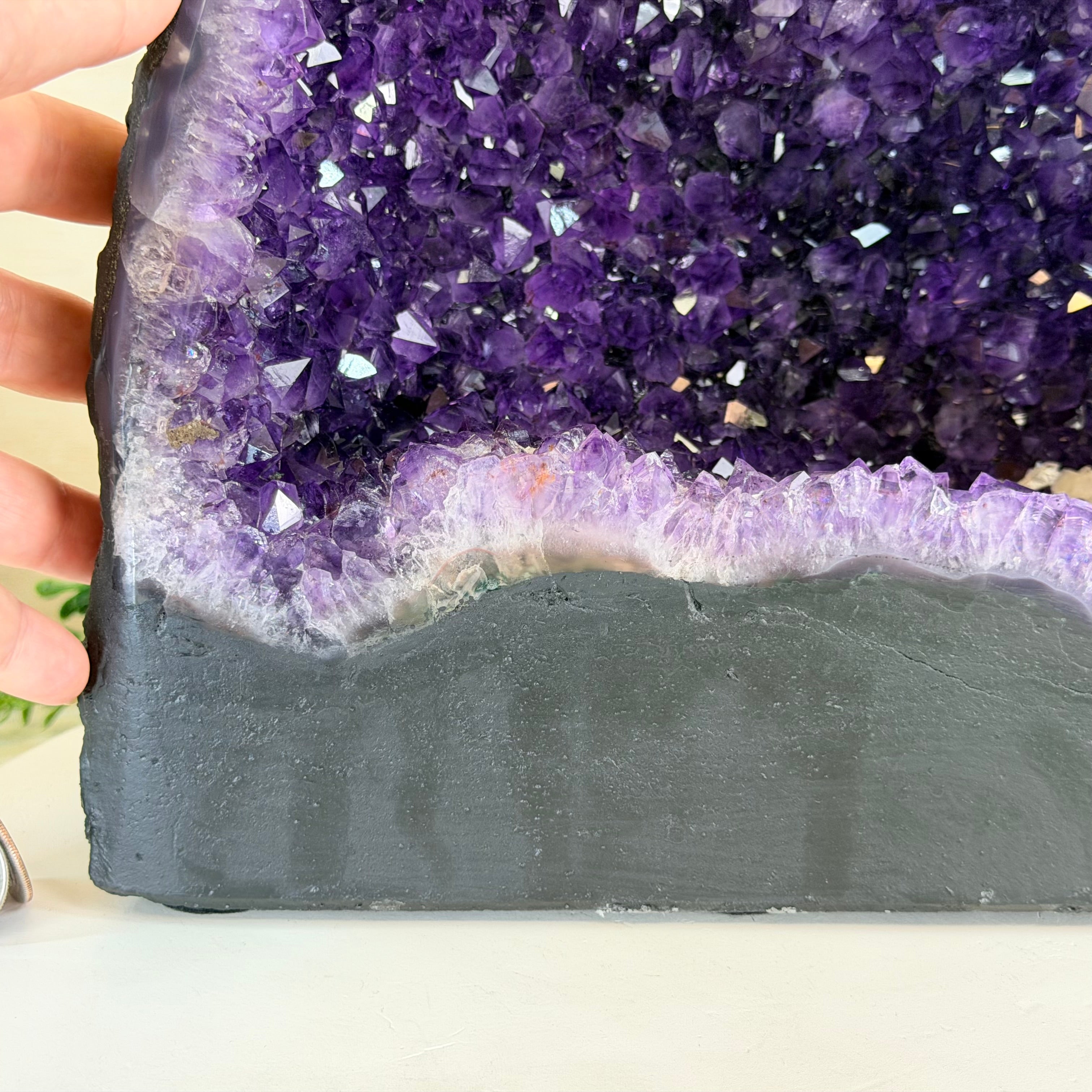 Disclaimer: This is a natural gemstone crystal sold by Brazil Gems® as is and as you see it in its images and video. It is the exact one you will receive. It may contain natural imperfections as well as imperfections, broken edges and repairs from the extraction, polishing and prepping processes. In order for it to stand on its own, the back and bottom have been reinforced with a small amount of cement then painted black. At Brazil Gems® we make every effort to get measurements as exact as possible but they are done by human hands and eyes and therefore may have minor discrepancies.