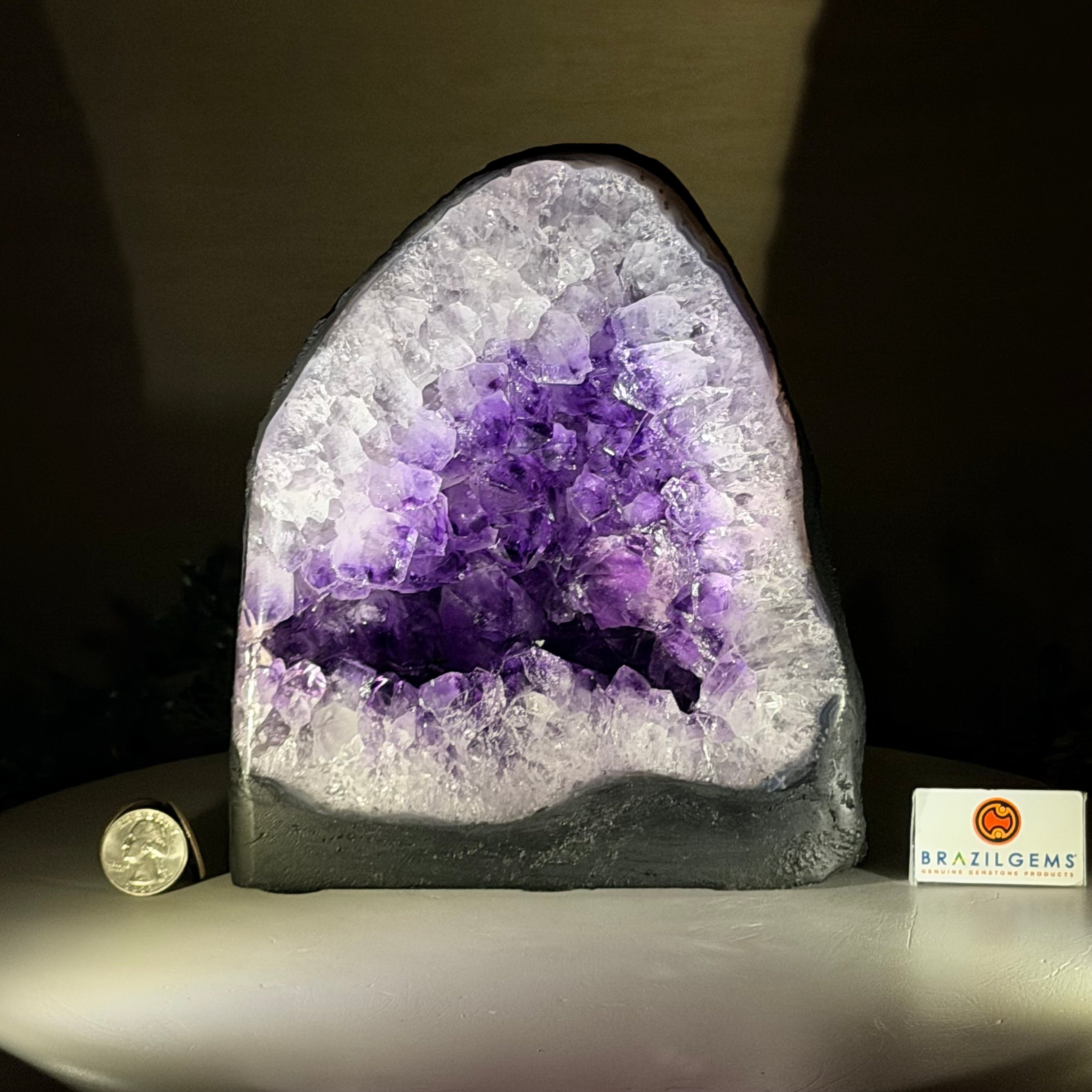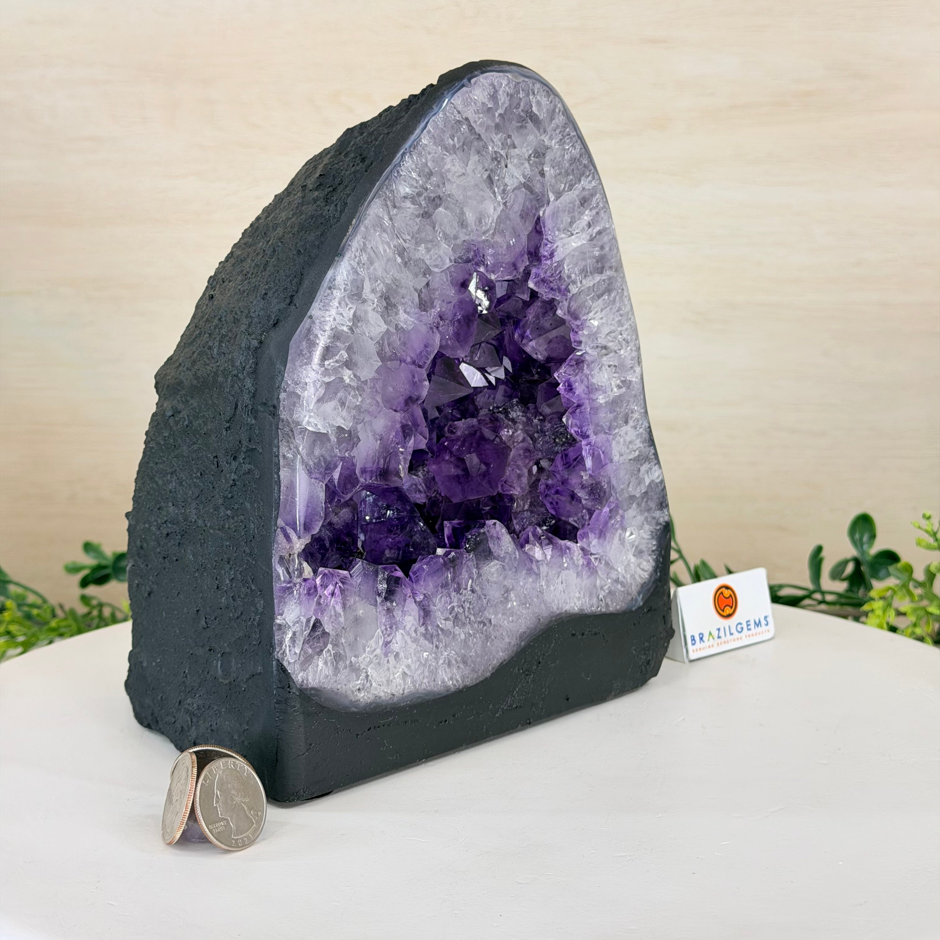 Disclaimer: This is a natural gemstone crystal sold by Brazil Gems® as is and as you see it in its images and video. It is the exact one you will receive. It may contain natural imperfections as well as imperfections, broken edges and repairs from the extraction, polishing and prepping processes. In order for it to stand on its own, the back and bottom have been reinforced with a small amount of cement then painted black. At Brazil Gems® we make every effort to get measurements as exact as possible but they are done by human hands and eyes and therefore may have minor discrepancies.