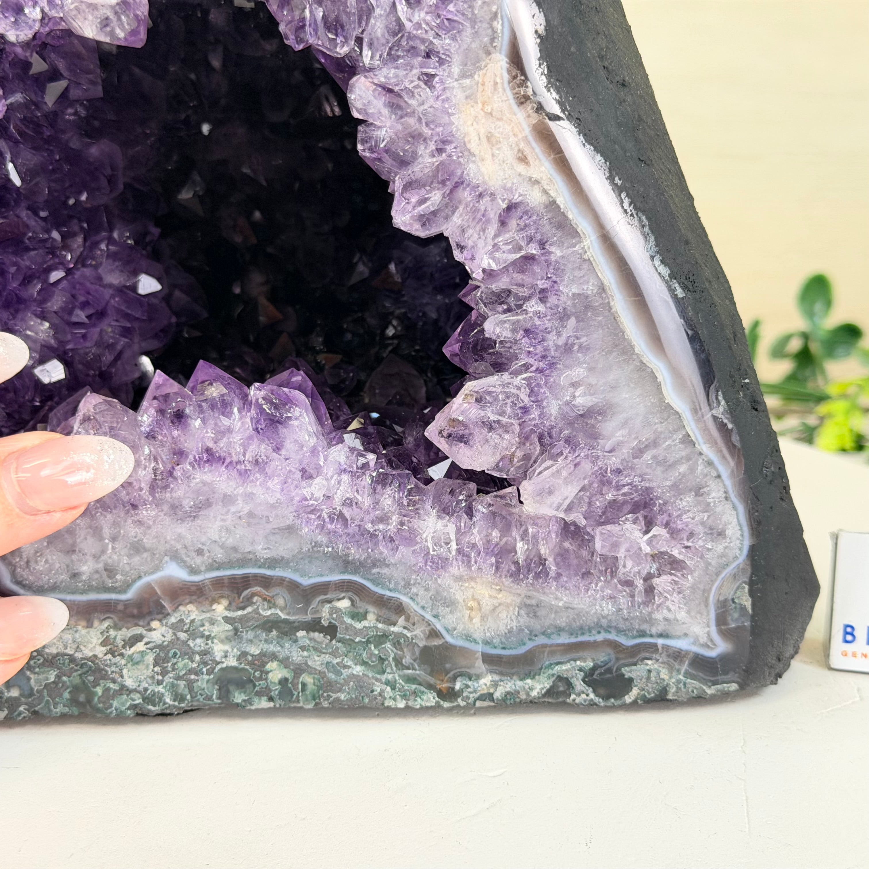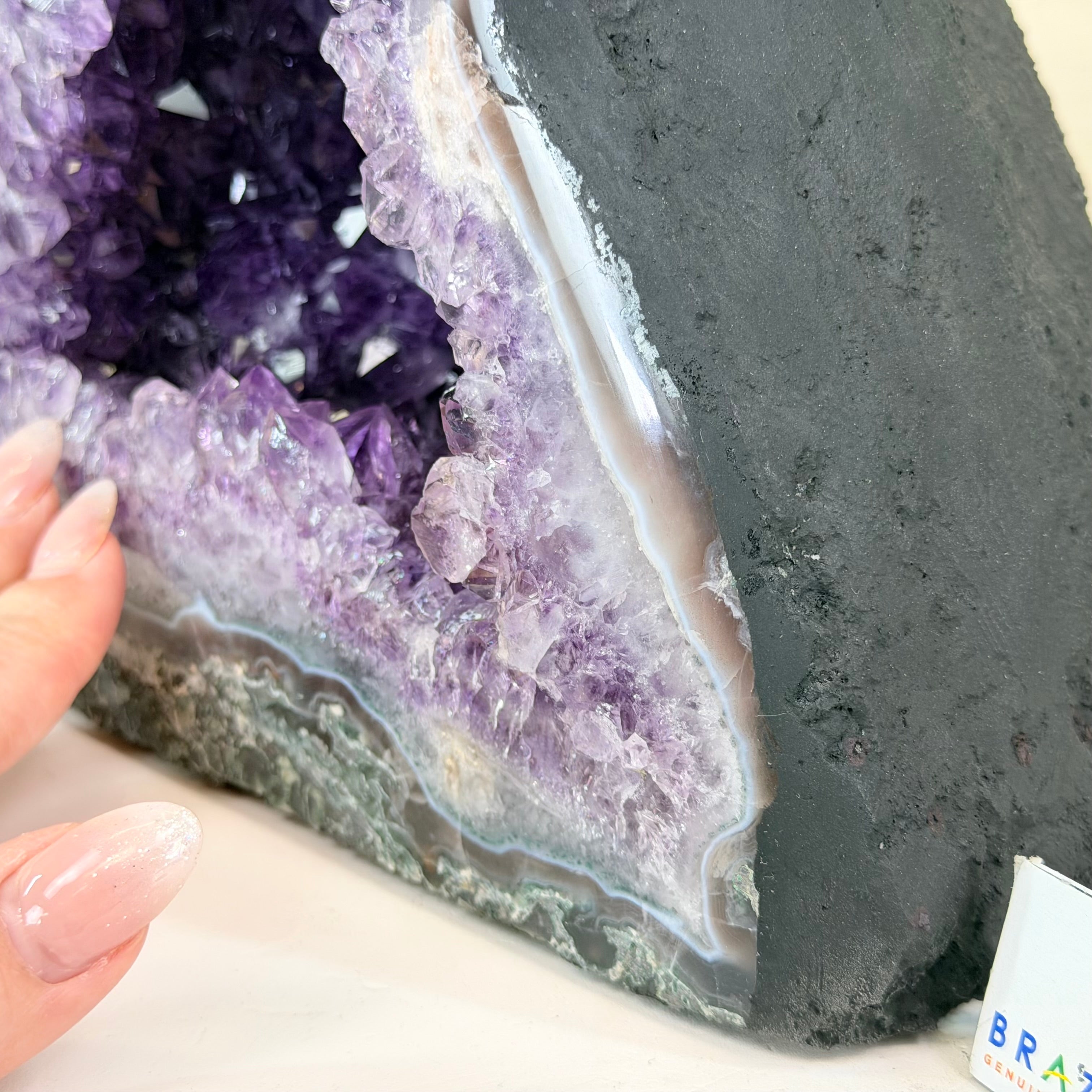 Disclaimer: This is a natural gemstone crystal sold by Brazil Gems® as is and as you see it in its images and video. It is the exact one you will receive. It may contain natural imperfections as well as imperfections, broken edges and repairs from the extraction, polishing and prepping processes. In order for it to stand on its own, the back and bottom have been reinforced with a small amount of cement then painted black. At Brazil Gems® we make every effort to get measurements as exact as possible but they are done by human hands and eyes and therefore may have minor discrepancies.