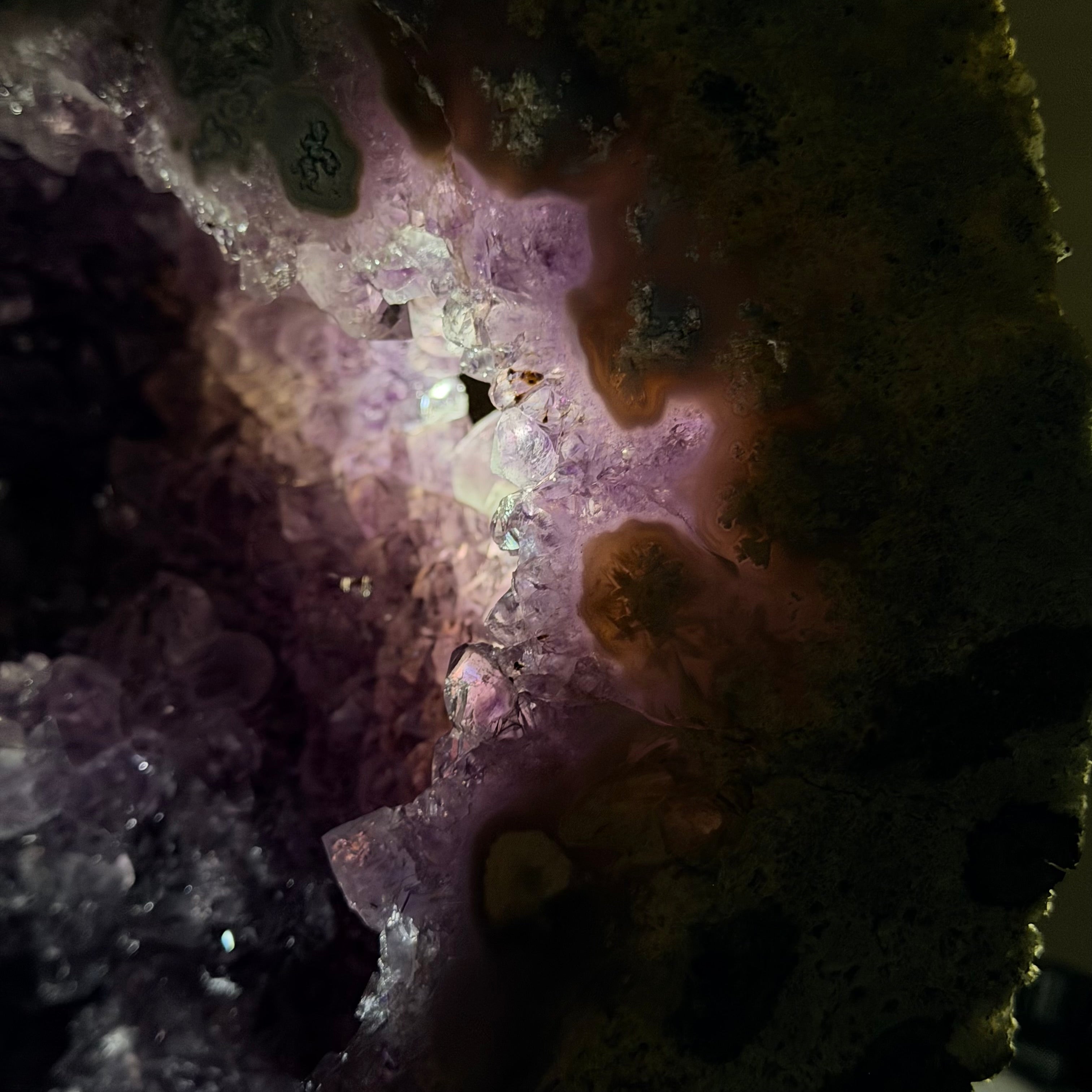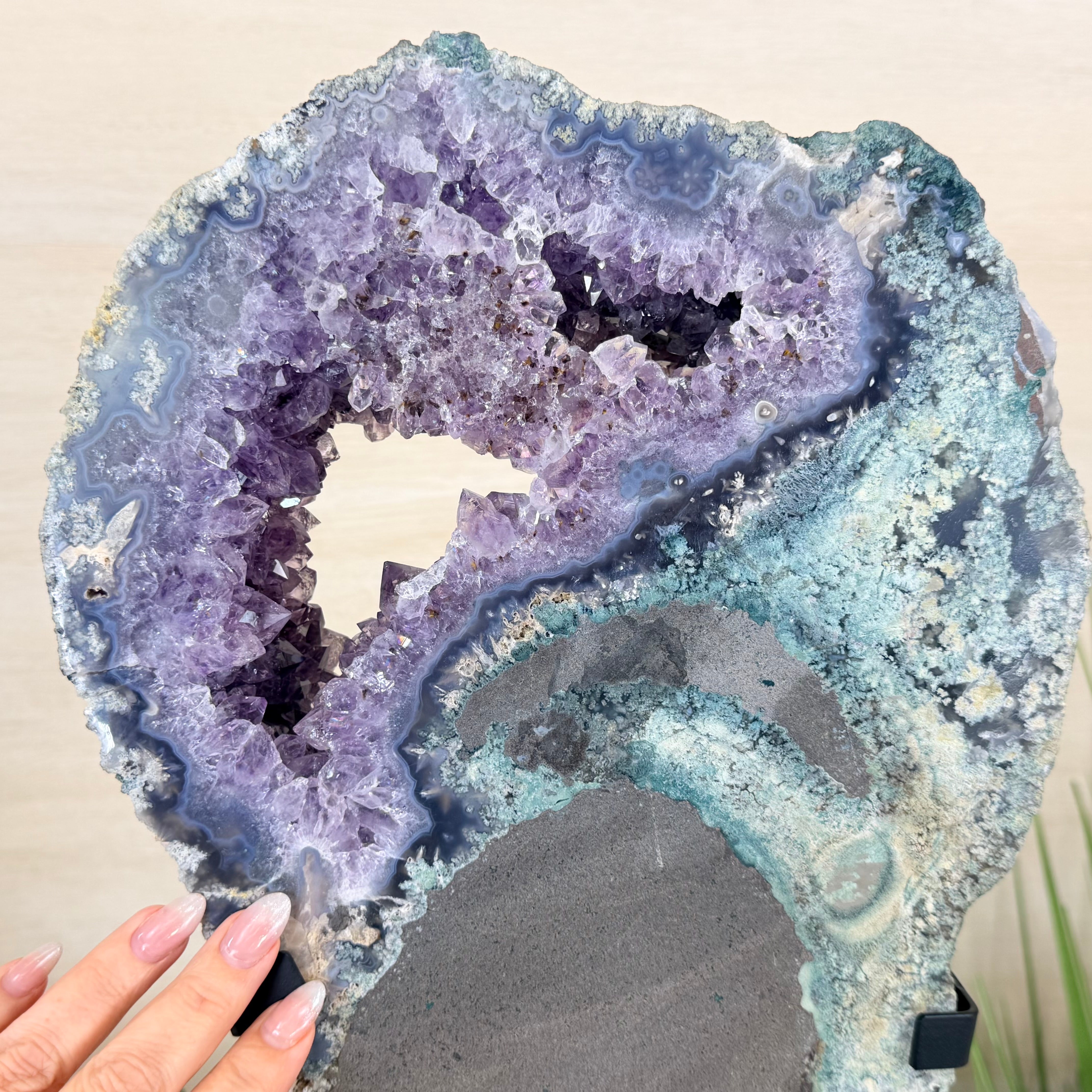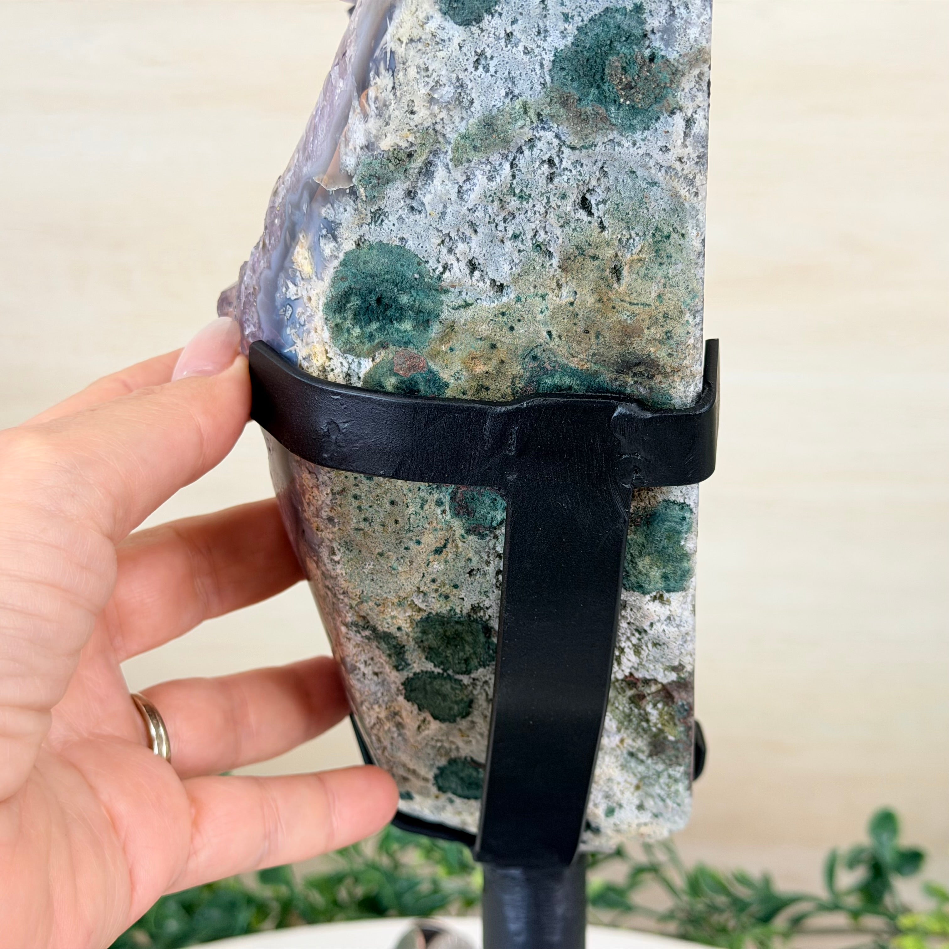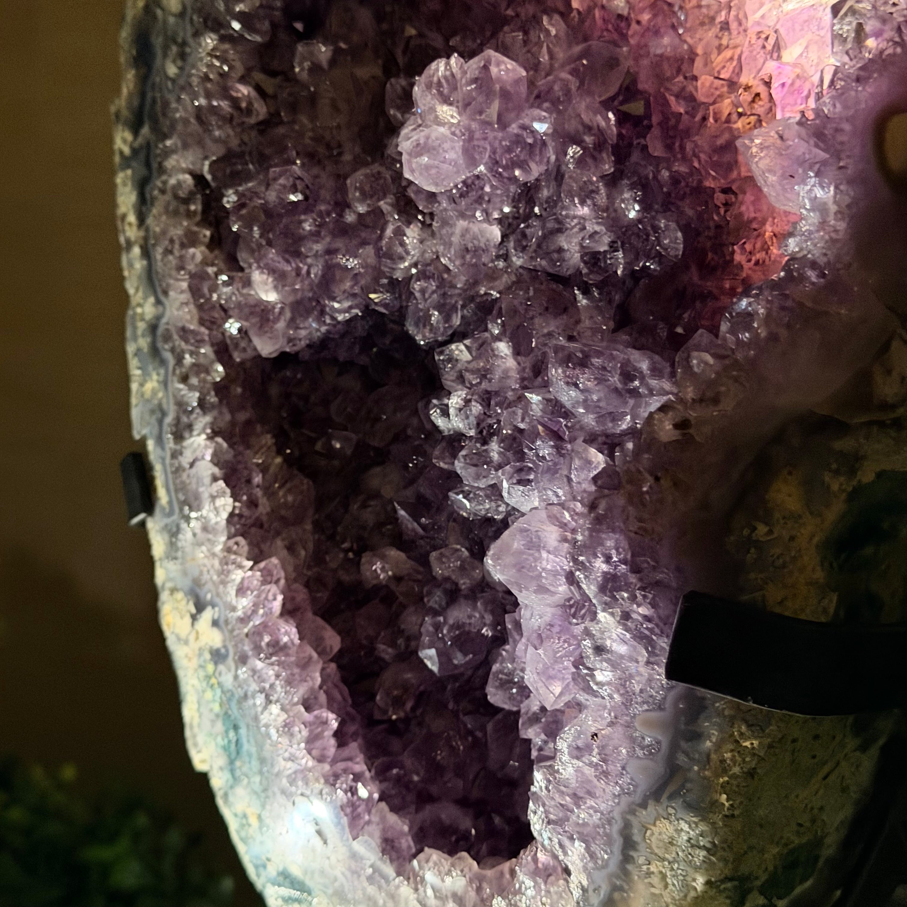 Unveil the charm of this natural Extra Quality Brazilian Amethyst Crystal "Portal" on a black metal fixed stand. Smoothly polished on back sides with a natural outer shell. Very special!