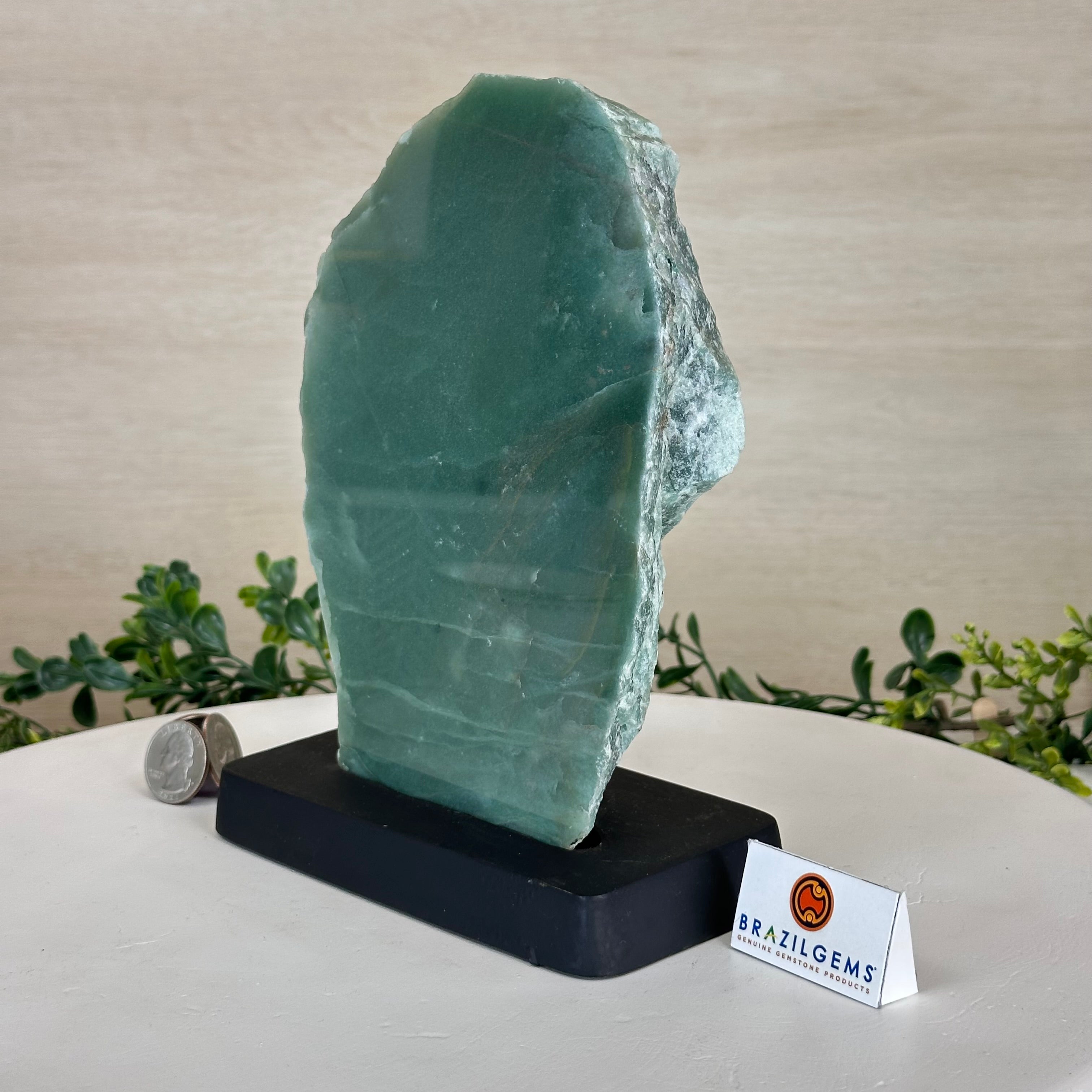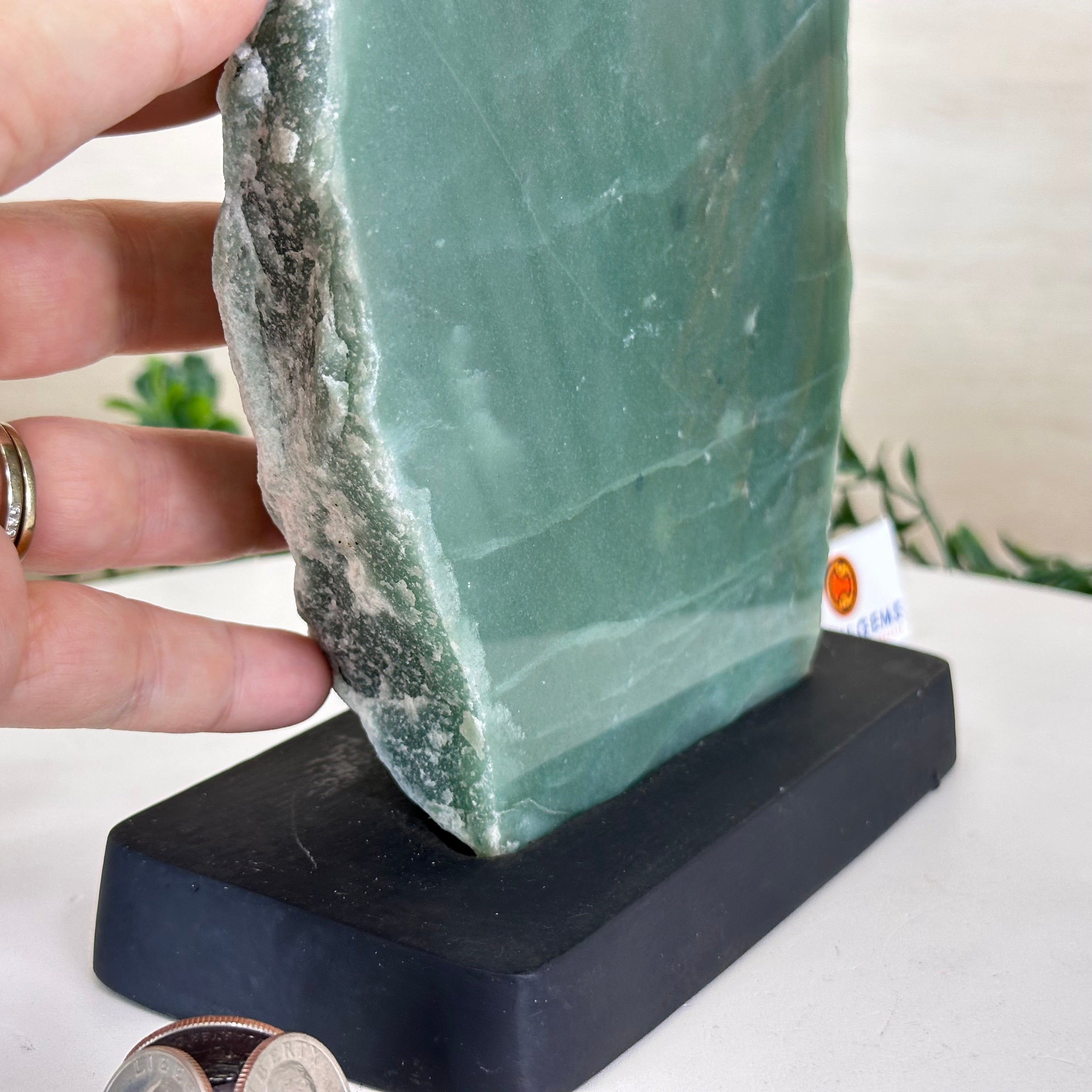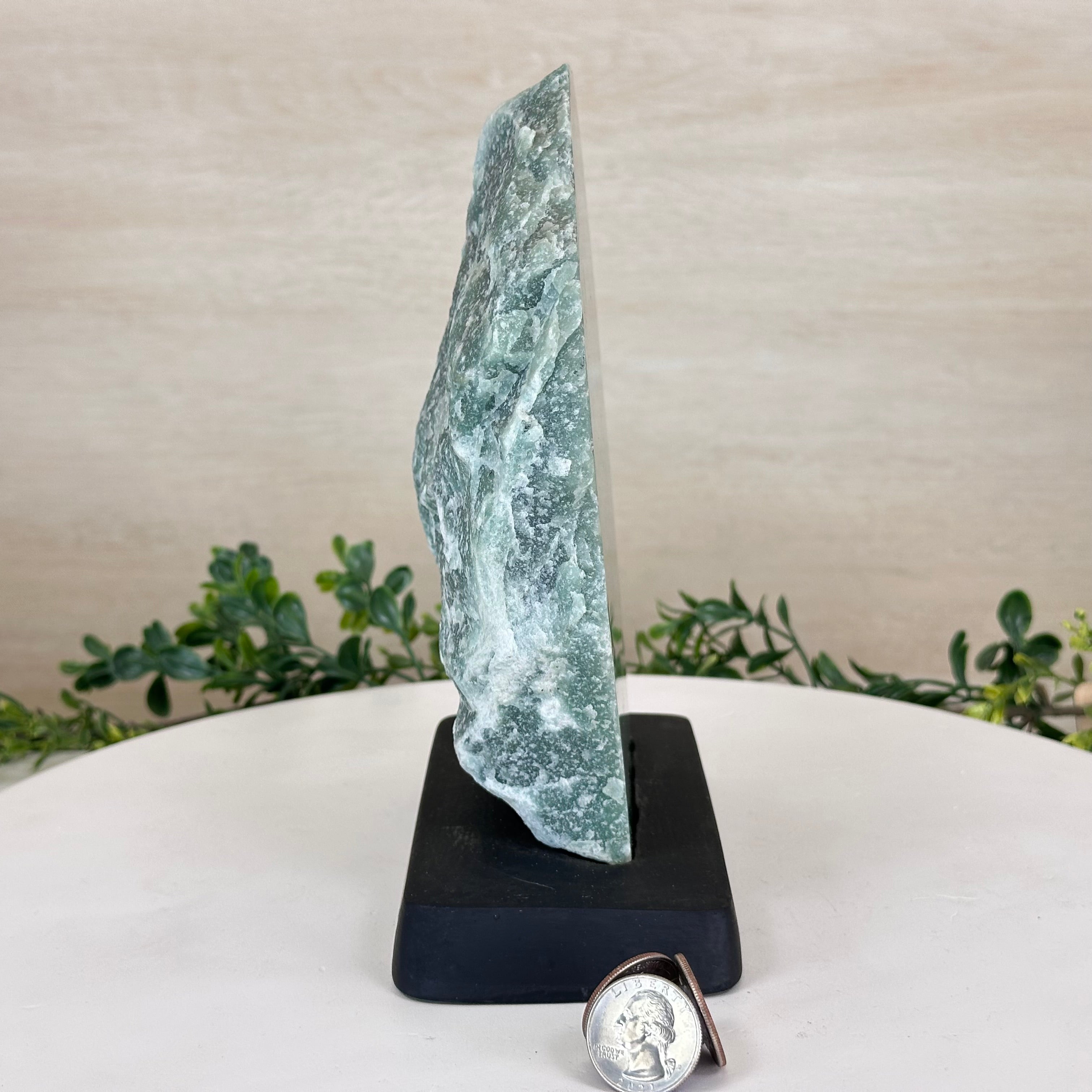 Green Quartz Polished Slice with Rough Edges, Wood Base 8.1" Tall # 6100GQ-030