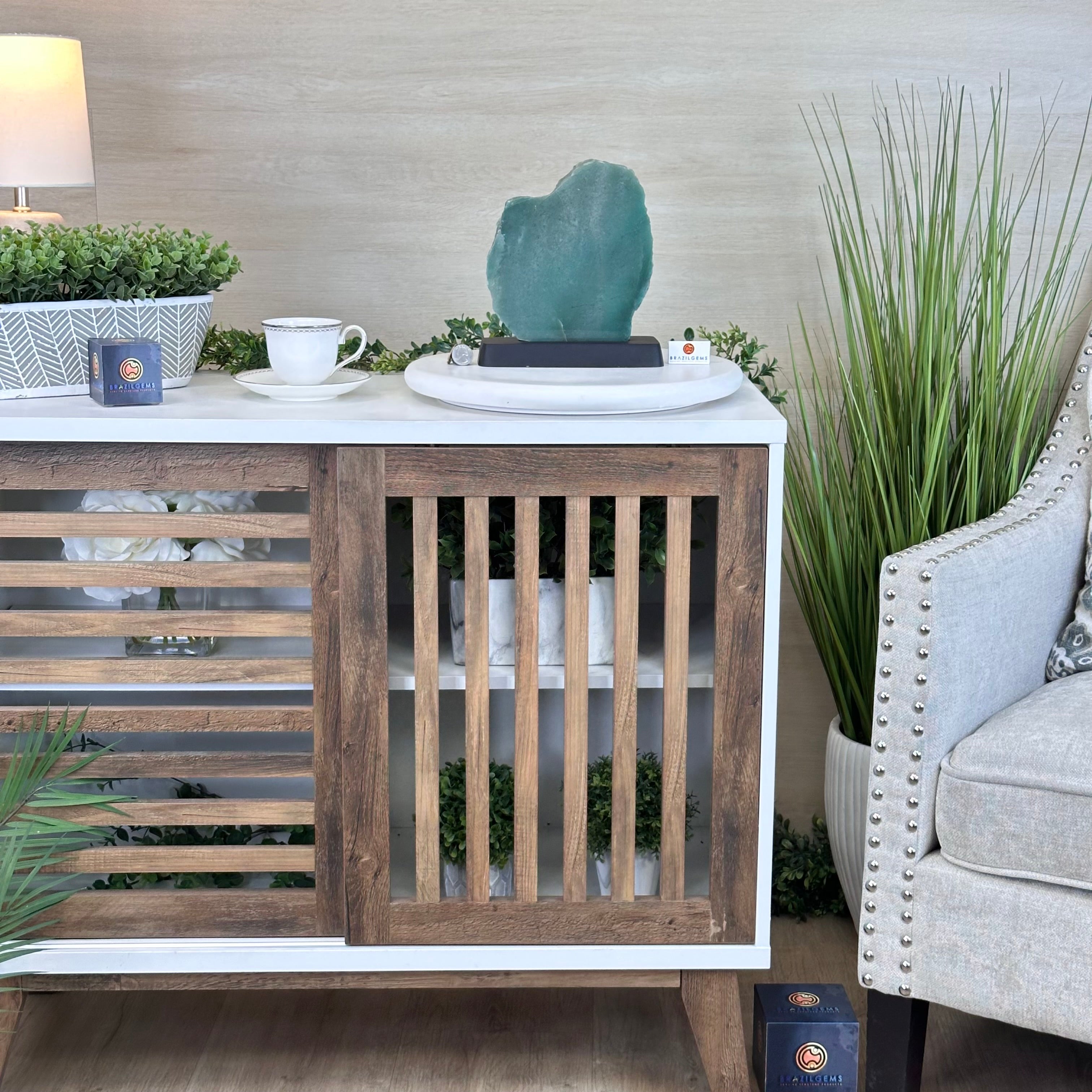 Elevate your space with this Brazilian Green Quartz Slice on a wood base. This piece is beautifully polished on the front with rough edges on the sides and the back. This slice will make a great addition or start to your crystal collection and will accent the décor of any room.