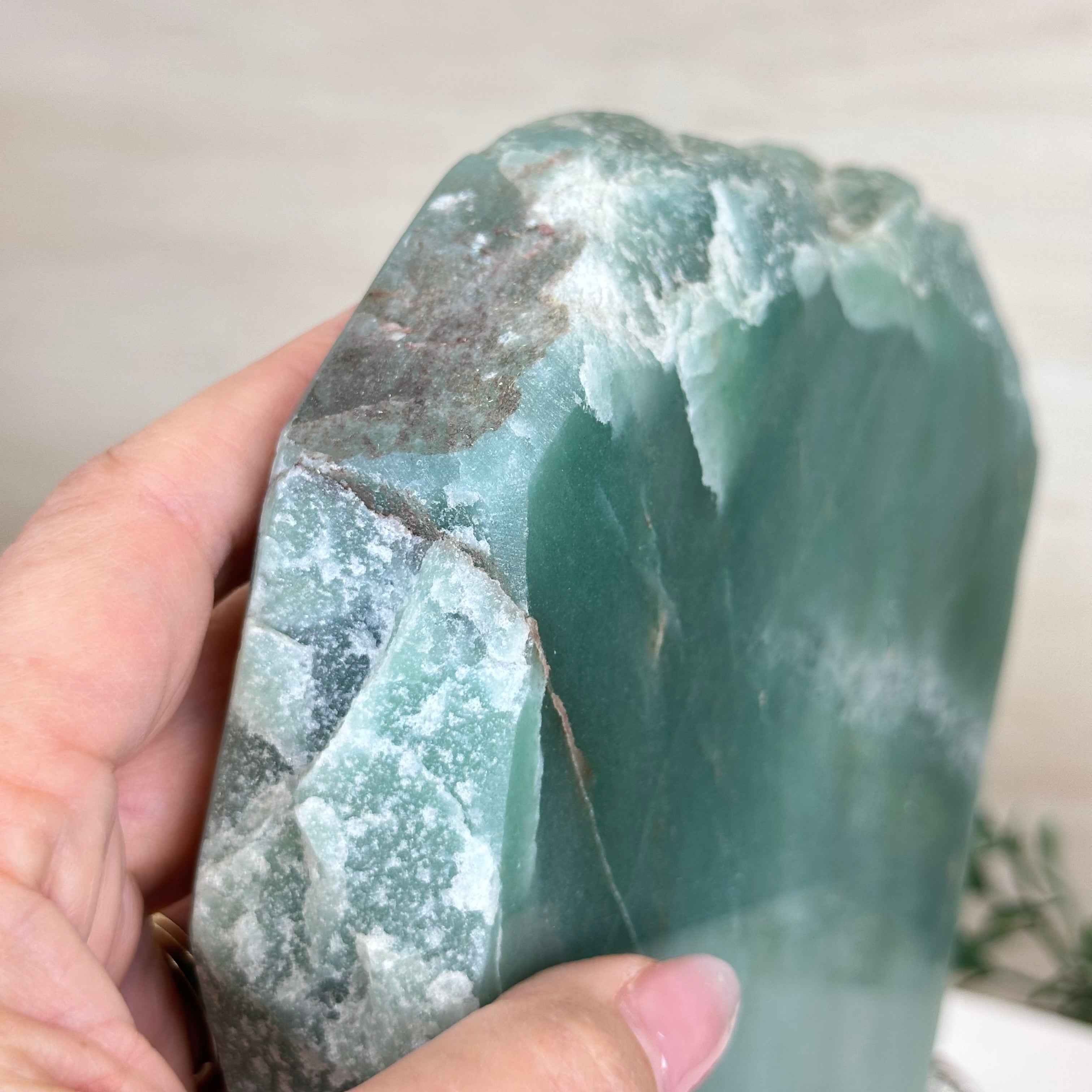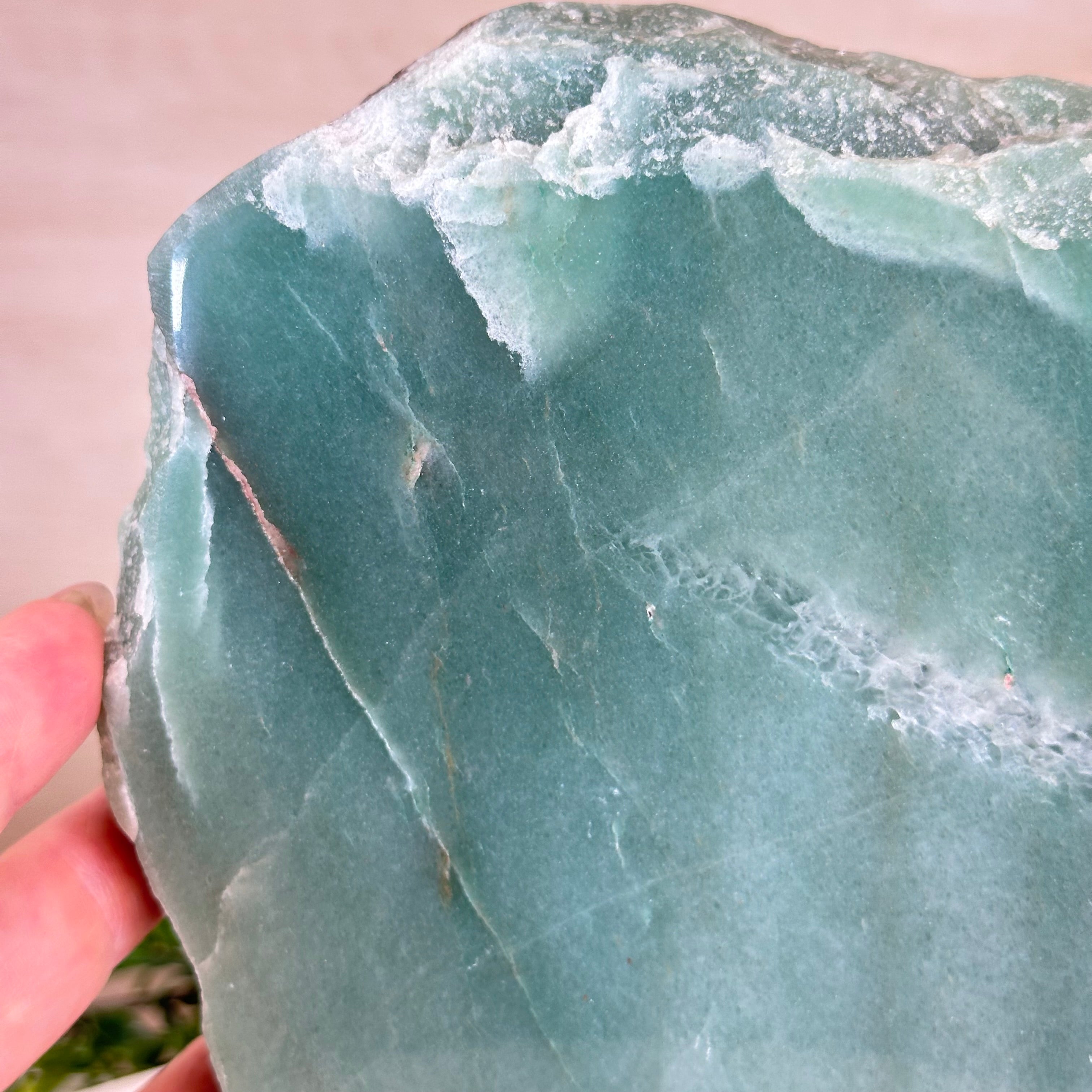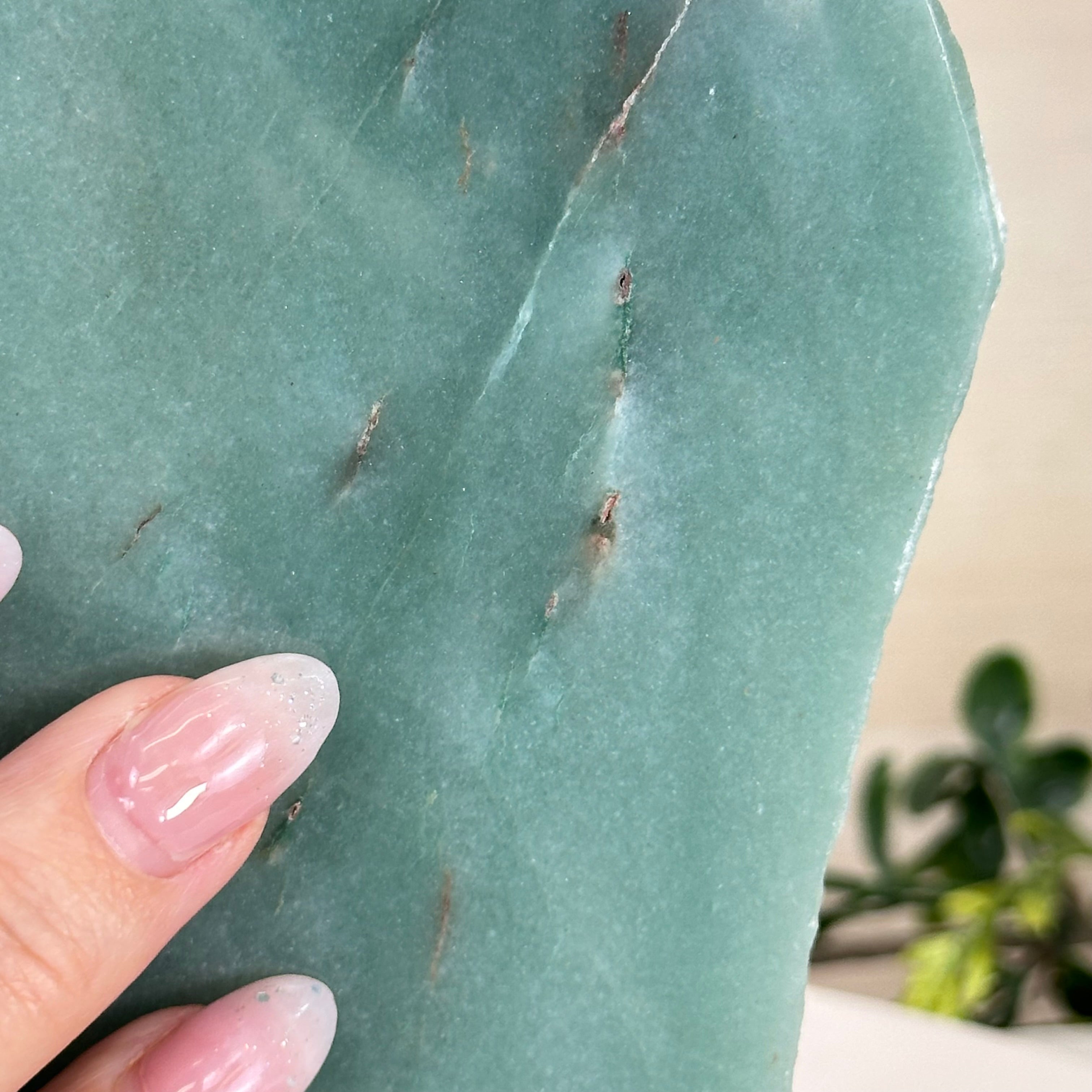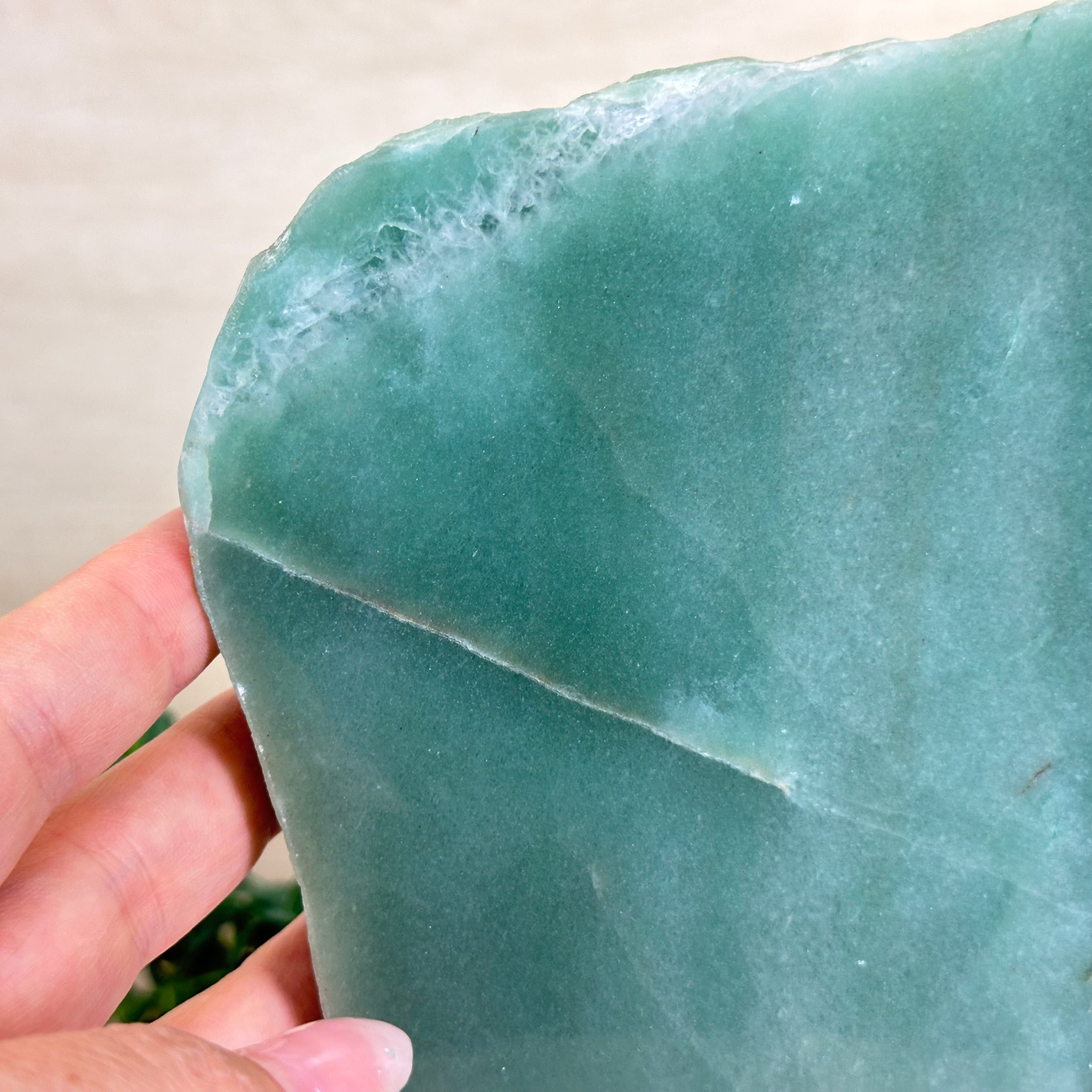 Green Quartz Polished Slice with Rough Edges, Wood Base 8.4" Tall # 6100GQ-033