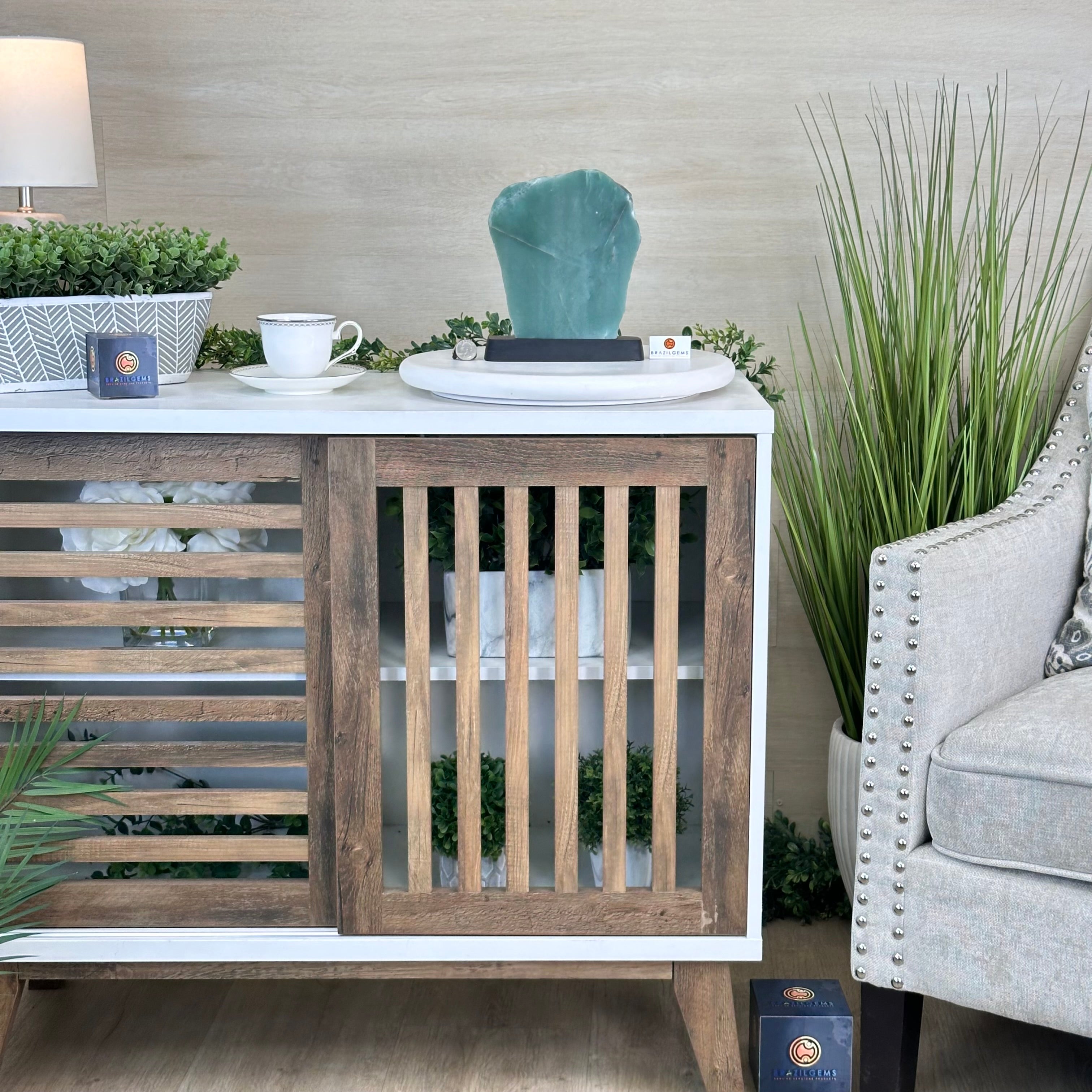 Elevate your space with this Brazilian Green Quartz Slice on a wood base. This piece is beautifully polished on the front with rough edges on the sides and the back. This slice will make a great addition or start to your crystal collection and will accent the décor of any room.
