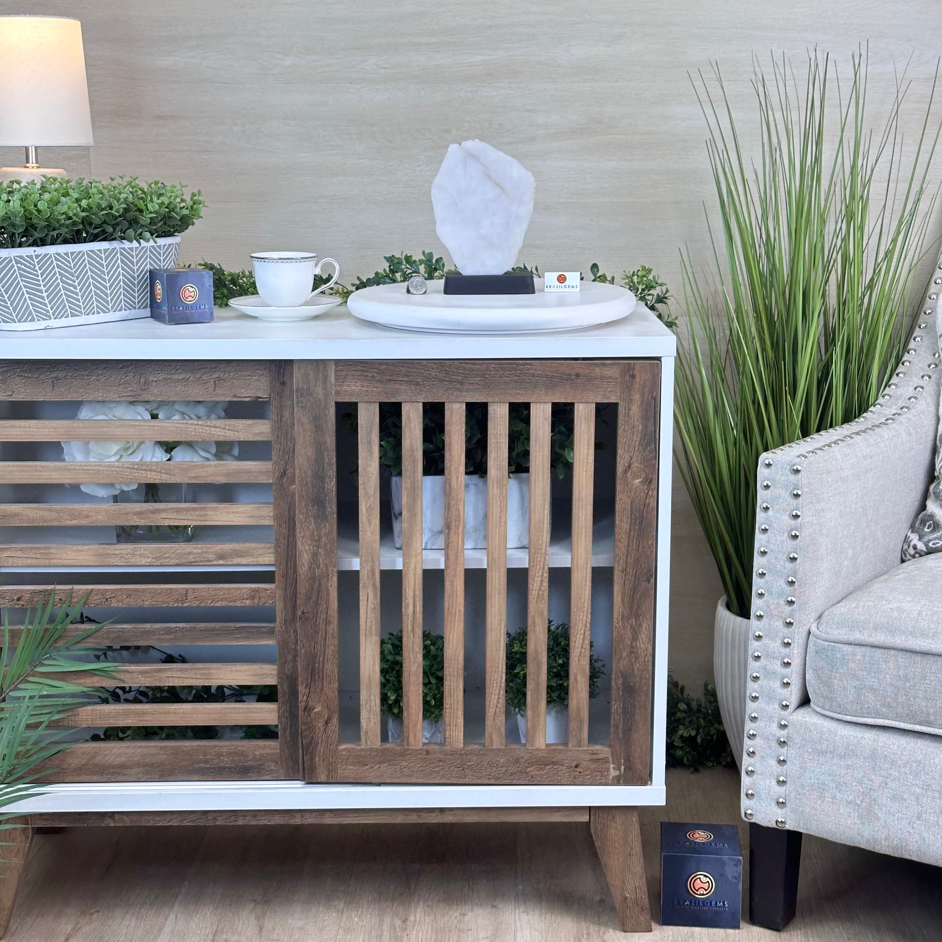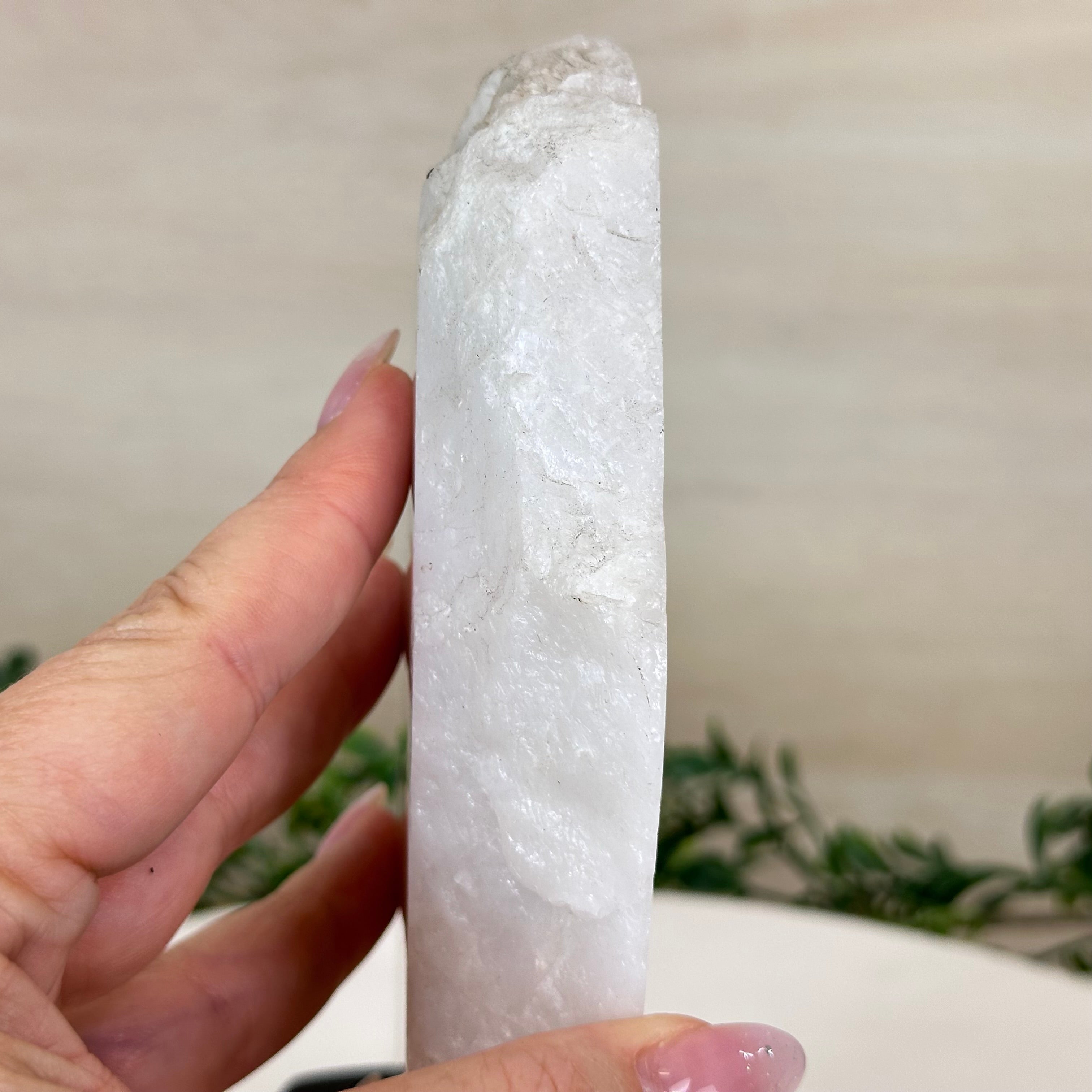 Elevate your space with this Brazilian Milky Quartz Slice on a wood base. This piece is beautifully polished on the front with rough edges on the sides and the back. This slice will make a great addition or start to your crystal collection and will accent the décor of any room.