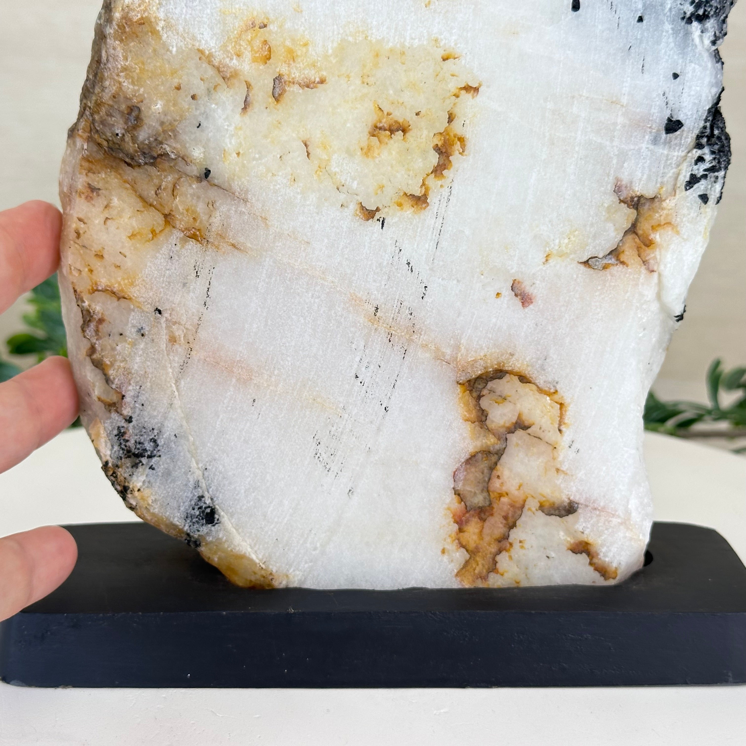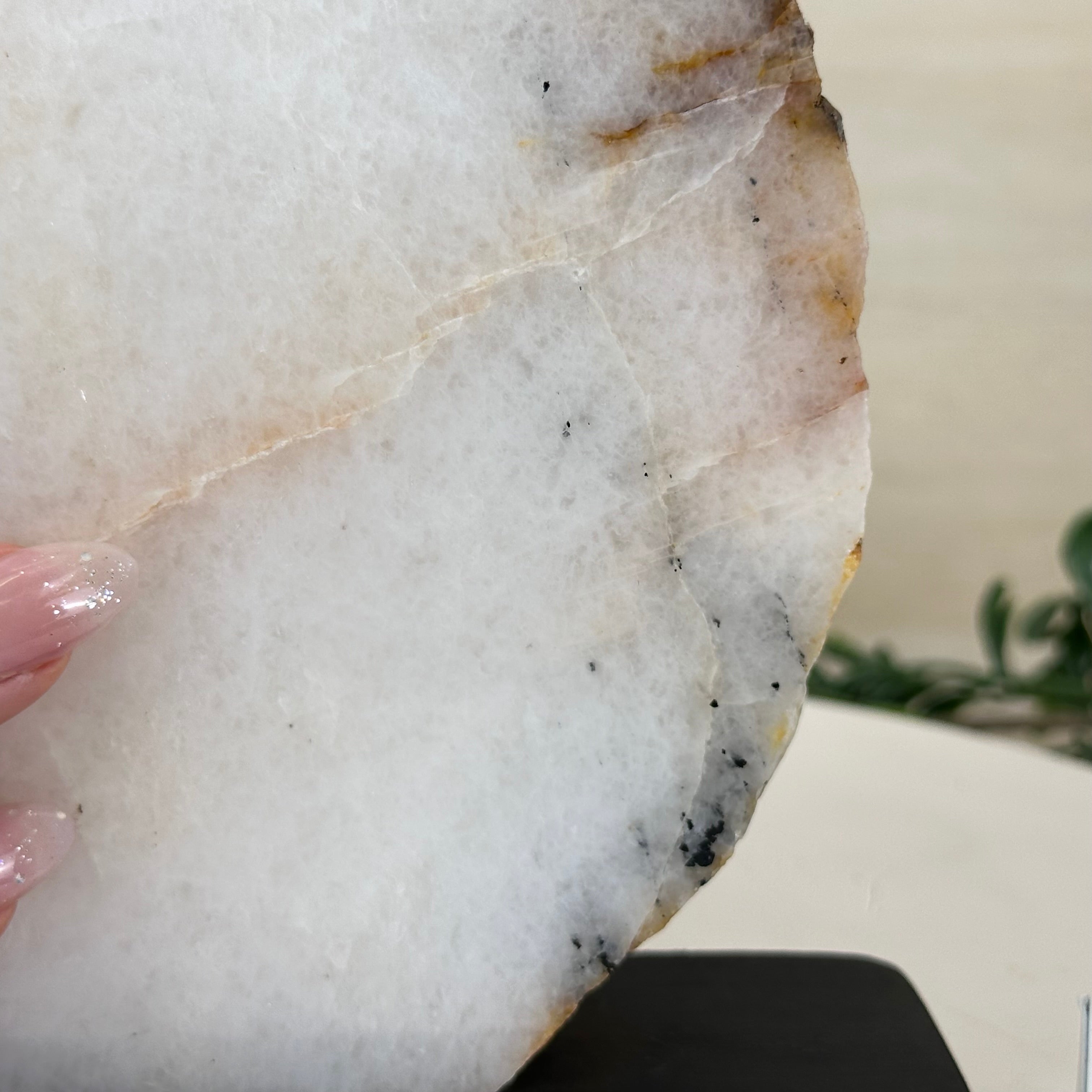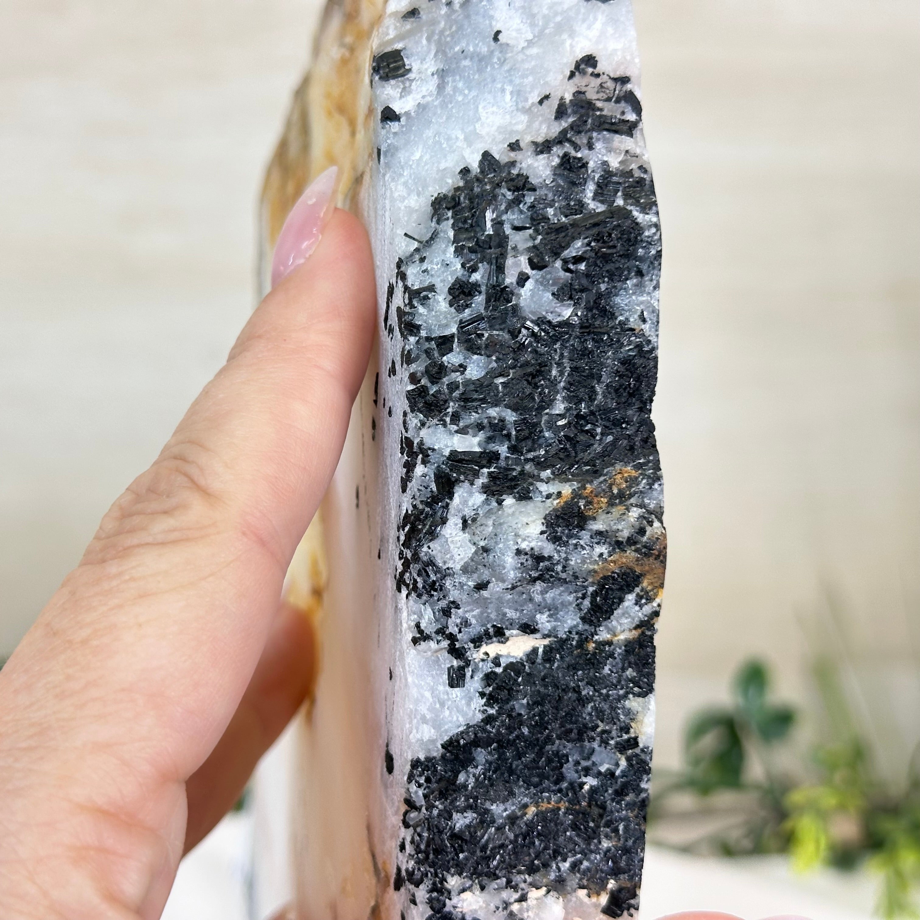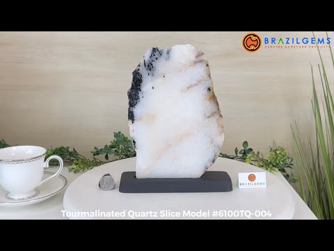 Elevate your space with this Brazilian Tourmalinated Quartz Slice on a wood base. Tourmalinated Quartz is a dazzling gemstone that has Black Tourmaline threads naturally embedded in Clear or Milky Quartz. This piece is beautifully polished on the front with rough edges on the sides and the back. This slice will make a great addition or start to your crystal collection and will accent the décor of any room.