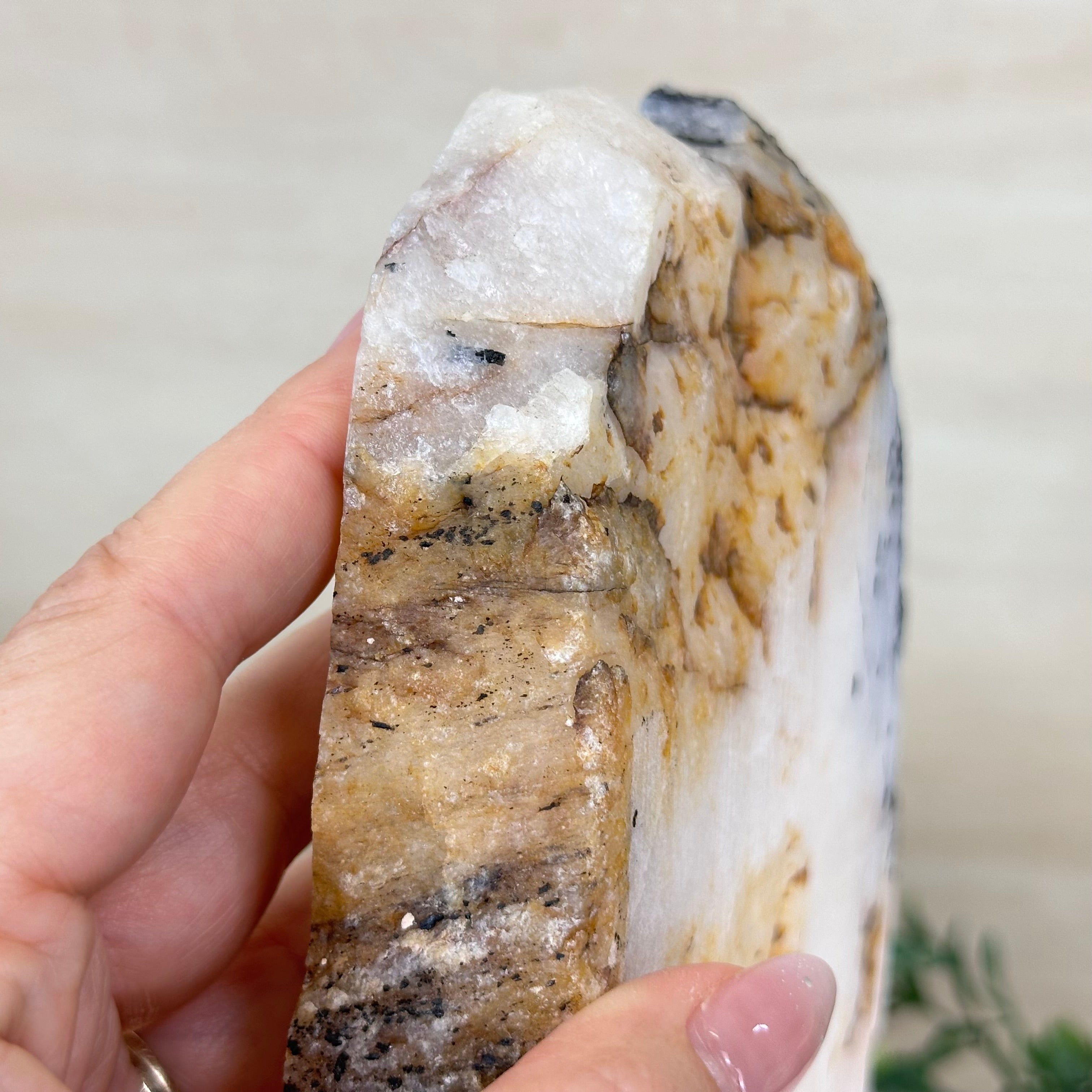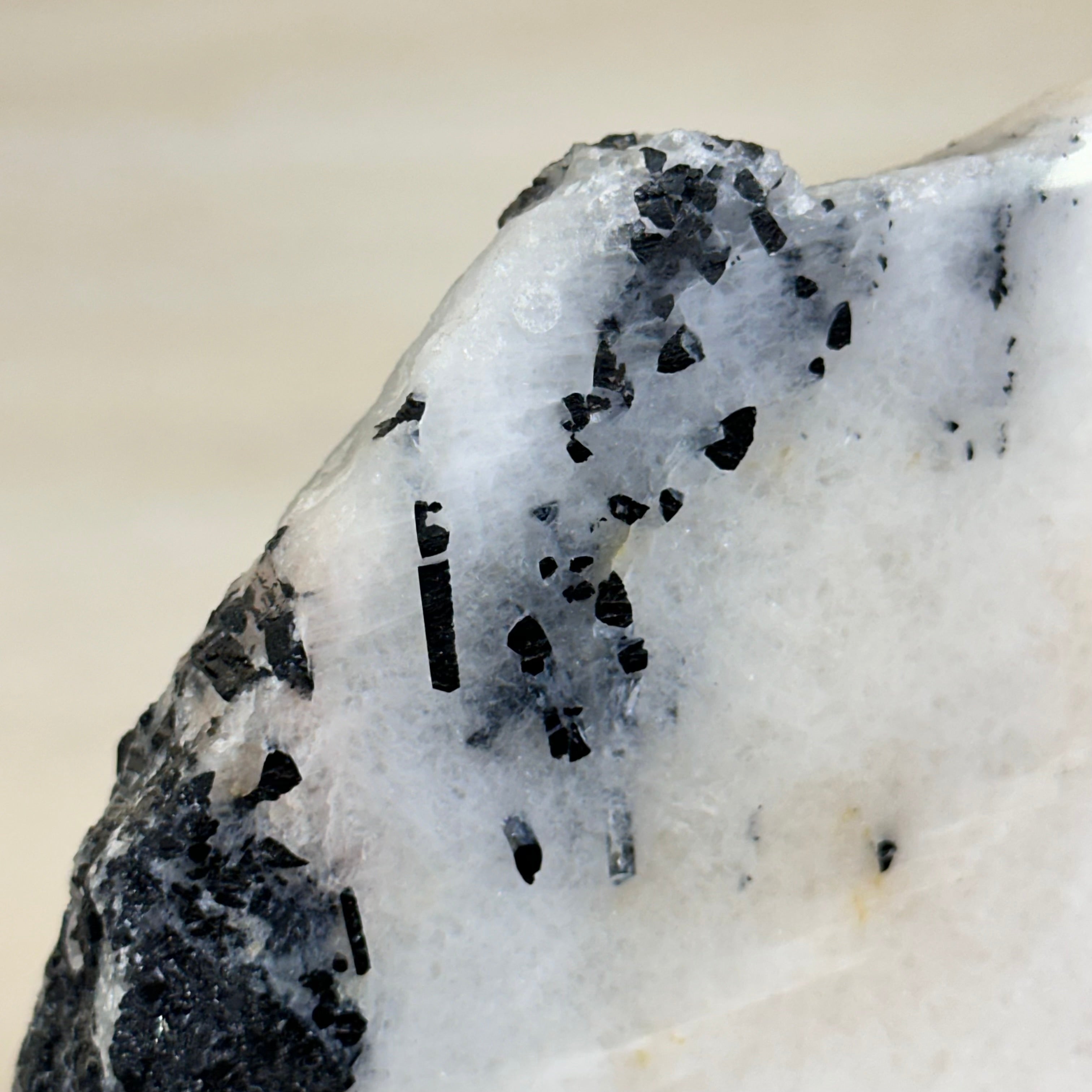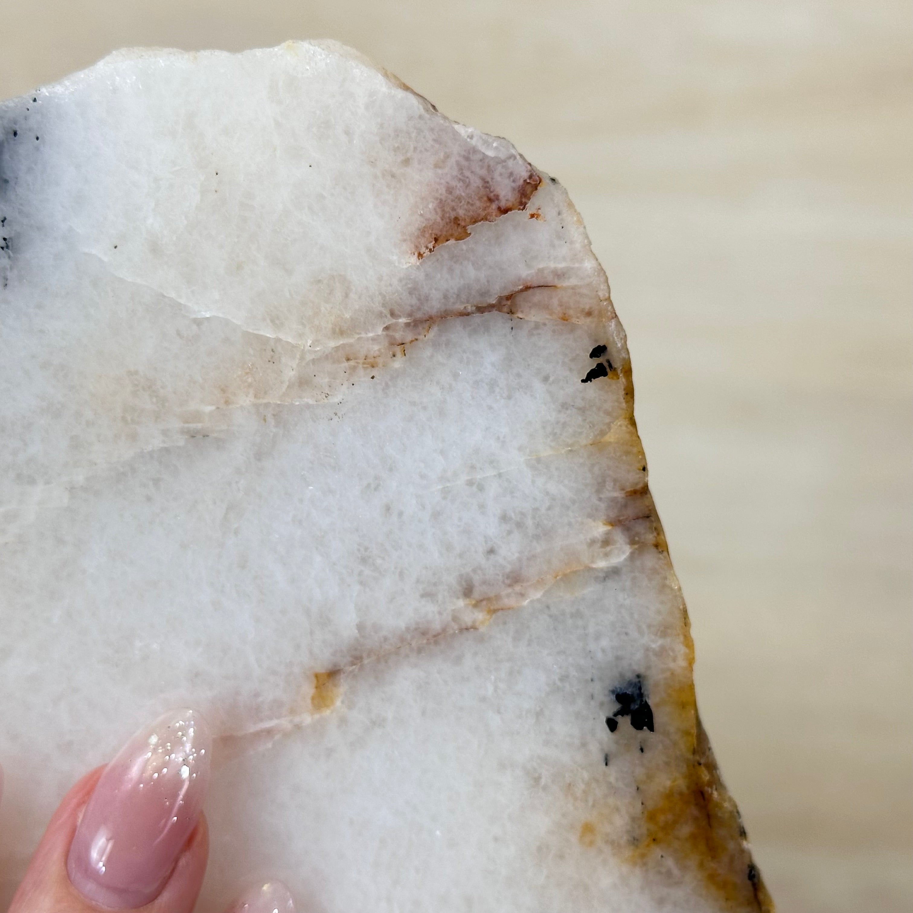 Elevate your space with this Brazilian Tourmalinated Quartz Slice on a wood base. Tourmalinated Quartz is a dazzling gemstone that has Black Tourmaline threads naturally embedded in Clear or Milky Quartz. This piece is beautifully polished on the front with rough edges on the sides and the back. This slice will make a great addition or start to your crystal collection and will accent the décor of any room.