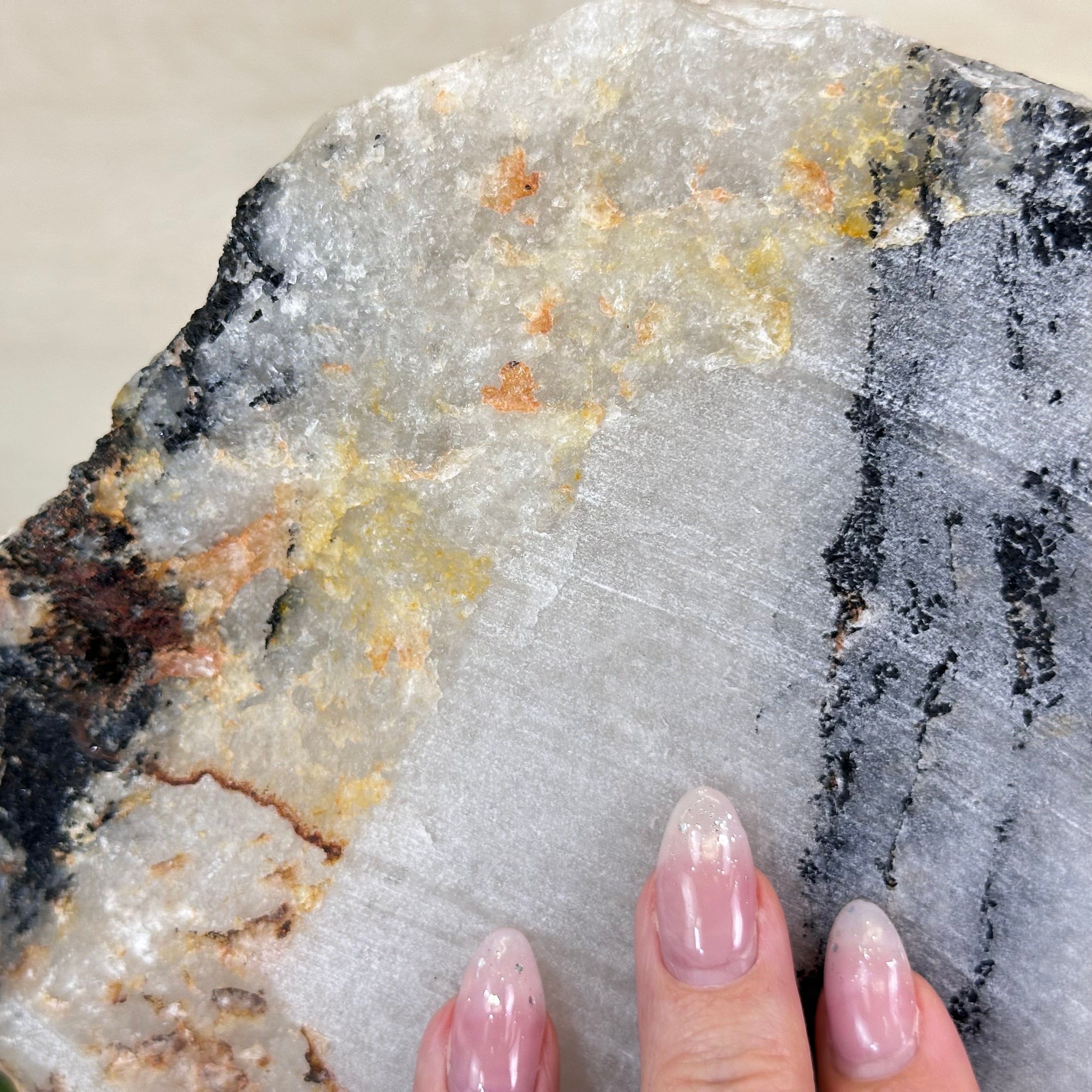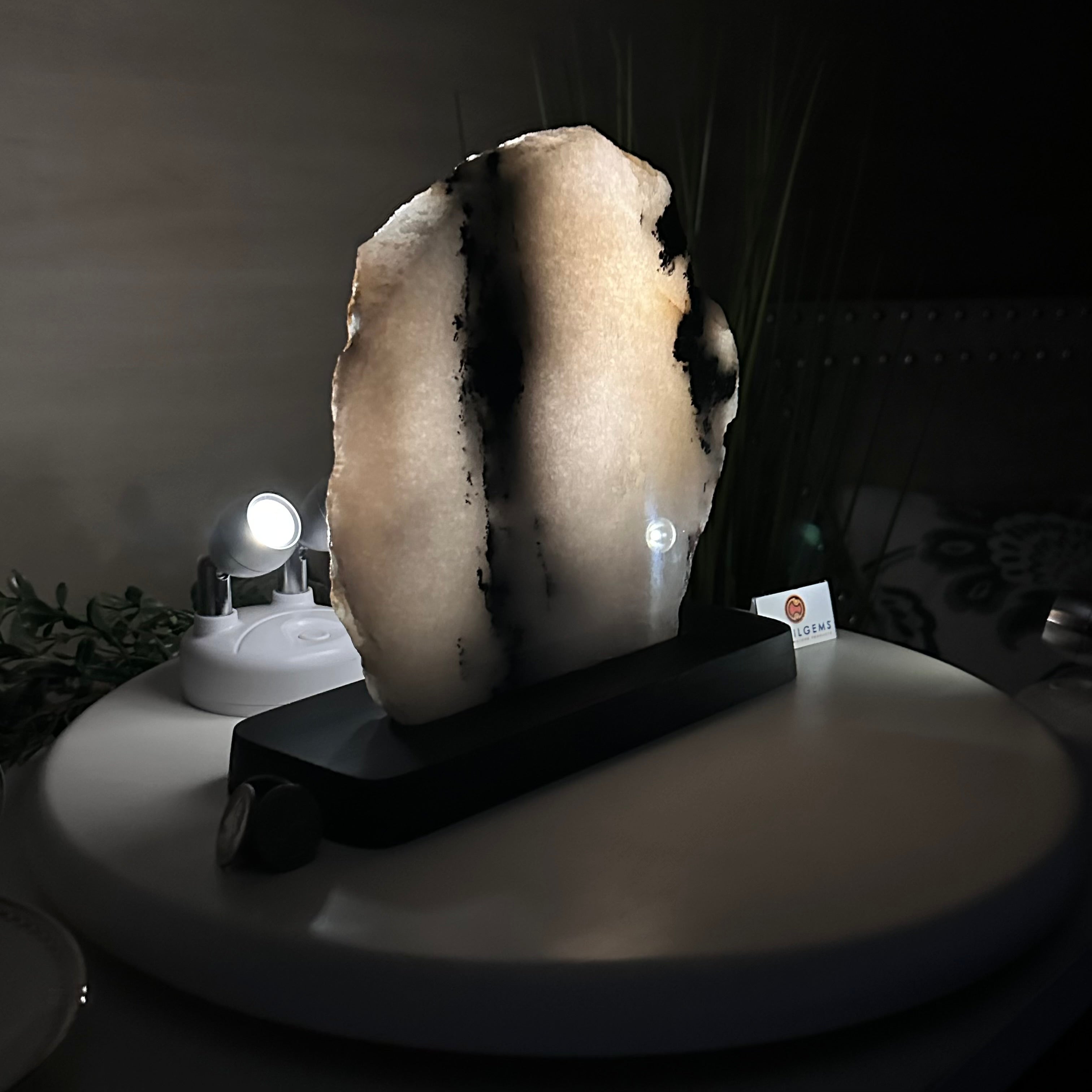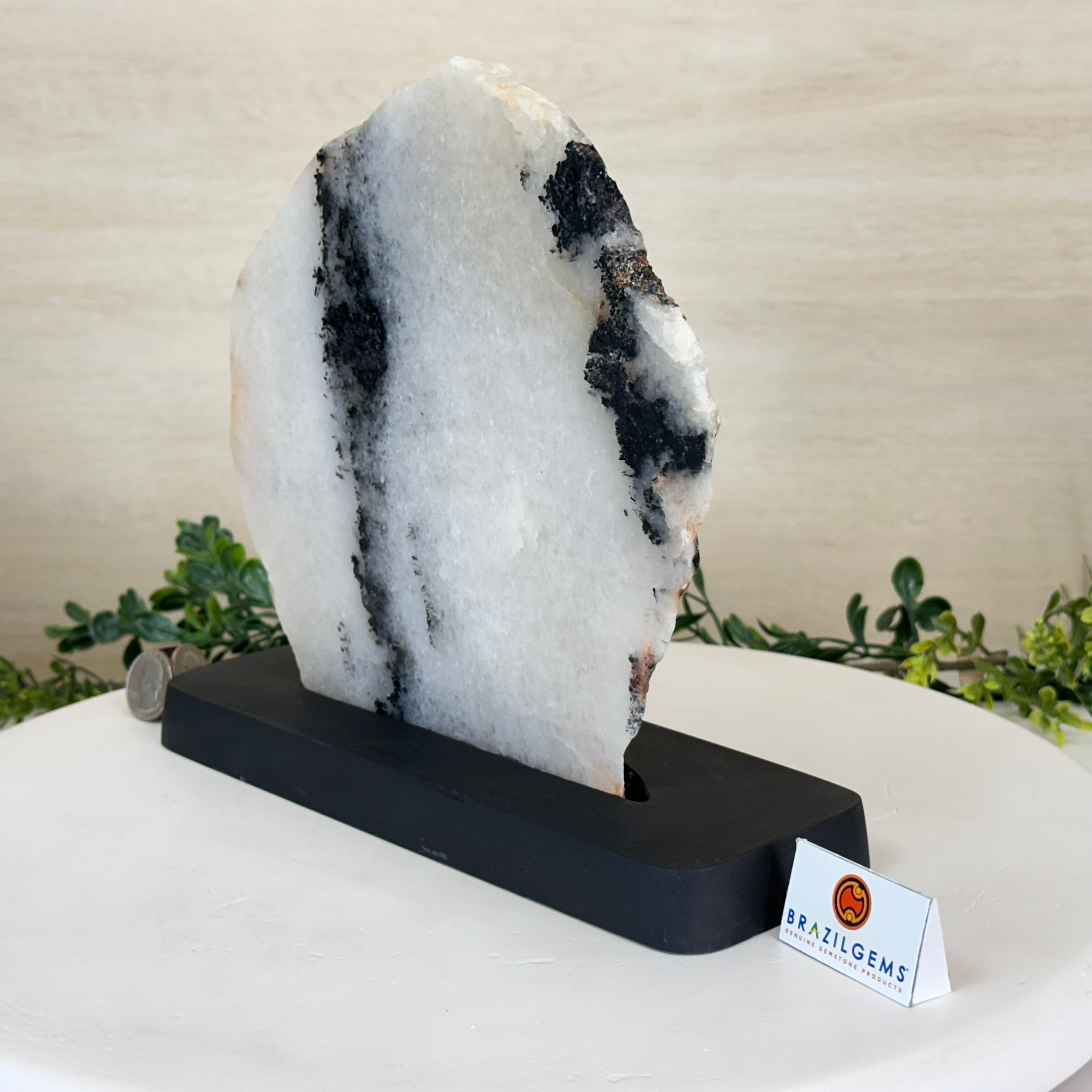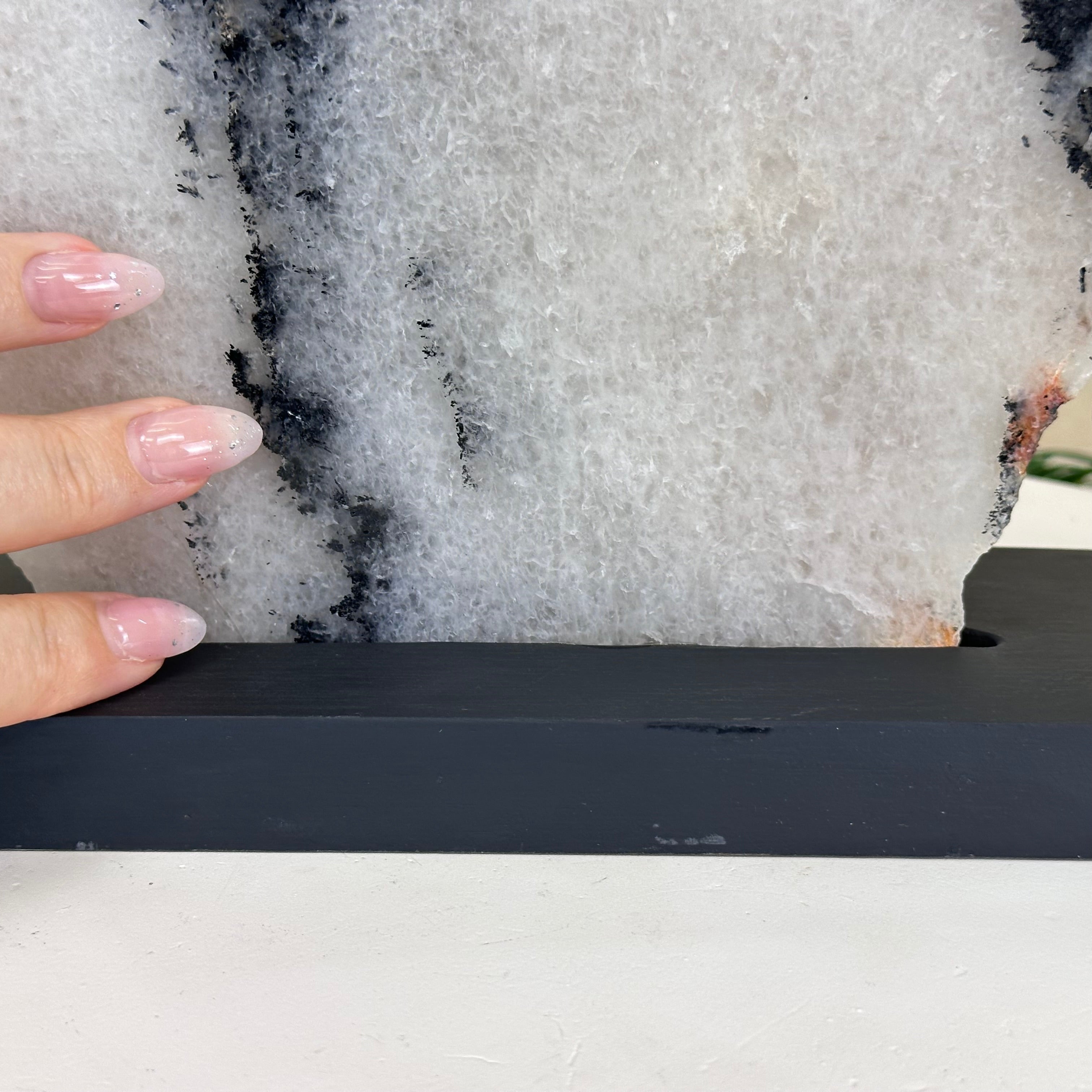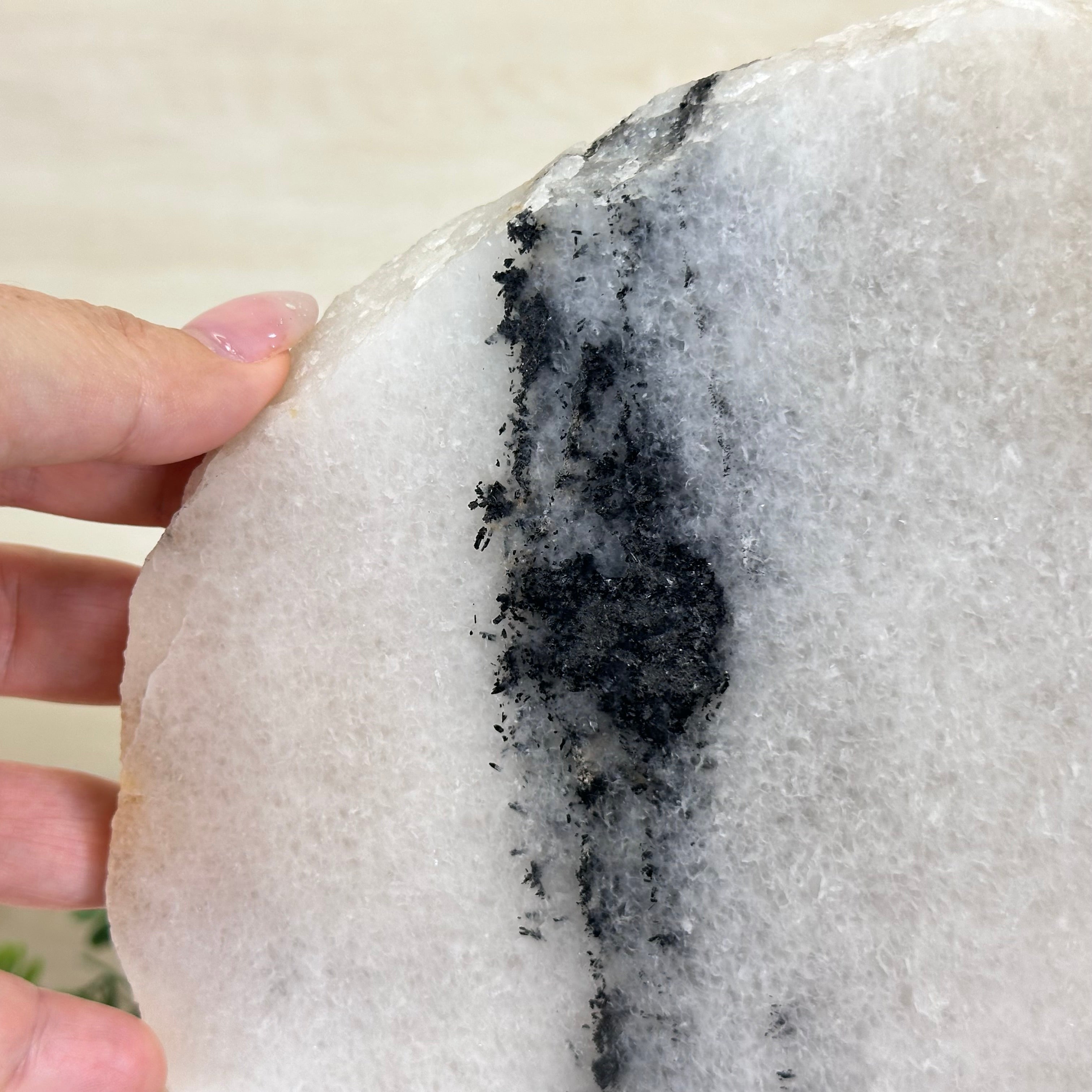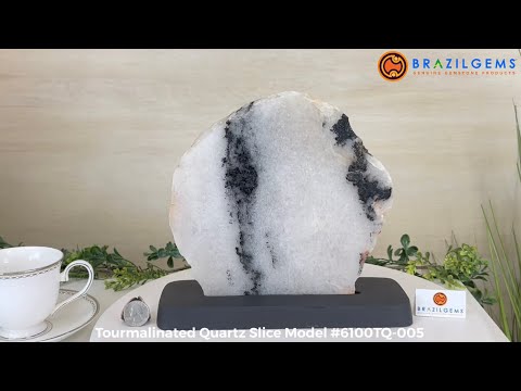 Elevate your space with this Brazilian Tourmalinated Quartz Slice on a wood base. Tourmalinated Quartz is a dazzling gemstone that has Black Tourmaline threads naturally embedded in Clear or Milky Quartz. This piece is beautifully polished on the front with rough edges on the sides and the back. This slice will make a great addition or start to your crystal collection and will accent the décor of any room.