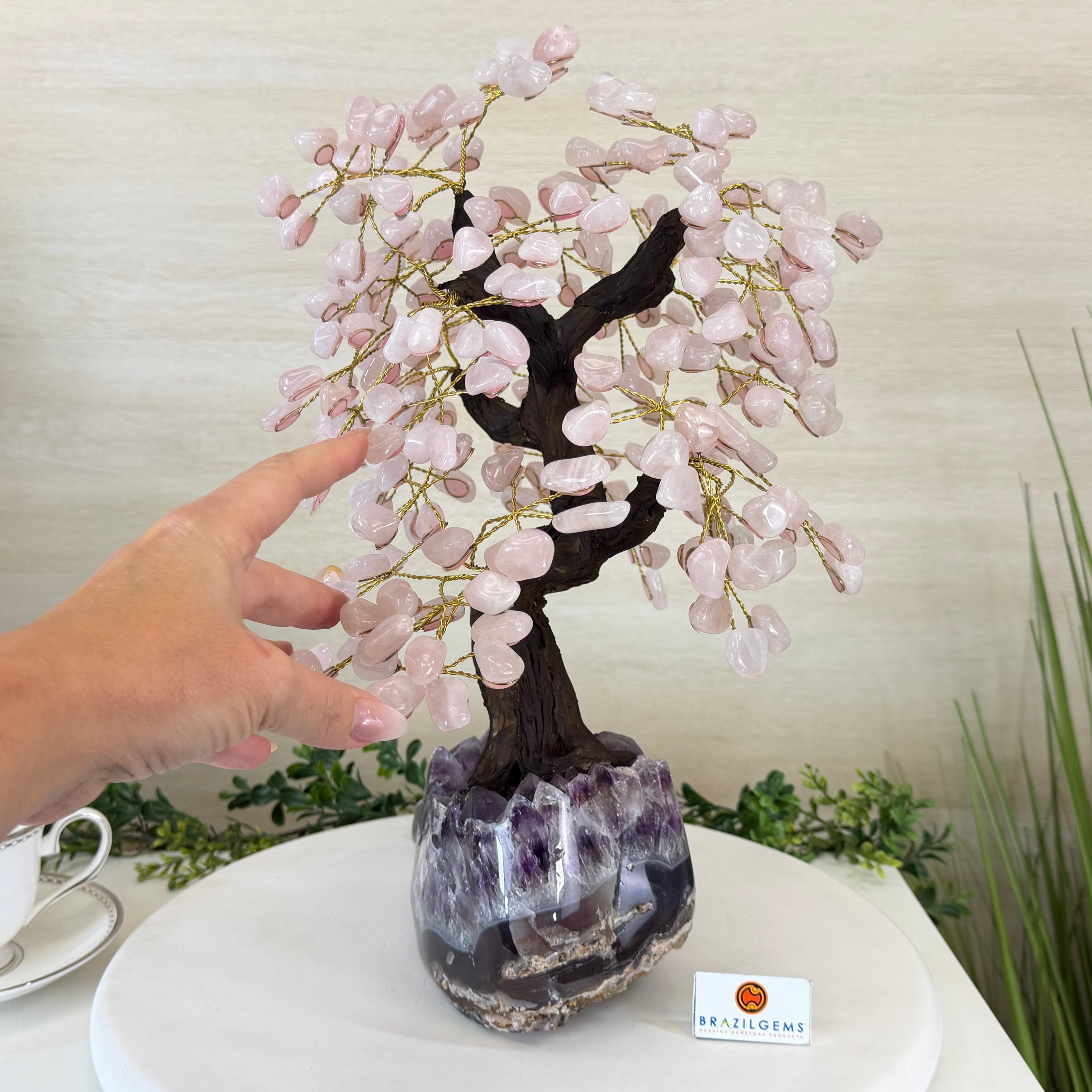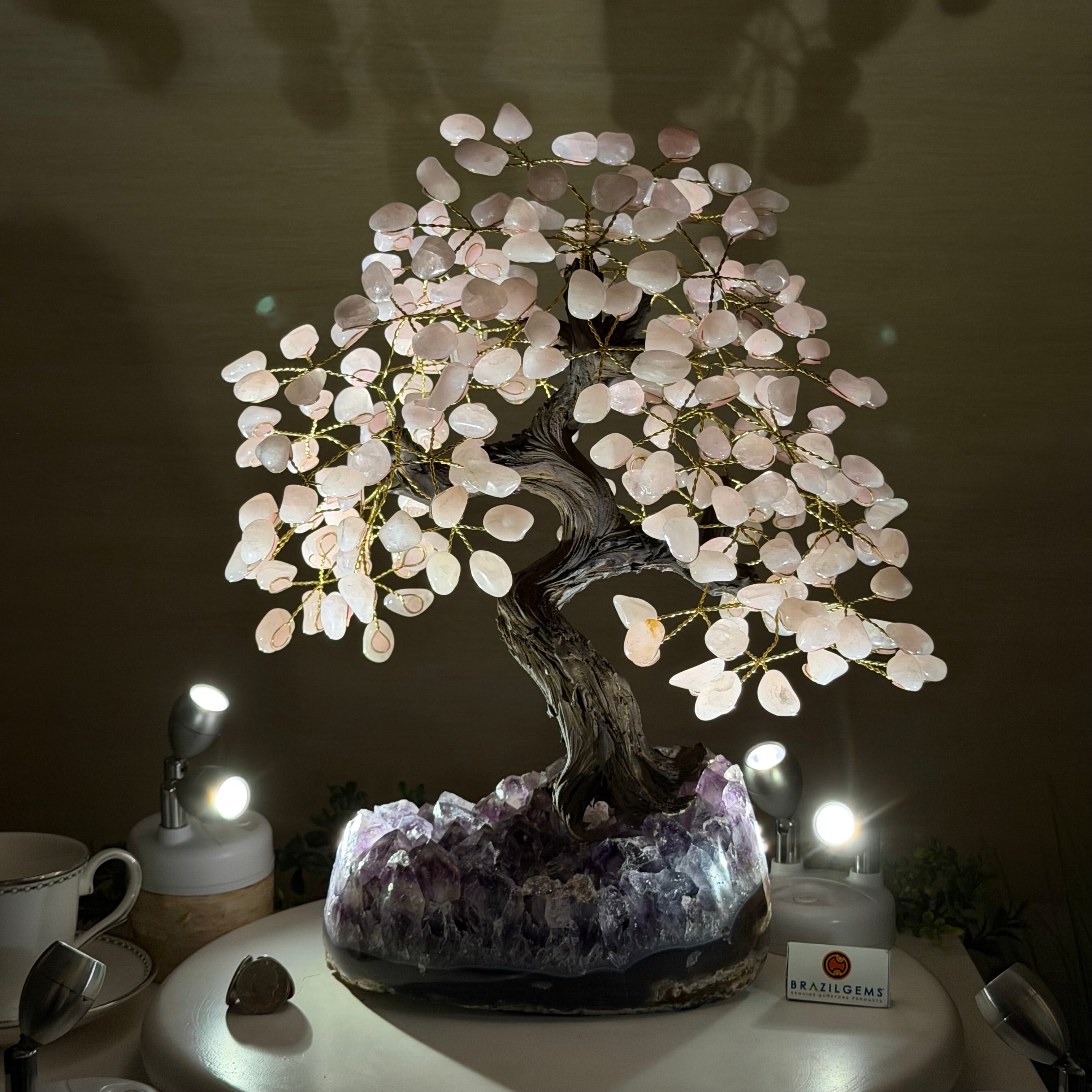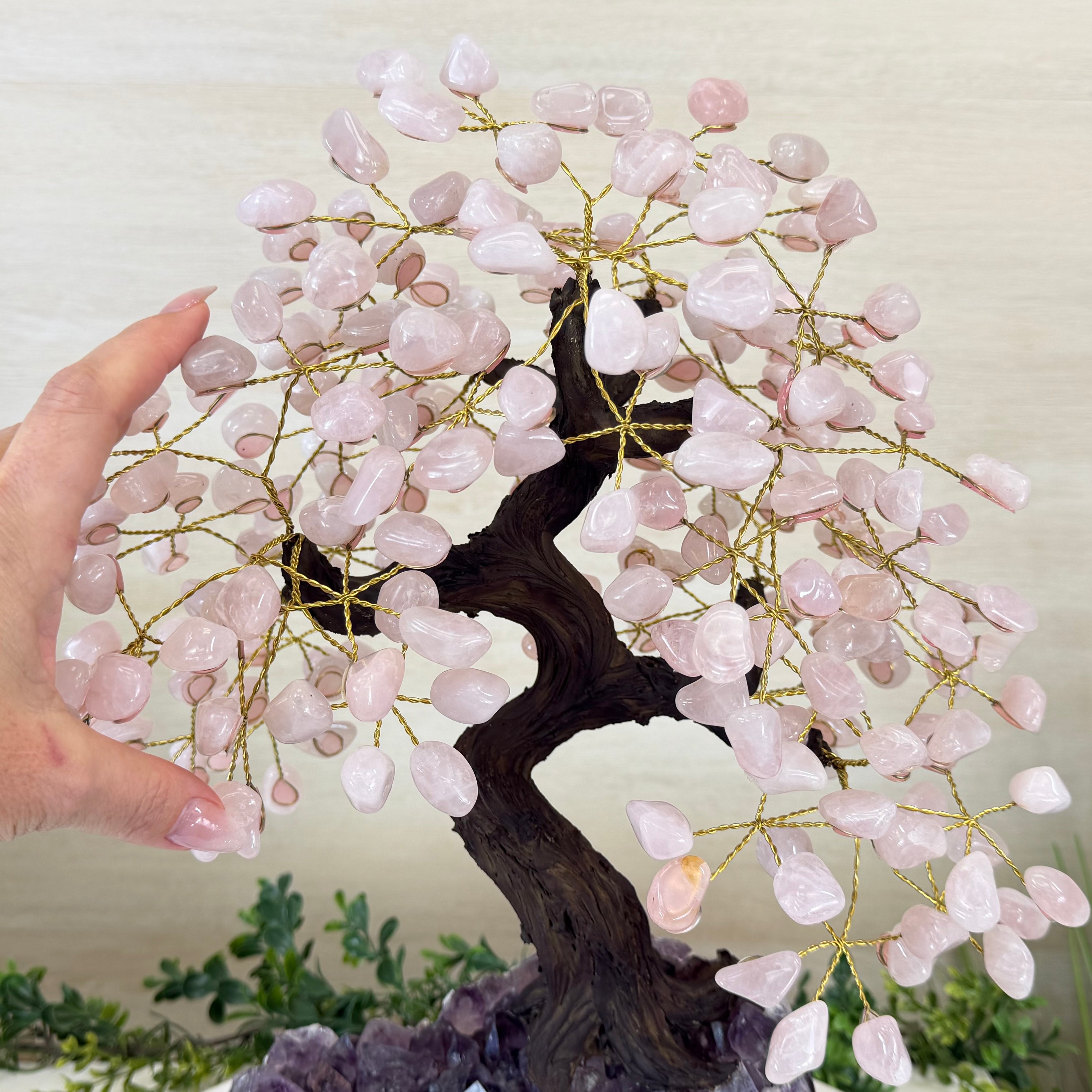 What makes this tree Special? Its polished Amethyst cluster base has smoothly polished edges and features crystals with a deeper purple color and clarity. Also, its Rose Quartz gemstone leaves have a richer pink color making it even more beautiful.