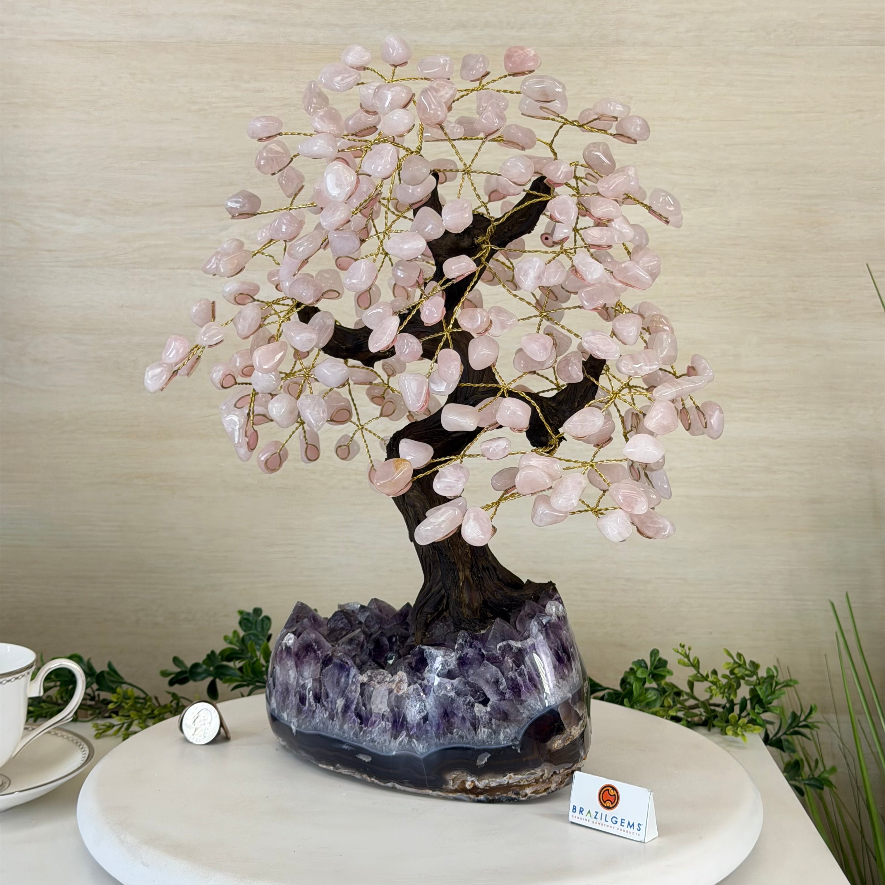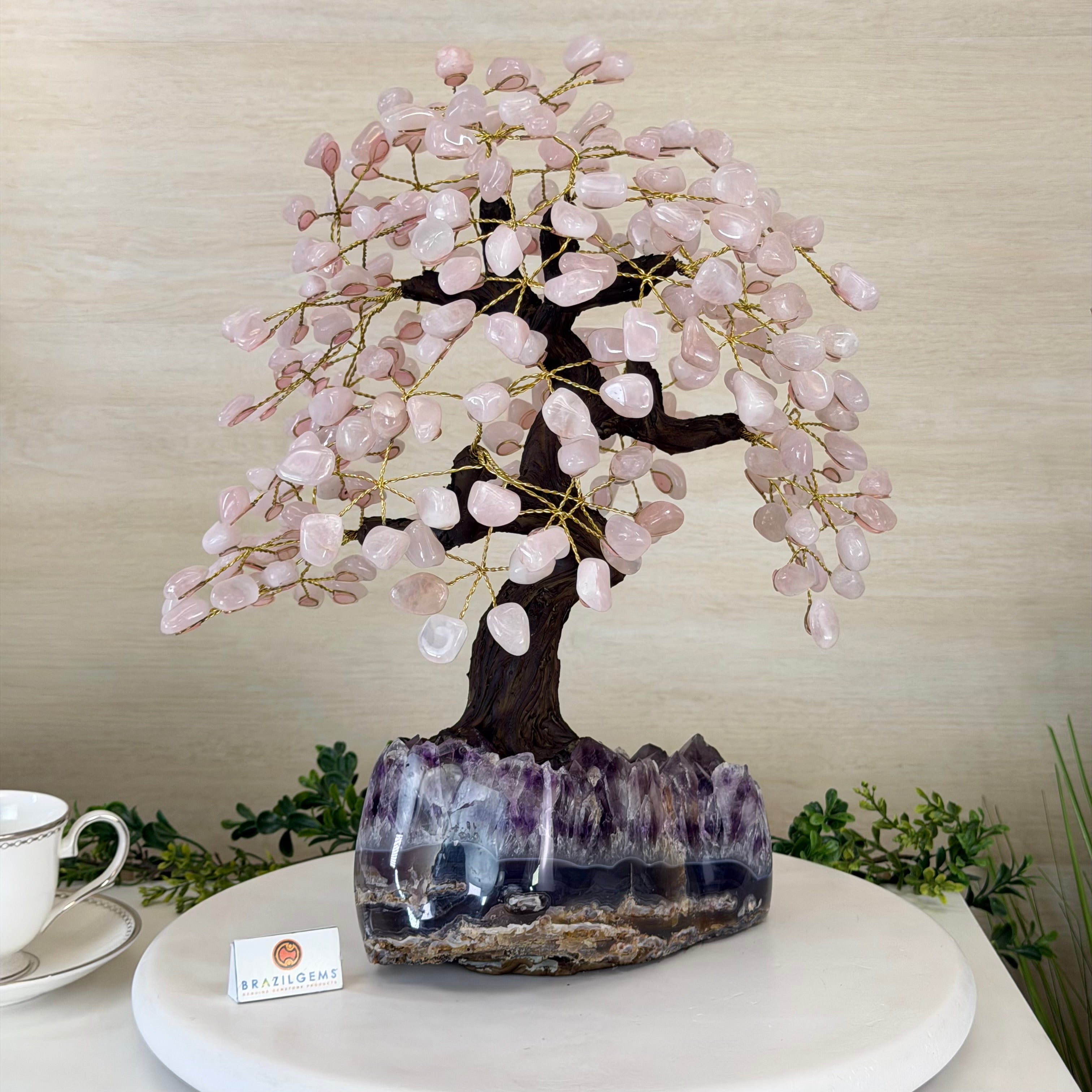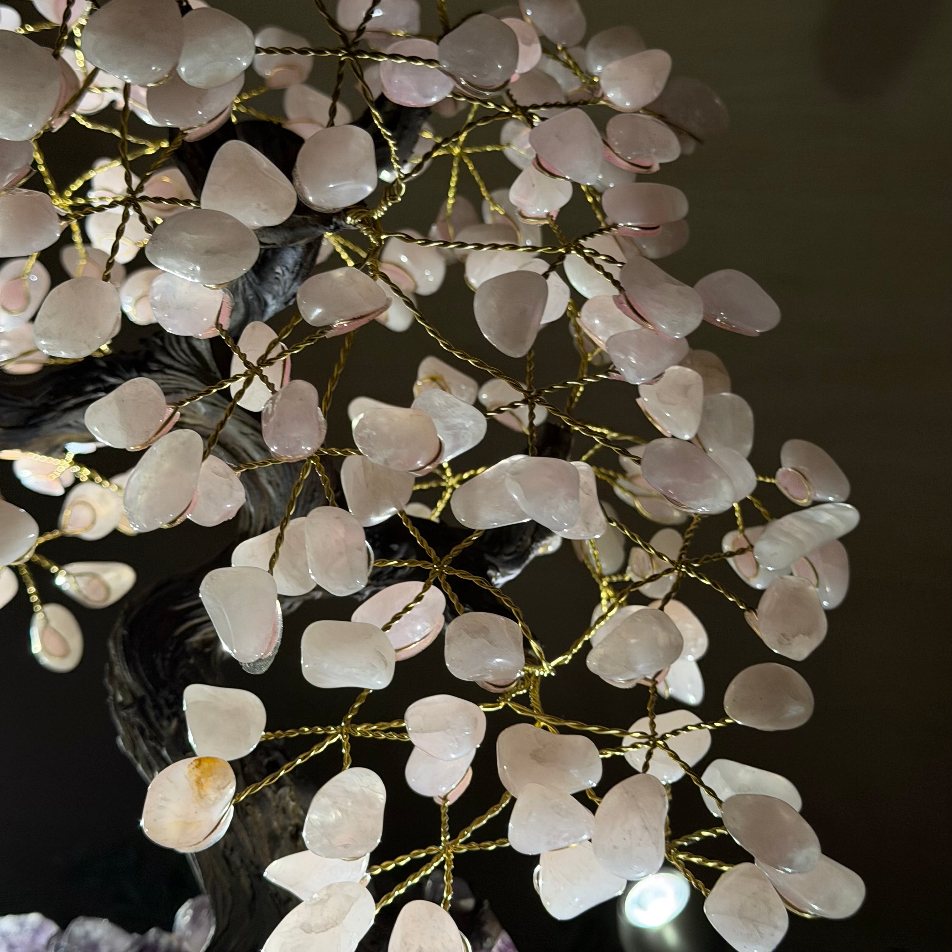 What makes this tree Special? Its polished Amethyst cluster base has smoothly polished edges and features crystals with a deeper purple color and clarity. Also, its Rose Quartz gemstone leaves have a richer pink color making it even more beautiful.