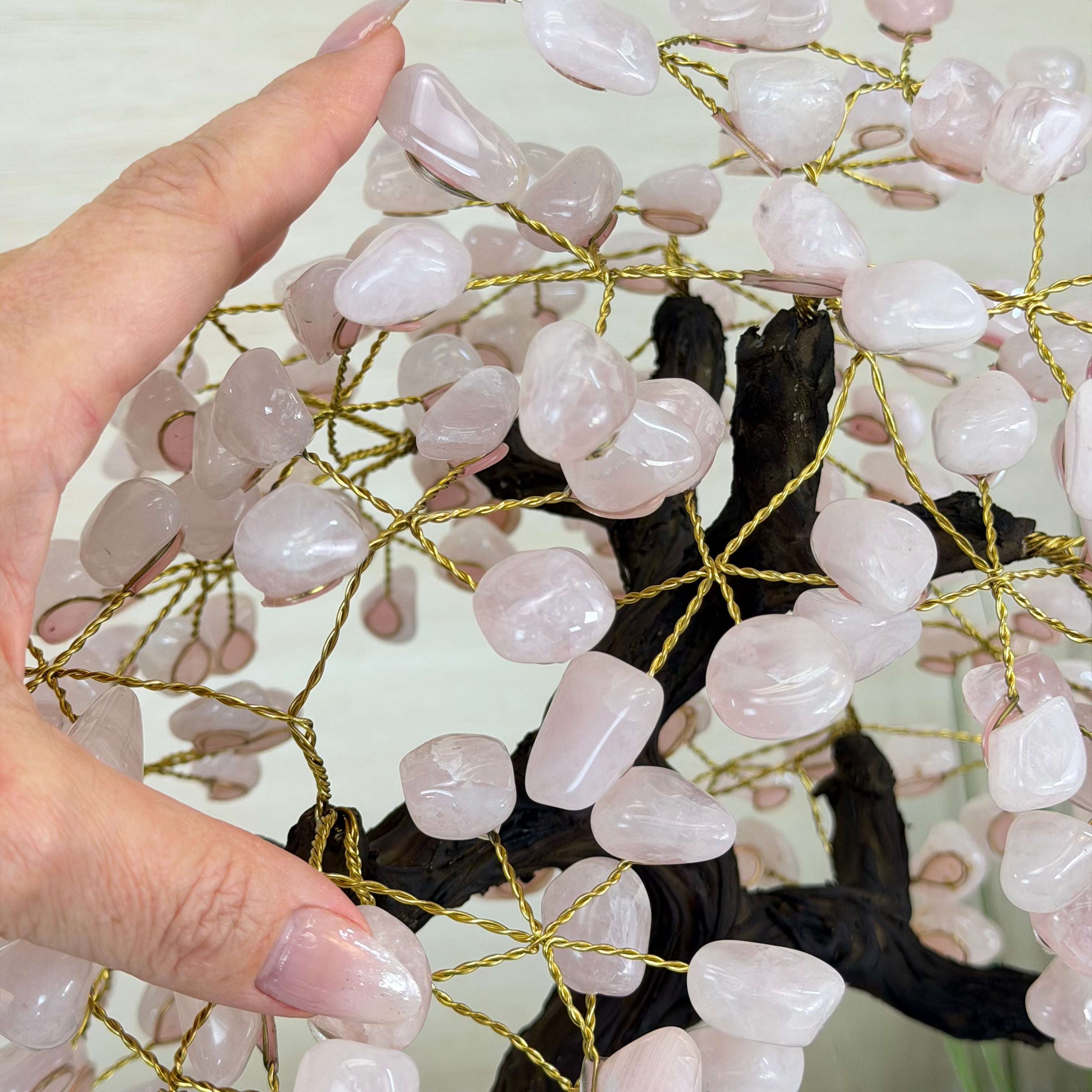 Handcrafted in Brazil, this striking gemstone tree stands approximately 16" tall and features a sturdy resin trunk adorned with 240 tumbled Rose Quartz gemstones as the leaves.