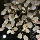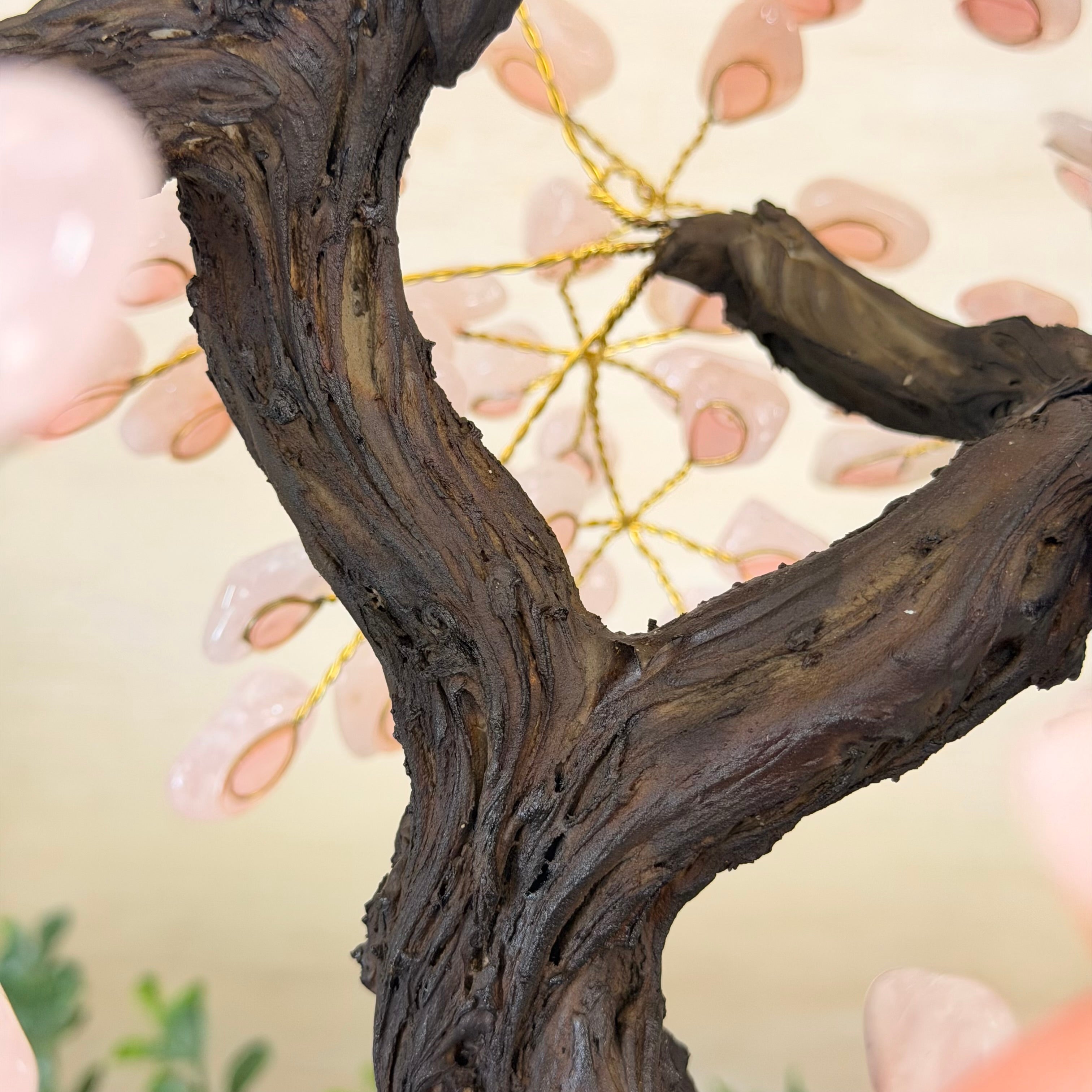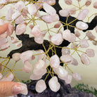 Handcrafted in Brazil, this striking gemstone tree stands approximately 16" tall and features a sturdy resin trunk adorned with 240 tumbled Rose Quartz gemstones as the leaves.