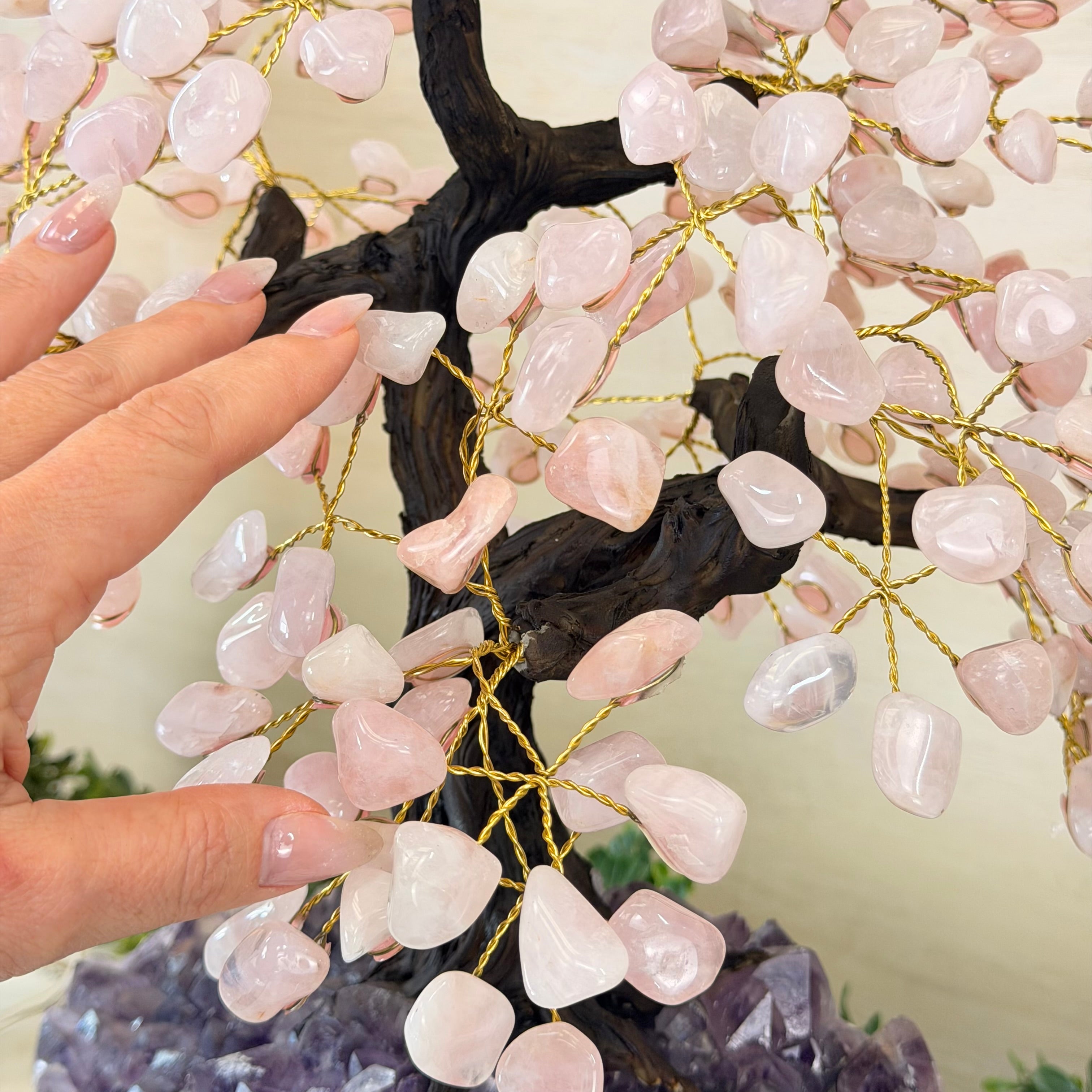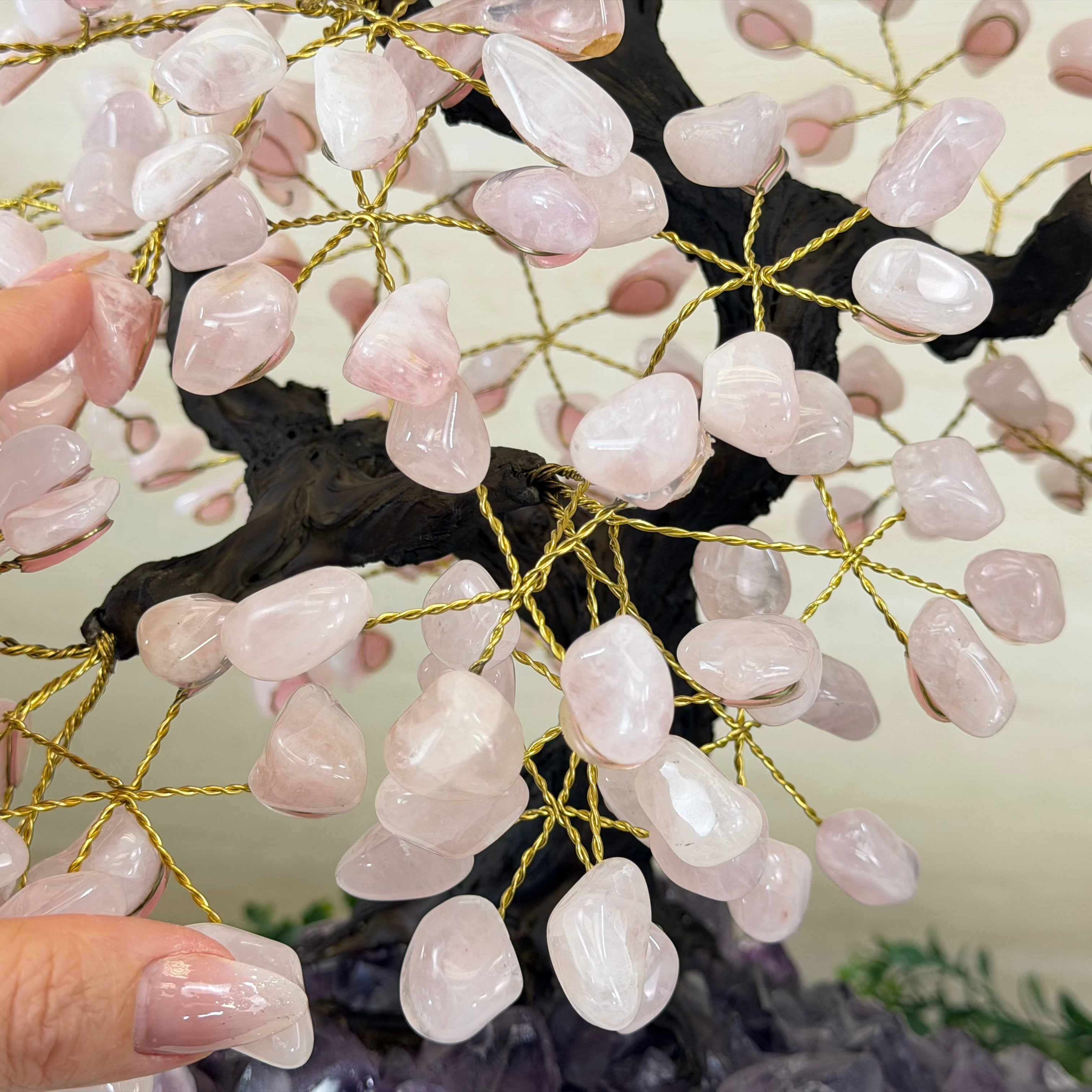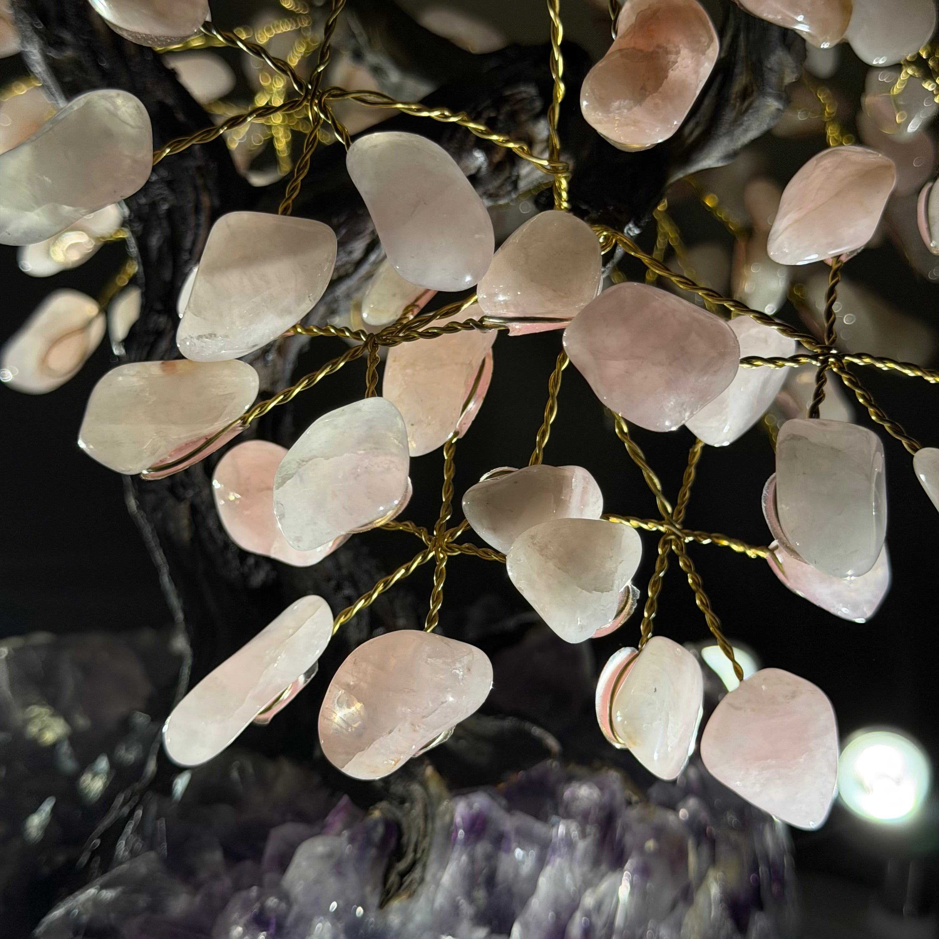 What makes this tree Special? Its polished Amethyst cluster base has smoothly polished edges and features crystals with a deeper purple color and clarity. Also, its Rose Quartz gemstone leaves have a richer pink color making it even more beautiful.