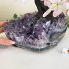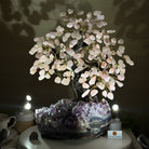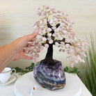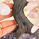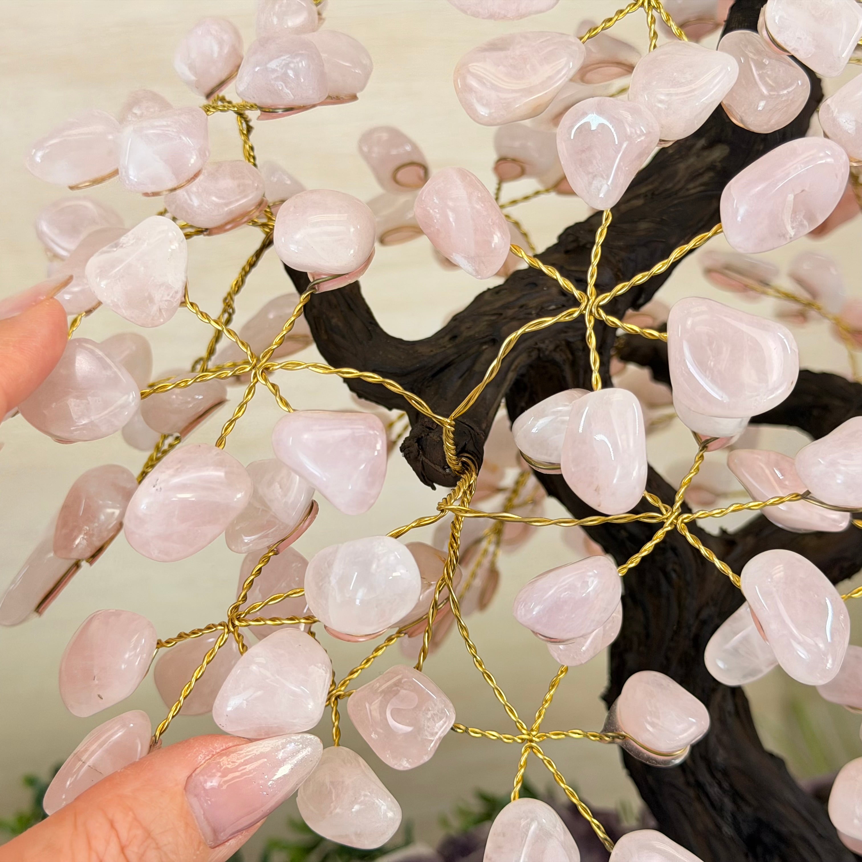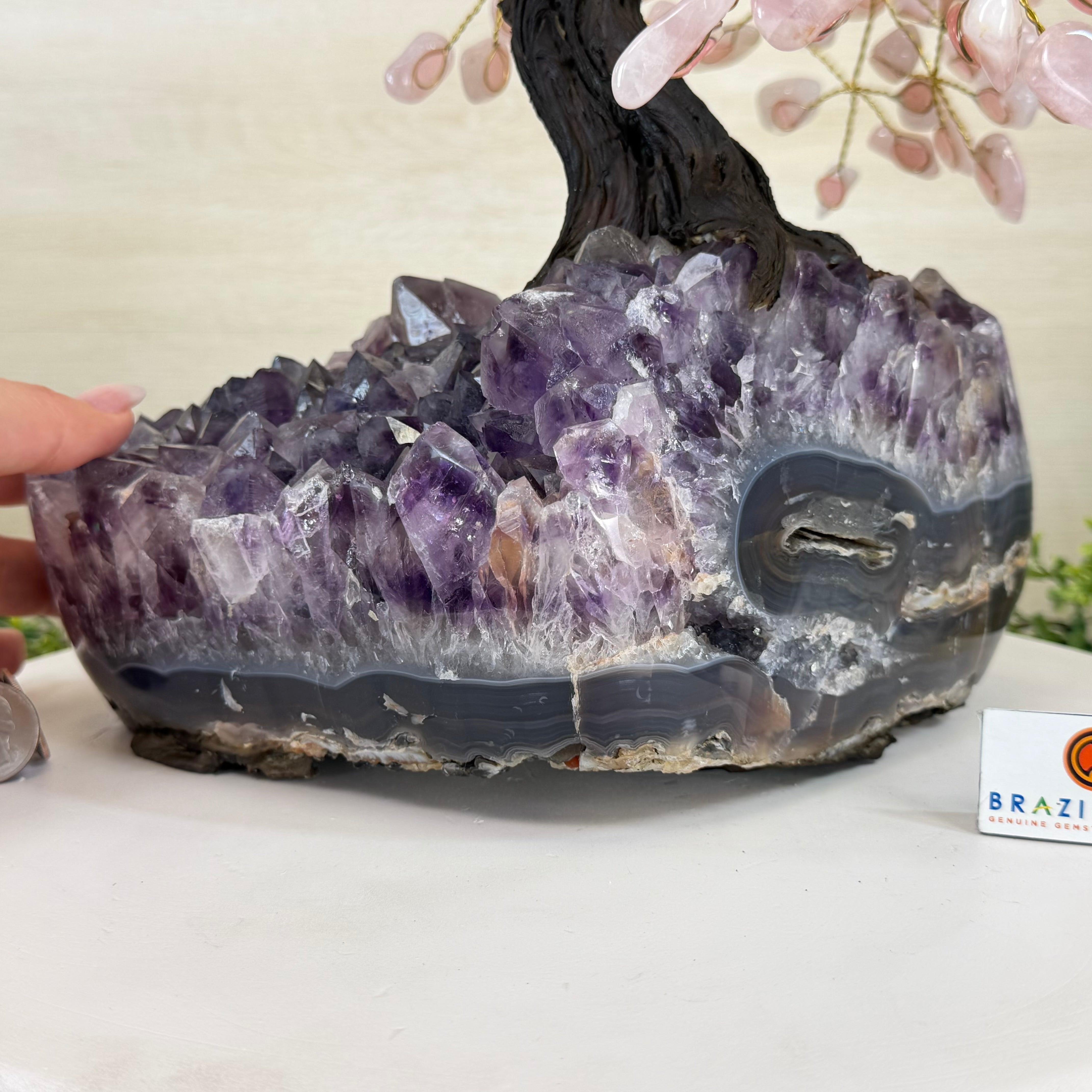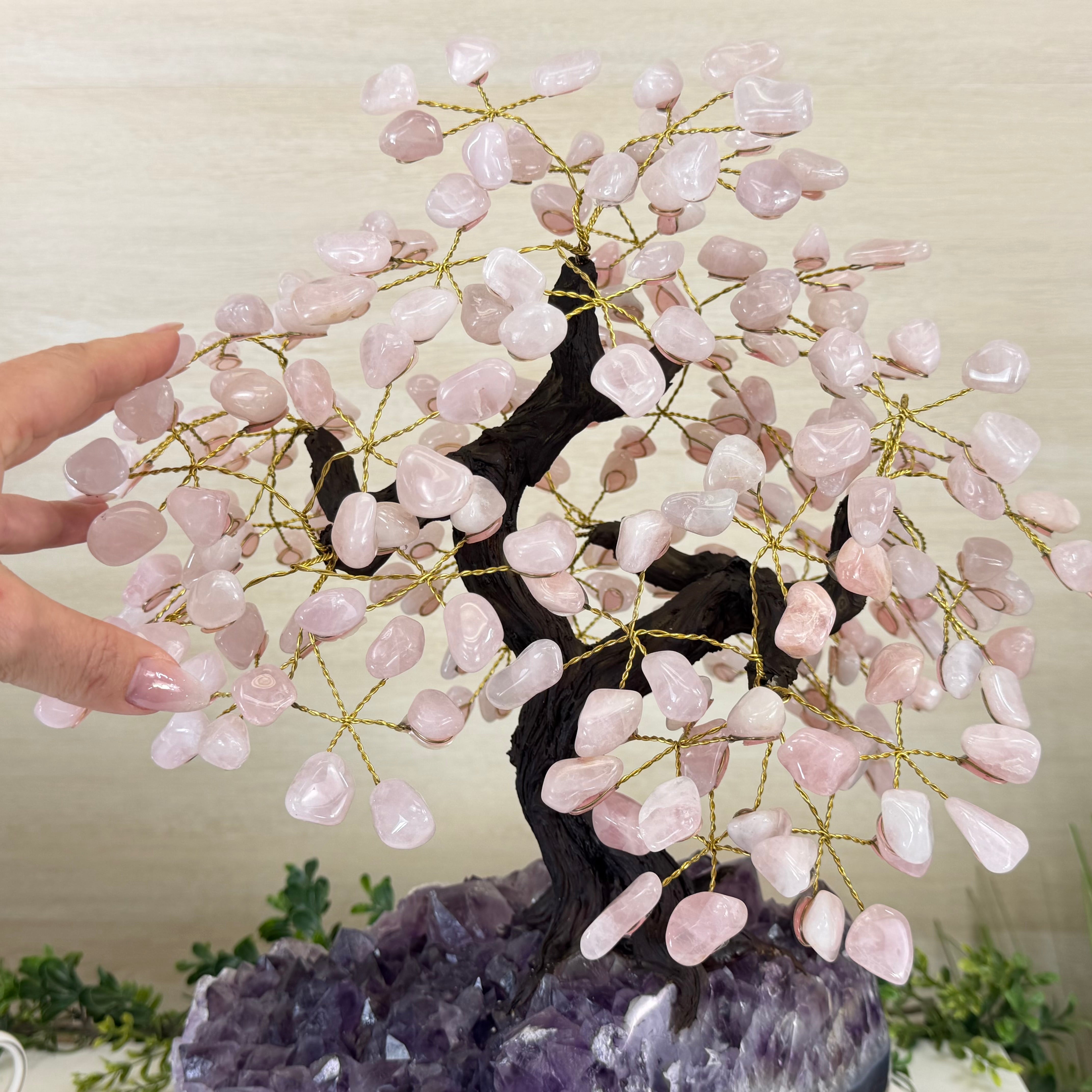 What makes this tree Special? Its polished Amethyst cluster base has smoothly polished edges and features crystals with a deeper purple color and clarity. Also, its Rose Quartz gemstone leaves have a richer pink color making it even more beautiful.