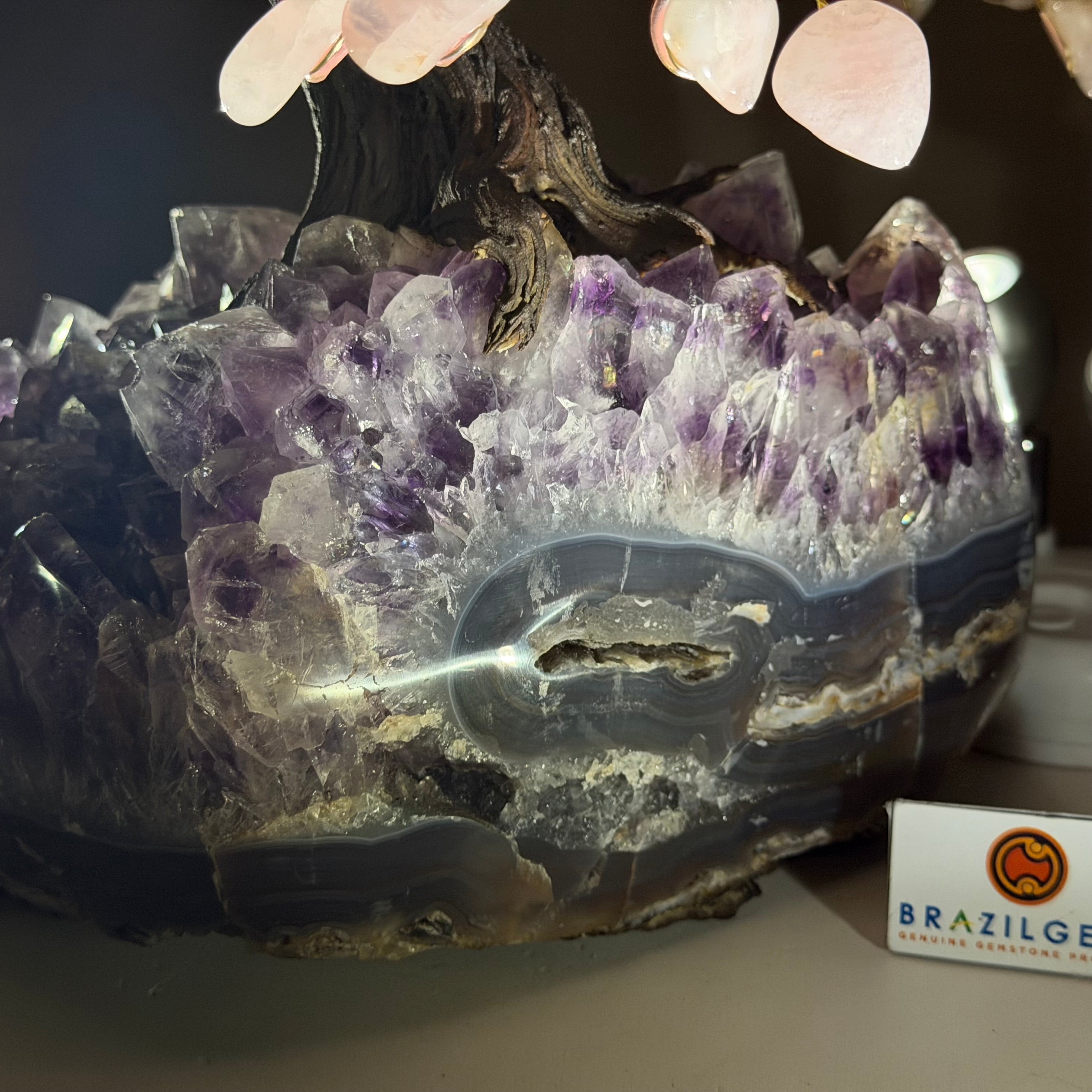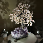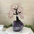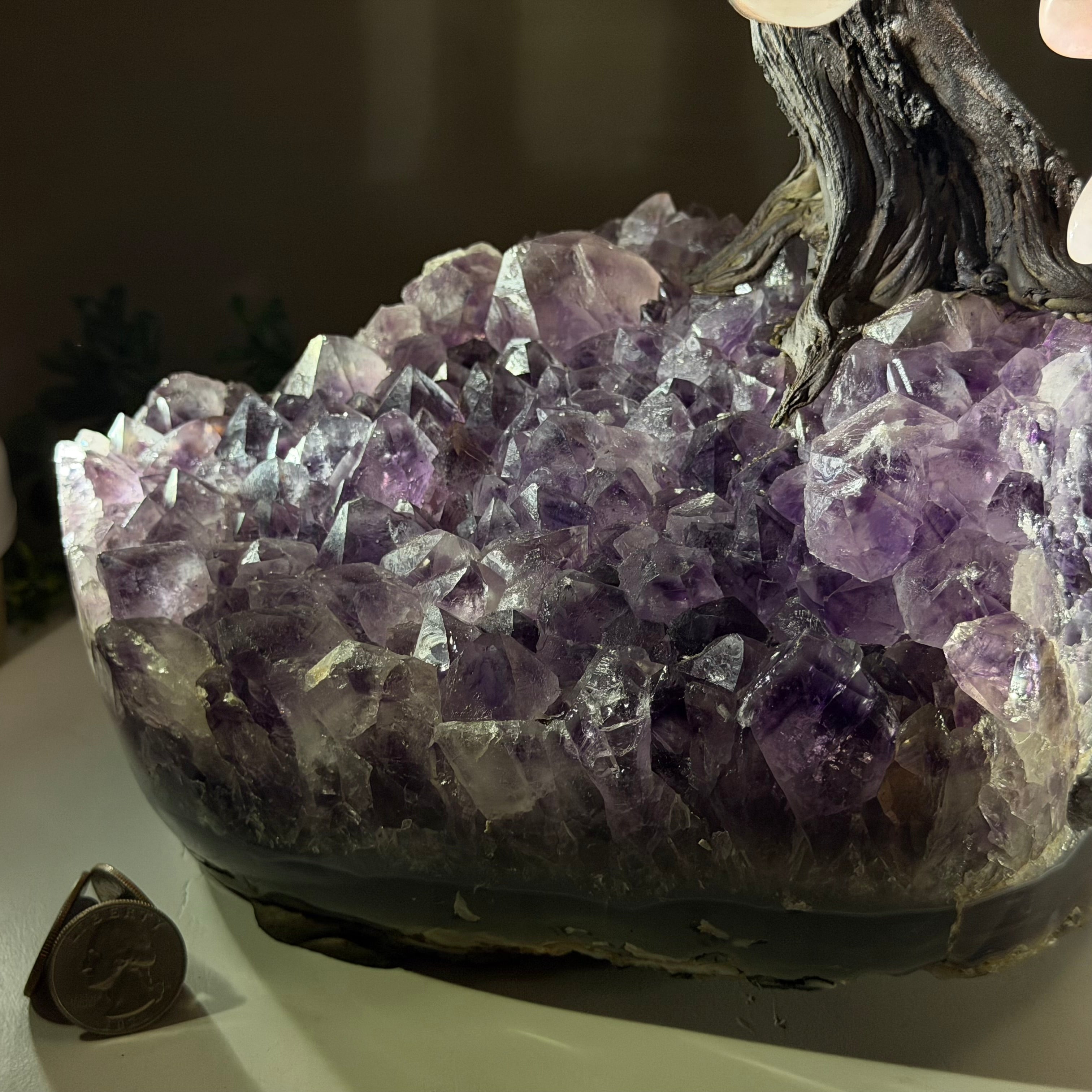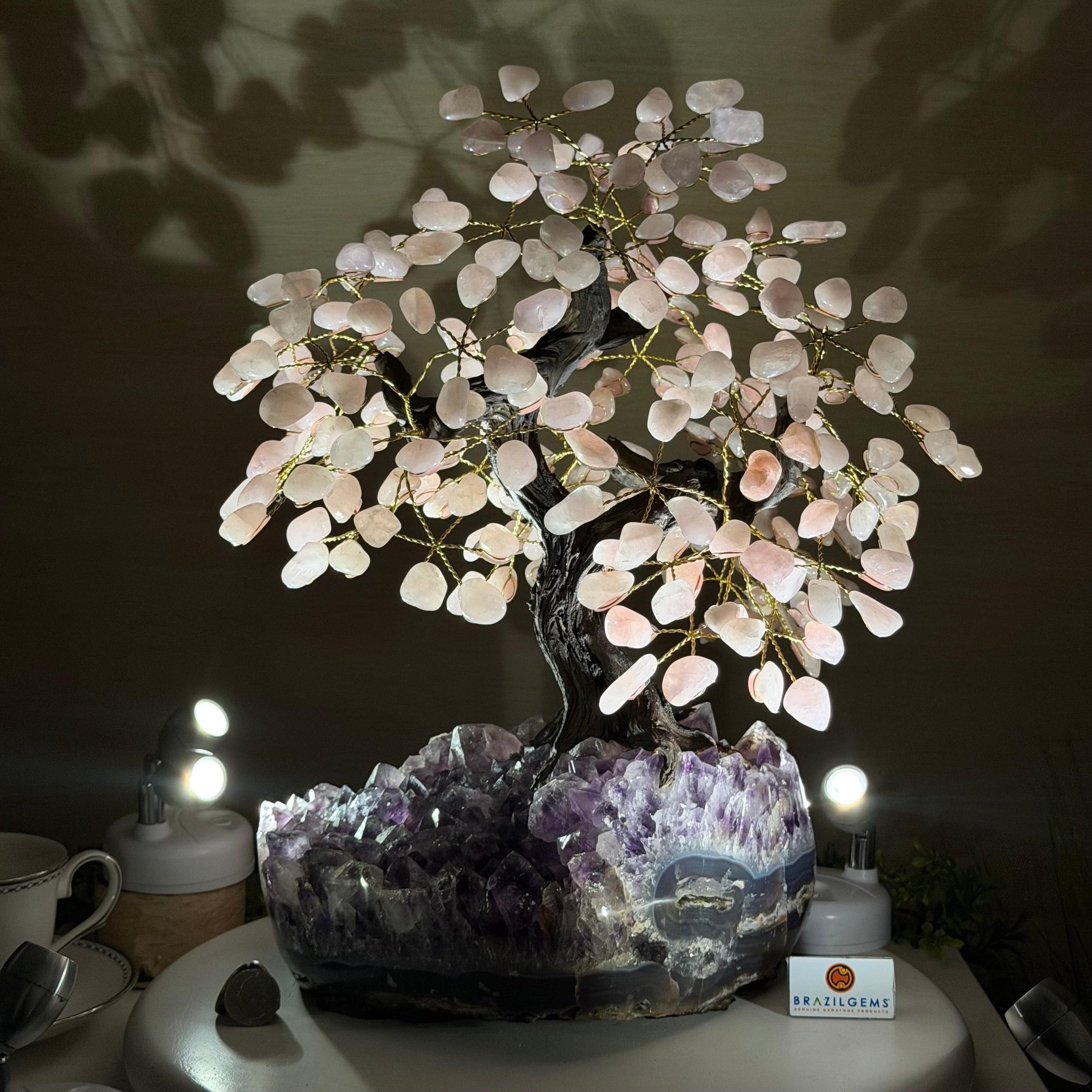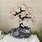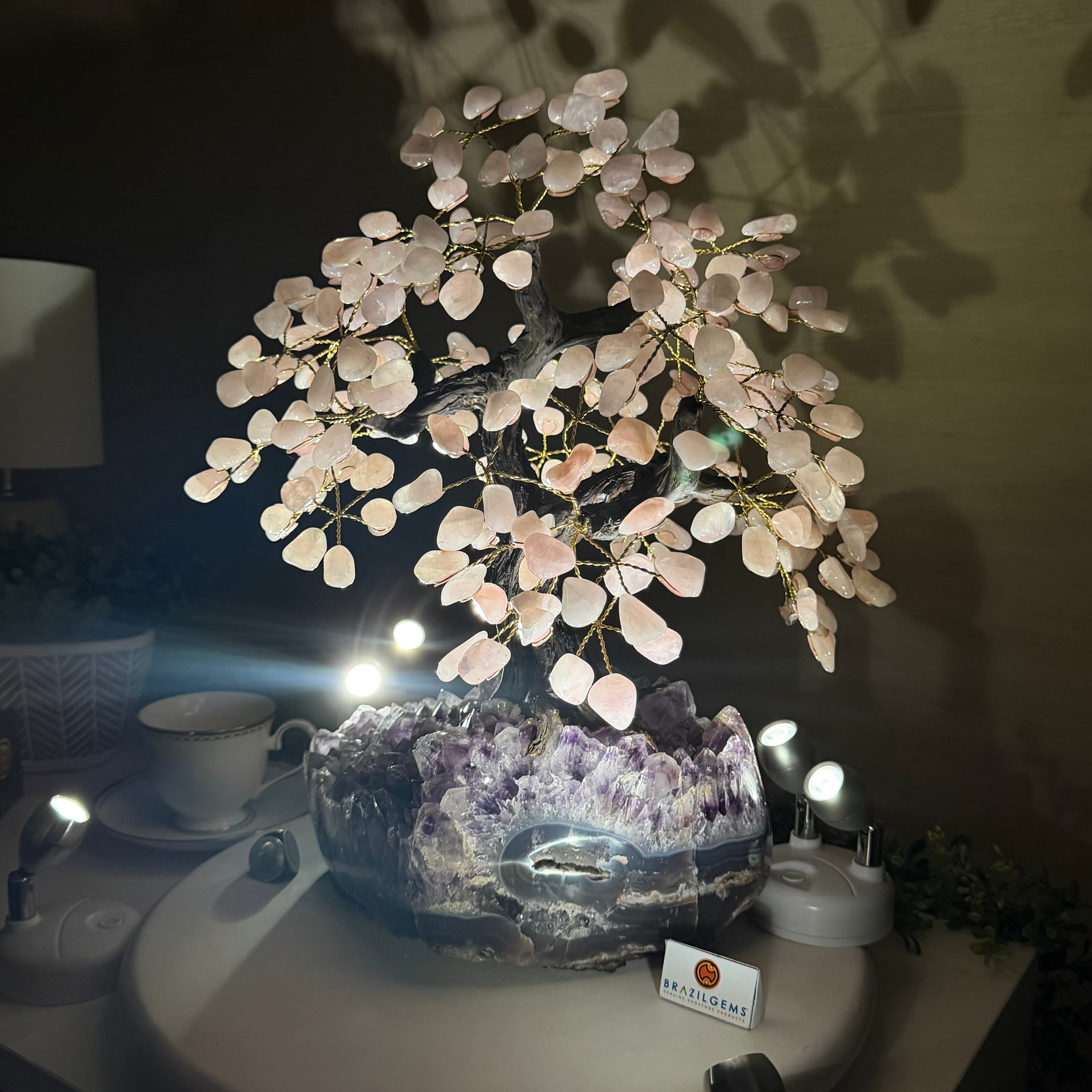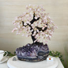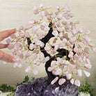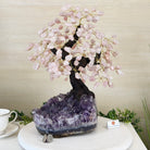 Special Rose Quartz Bonsai Gemstone Tree on a Polished Amethyst Cluster Base