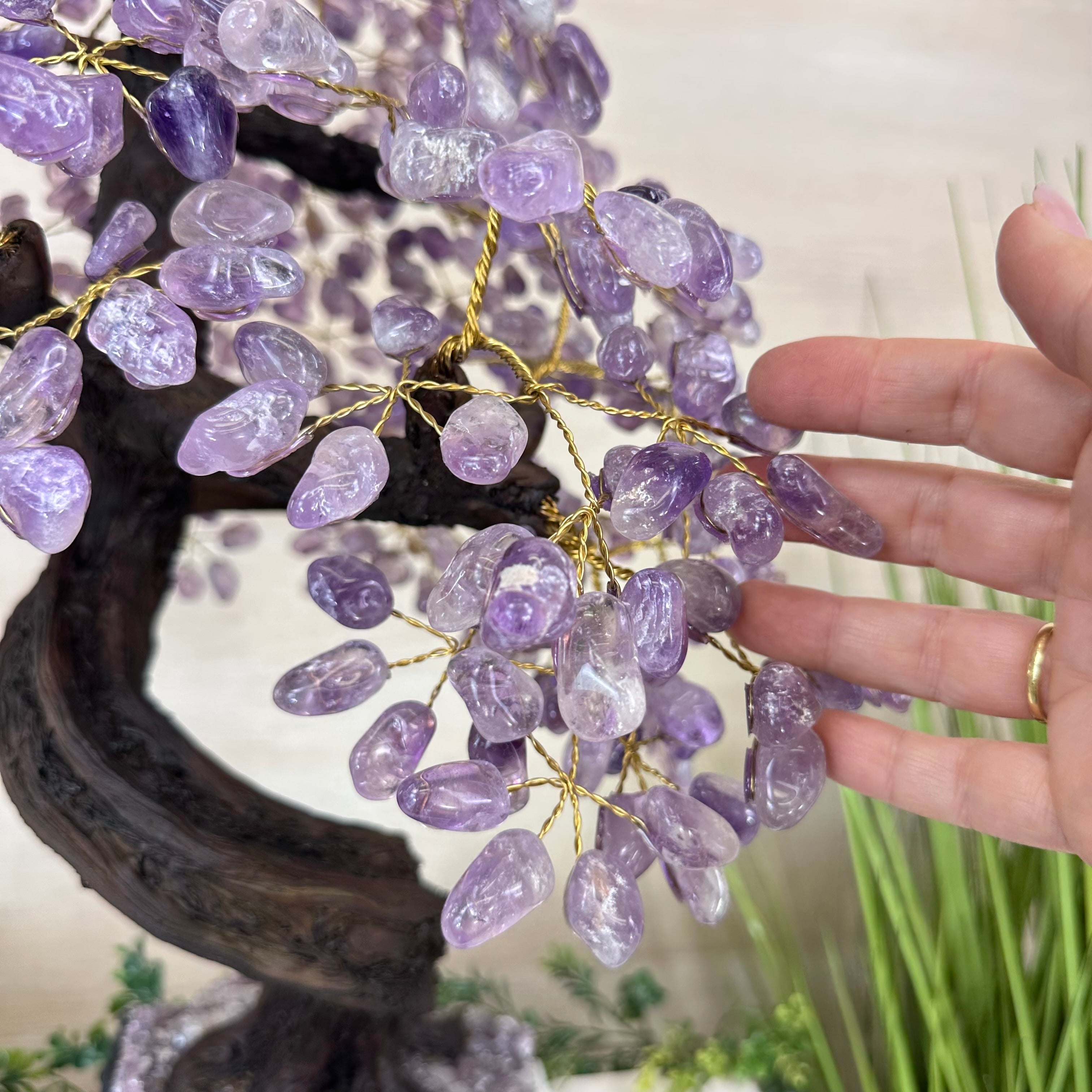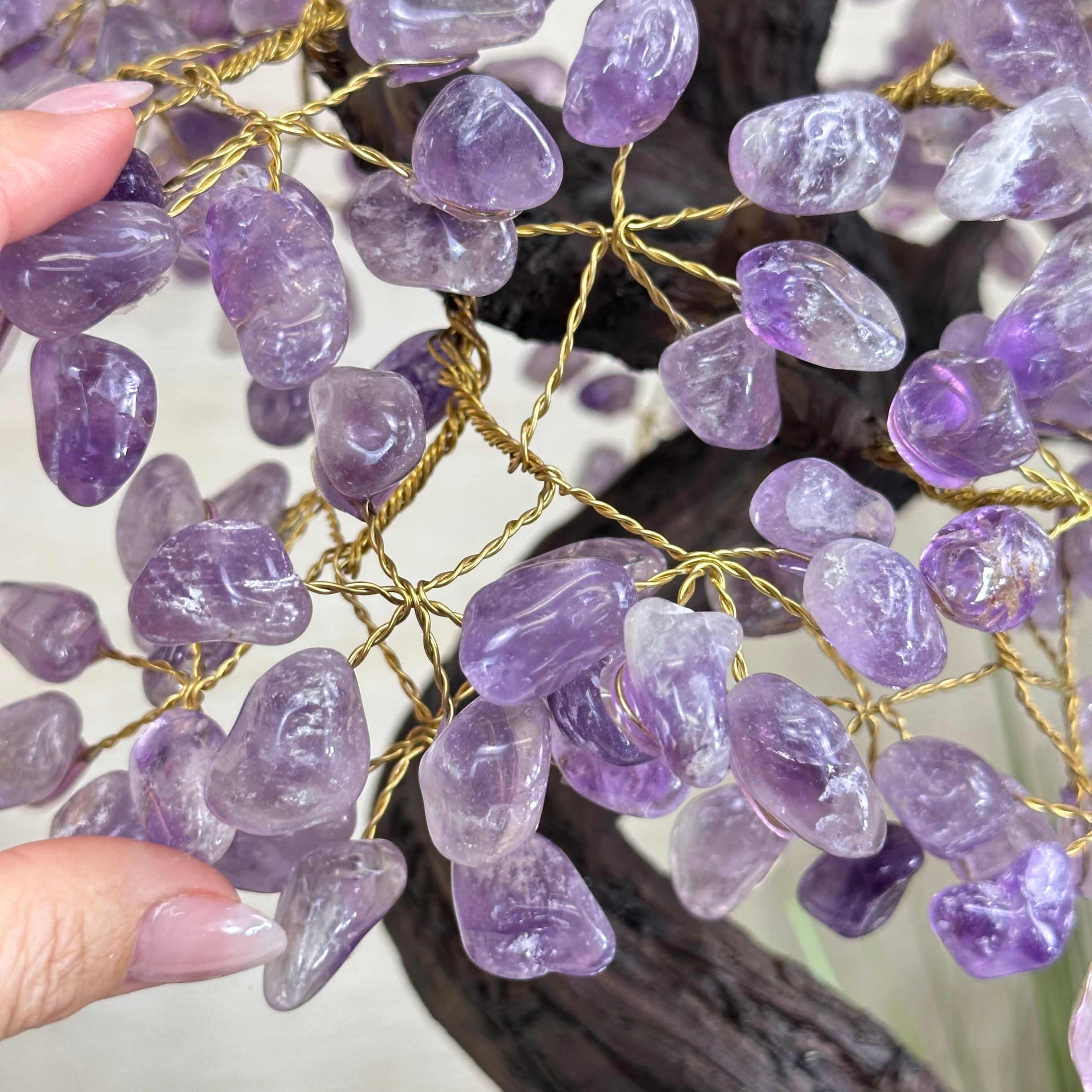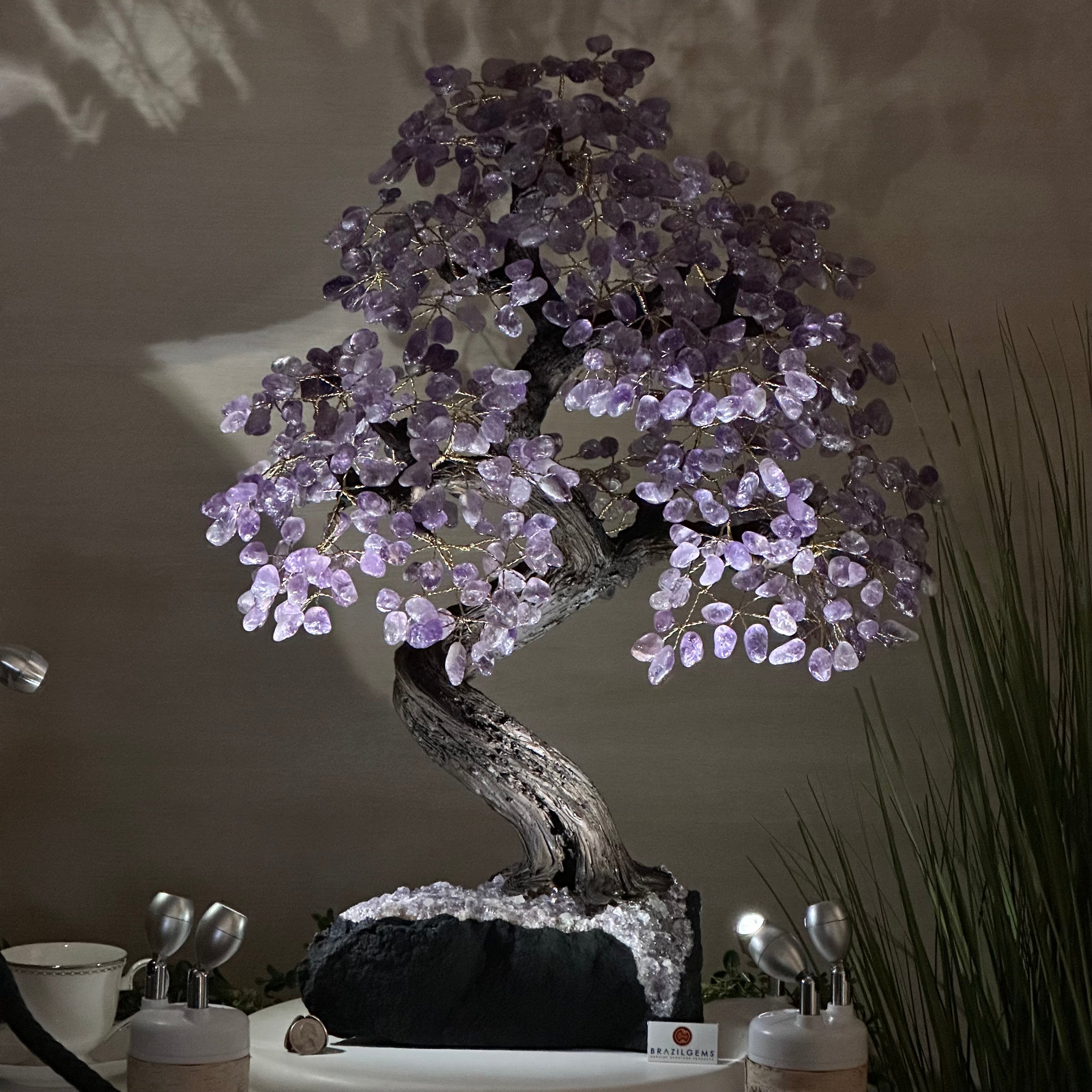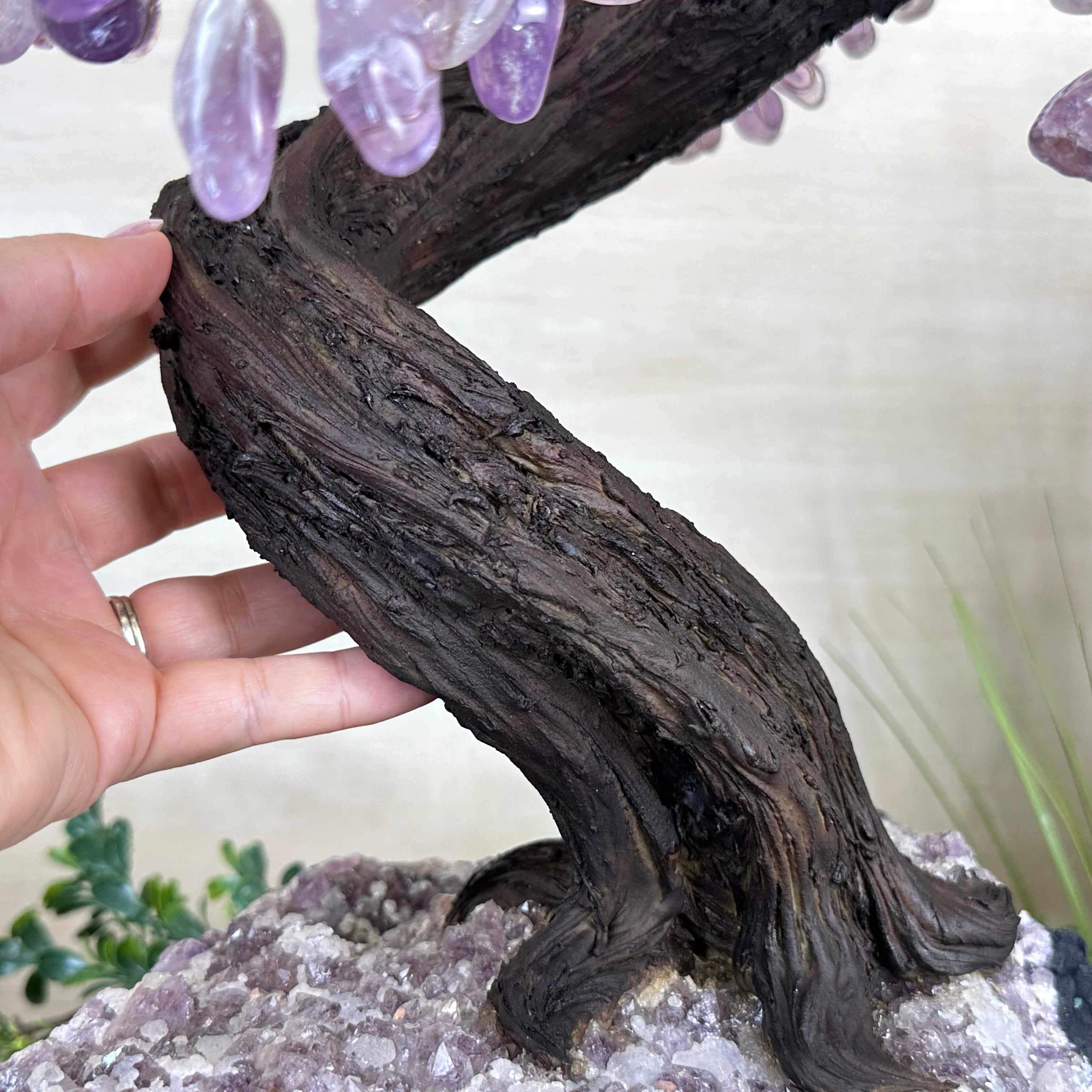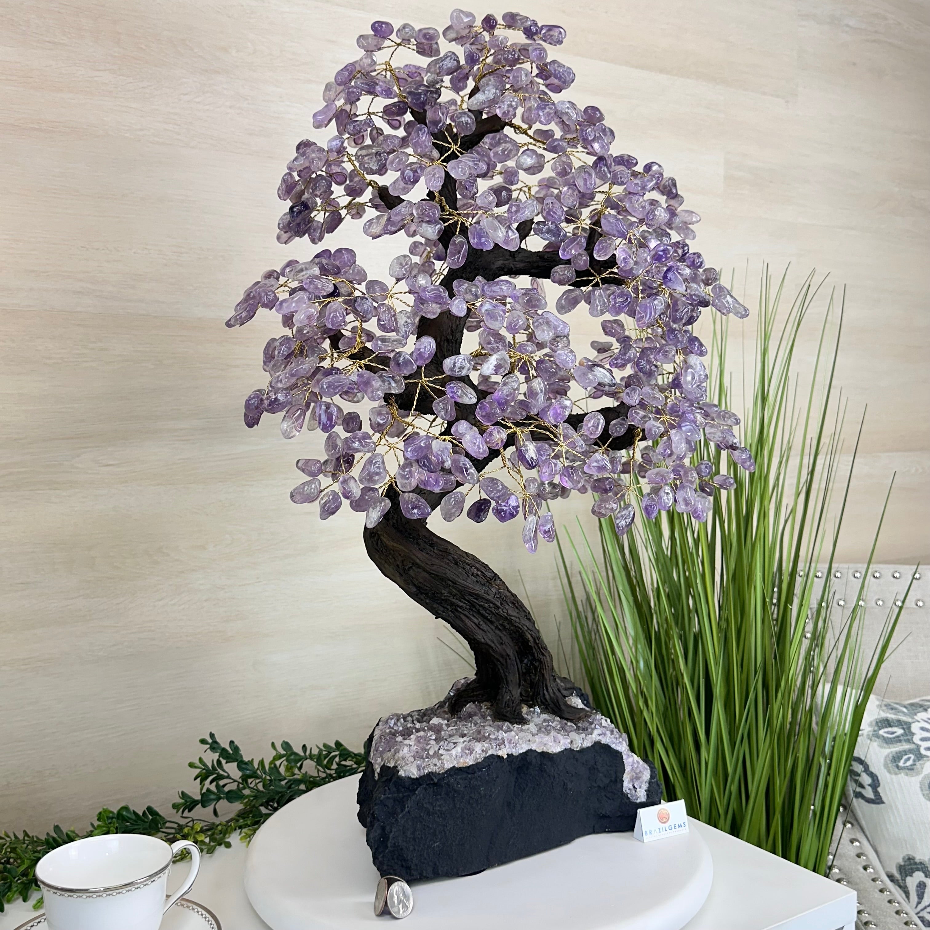 Nature and Artistry combine to create this Large Handmade Gemstone Tree with Amethyst Gemstones as leaves. Set atop a large Amethyst cluster base, it has a masterfully detailed trunk and branches crafted from resin in a bonsai tree style and 144 wired branches supporting 720 tumbled gemstones.