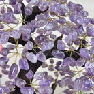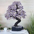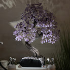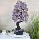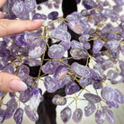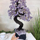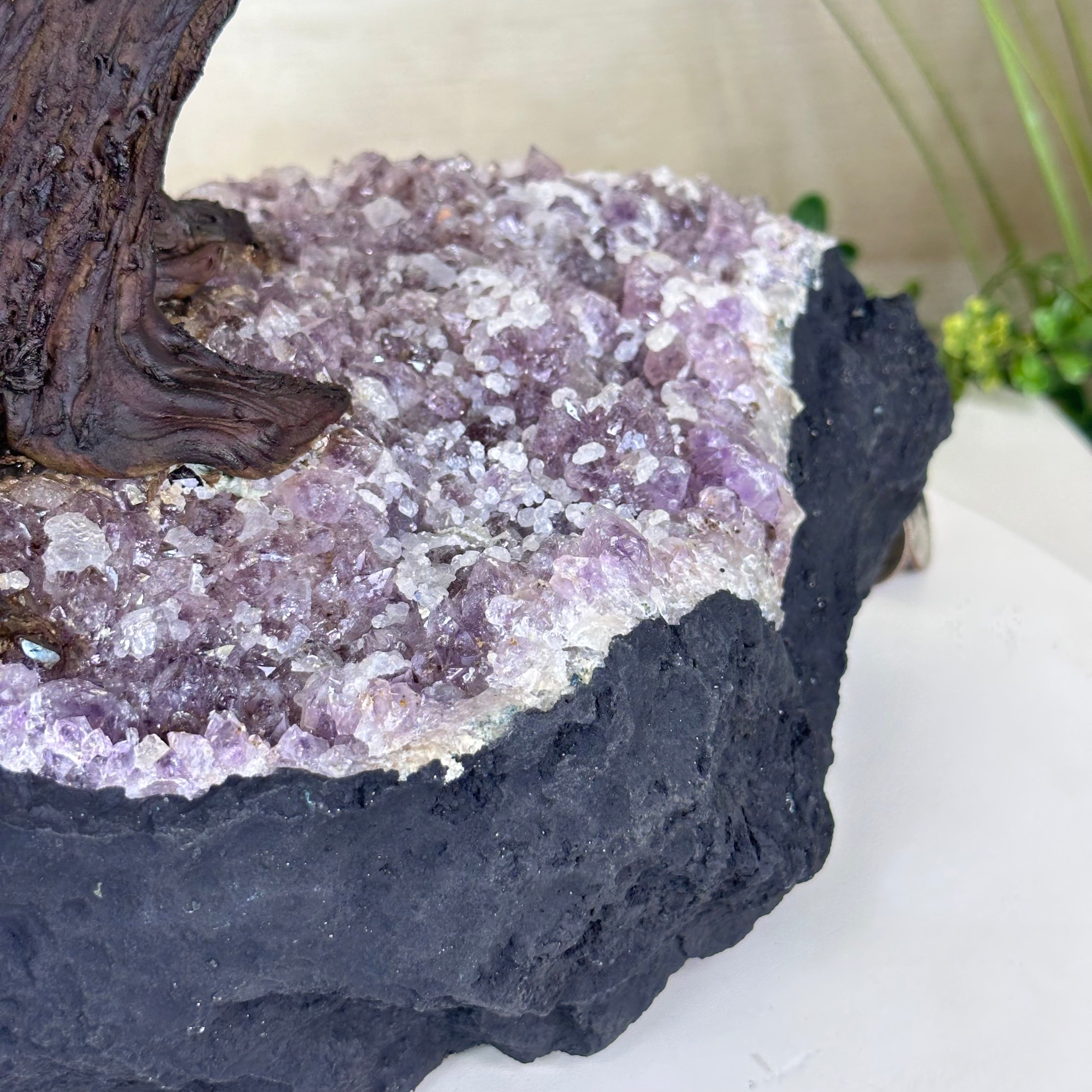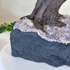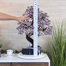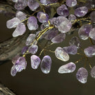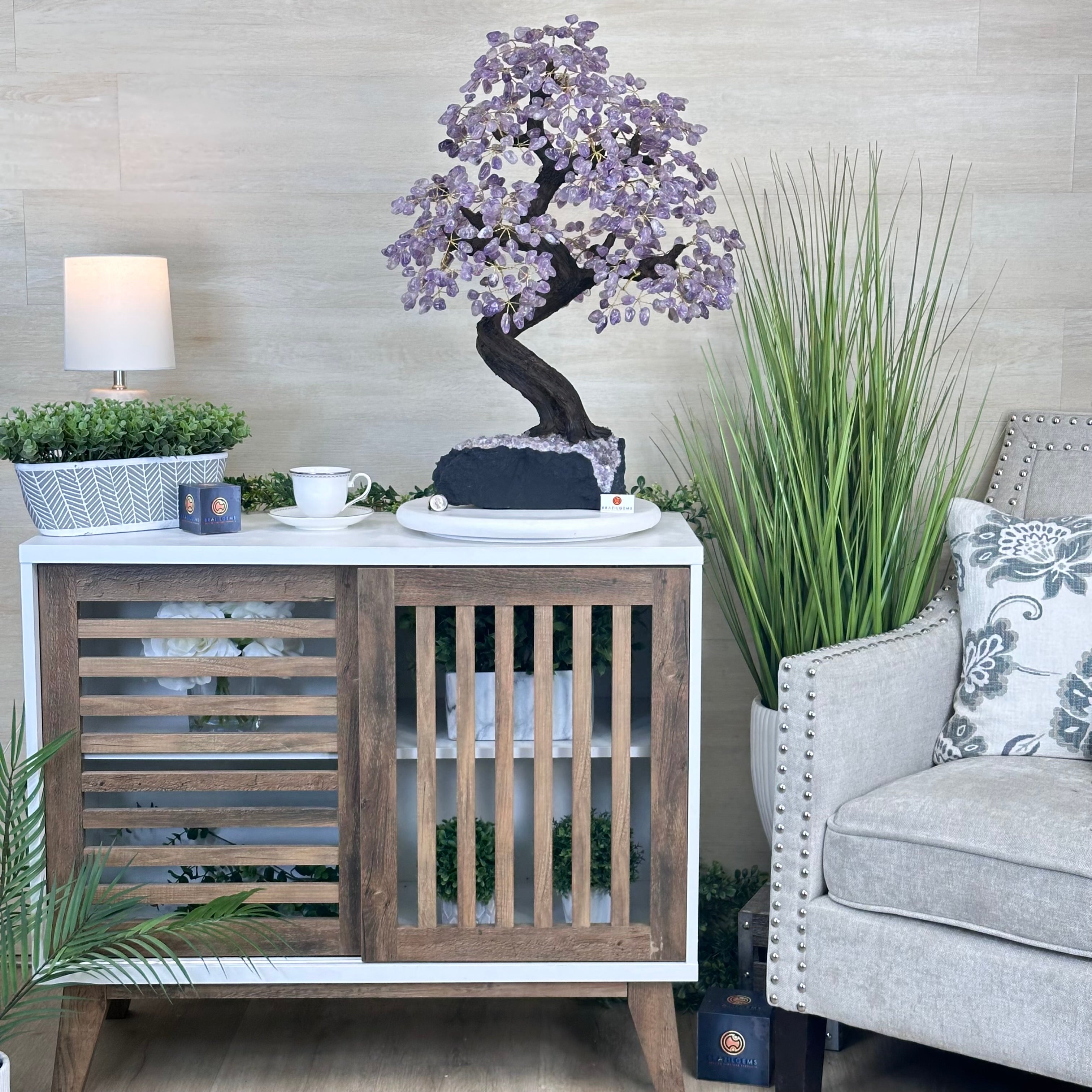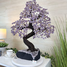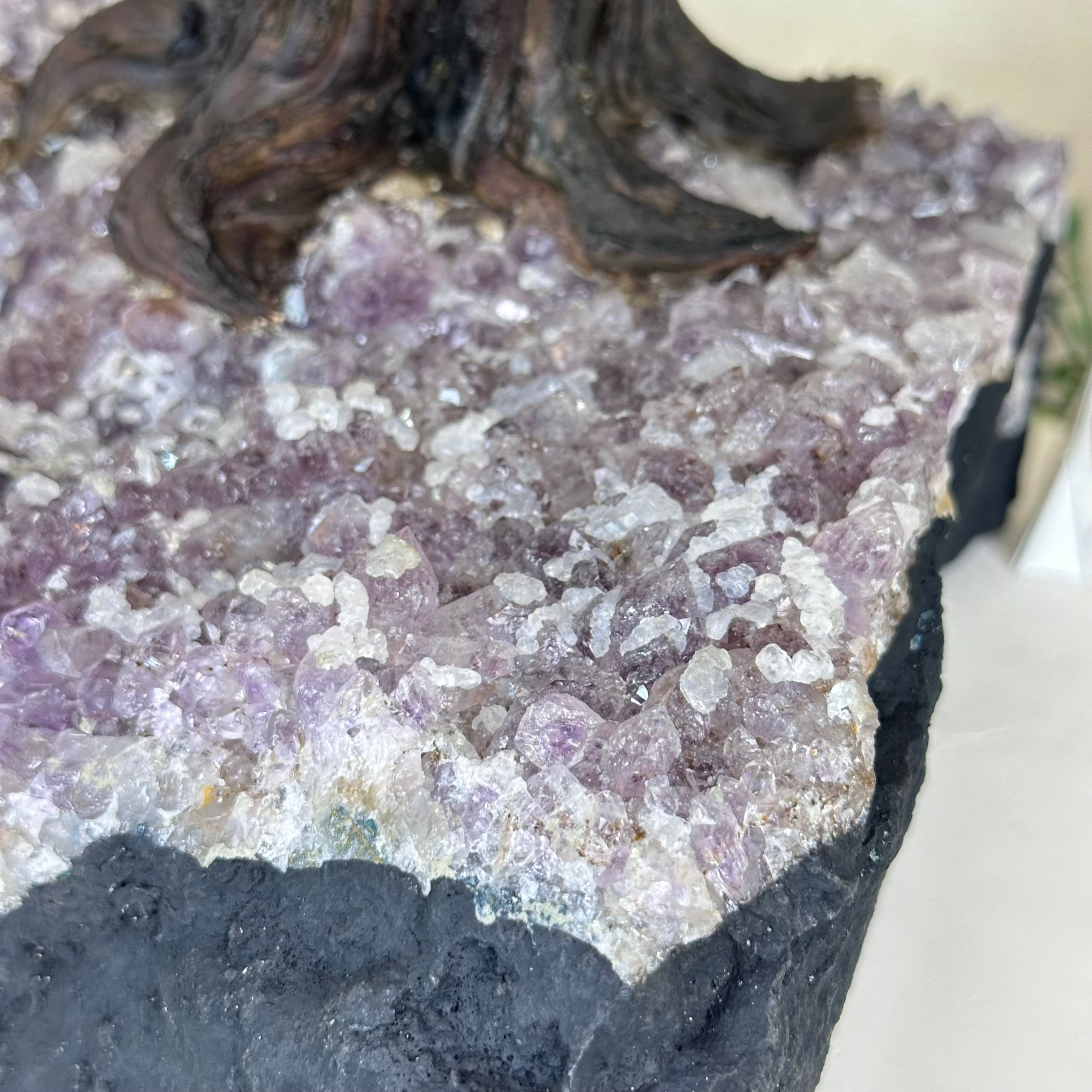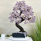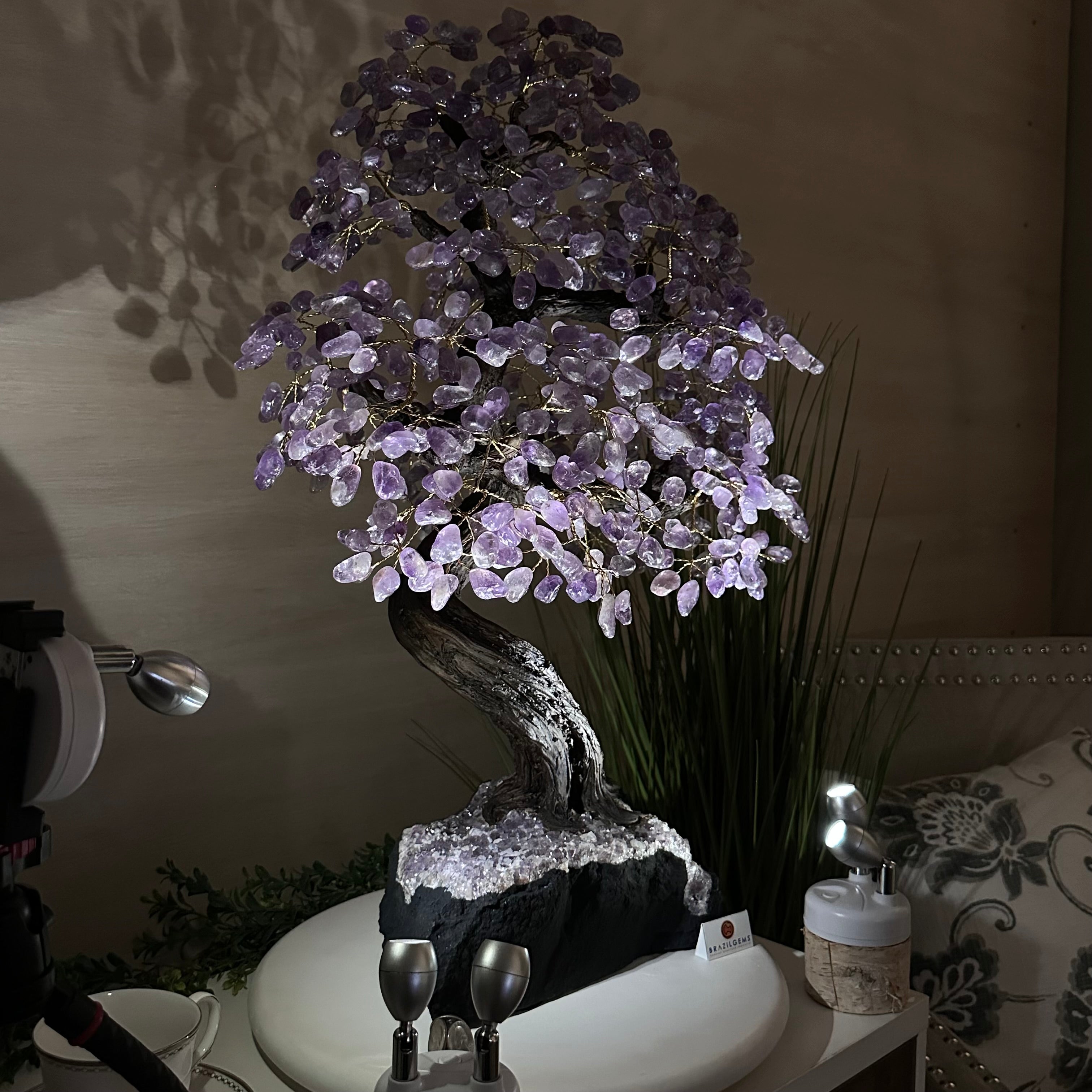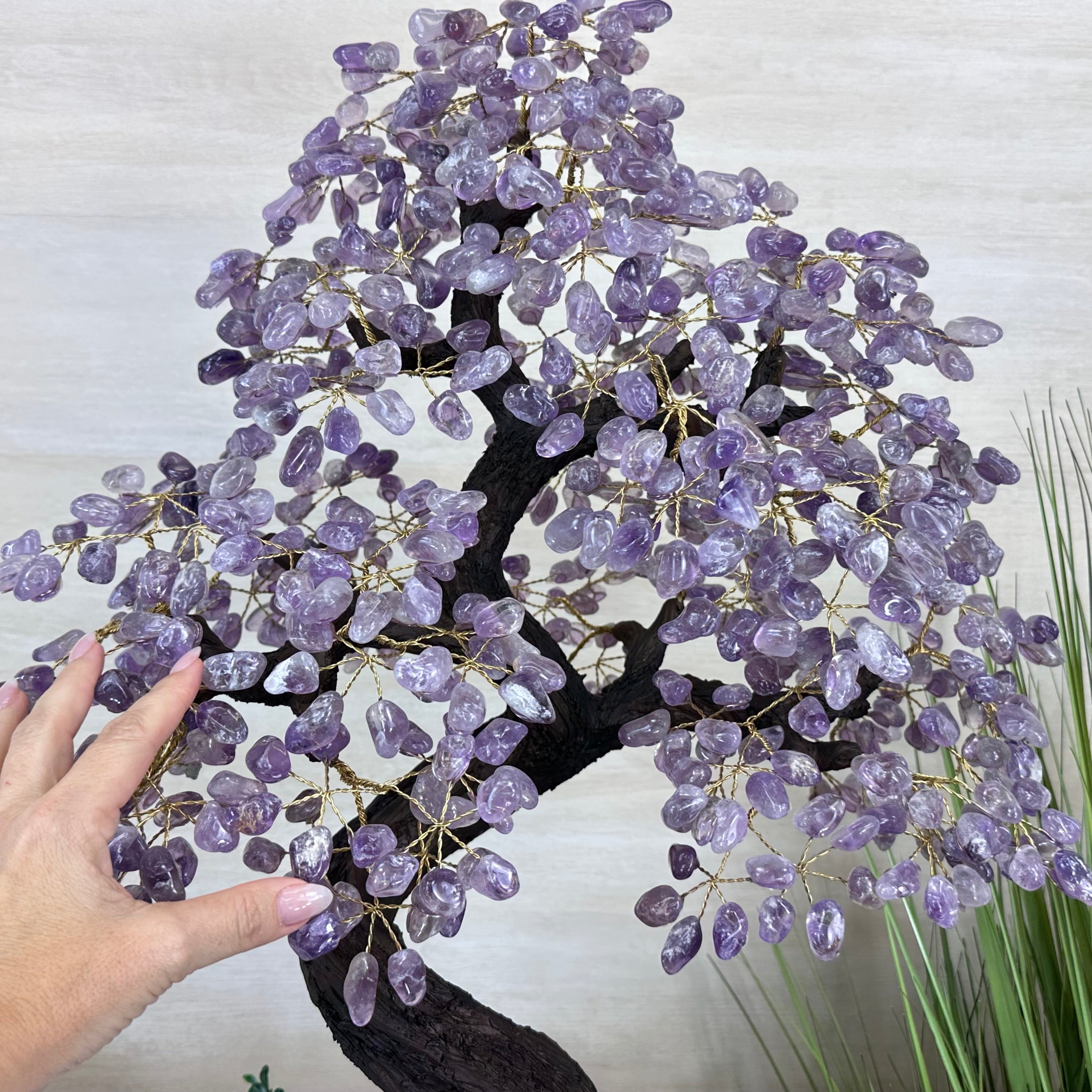 Nature and Artistry combine to create this Large Handmade Gemstone Tree with Amethyst Gemstones as leaves. Set atop a large Amethyst cluster base, it has a masterfully detailed trunk and branches crafted from resin in a bonsai tree style and 144 wired branches supporting 720 tumbled gemstones.