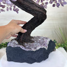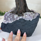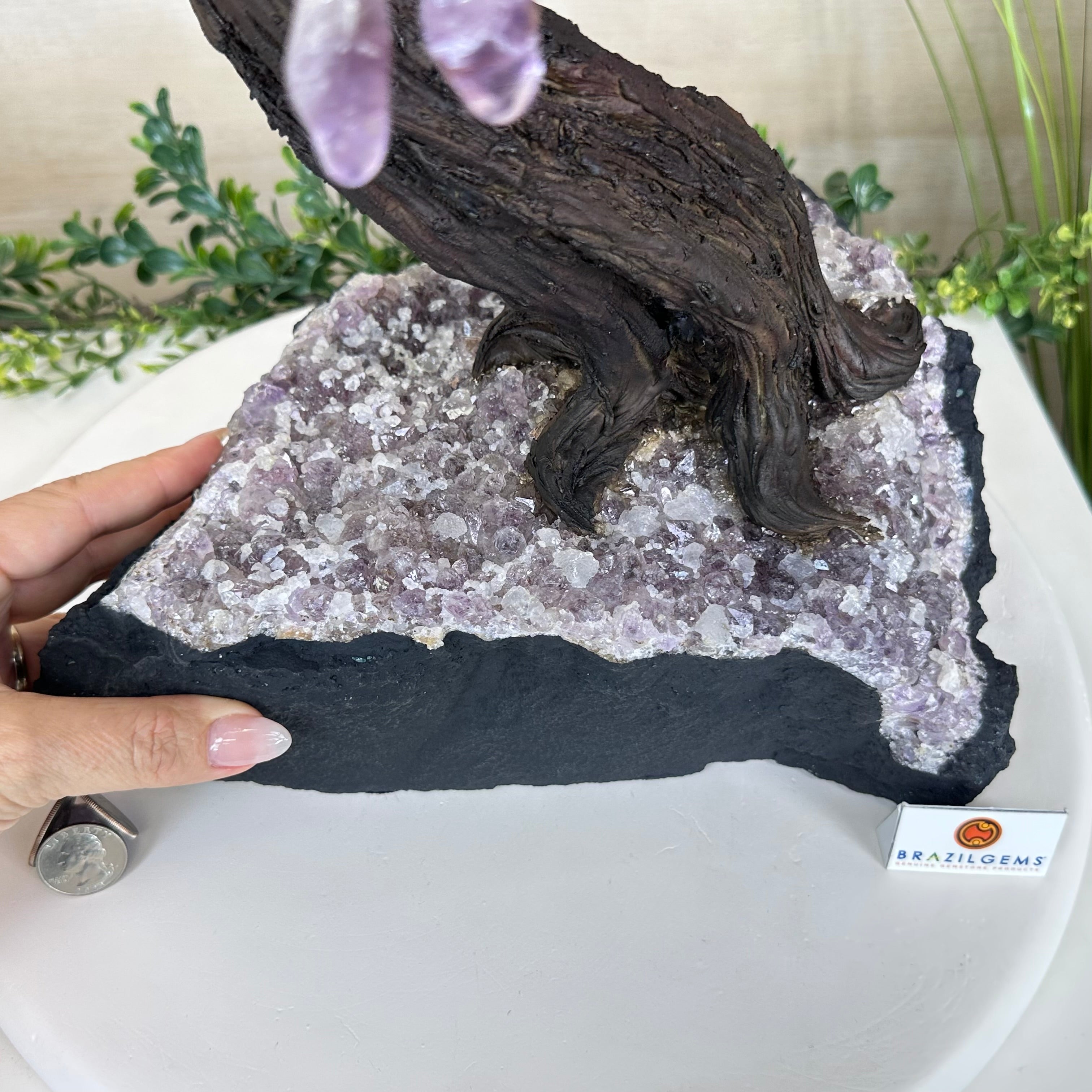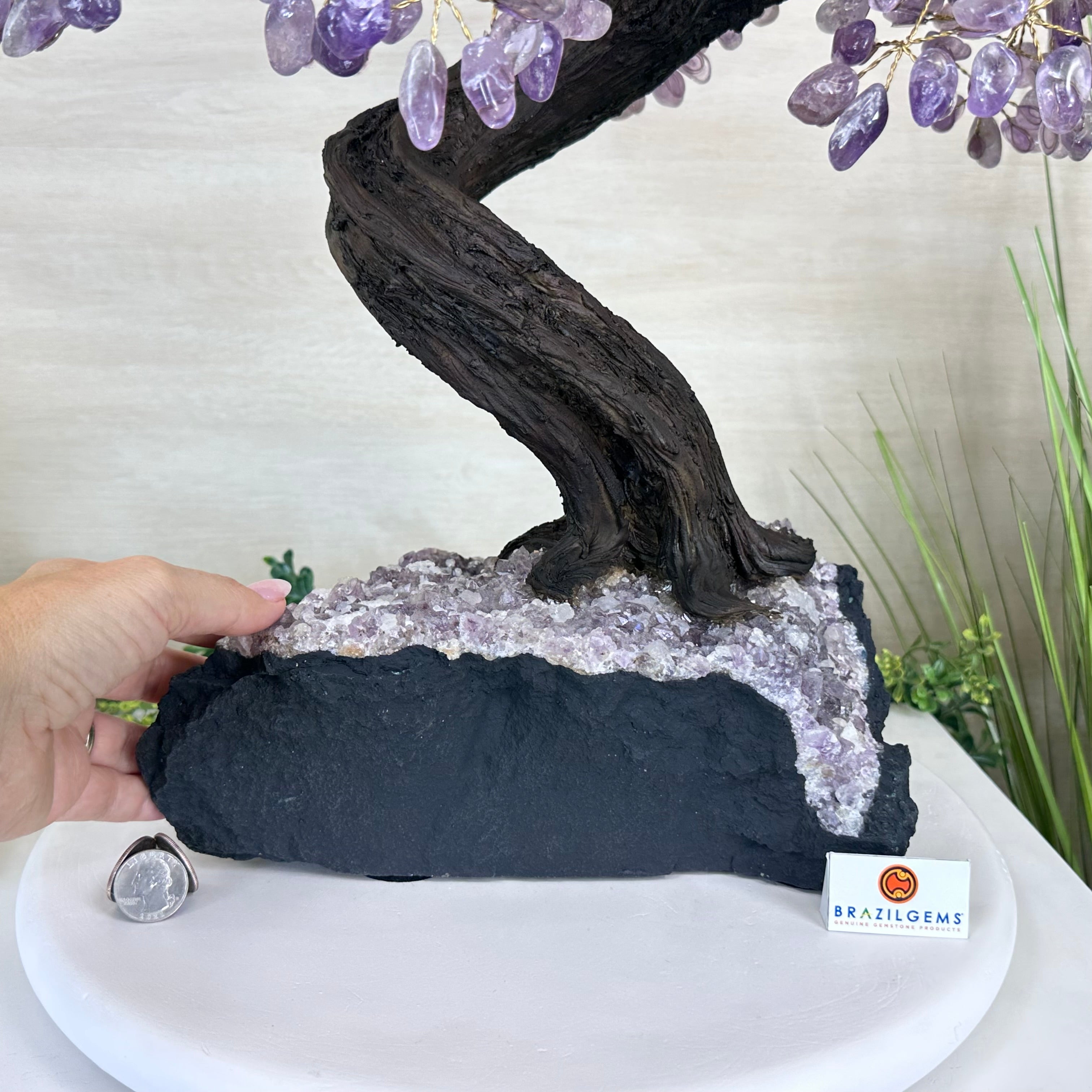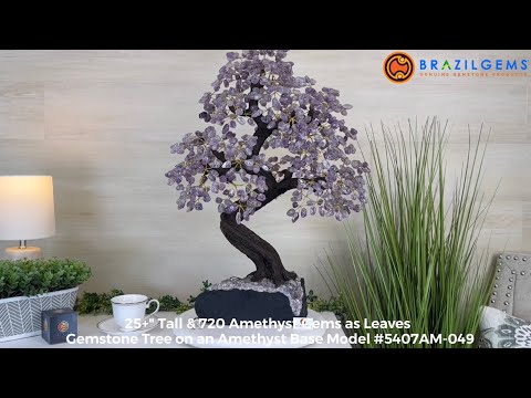Disclaimer: This is a genuine gemstone handmade item sold by Brazil Gems® as is and as you see it in its images and video. It is the exact tree you will receive. The base may contain natural imperfections as well as imperfections, repairs and broken edges from the extraction, polishing, and prepping processes and the branches and leaf gemstones may contain imperfections as well.  To allow for it to stand on its own the amethyst cluster base may have a small amount of cement added to the bottom then painted black. At Brazil Gems® we make every effort to get measurements as exact as possible but they are done by human hands and eyes and therefore may have minor discrepancies.