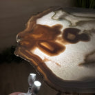 Large Natural Agate Side Table w/ one slice of stone on a chrome metal base. An amazing vibrant specimen to accent the decor of your home.
