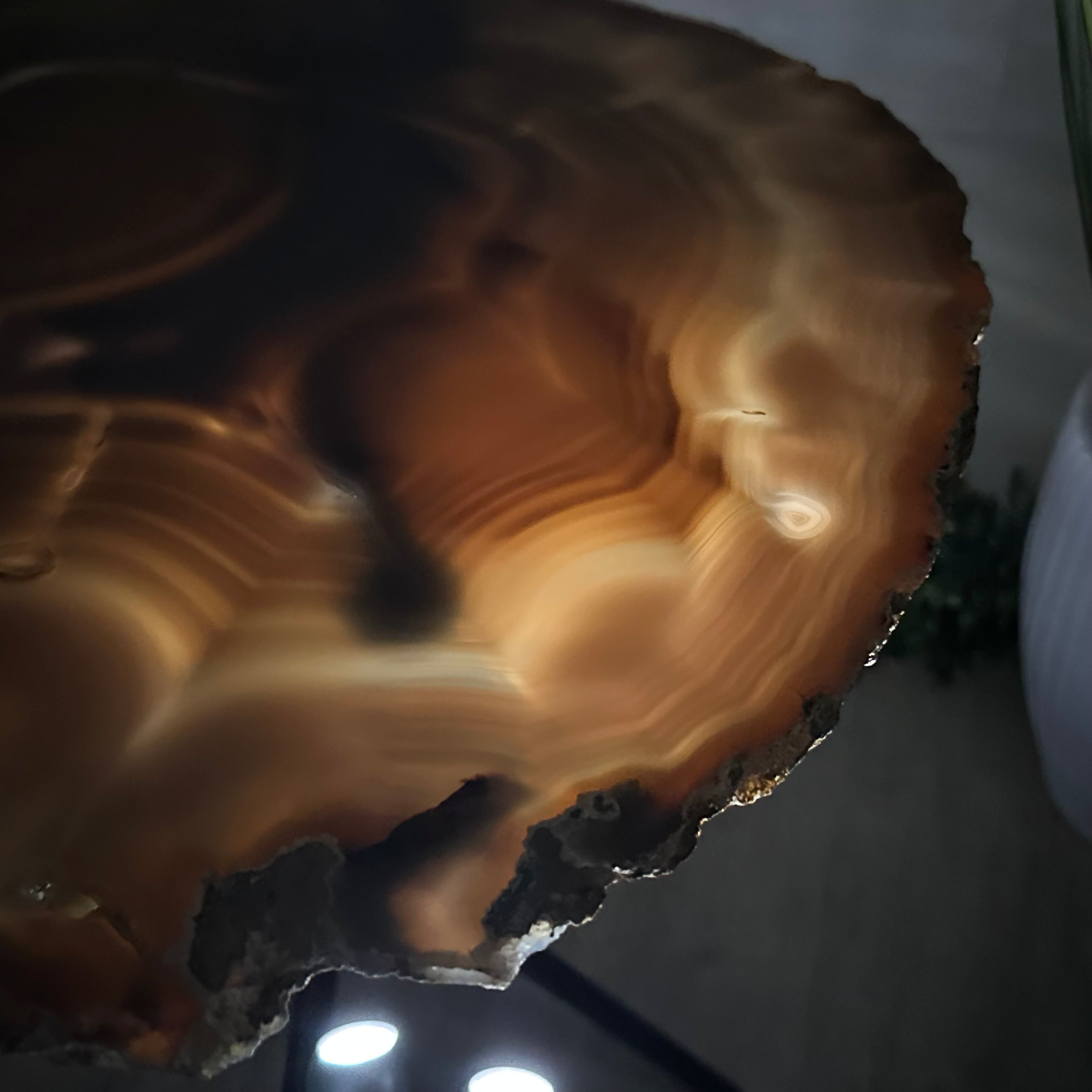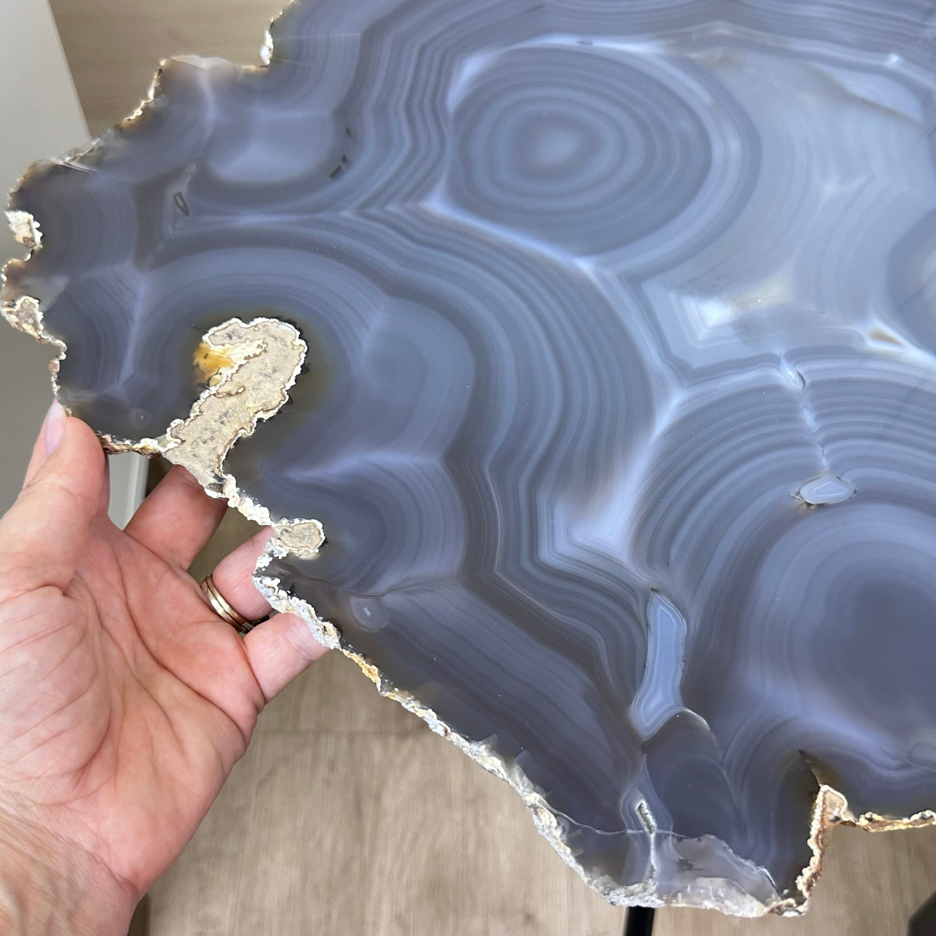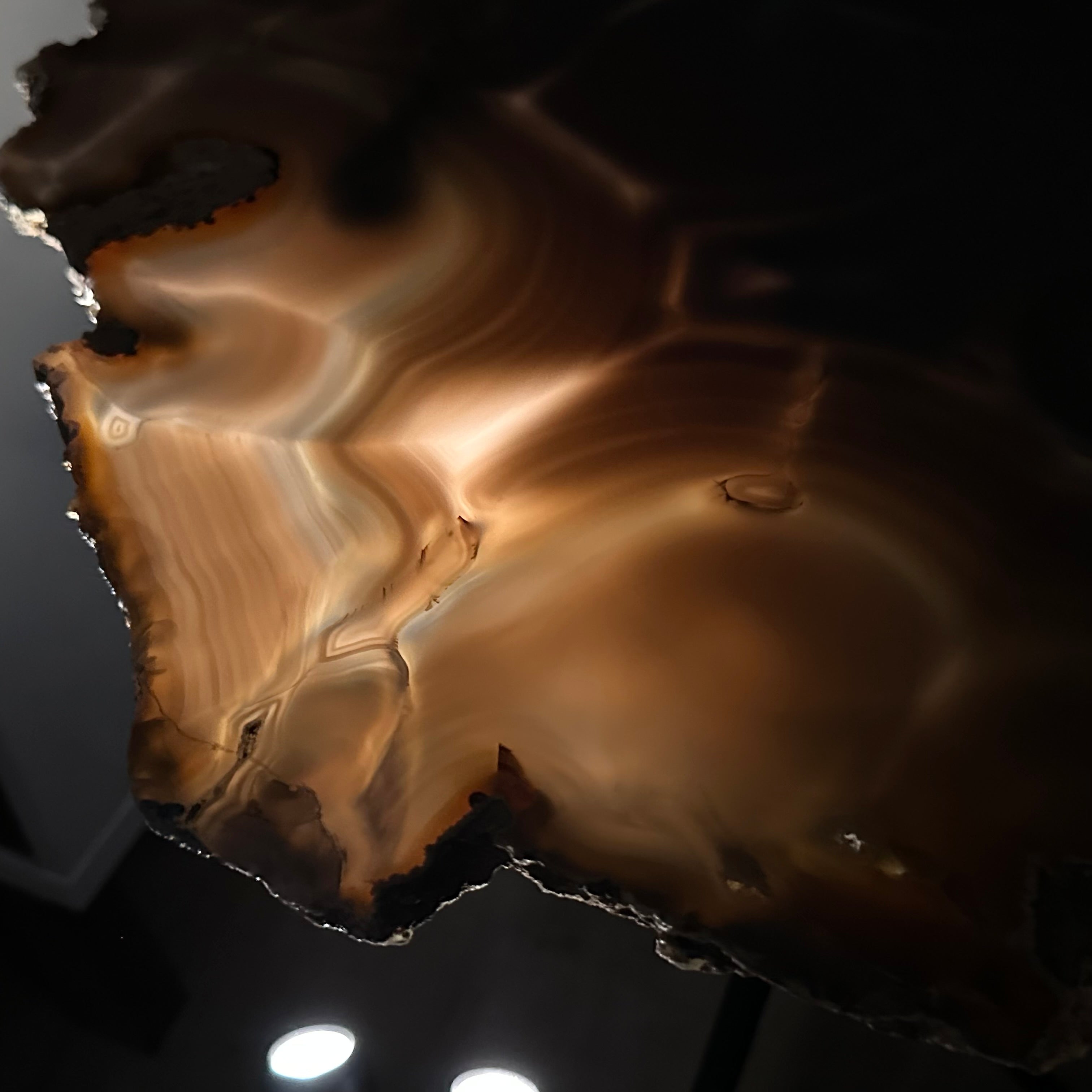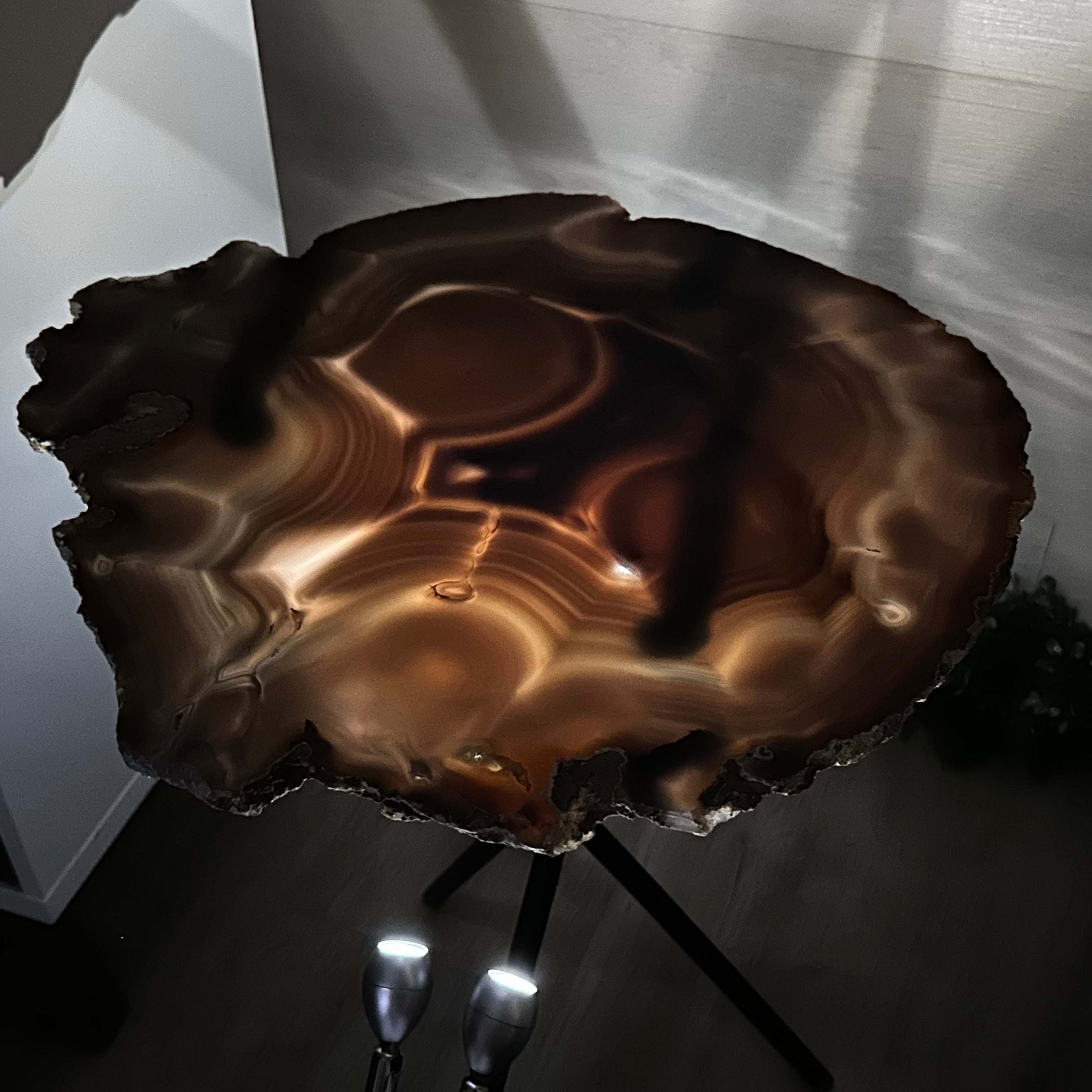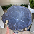 Large Natural Agate Side Table w/ one slice of stone on a black metal base. An amazing vibrant specimen to accent the decor of your home.