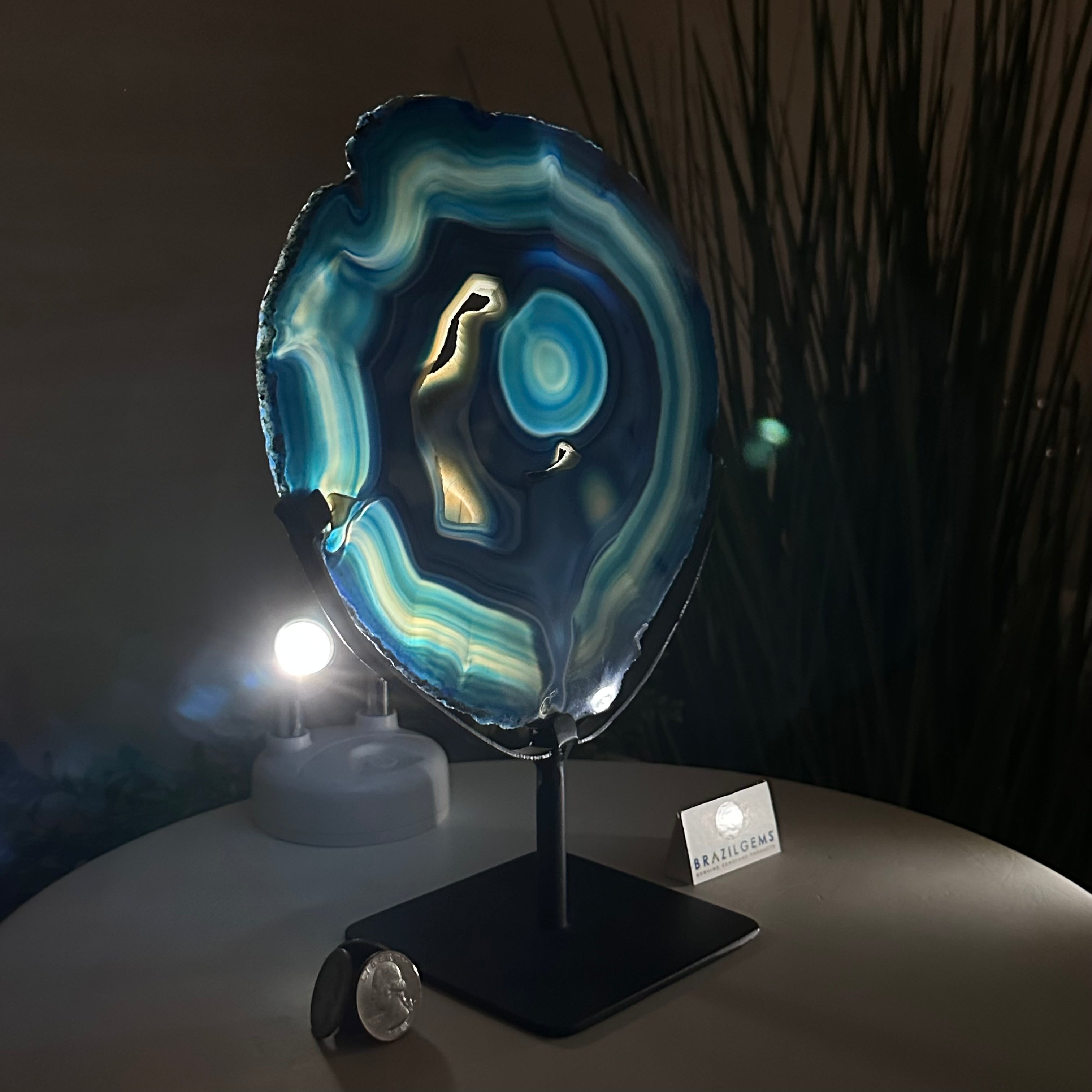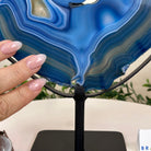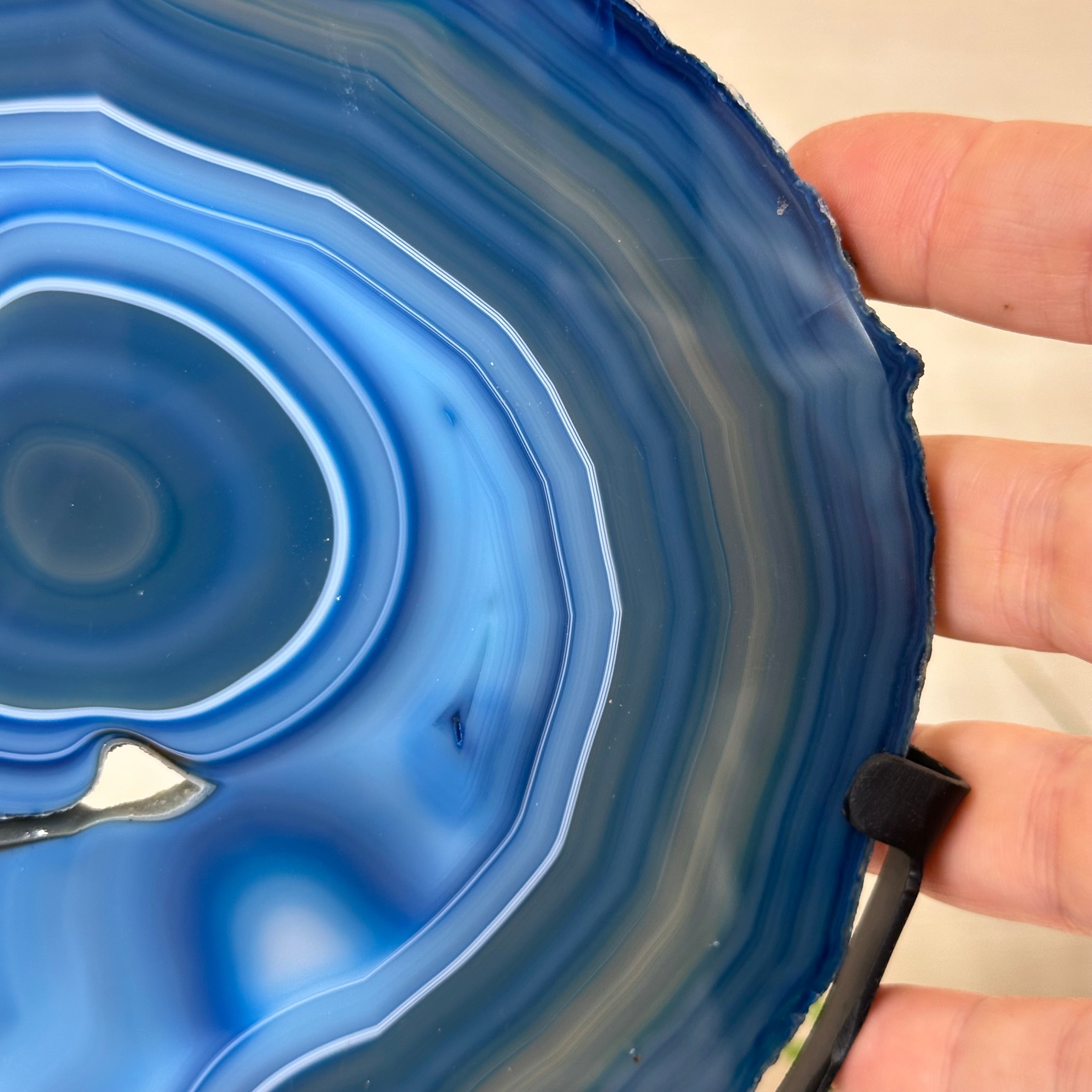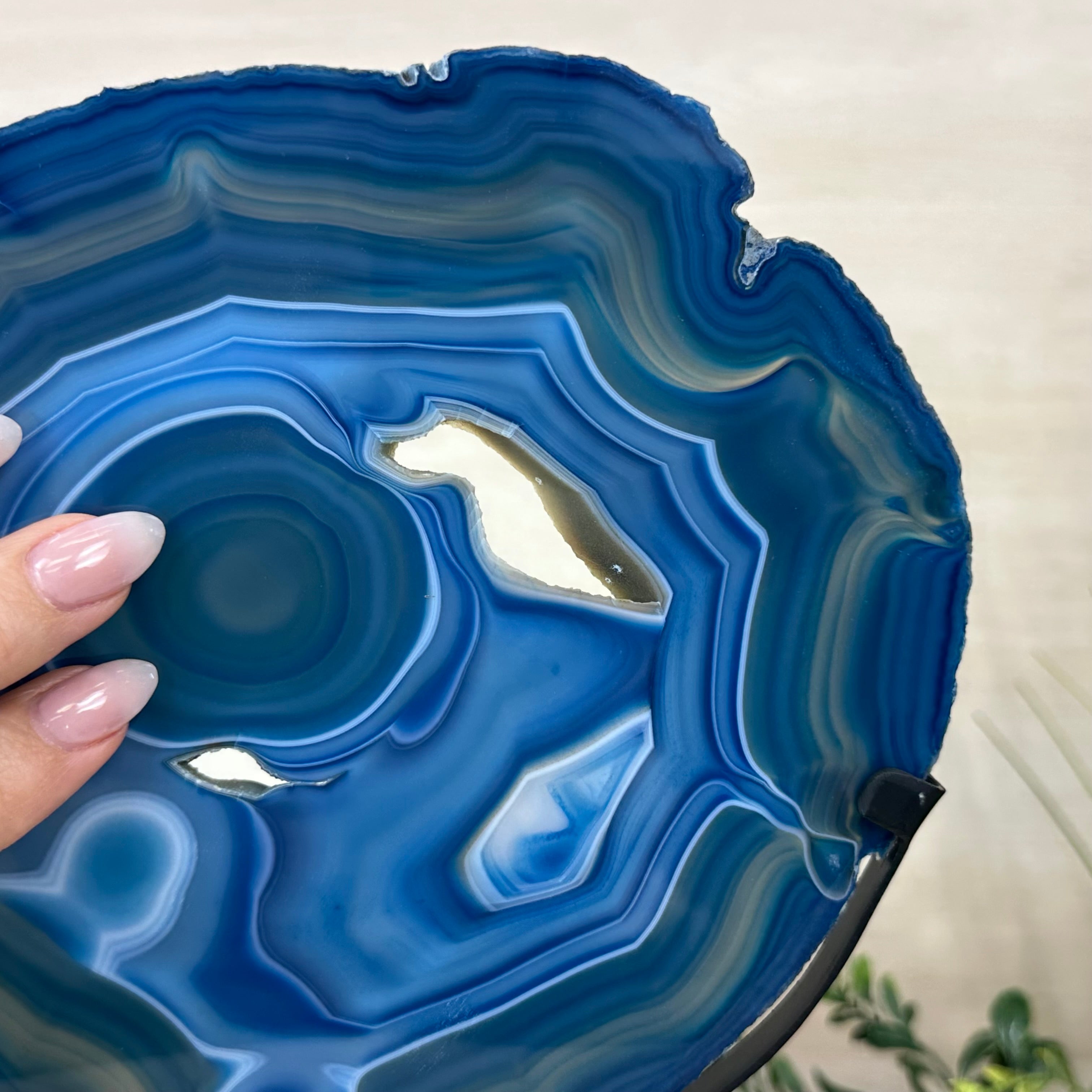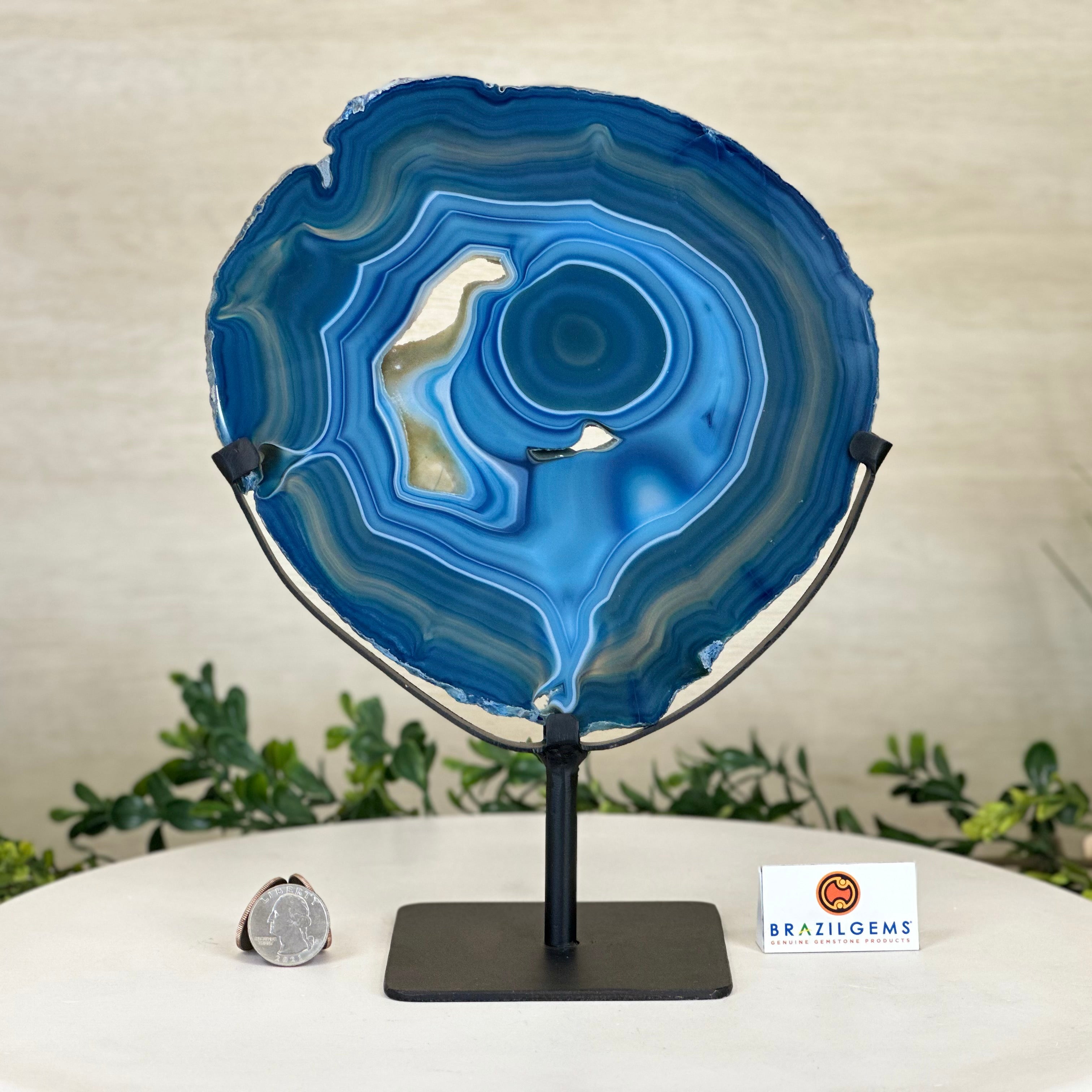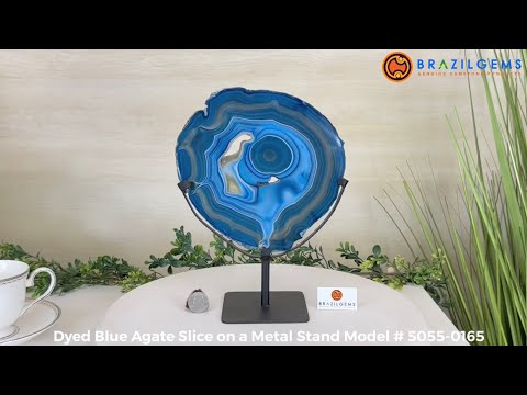 Enhance your decor with this bright slice of Brazilian Blue Agate (dyed blue) beautifully placed on a metal stand by Brazil Gems®. With its striking colors, well defined bands and drusy crystals, this is nature's work of millions of years now available to you.
