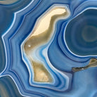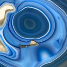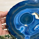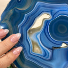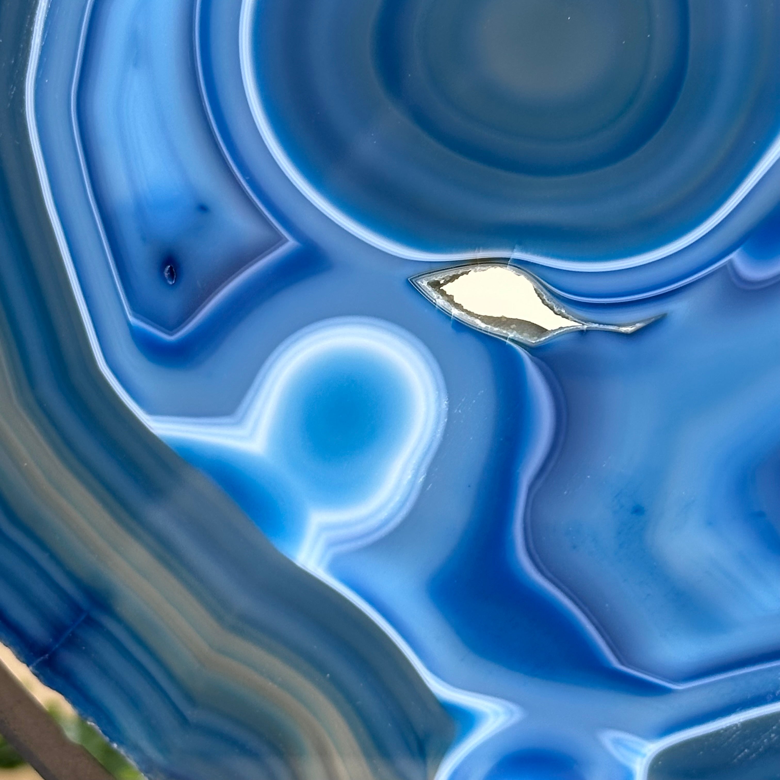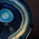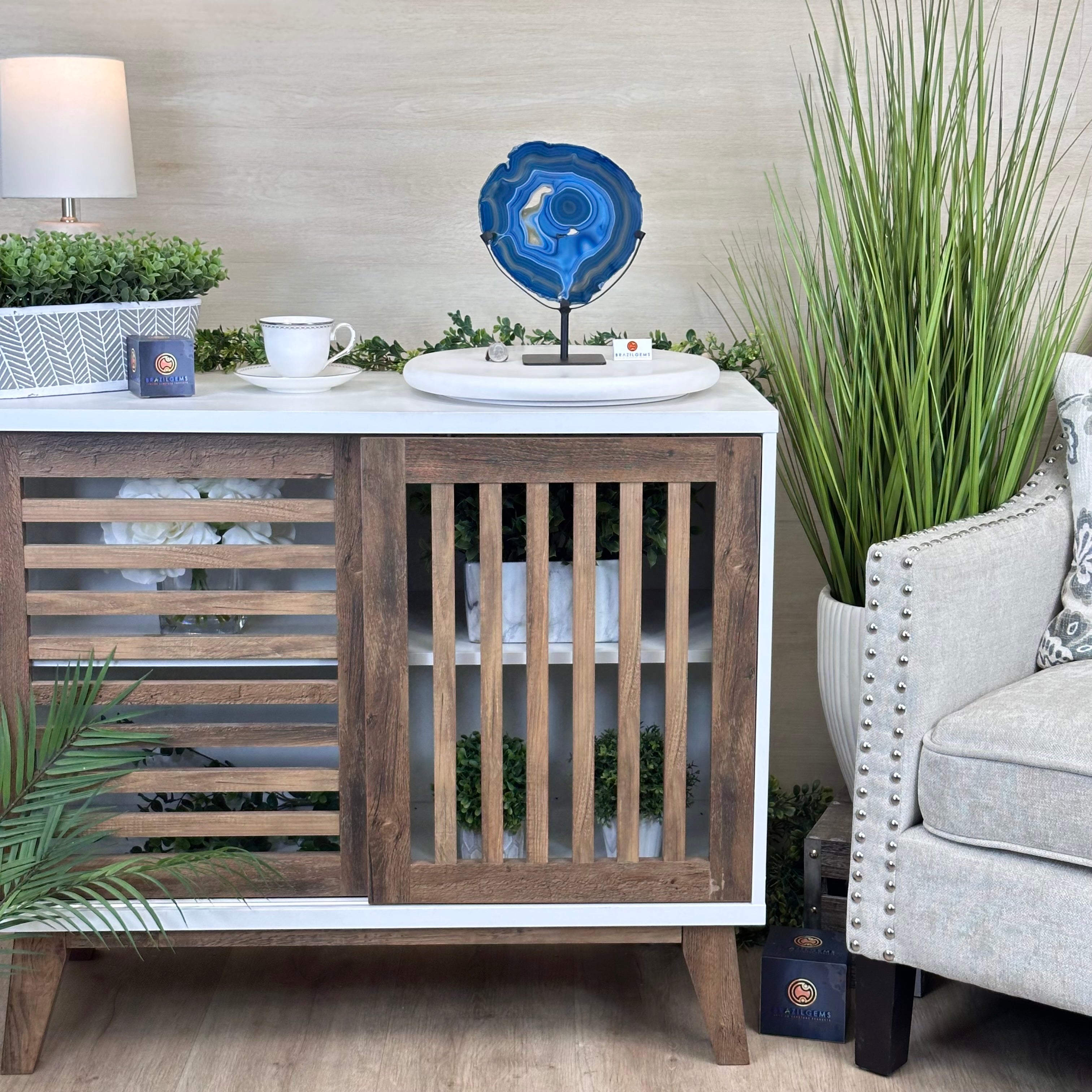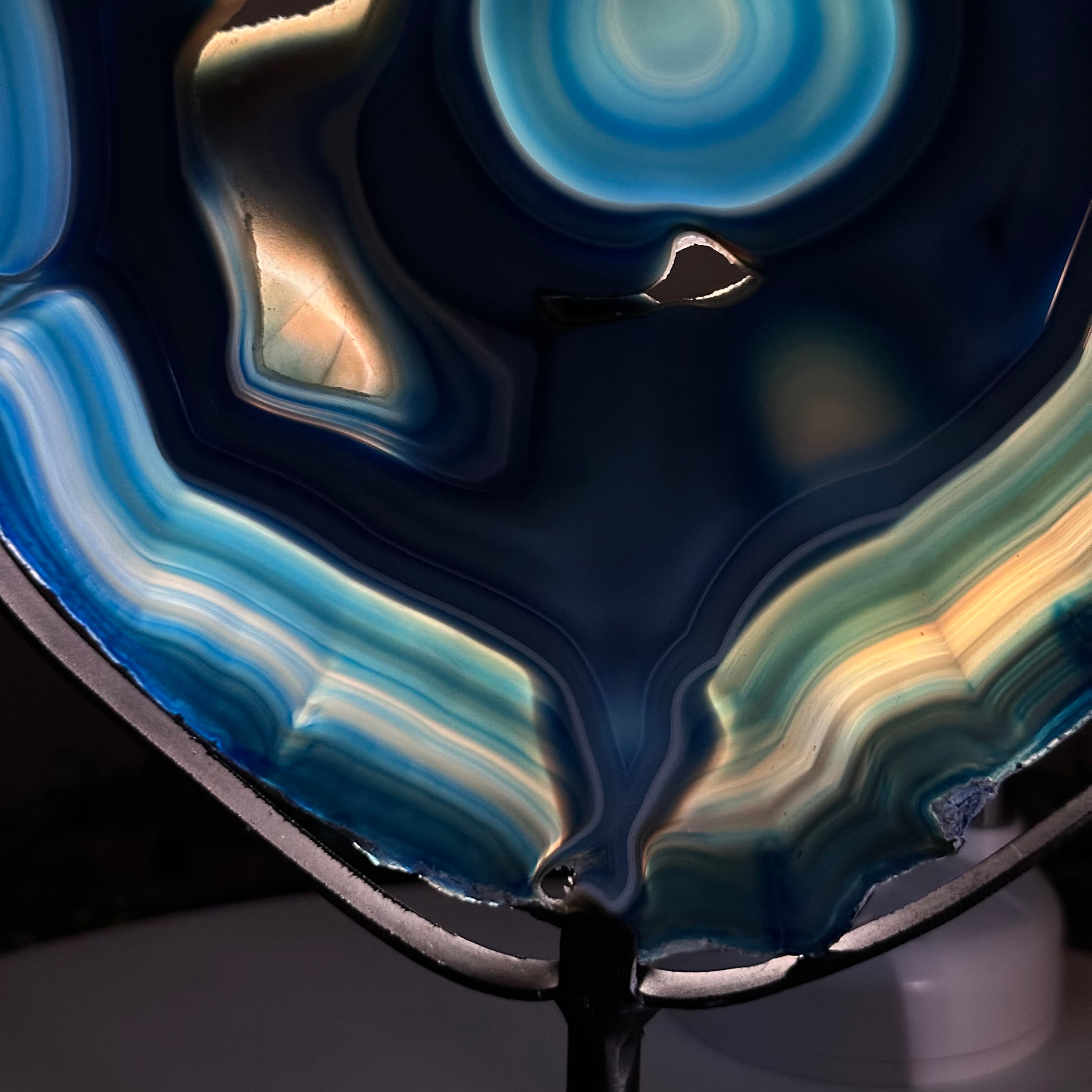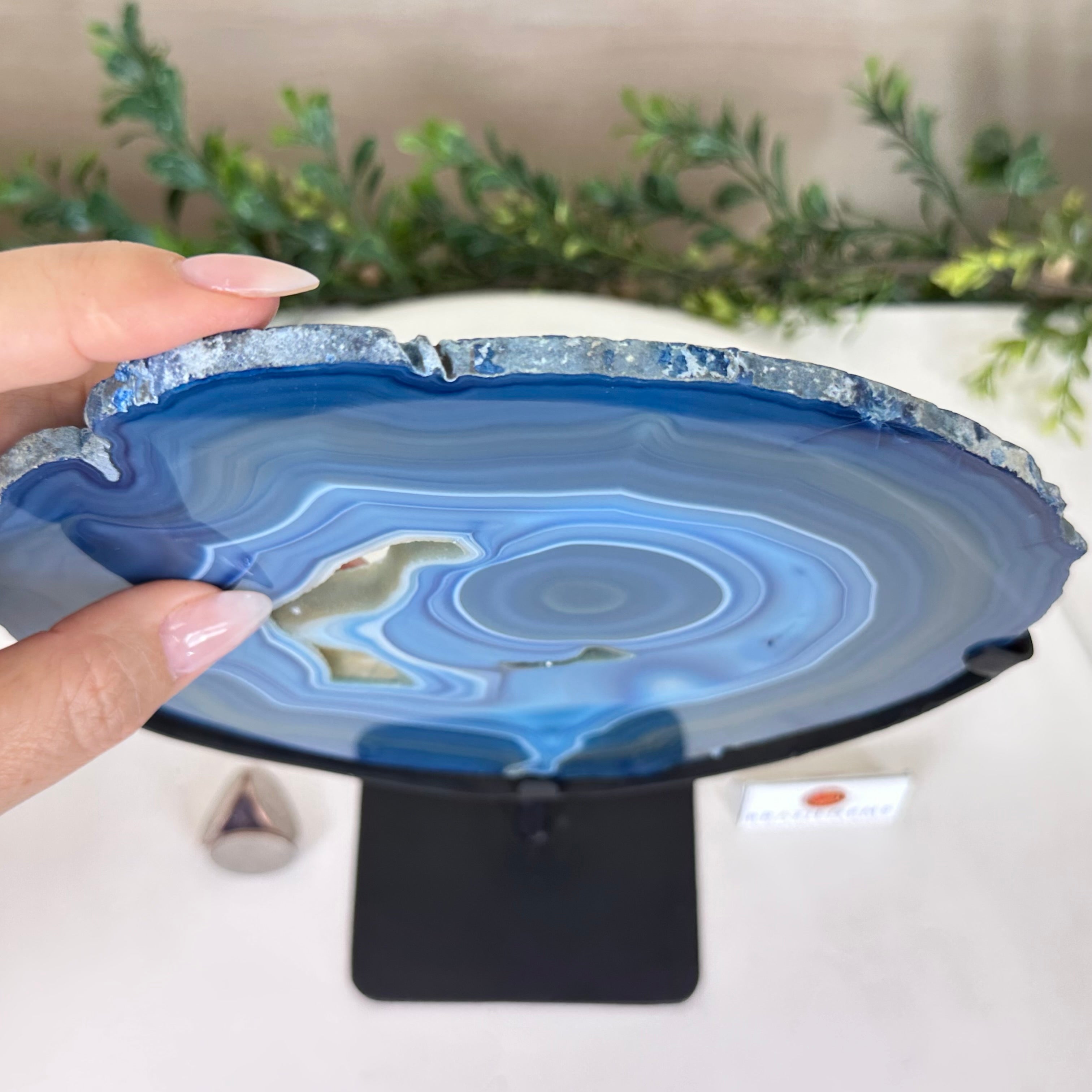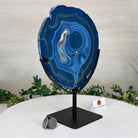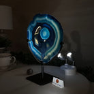Enhance your decor with this bright slice of Brazilian Blue Agate (dyed blue) beautifully placed on a metal stand by Brazil Gems®. With its striking colors, well defined bands and drusy crystals, this is nature's work of millions of years now available to you.