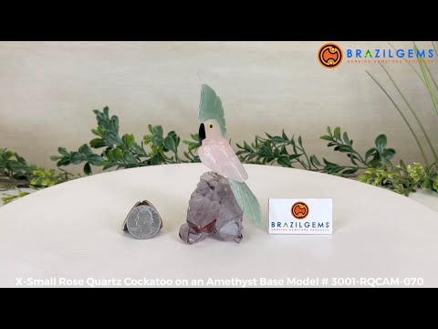 Marvel at our exquisite hand-carved X-Small Size Cockatoo gemstone bird perched on a captivating Amethyst cluster base, a harmonious blend of nature, art, and elegance. Crafted from premium Rose Quartz for its body, Black Onyx for its beak, Green Quartz for its crest and its tail and adorned with cute little metal feet, this stunning sculpture captures the essence of nature's beauty.