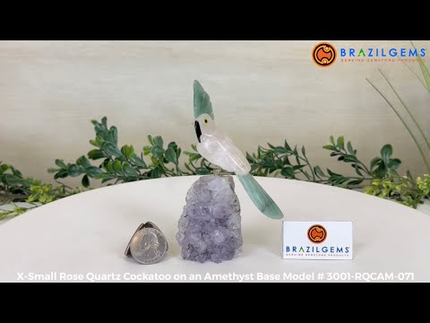 Marvel at our exquisite hand-carved X-Small Size Cockatoo gemstone bird perched on a captivating Amethyst cluster base, a harmonious blend of nature, art, and elegance. Crafted from premium Rose Quartz for its body, Black Onyx for its beak, Green Quartz for its crest and its tail and adorned with cute little metal feet, this stunning sculpture captures the essence of nature's beauty.