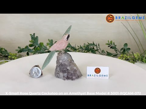 Marvel at our exquisite hand-carved X-Small Size Cockatoo gemstone bird perched on a captivating Amethyst cluster base, a harmonious blend of nature, art, and elegance. Crafted from premium Rose Quartz for its body, Black Onyx for its beak, Green Quartz for its crest and its tail and adorned with cute little metal feet, this stunning sculpture captures the essence of nature's beauty.