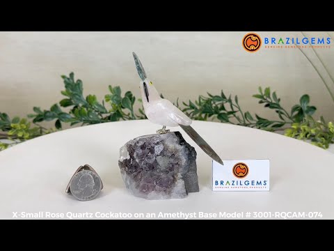 Marvel at our exquisite hand-carved X-Small Size Cockatoo gemstone bird perched on a captivating Amethyst cluster base, a harmonious blend of nature, art, and elegance. Crafted from premium Rose Quartz for its body, Black Onyx for its beak, Green Jasper for its crest and its tail and adorned with cute little metal feet, this stunning sculpture captures the essence of nature's beauty.