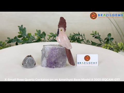 Marvel at our exquisite hand-carved X-Small Size Cockatoo gemstone bird perched on a captivating Amethyst cluster base, a harmonious blend of nature, art, and elegance. Crafted from premium Rose Quartz for its body, Black Onyx for its beak, Red Jasper for its crest, Red Jasper for its tail and adorned with cute little metal feet, this stunning sculpture captures the essence of nature's beauty.