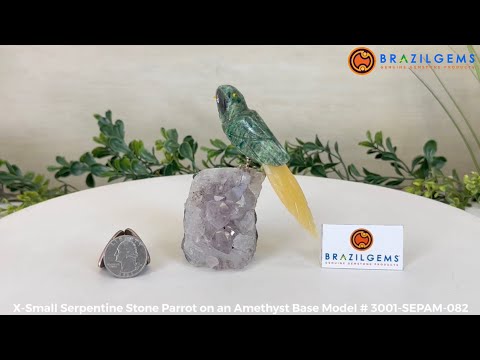 Each intricate detail of the bird is meticulously carved by skilled Brazilian artisans who have mastered the technique that combines the beauty of Brazil's gemstones with their colorful native birds into an amazing art piece. Elevate your space with the timeless charm of our Parrot gemstone bird on an Amethyst base.