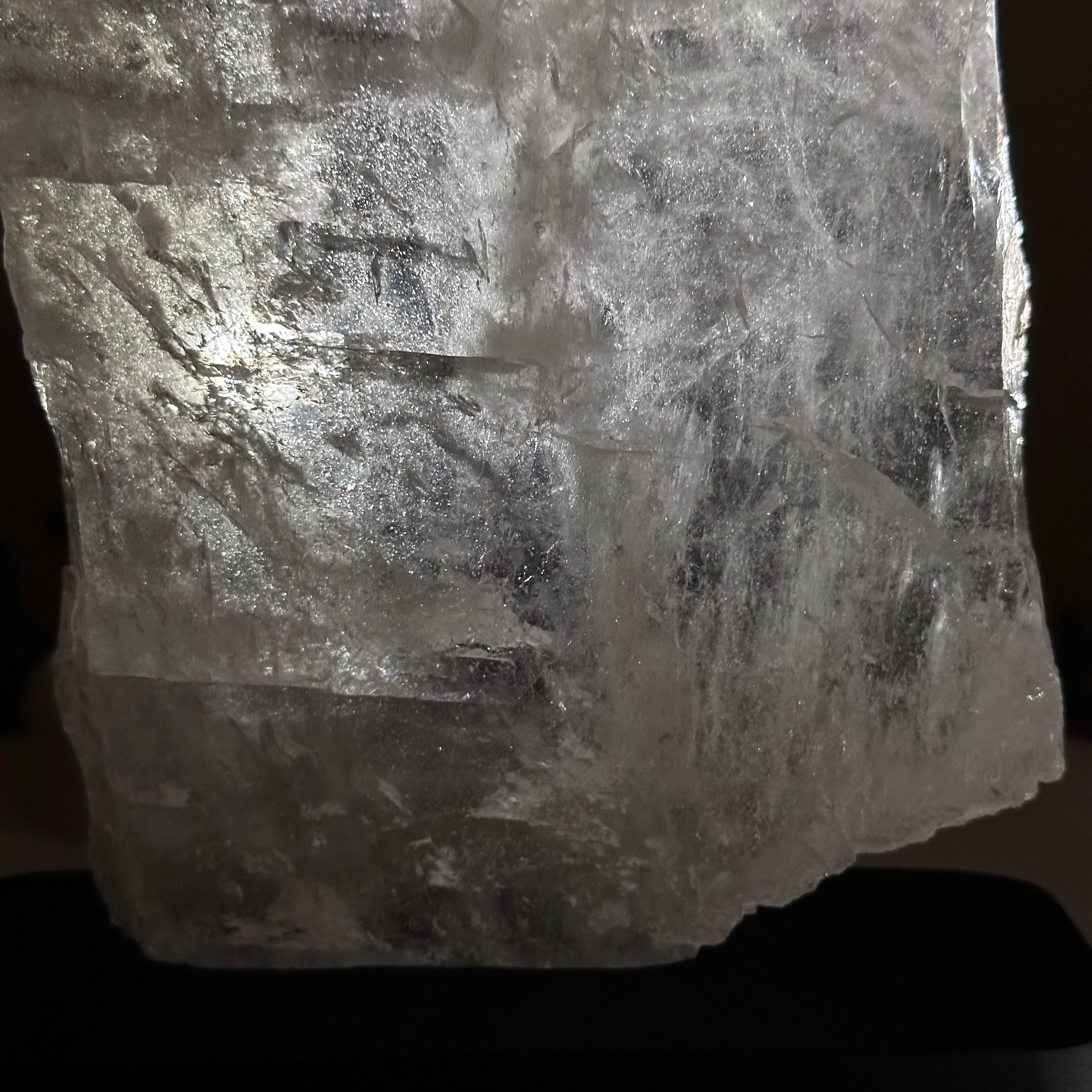 Elevate your space with this Brazilian Clear Quartz Slice on a wood base. This piece is beautifully polished on the front with rough edges on the sides and the back. This slice will make a great addition or start to your crystal collection and will accent the décor of any room.