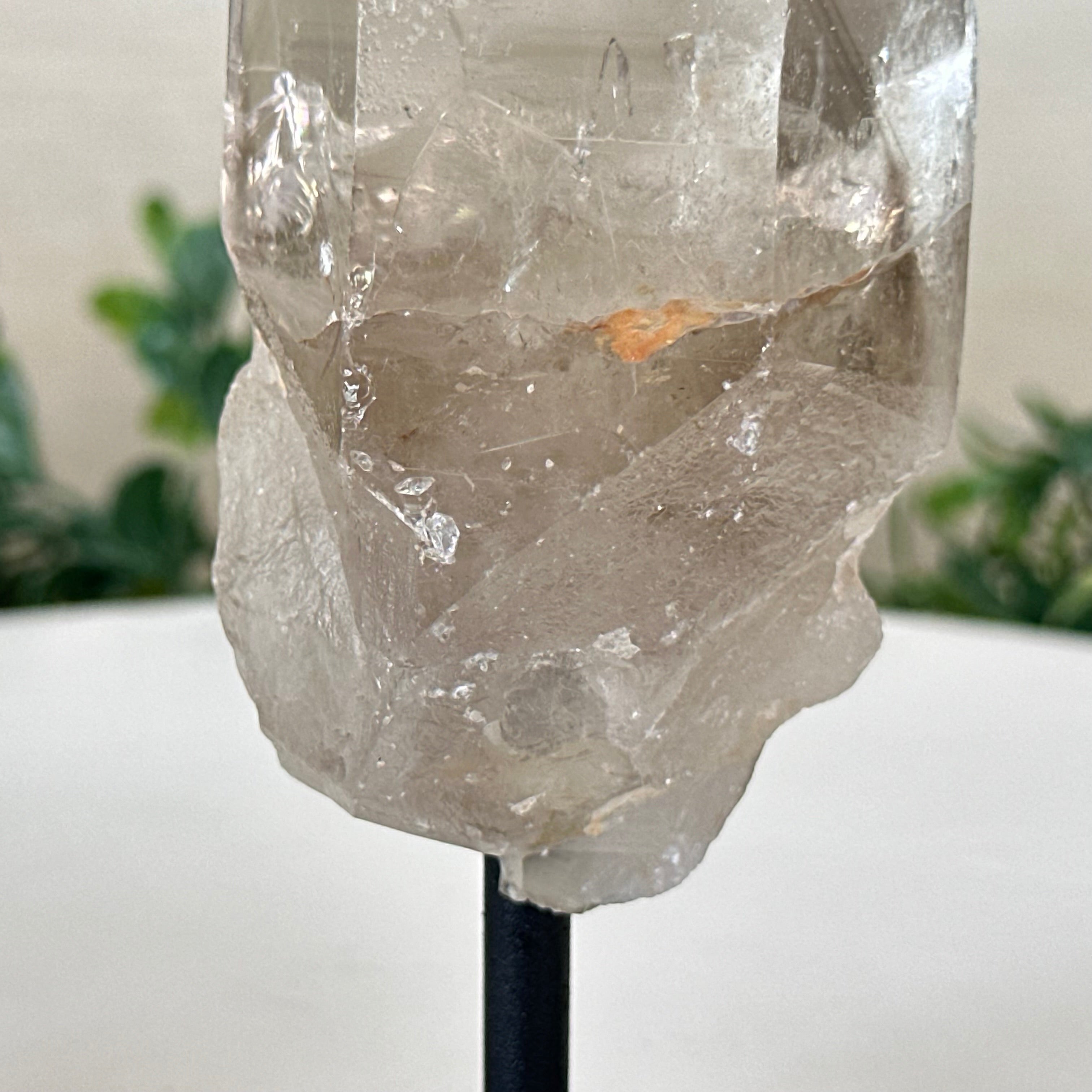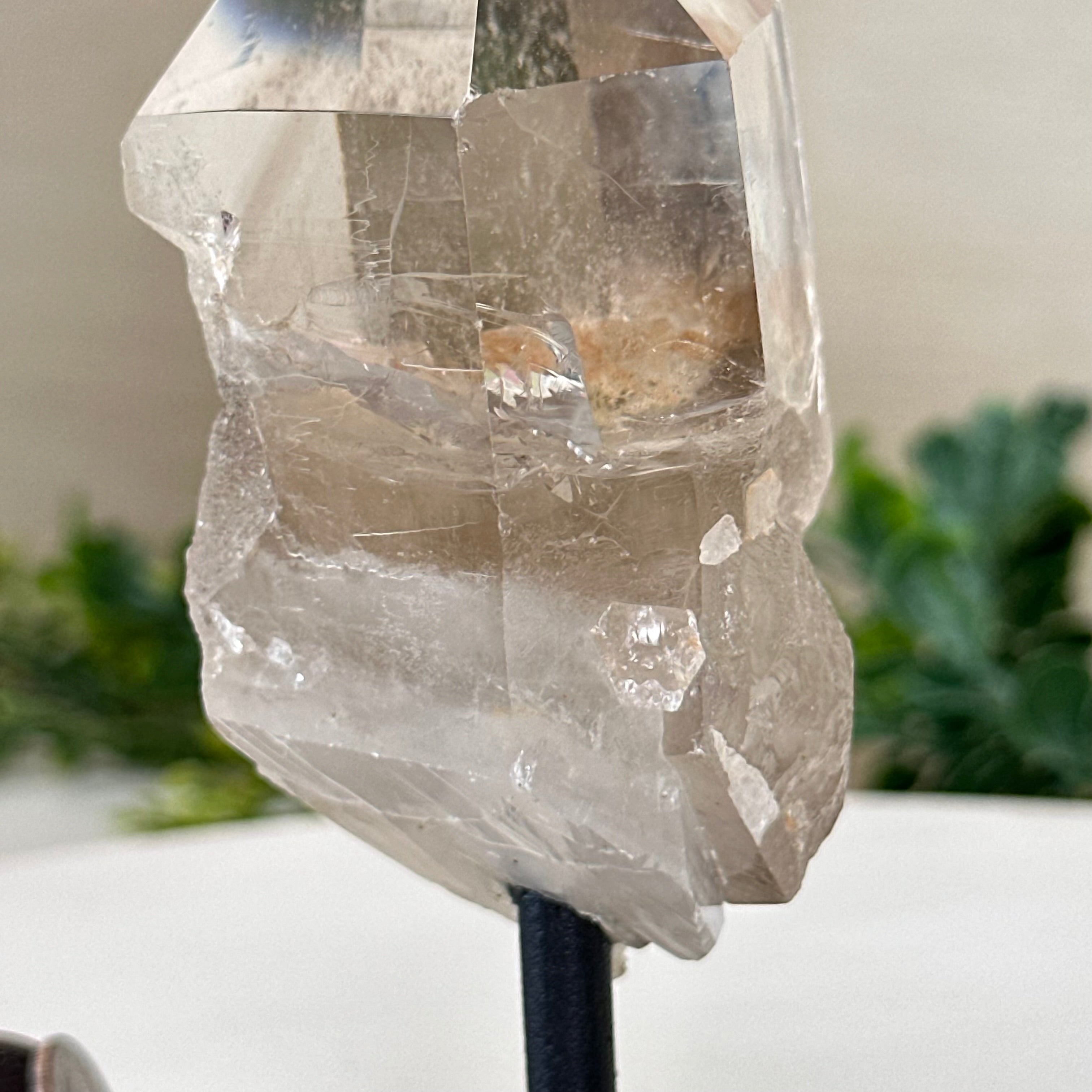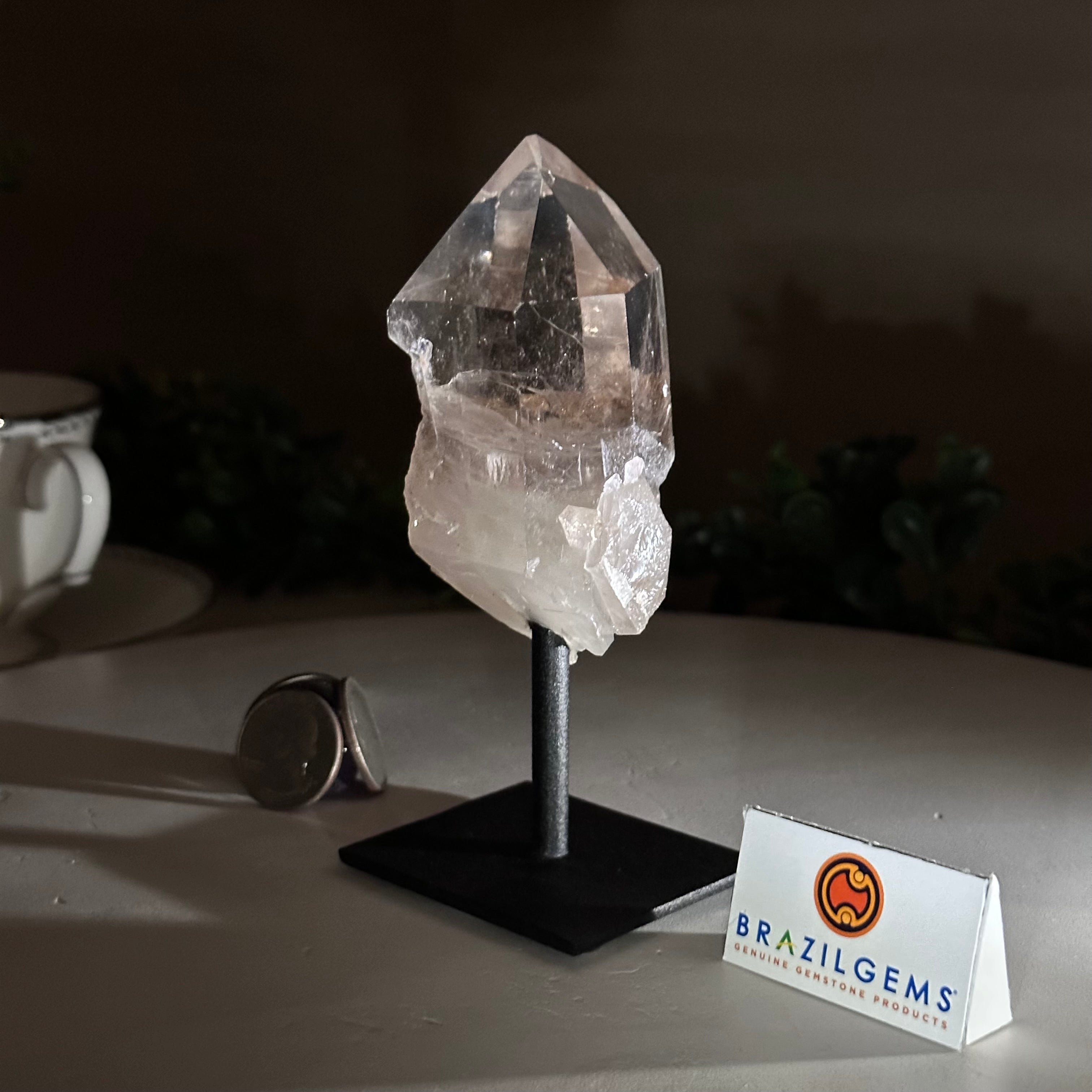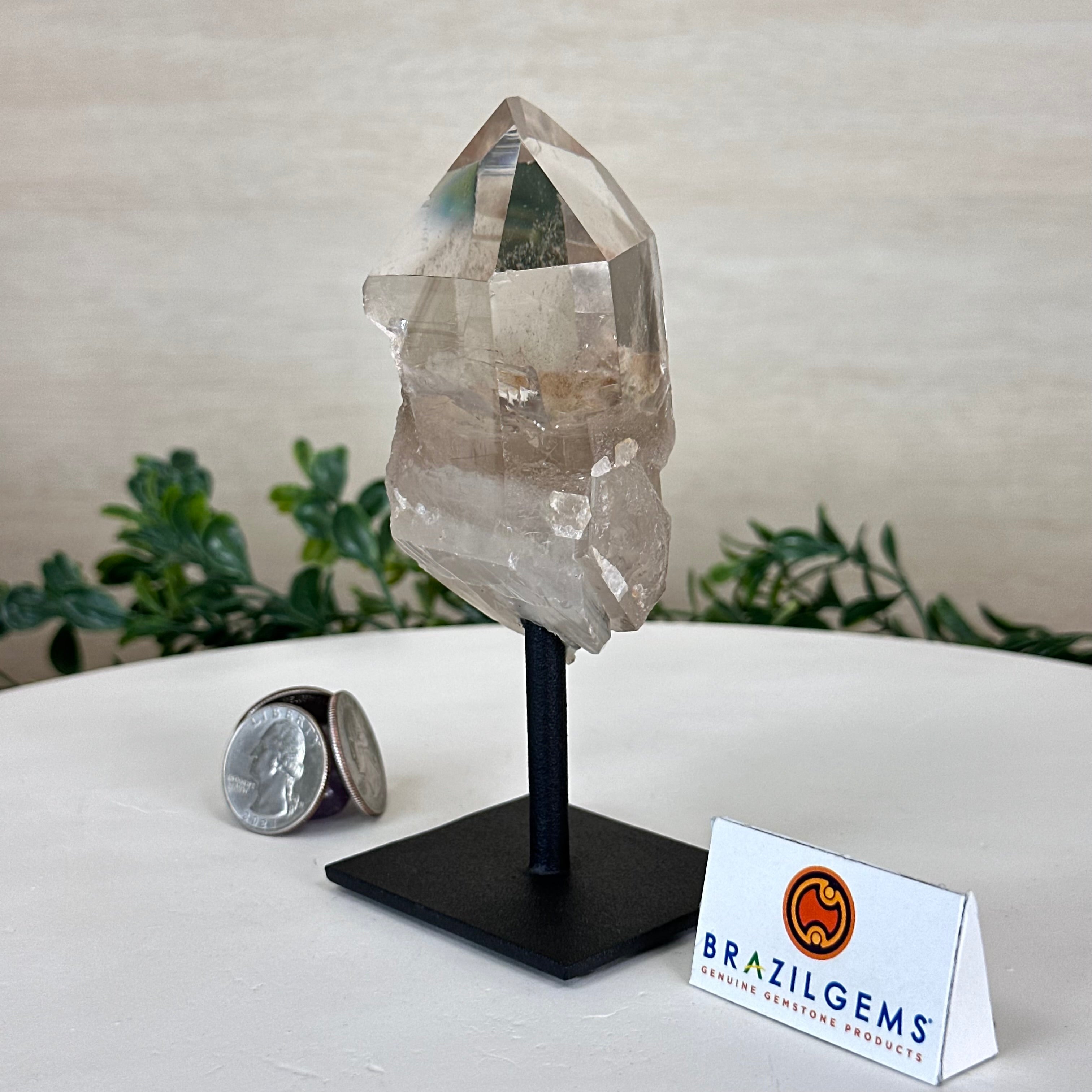 Enhance your home or sacred space with the multi-faceted beauty of this Smoky Quartz Crystal Point on a Metal Stand by Brazil Gems. Crafted from Brazilian Smoky Quartz, this all natural crystal has naturally smooth faces of a 6-sided point on the top, rough side edges, a warm hue and a translucent glow when lit from behind. Its calming presence is perfect for home décor, and its beauty and natural energy will enrich any environment.