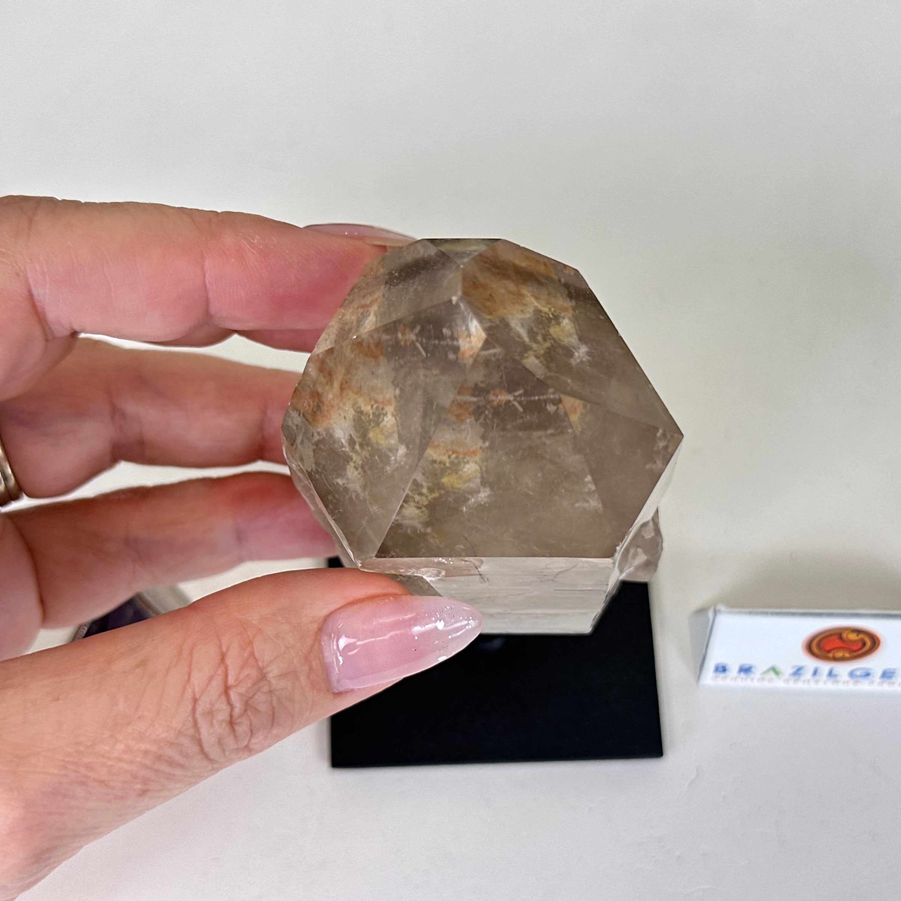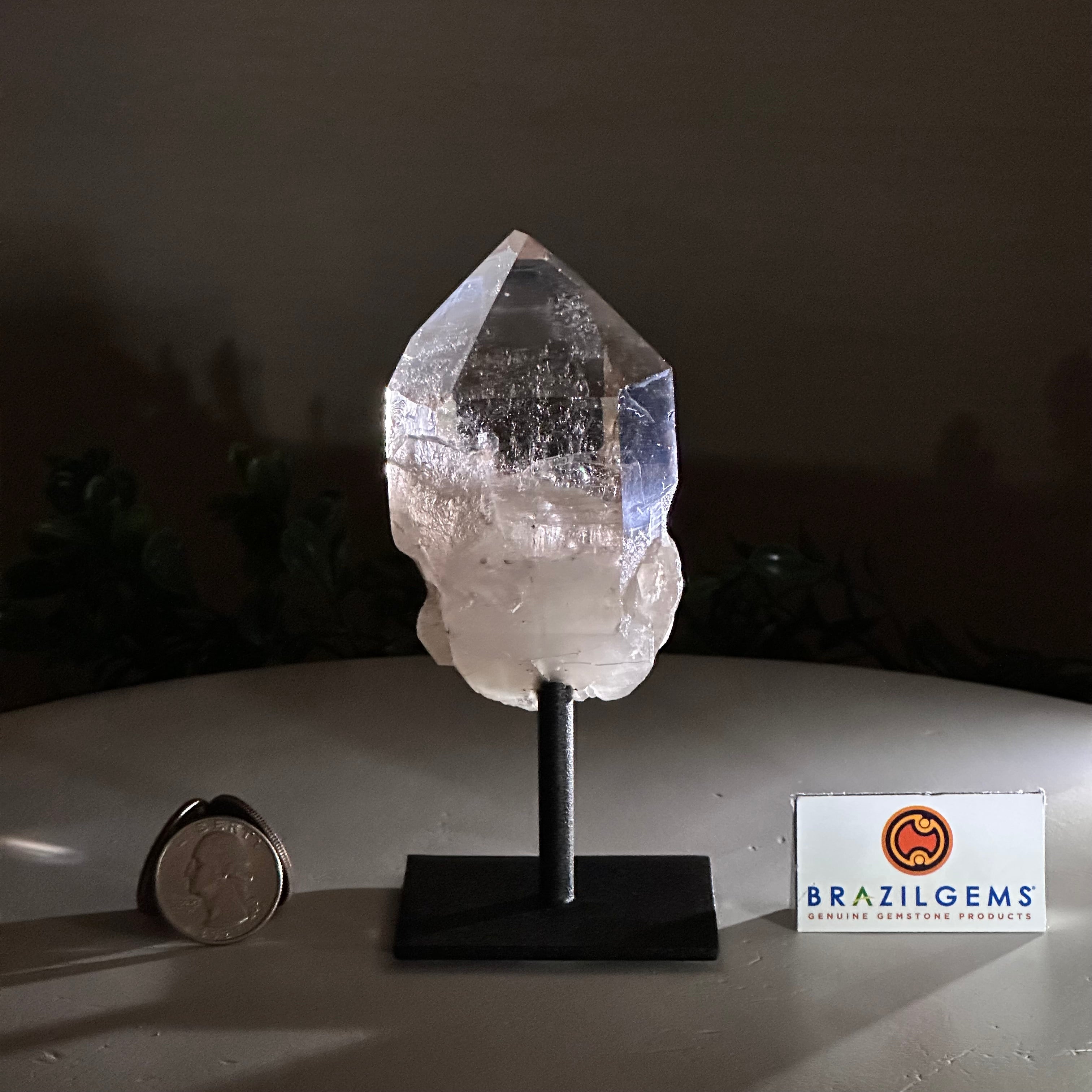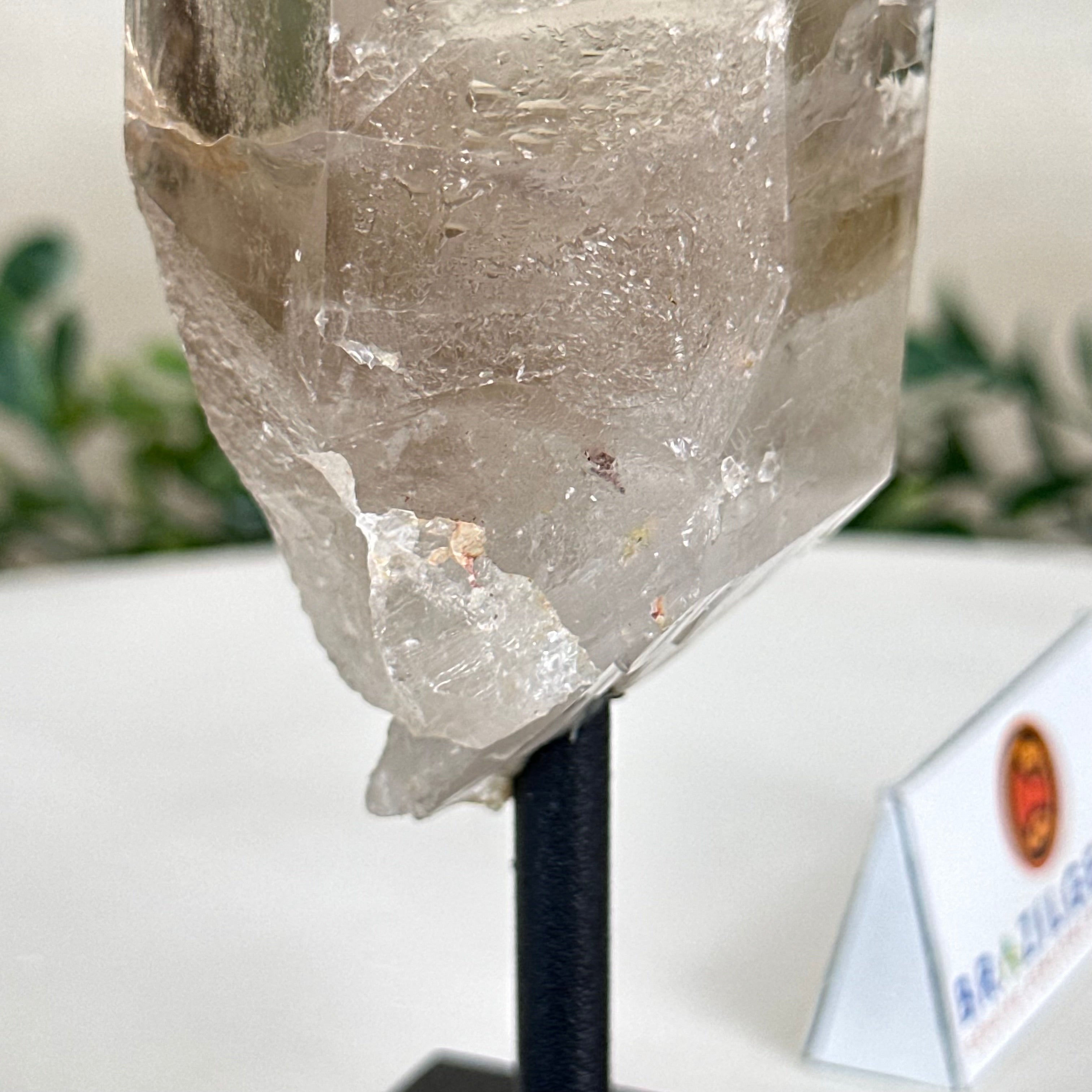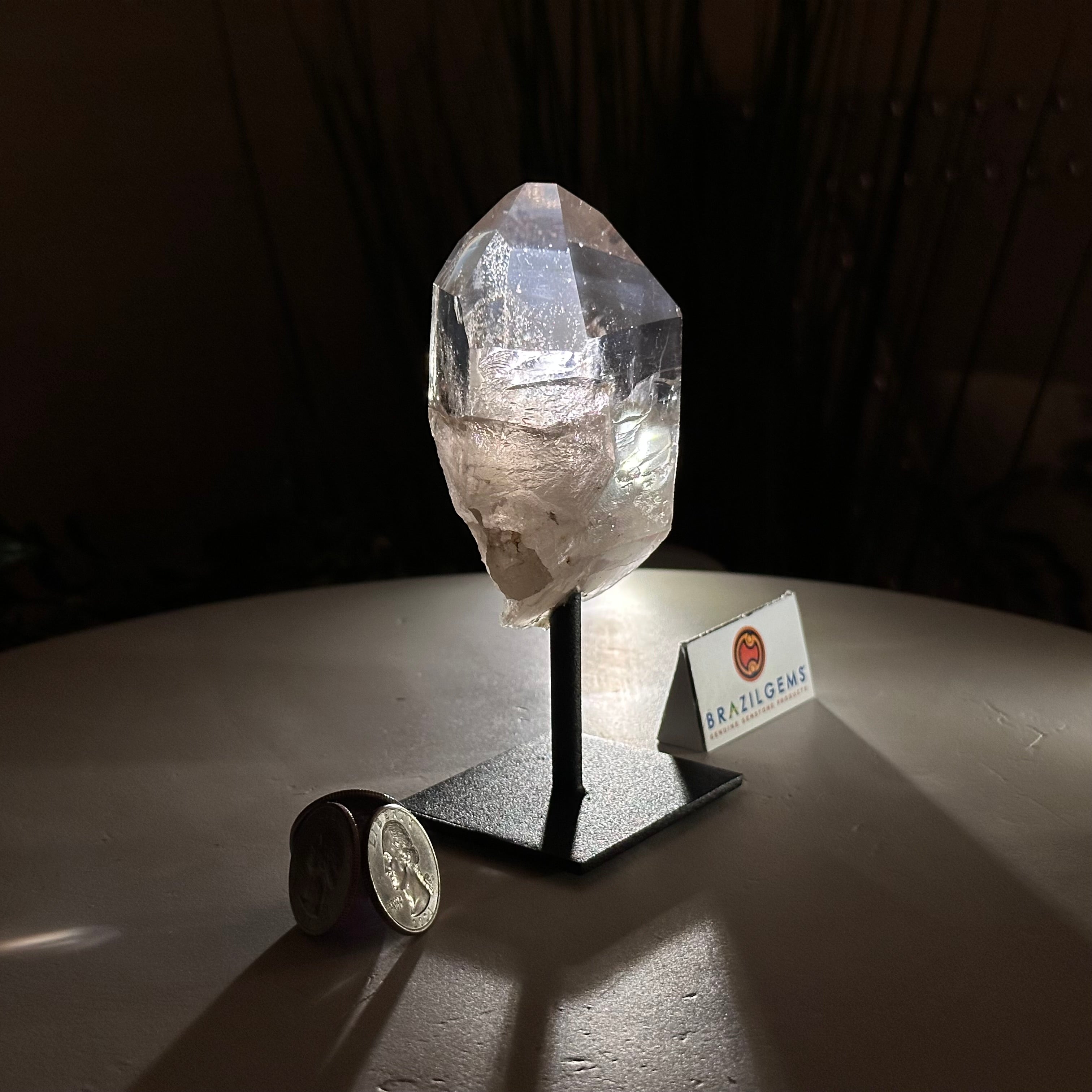 Disclaimer: This is a natural gemstone crystal sold by Brazil Gems® as is and as you see it in its images and video. It is the exact one you will receive. It may contain natural imperfections, scratches, repairs, and/or broken edges from the extraction, polishing, mounting, and prepping processes. A small hole was drilled into the bottom of the crystal in order to mount it on its black painted metal stand. At Brazil Gems® we make every effort to get measurements as exact as possible but they are done by human hands and eyes and therefore may have minor discrepancies.