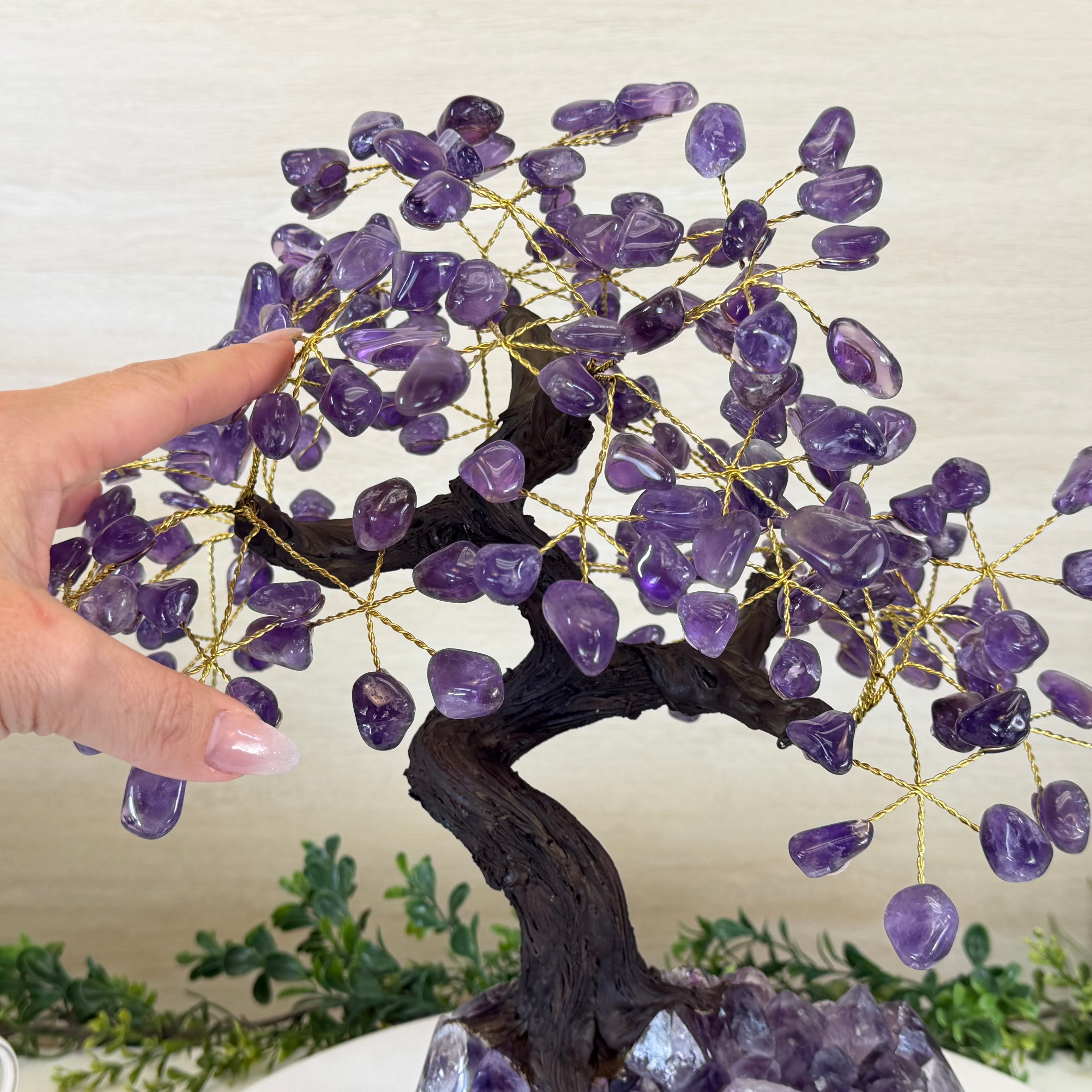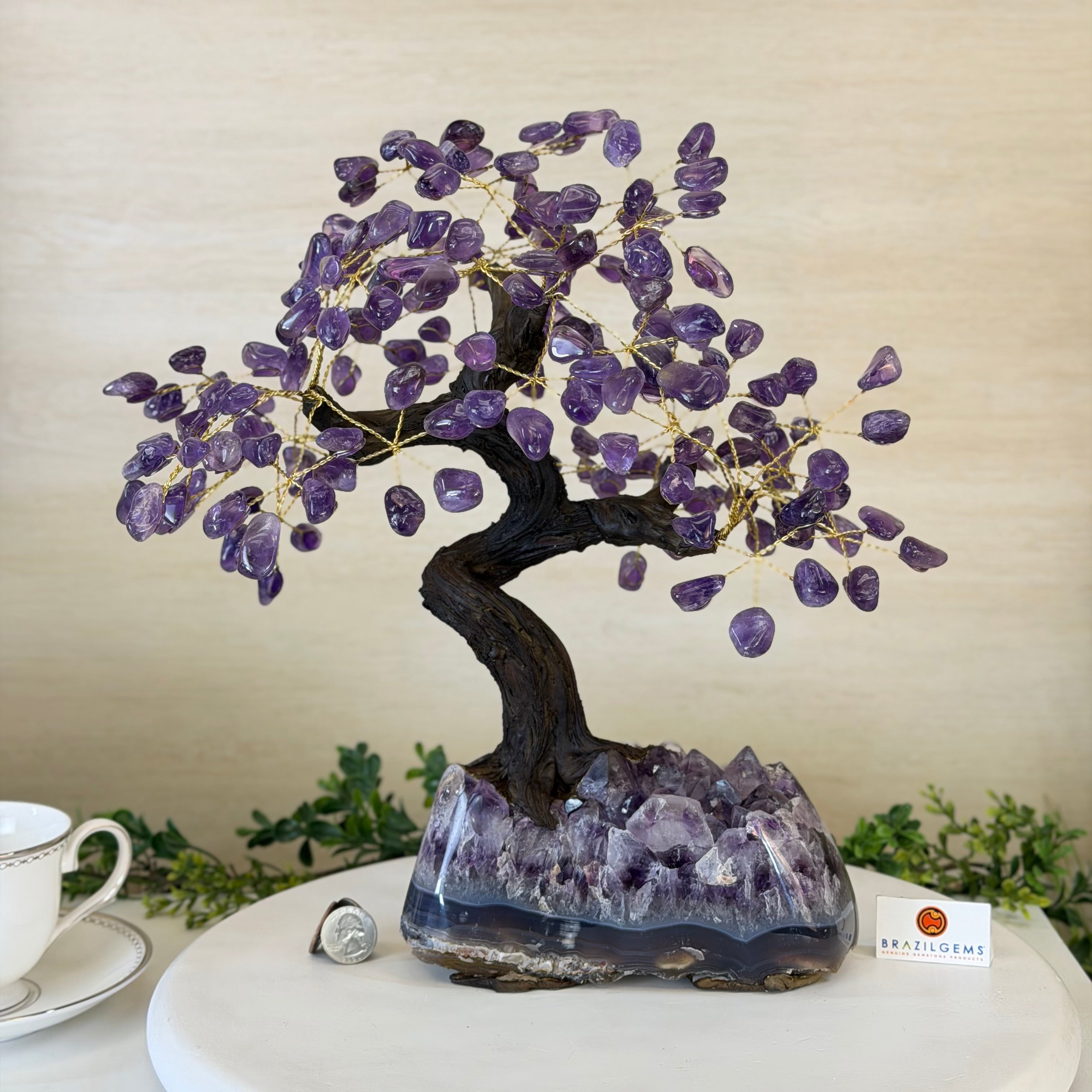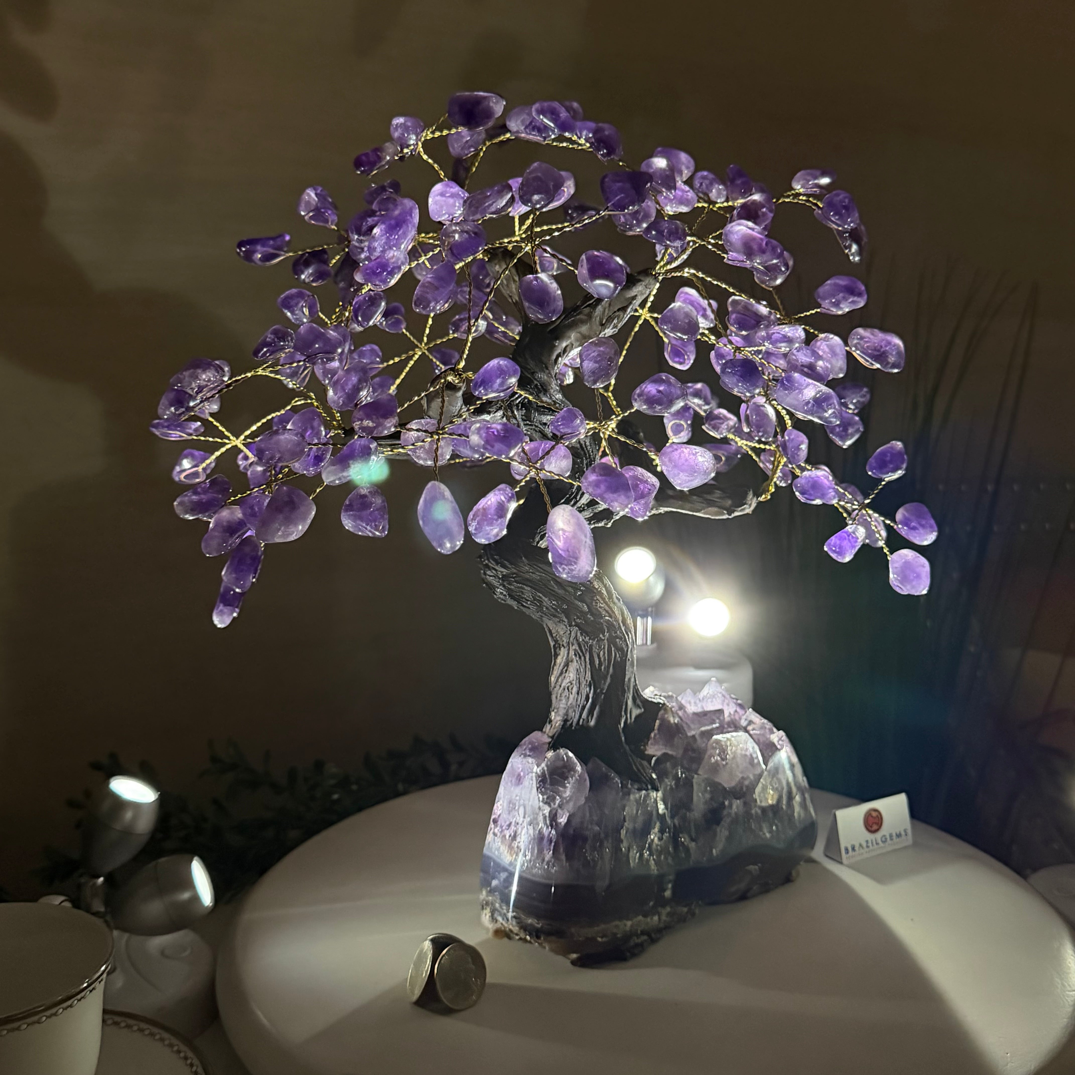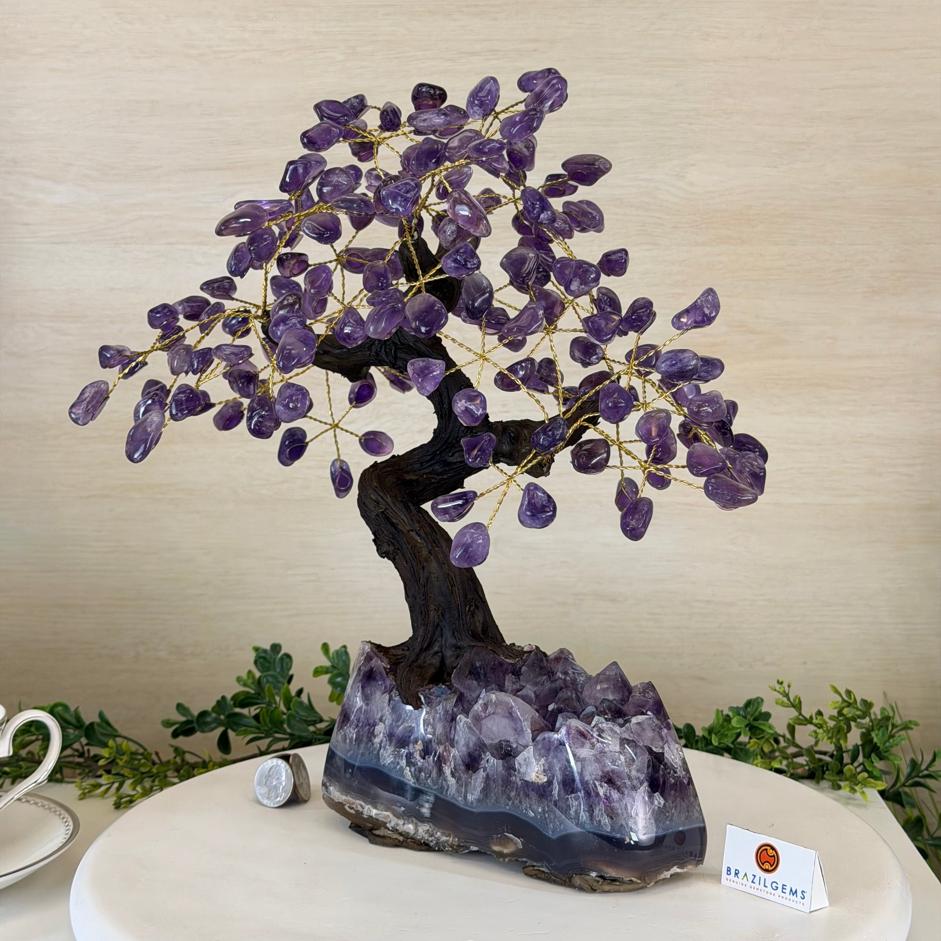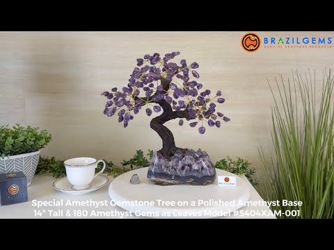 Special Amethyst Bonsai Gemstone Tree on a Polished Amethyst Cluster Base Handcrafted in Brazil, this striking gemstone tree stands approximately 14" tall and features a sturdy bonsai-style trunk and branches adorned with 180 tumbled Amethyst gemstones as its leaves.
