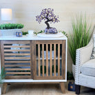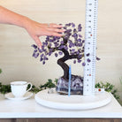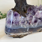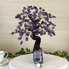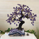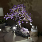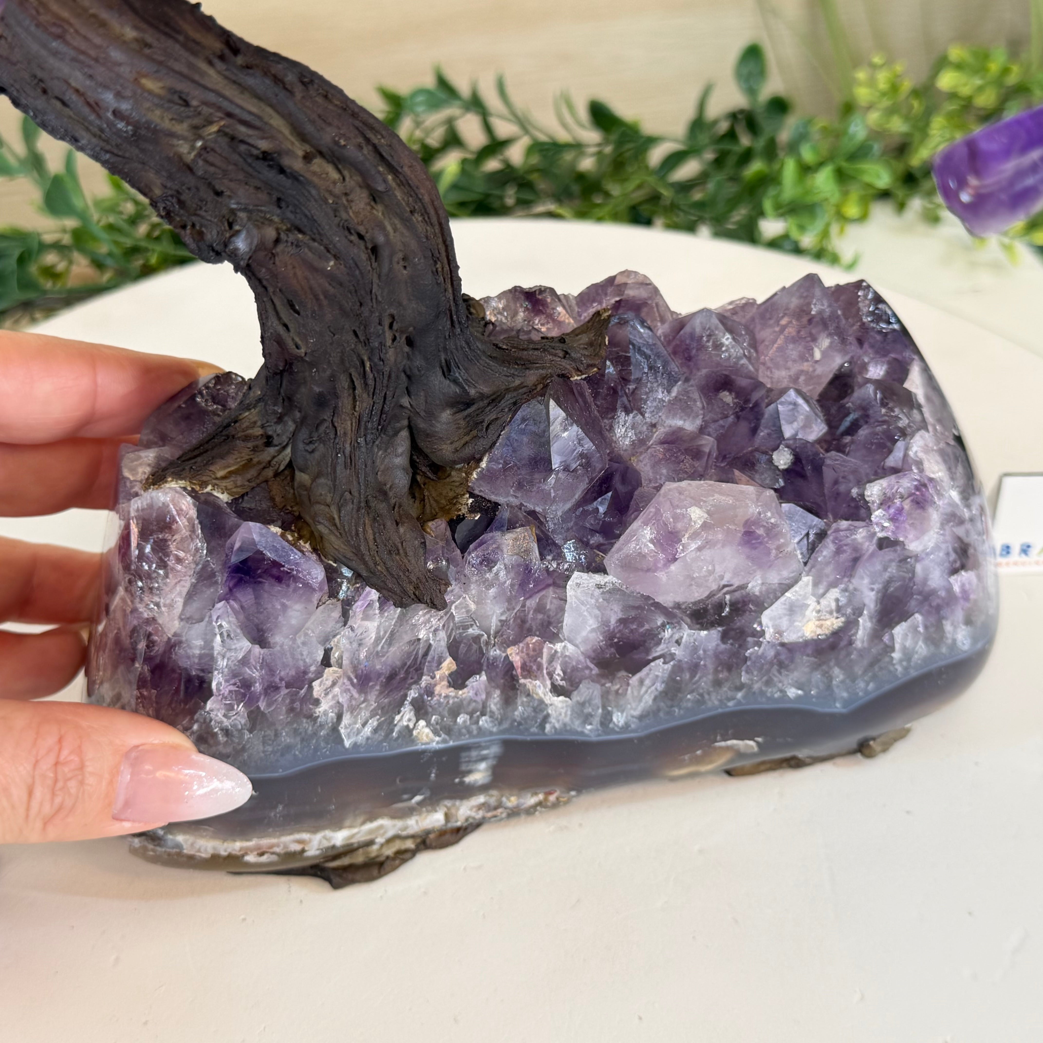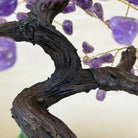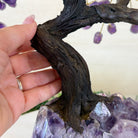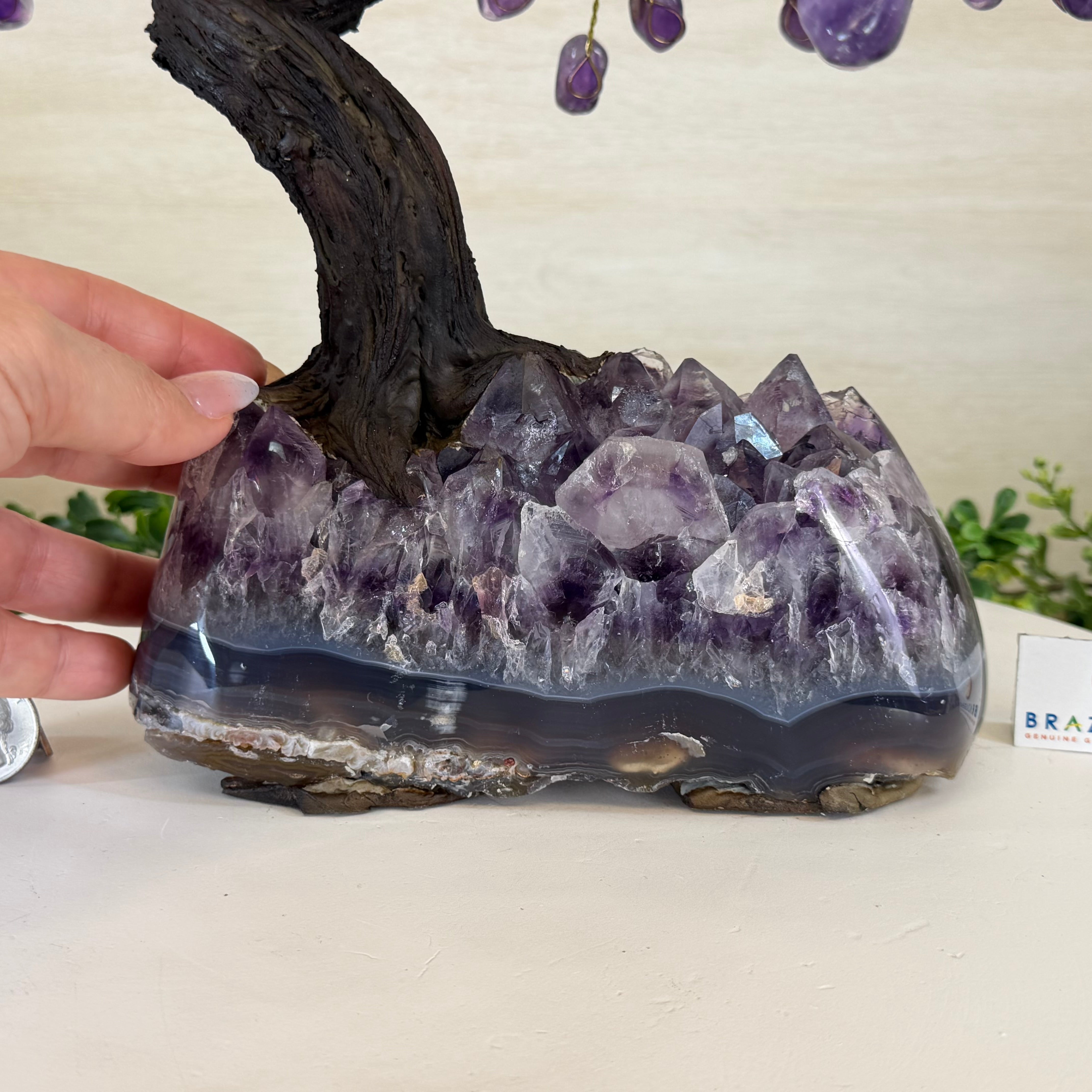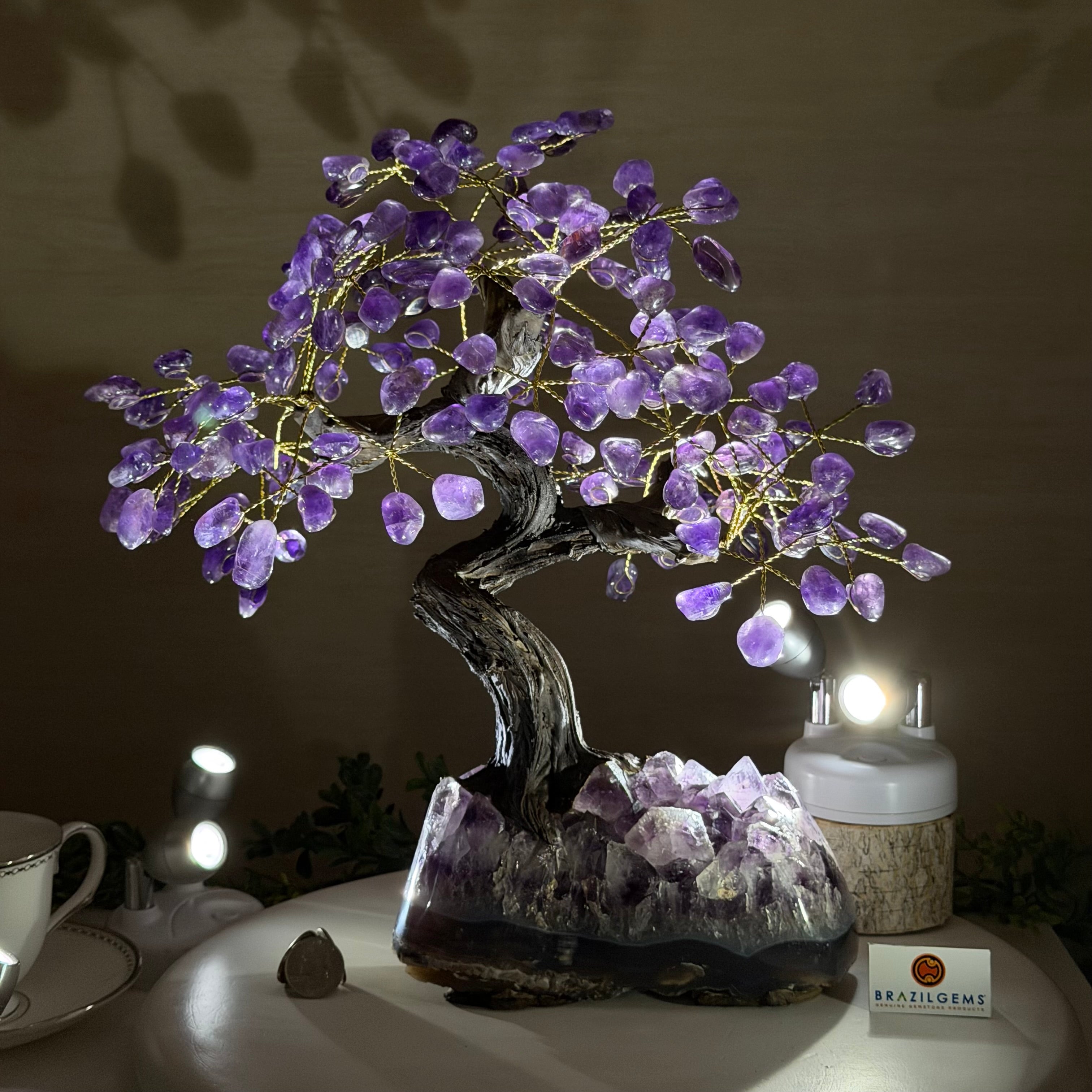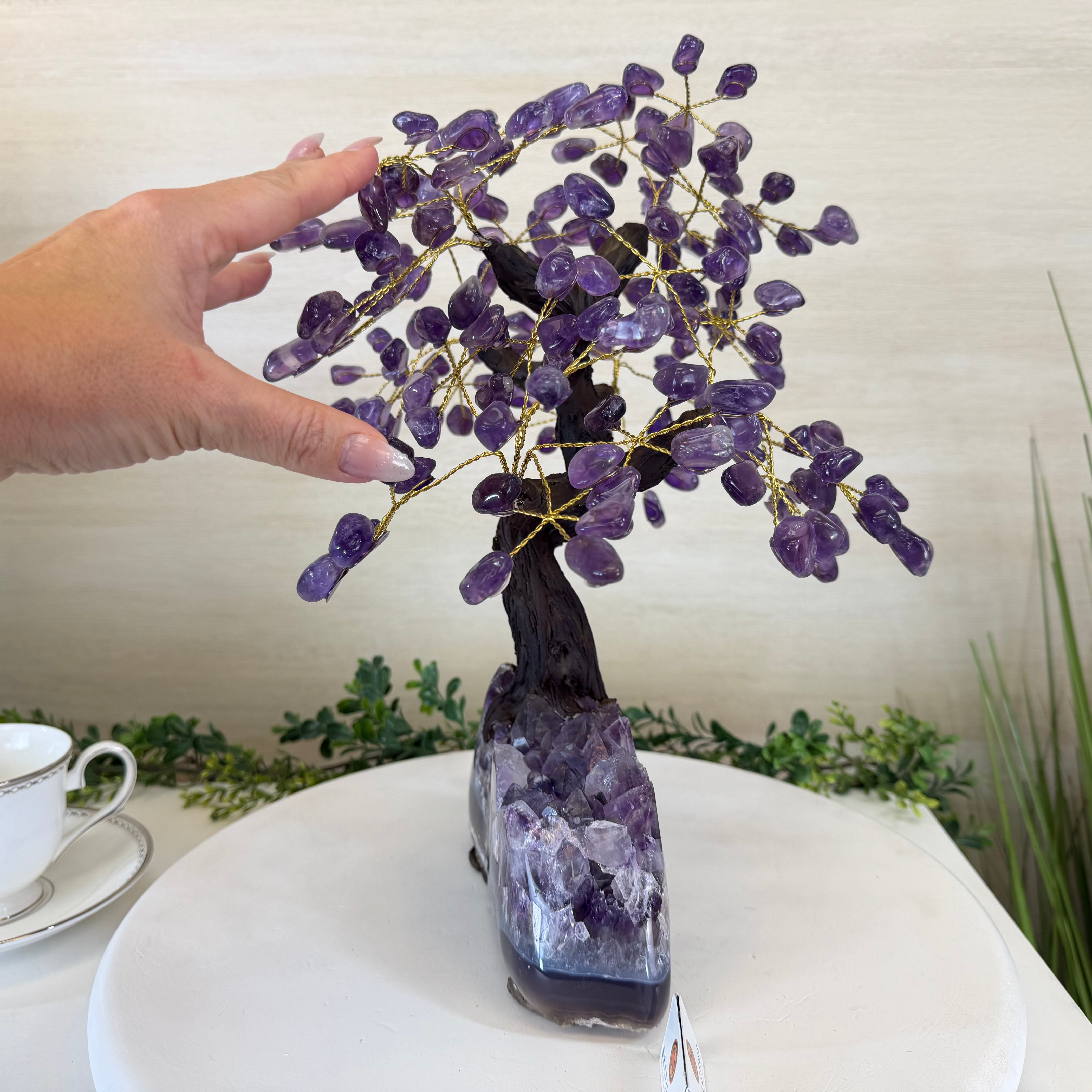Special Amethyst Bonsai Gemstone Tree on a Polished Amethyst Cluster Base Handcrafted in Brazil, this striking gemstone tree stands approximately 14" tall and features a sturdy bonsai-style trunk and branches adorned with 180 tumbled Amethyst gemstones as its leaves.