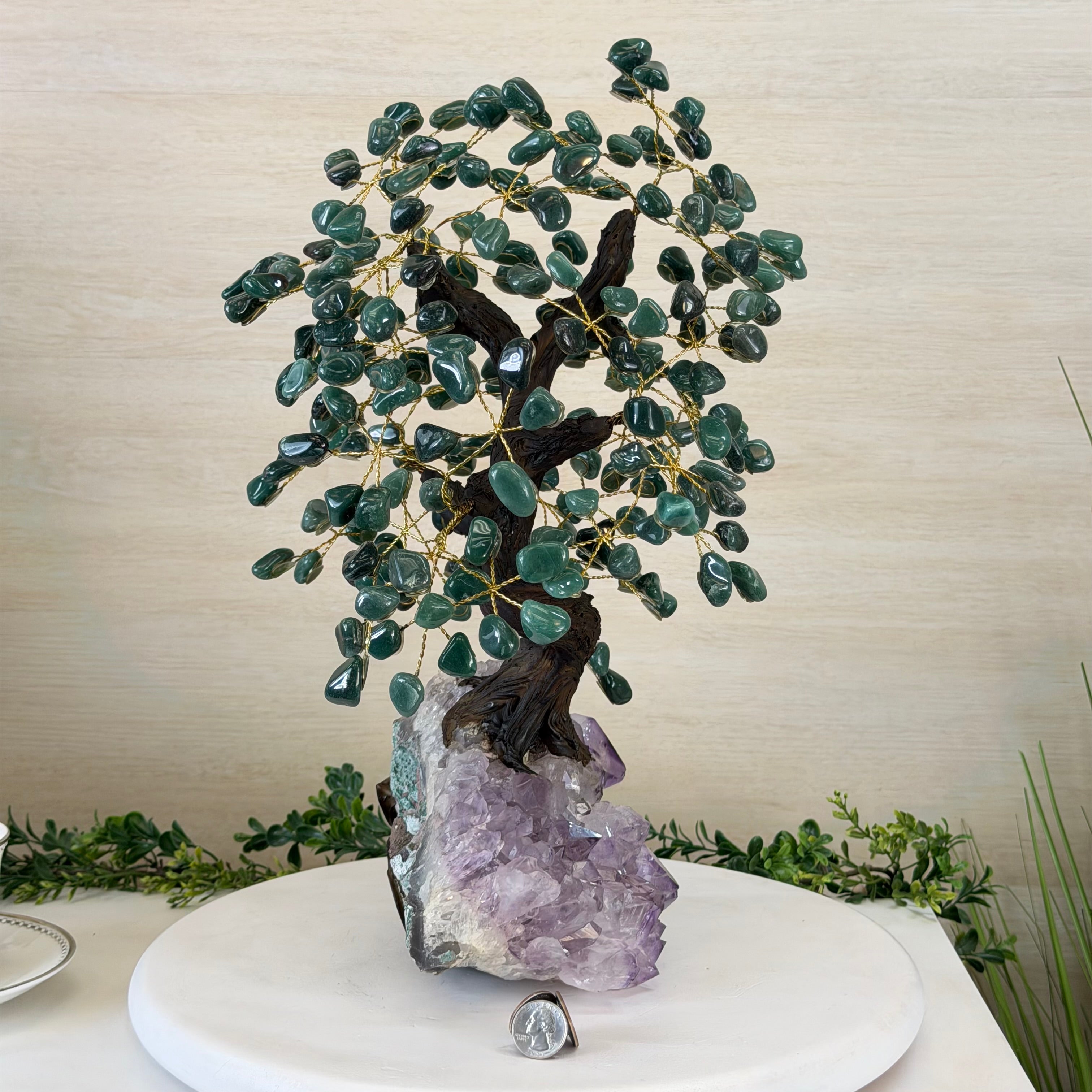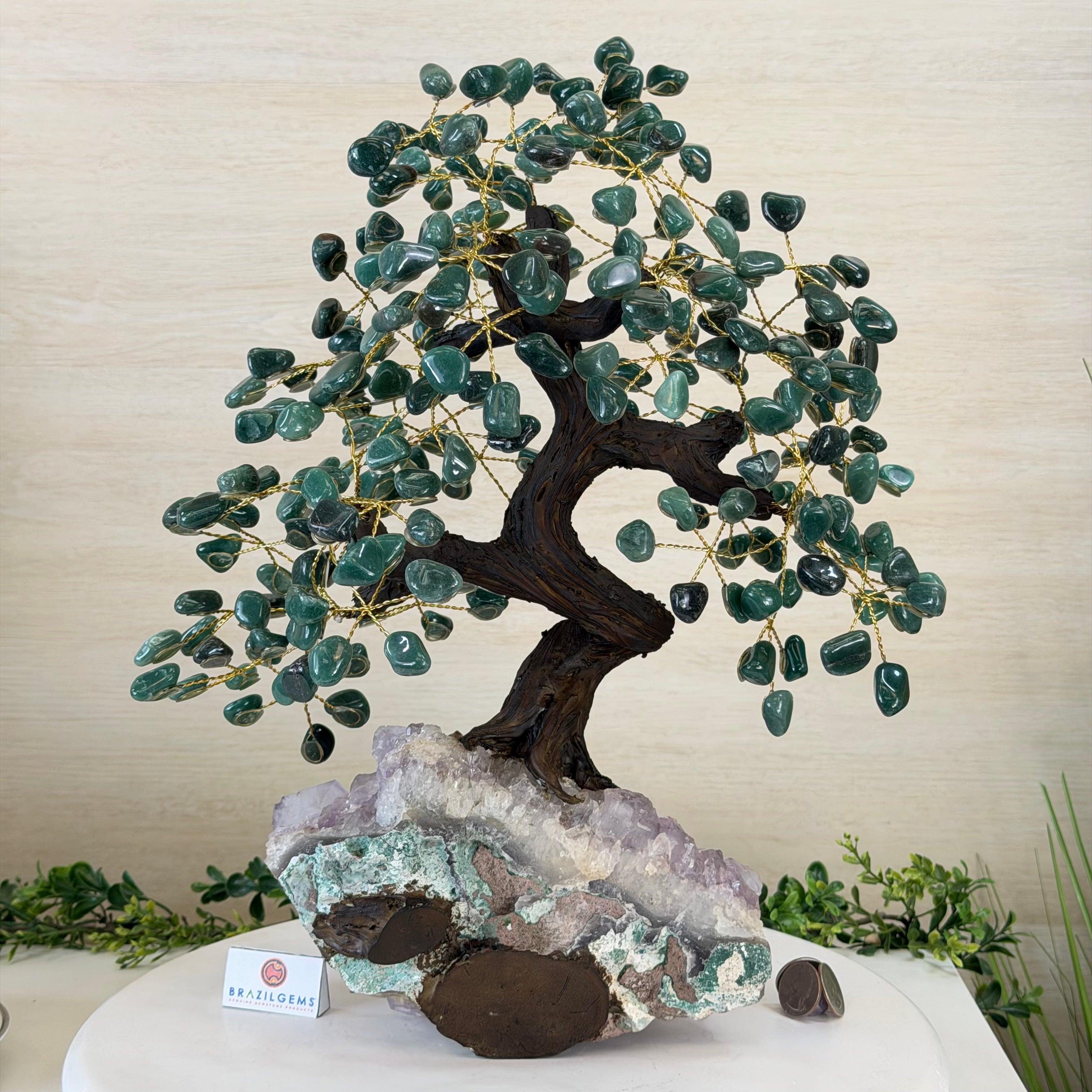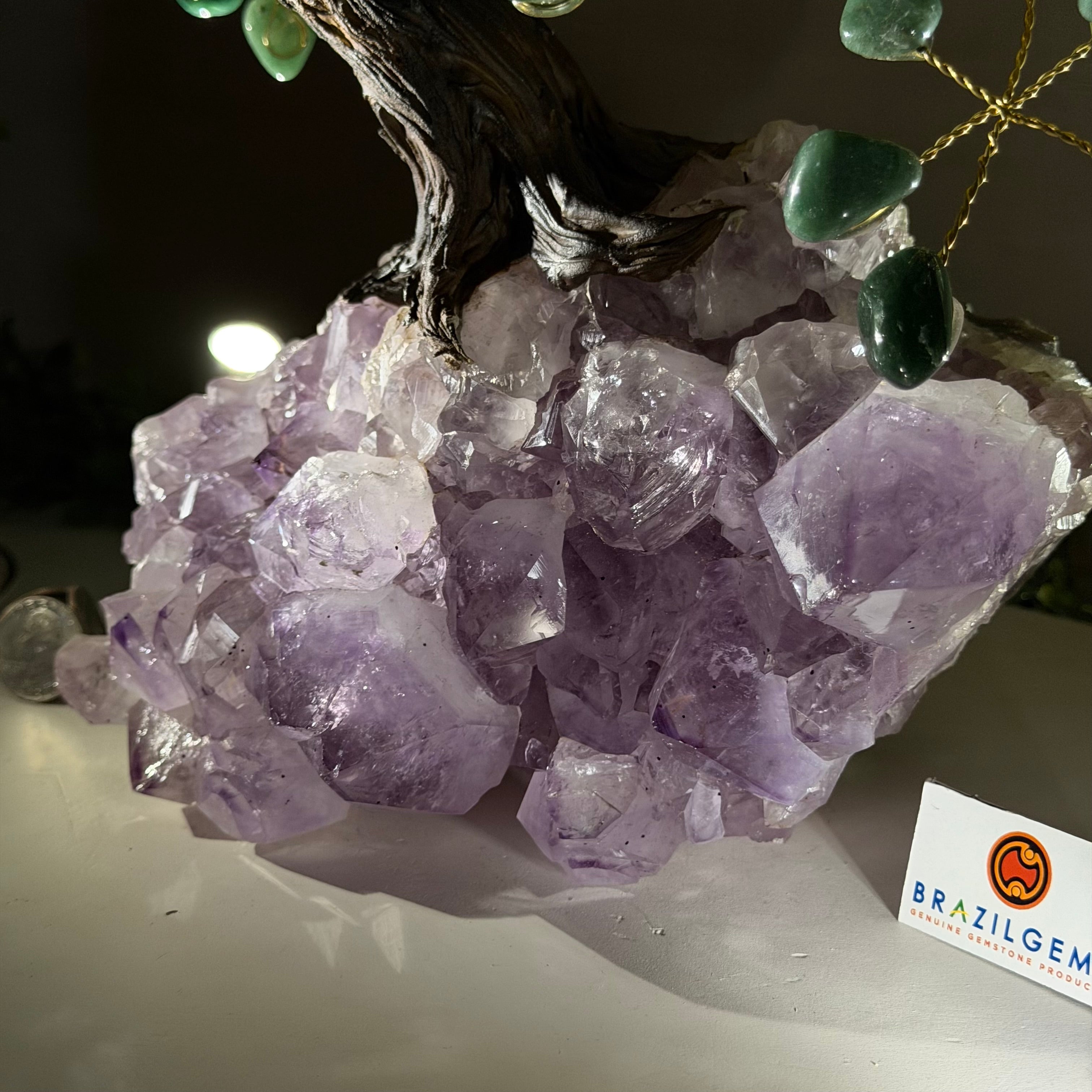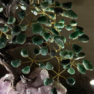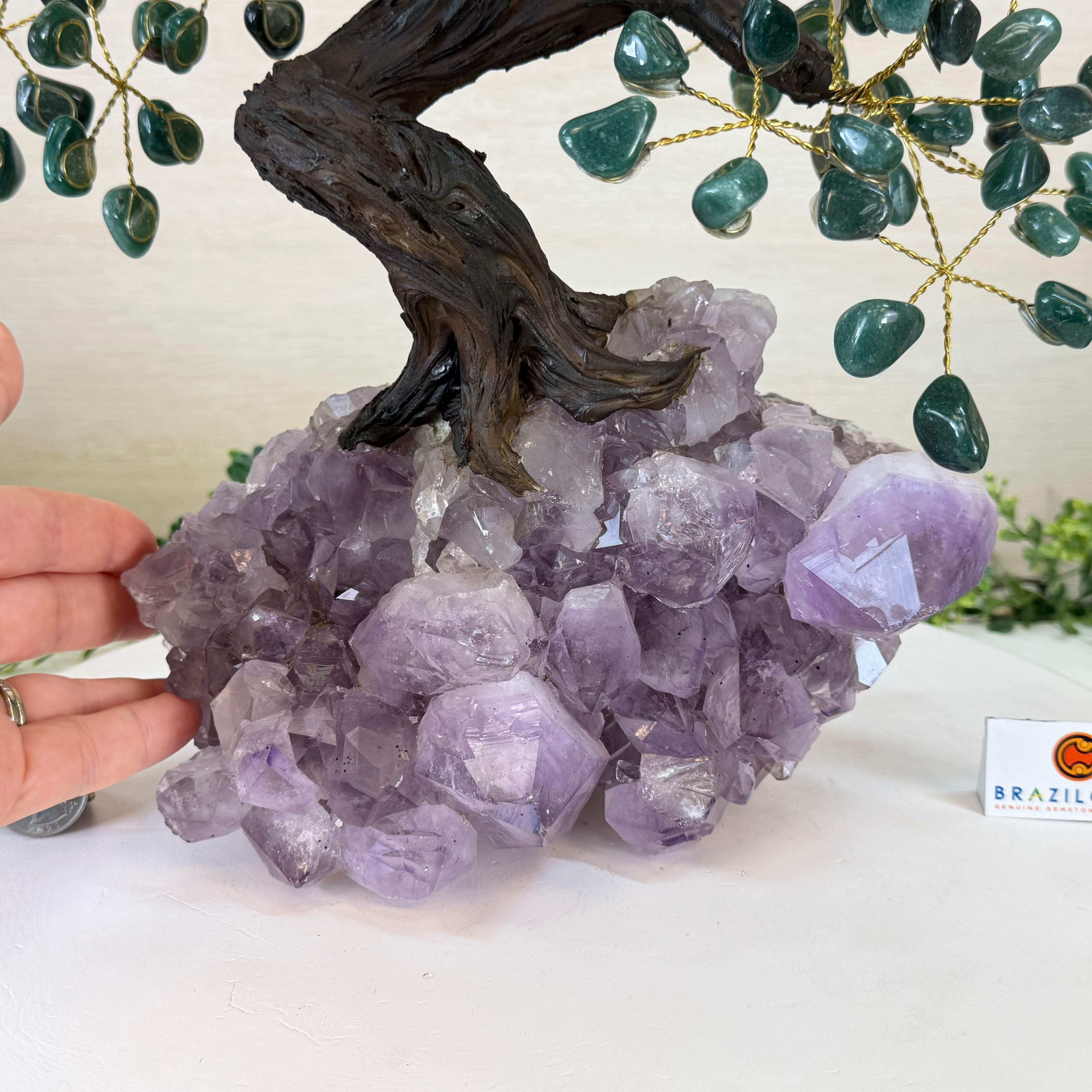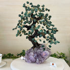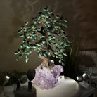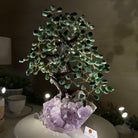 Green Quartz Bonsai Gemstone Tree on an Amethyst Cluster Base Handcrafted in Brazil, this striking gemstone tree stands approximately 17" tall and features a sturdy bonsai-style trunk and branches adorned with 240 tumbled Green Quartz gemstones as its leaves.