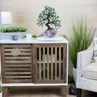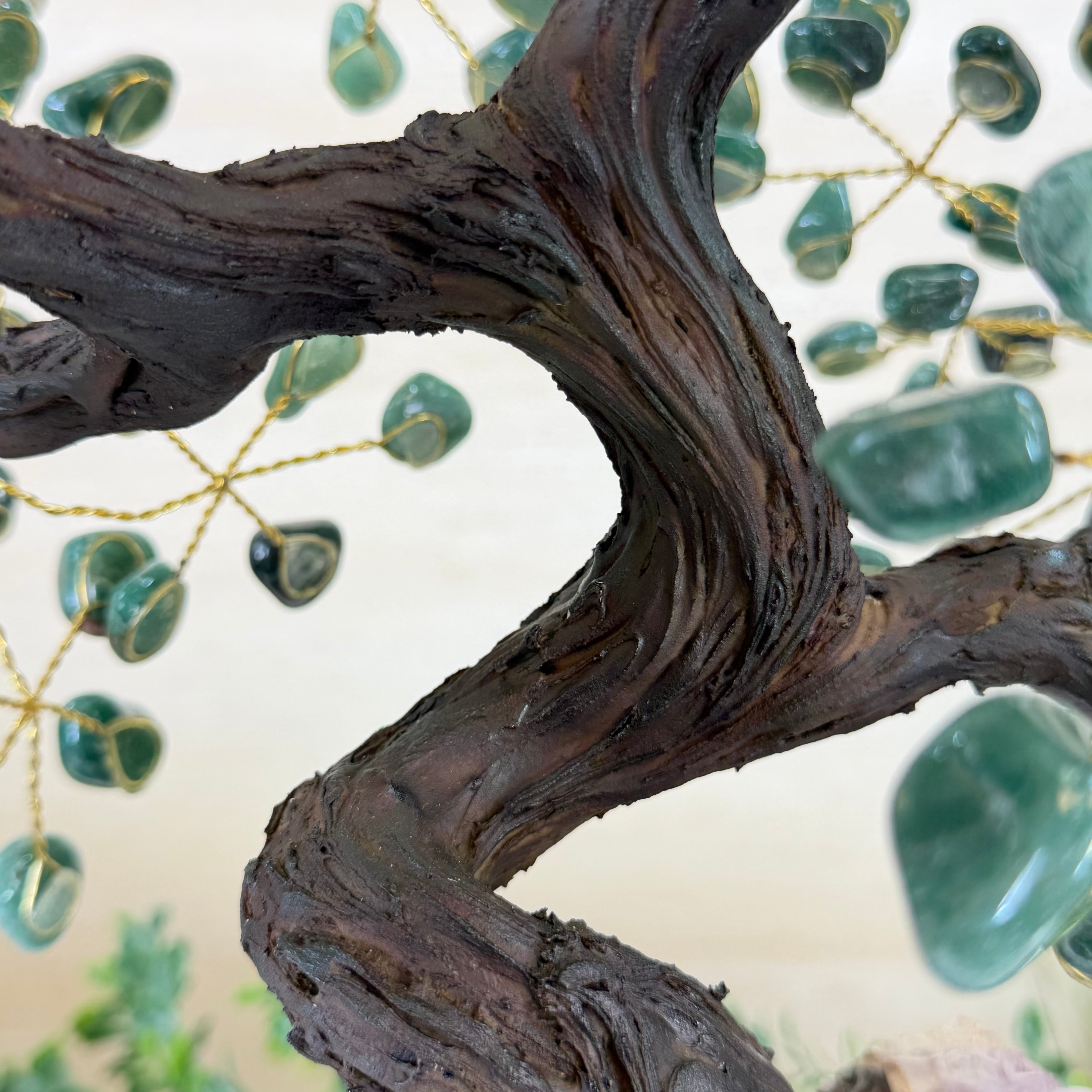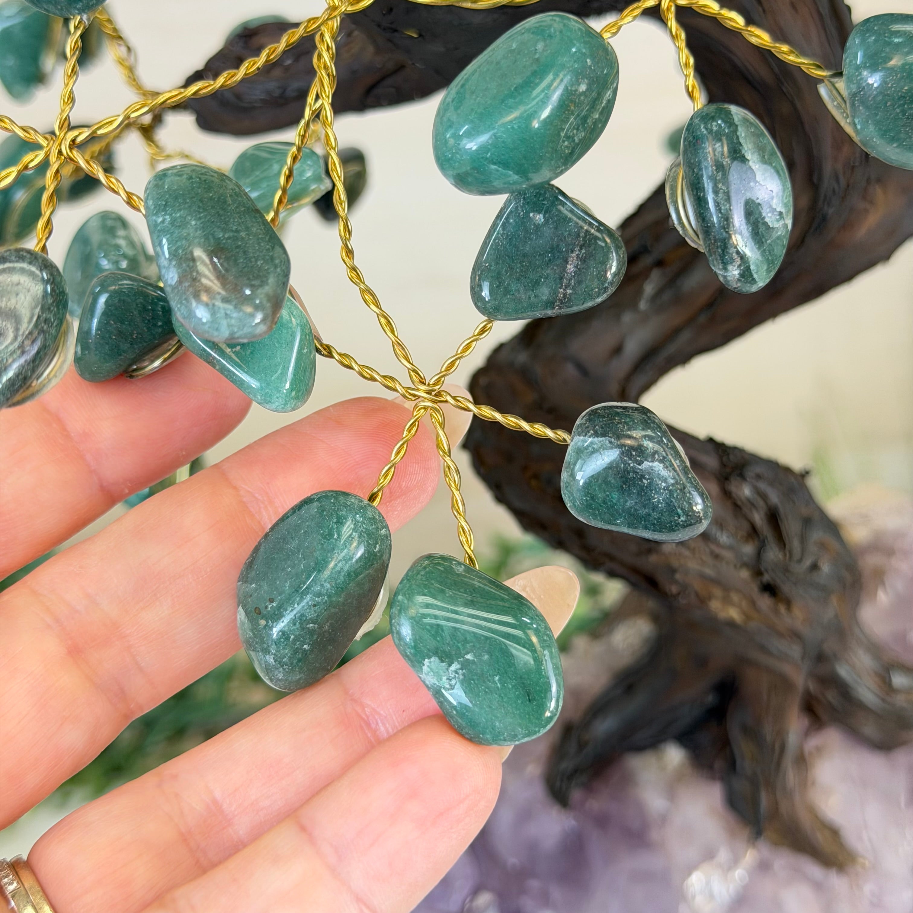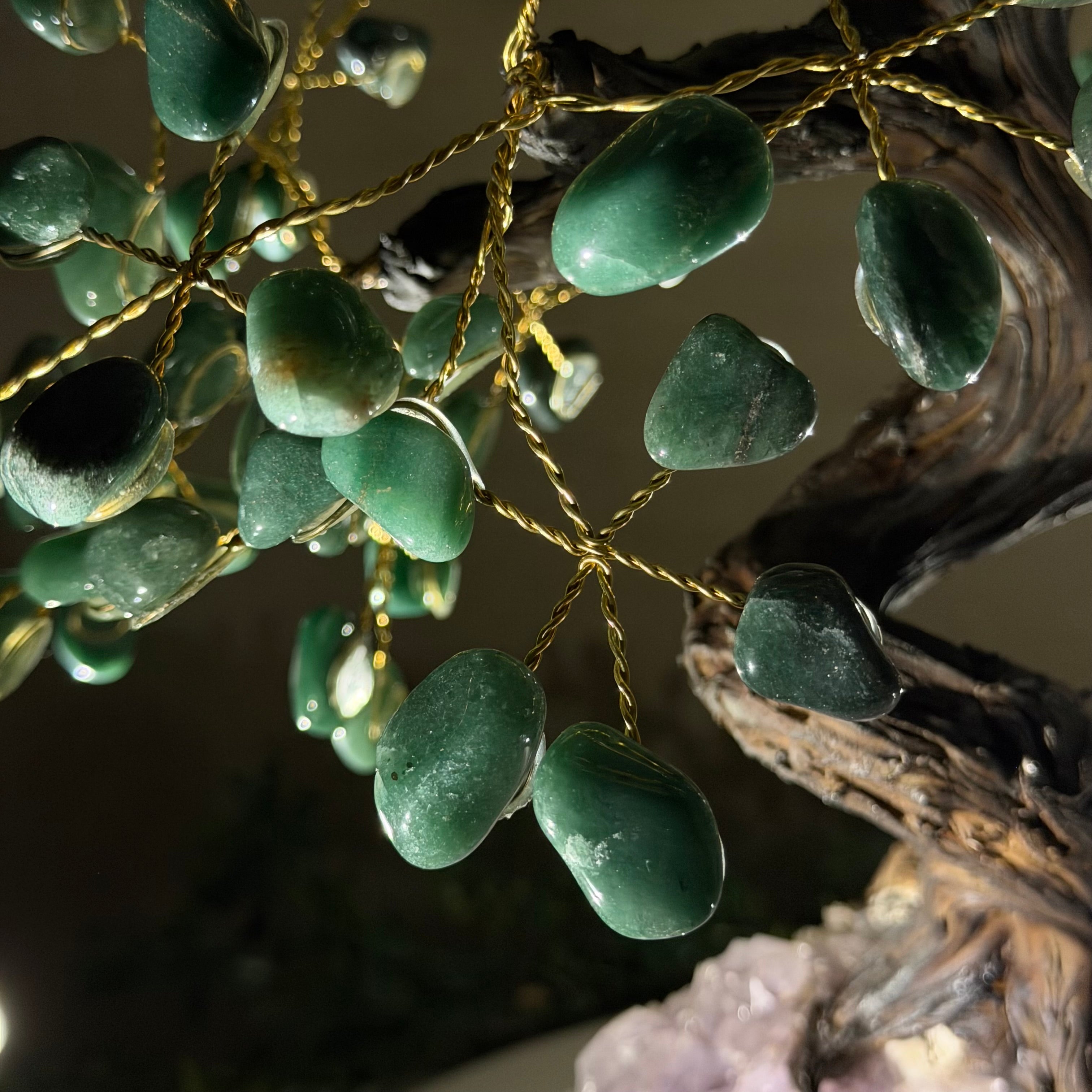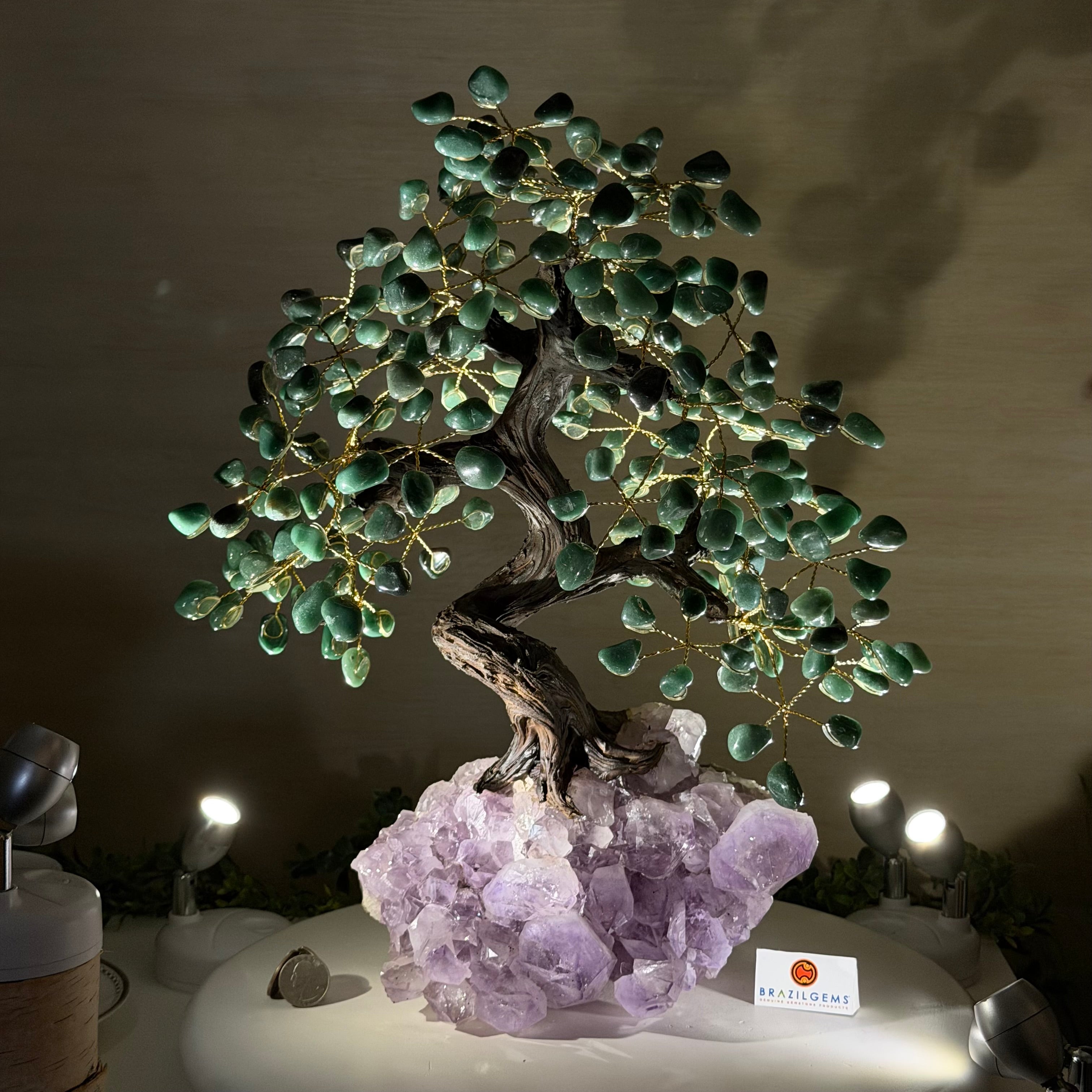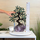Green Quartz Bonsai Gemstone Tree on an Amethyst Cluster Base Handcrafted in Brazil, this striking gemstone tree stands approximately 17" tall and features a sturdy bonsai-style trunk and branches adorned with 240 tumbled Green Quartz gemstones as its leaves.