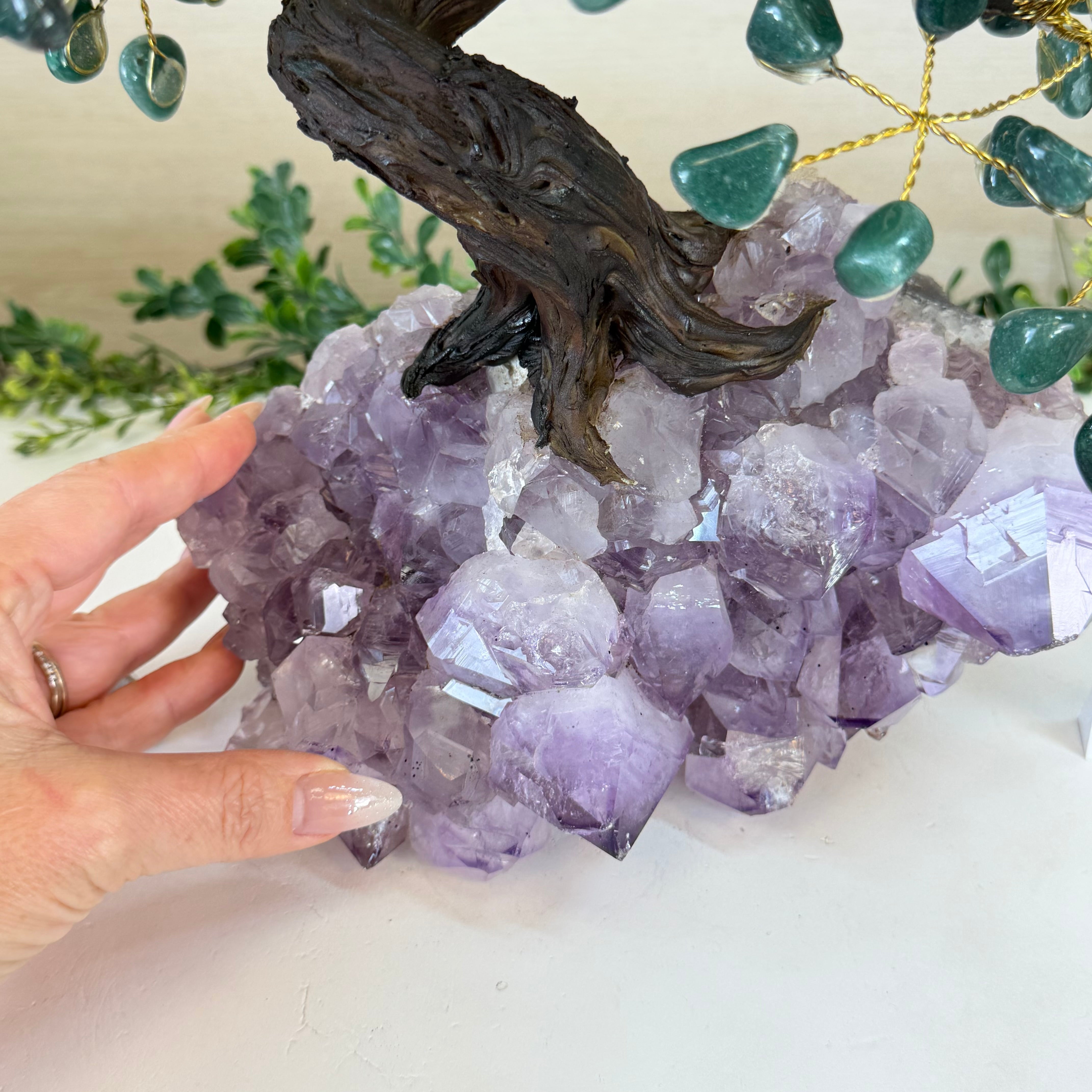 The process to make a gemstone tree like this is very extensive and meticulous. First, an Amethyst cluster is selected for the base, then a resin trunk and branches are crafted into a bonsai style by artisans in Brazil and finally each gemstone is glued to the tree by hand. The result is a work of art that radiates harmony, care, and intention.