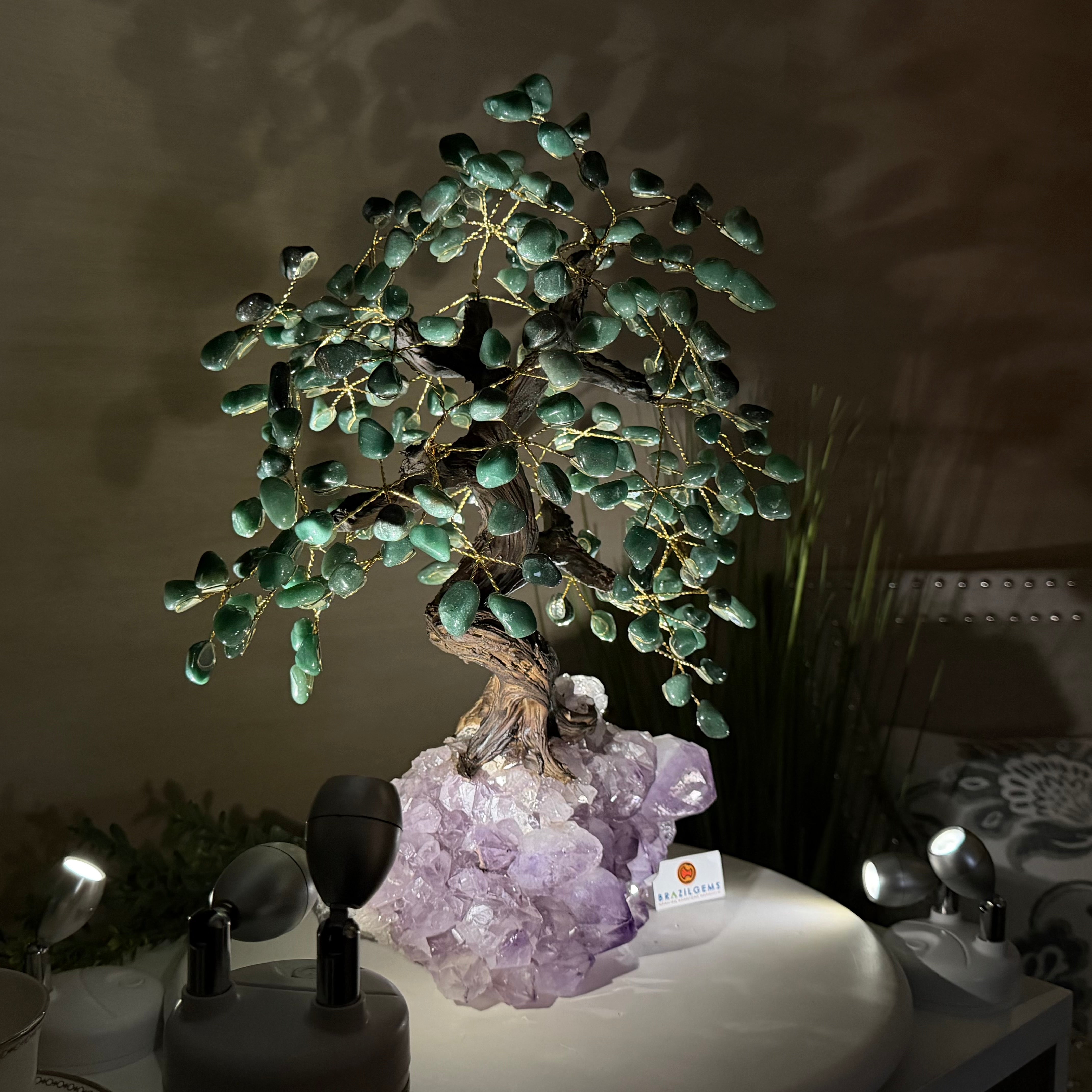 Disclaimer: This is a genuine gemstone handmade item sold by Brazil Gems® as is and as you see it in its images and video. It is the exact tree you will receive. The base may contain natural imperfections as well as imperfections, repairs and broken edges from the extraction and prepping processes and the branches and leaf gemstones may contain imperfections as well. At Brazil Gems® we make every effort to get measurements as exact as possible but they are done by human hands and eyes and therefore may have minor discrepancies. For safe shipping, the branches will arrive compacted—you’ll simply need to gently “fluff” or spread them into place upon arrival. Also, it's possible a gemstone "leaf" might fall off of a branch. If this happens, it's a simple fix with hot glue or super glue.