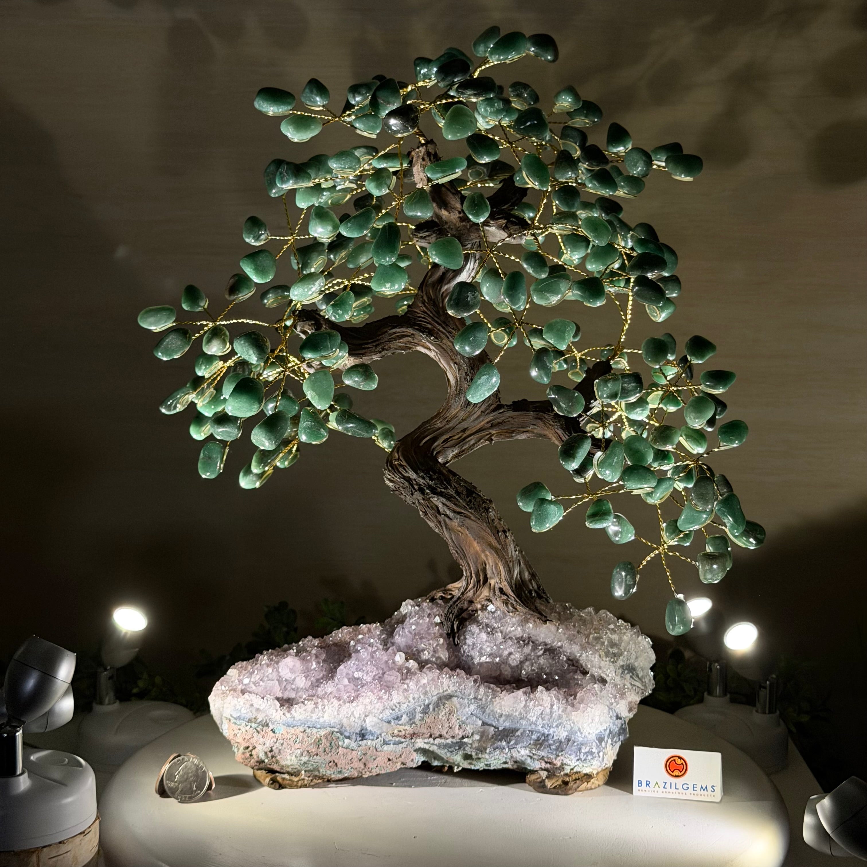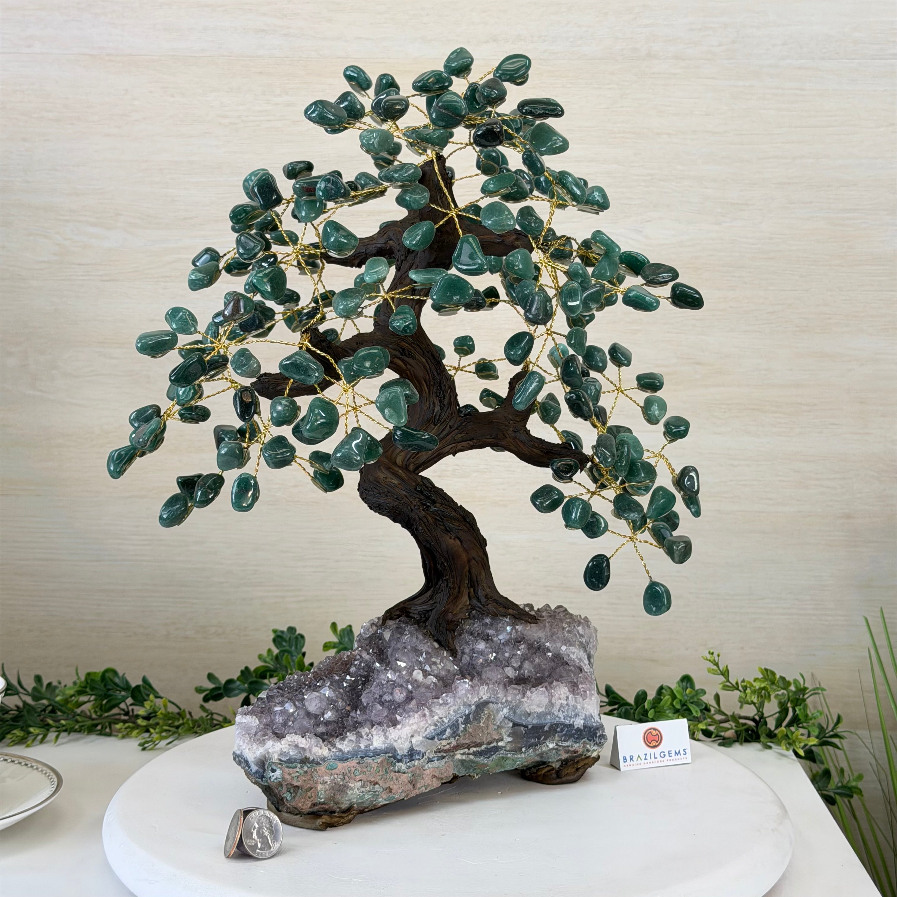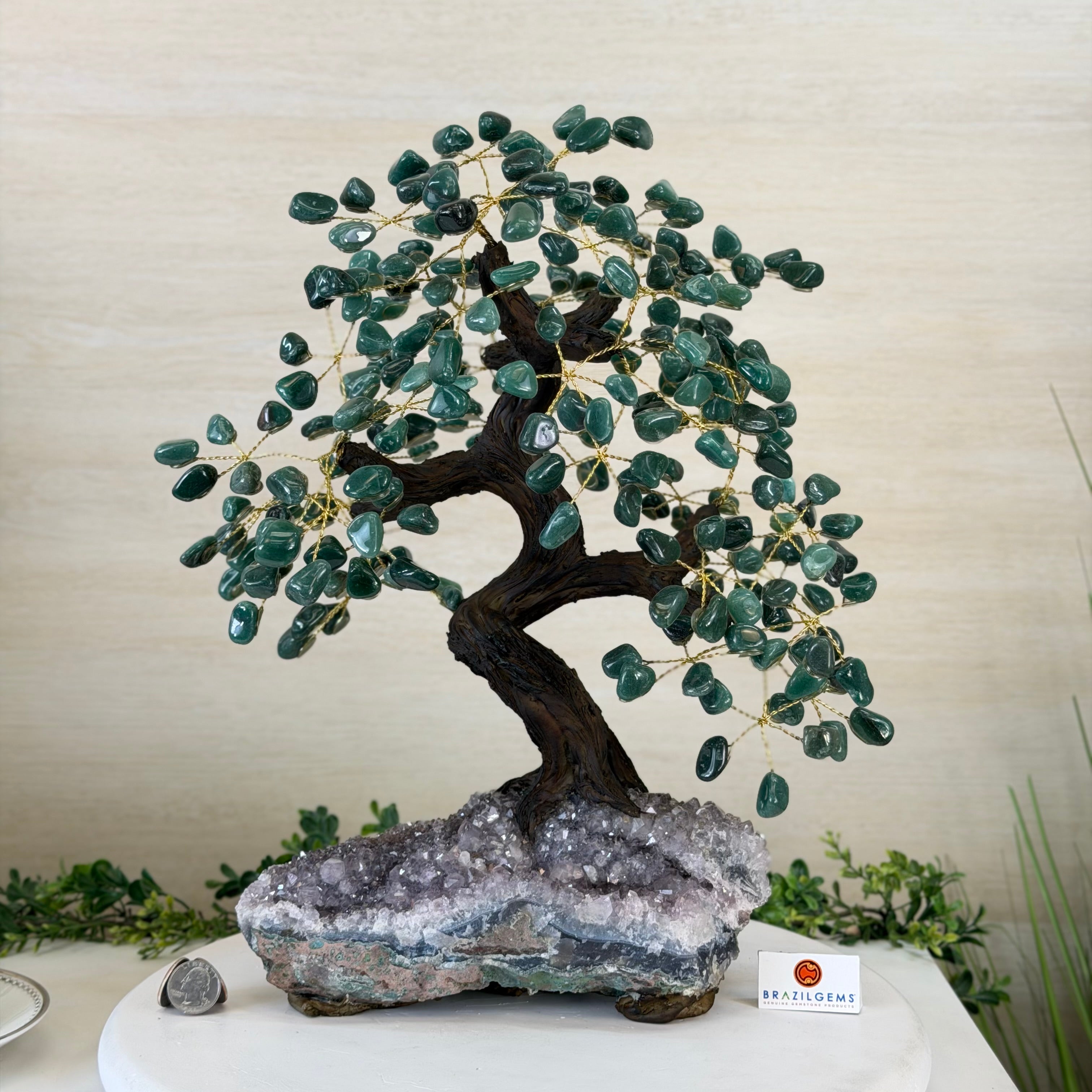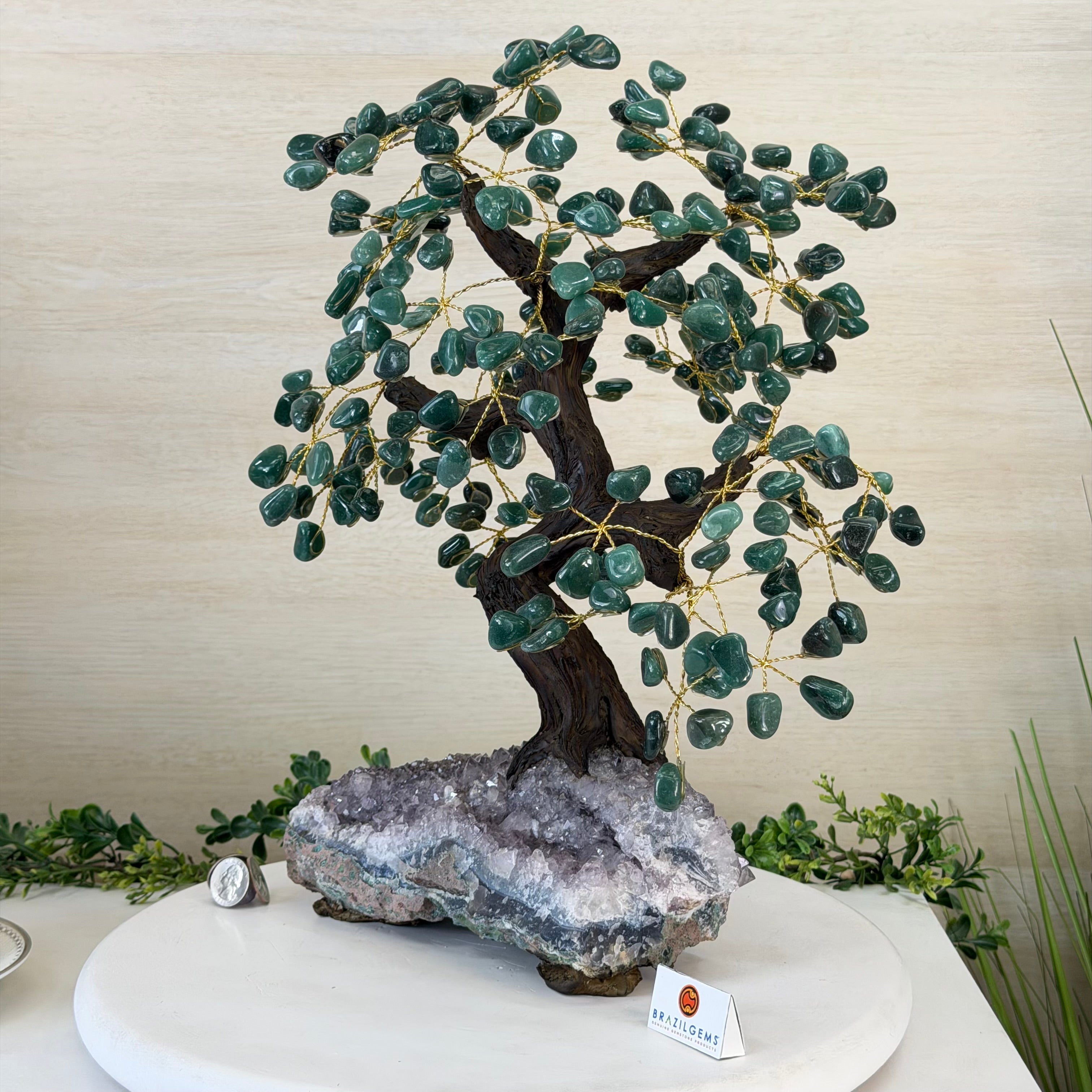 Green Quartz Bonsai Gemstone Tree on an Amethyst Cluster Base Handcrafted in Brazil, this striking gemstone tree stands approximately 17" tall and features a sturdy bonsai-style trunk and branches adorned with 240 tumbled Green Quartz gemstones as its leaves.