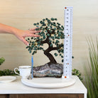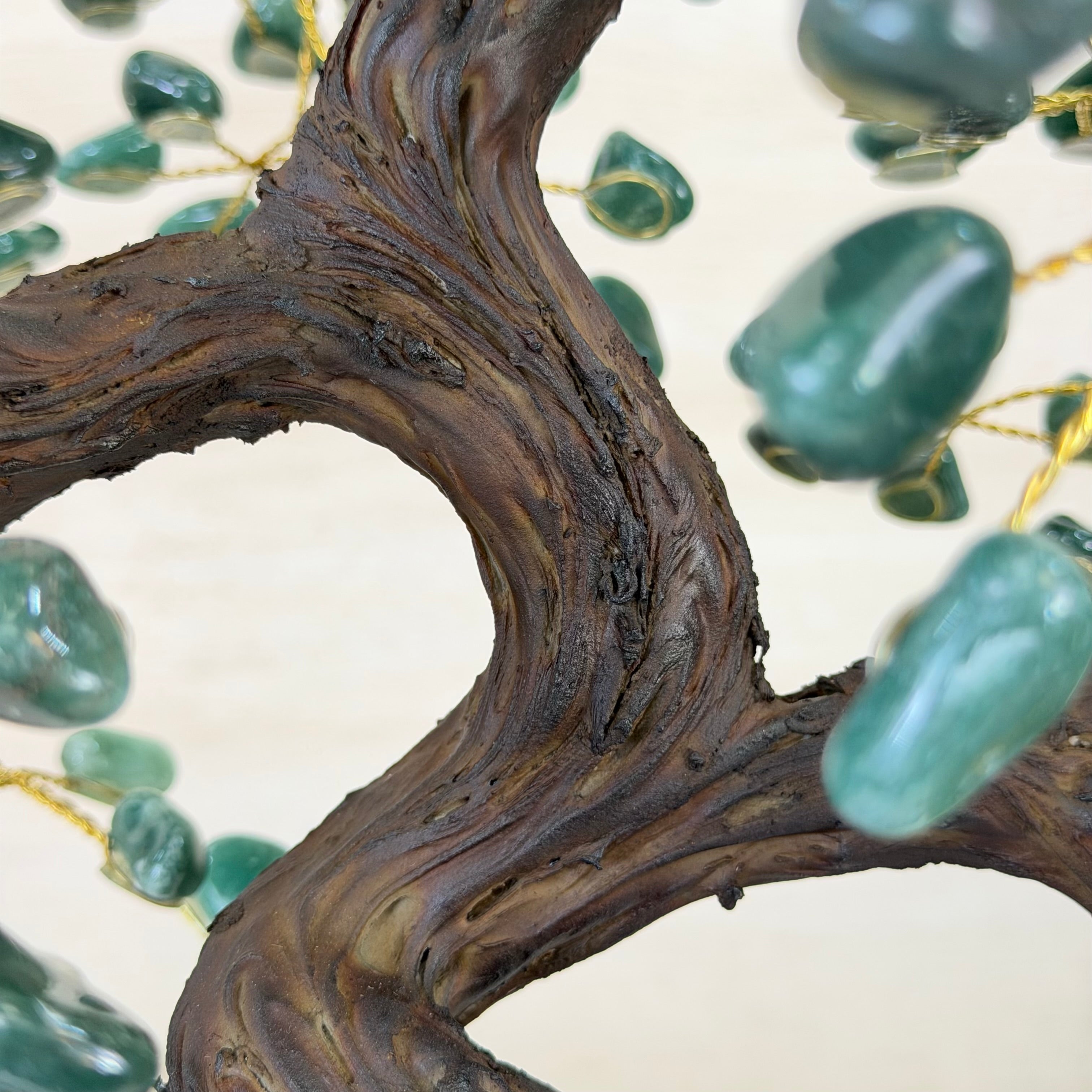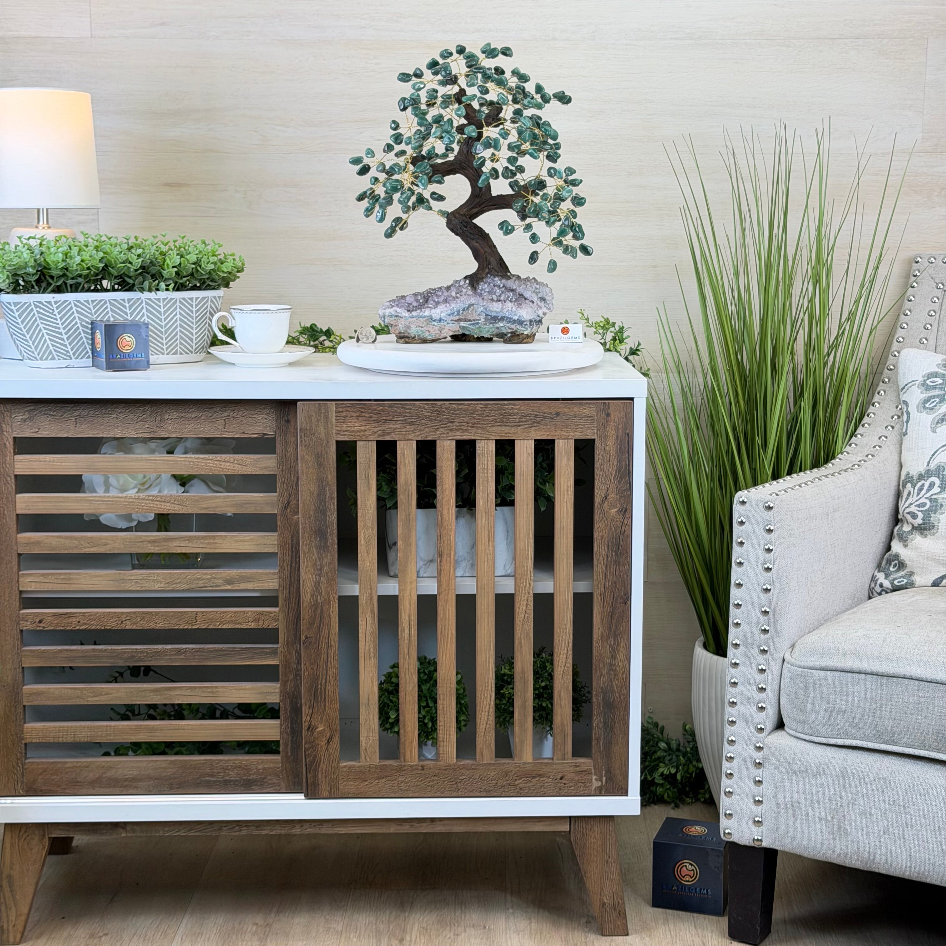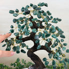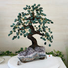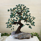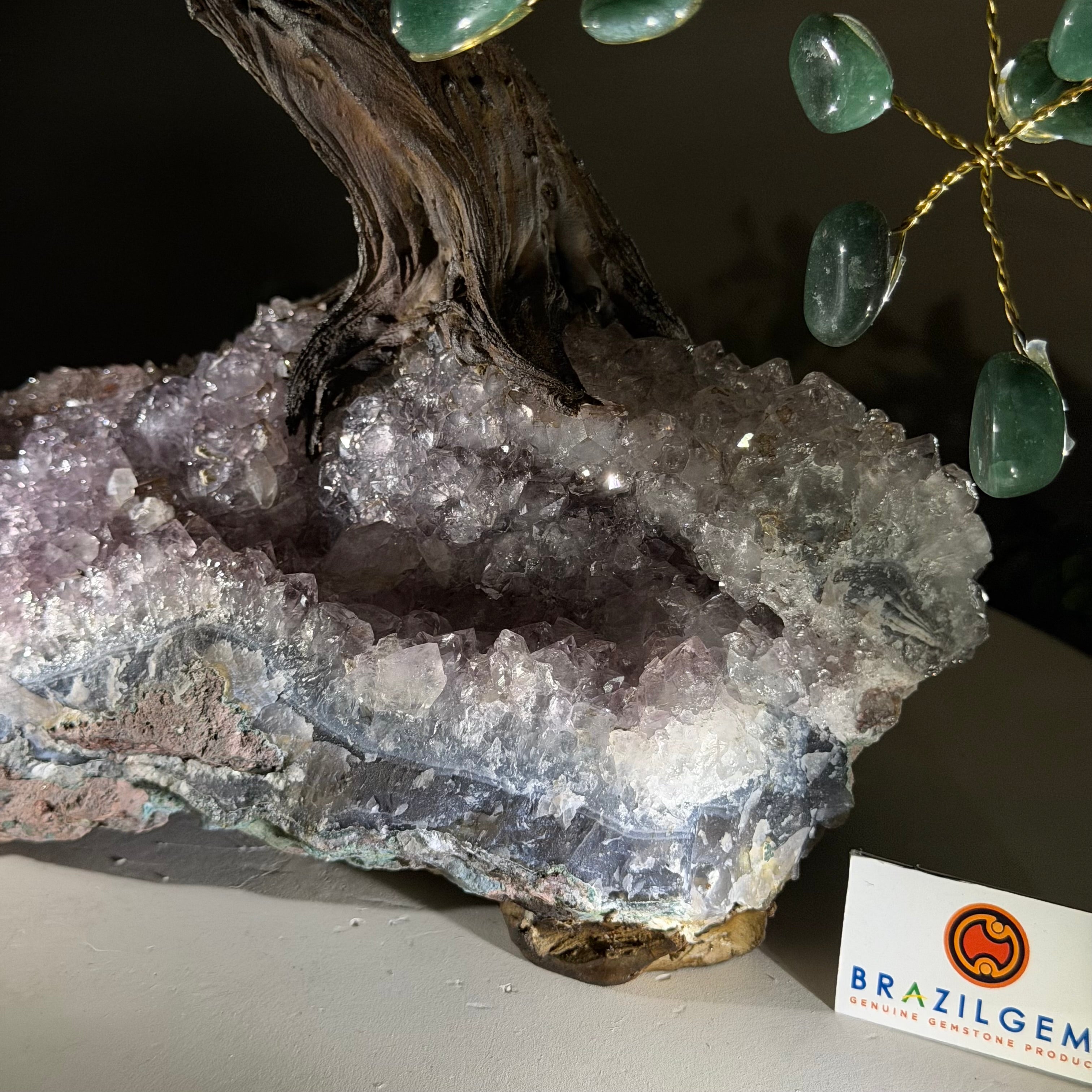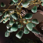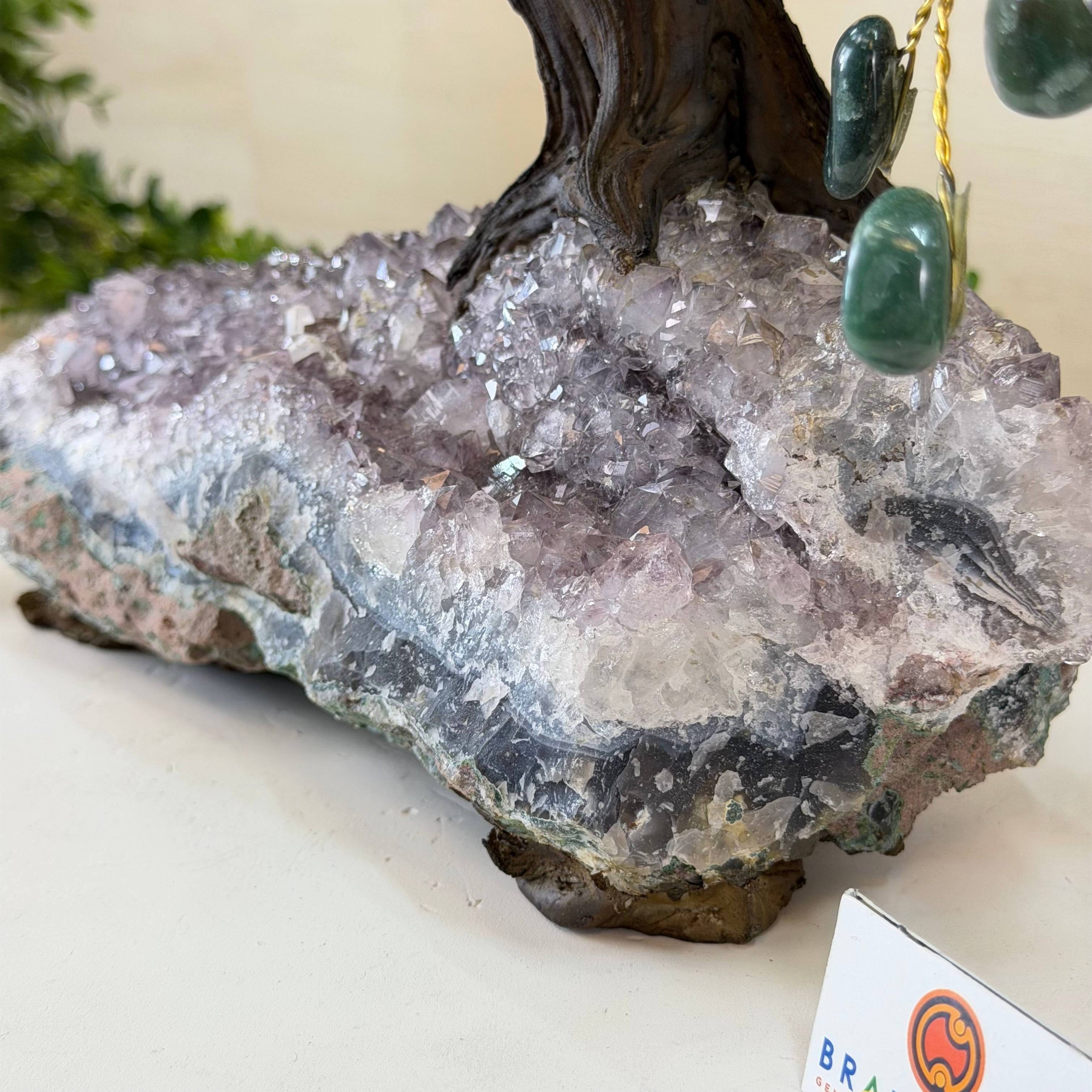 Green Quartz Bonsai Gemstone Tree on an Amethyst Cluster Base Handcrafted in Brazil, this striking gemstone tree stands approximately 17" tall and features a sturdy bonsai-style trunk and branches adorned with 240 tumbled Green Quartz gemstones as its leaves.