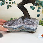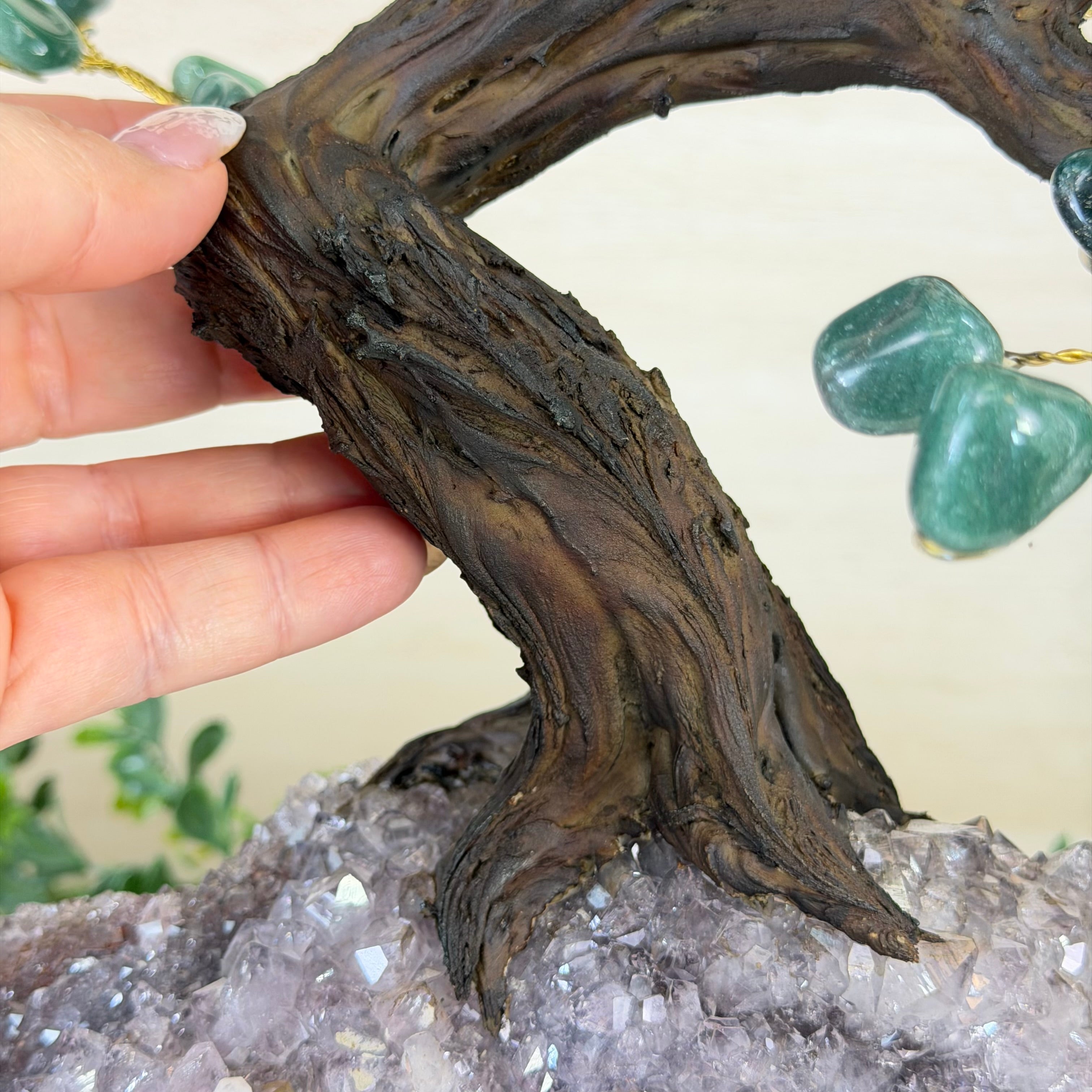 The process to make a gemstone tree like this is very extensive and meticulous. First, an Amethyst cluster is selected for the base, then a resin trunk and branches are crafted into a bonsai style by artisans in Brazil and finally each gemstone is glued to the tree by hand. The result is a work of art that radiates harmony, care, and intention.