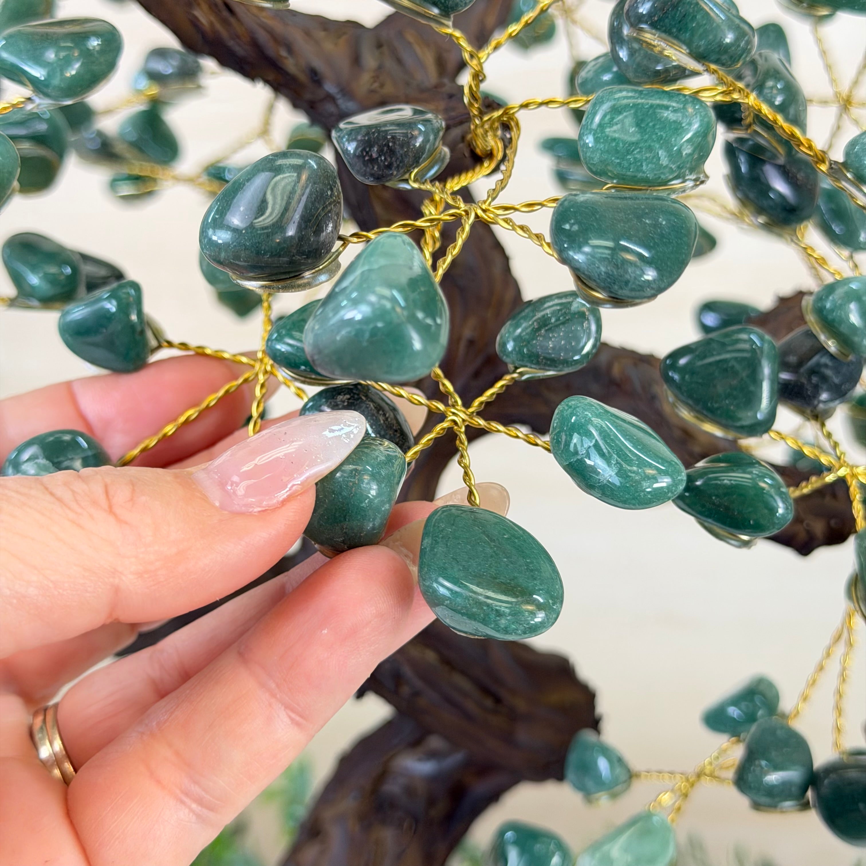 Disclaimer: This is a genuine gemstone handmade item sold by Brazil Gems® as is and as you see it in its images and video. It is the exact tree you will receive. The base may contain natural imperfections as well as imperfections, repairs and broken edges from the extraction and prepping processes and the branches and leaf gemstones may contain imperfections as well. At Brazil Gems® we make every effort to get measurements as exact as possible but they are done by human hands and eyes and therefore may have minor discrepancies. For safe shipping, the branches will arrive compacted—you’ll simply need to gently “fluff” or spread them into place upon arrival. Also, it's possible a gemstone "leaf" might fall off of a branch. If this happens, it's a simple fix with hot glue or super glue.