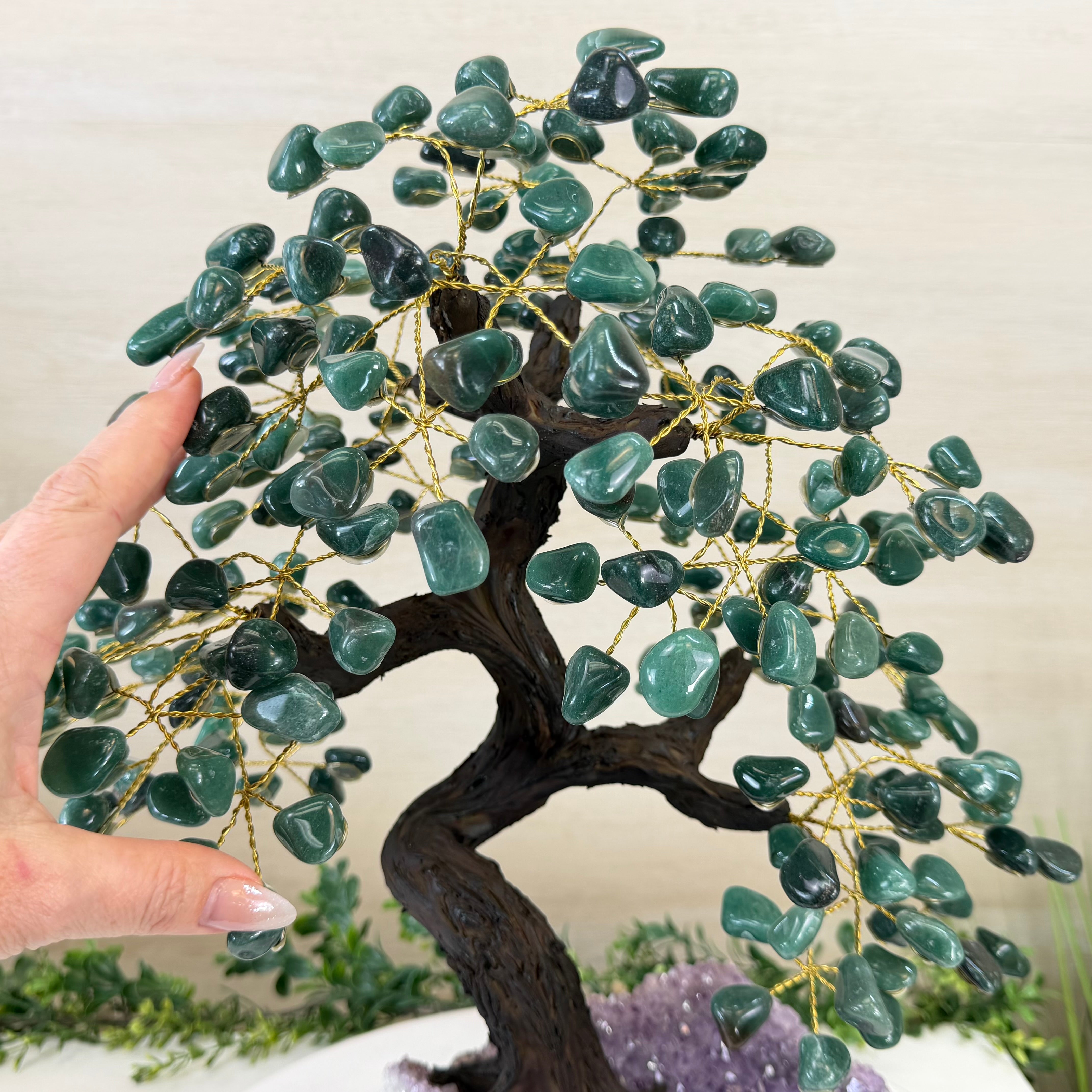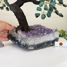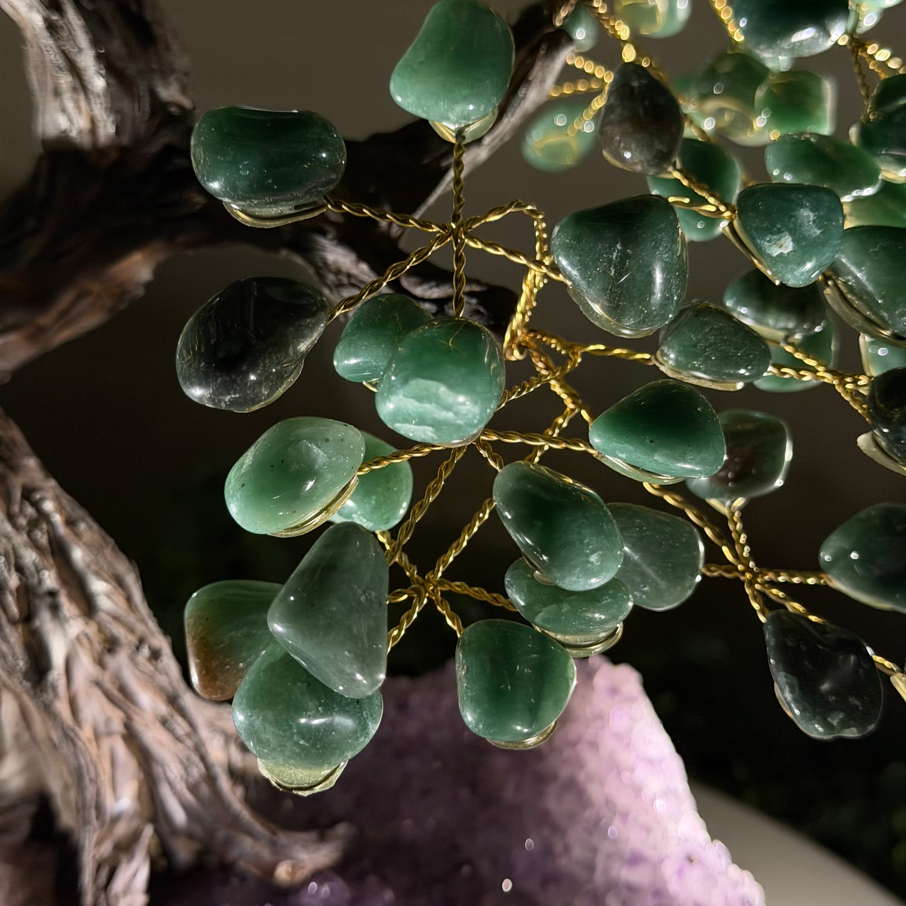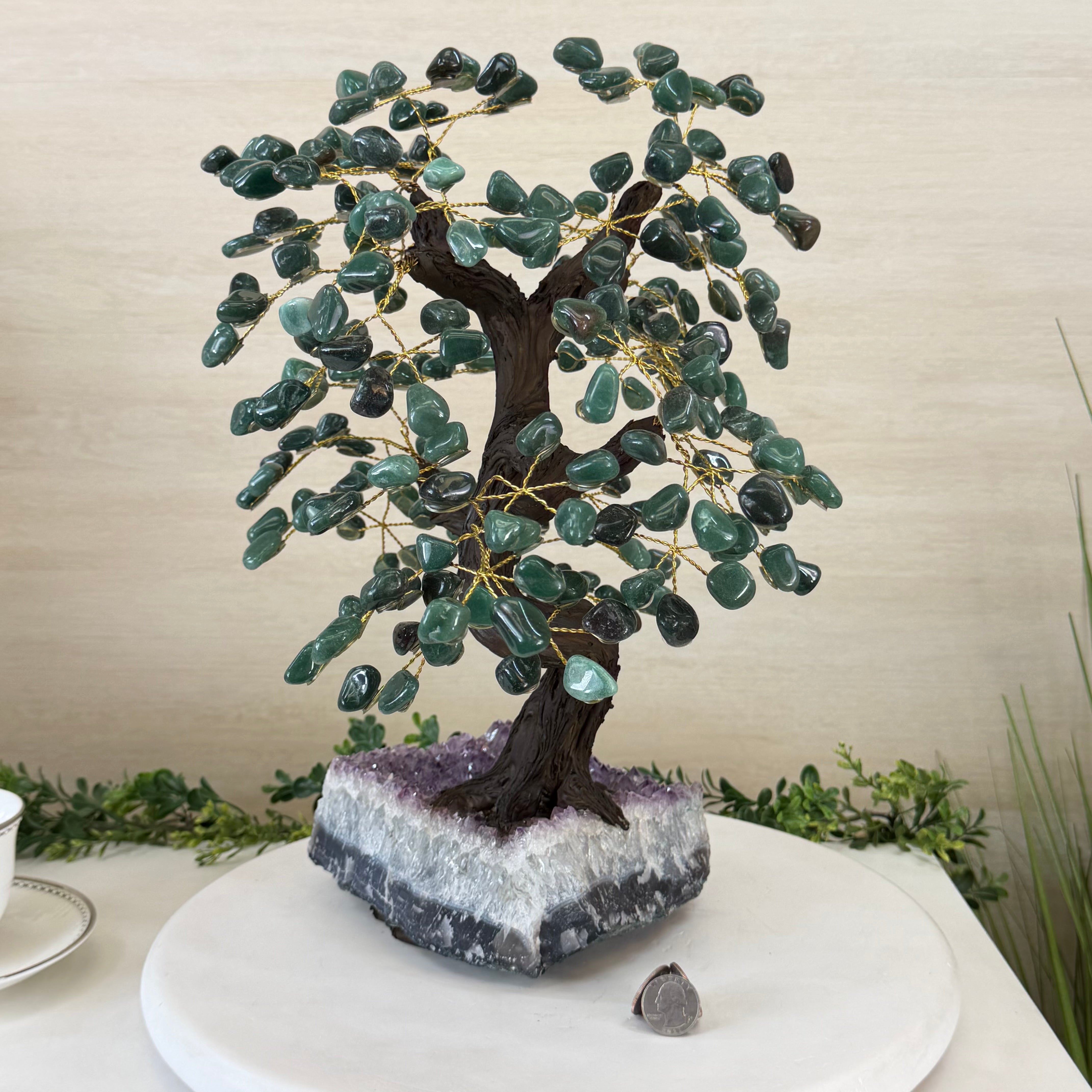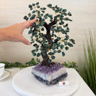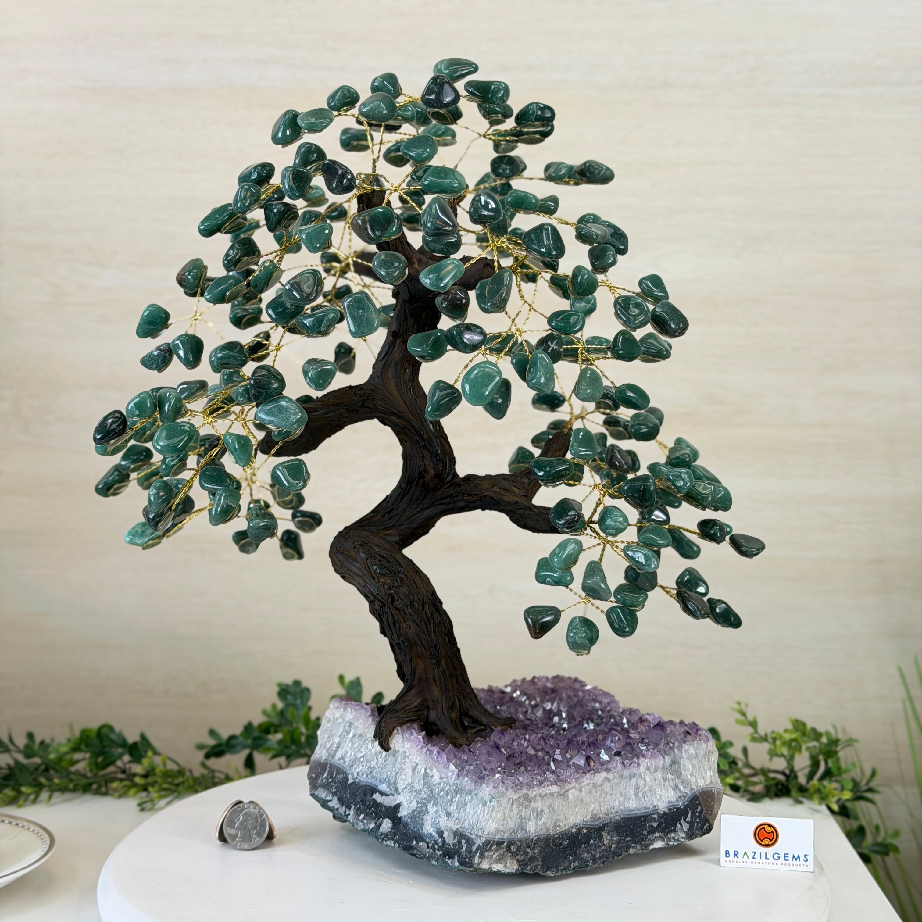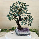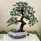 Green Quartz Bonsai Gemstone Tree on an Amethyst Cluster Base Handcrafted in Brazil, this striking gemstone tree stands approximately 17" tall and features a sturdy bonsai-style trunk and branches adorned with 240 tumbled Green Quartz gemstones as its leaves.